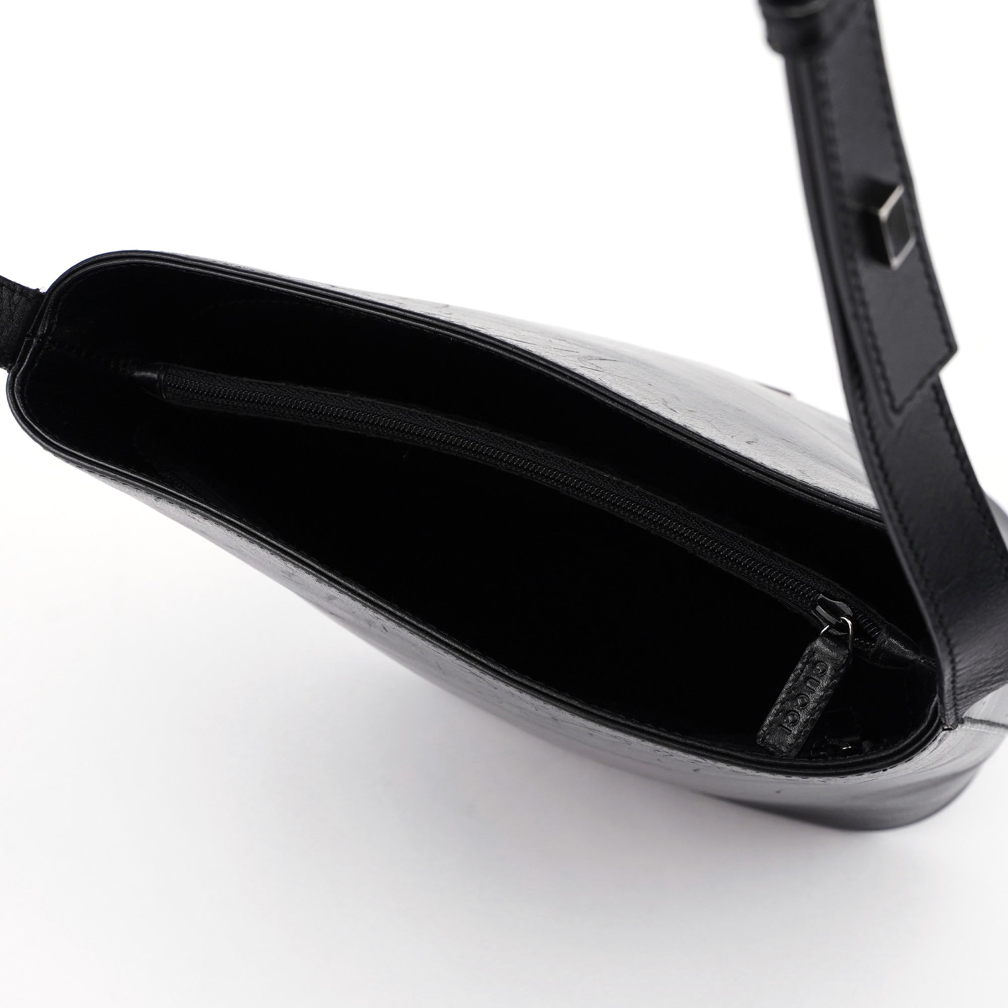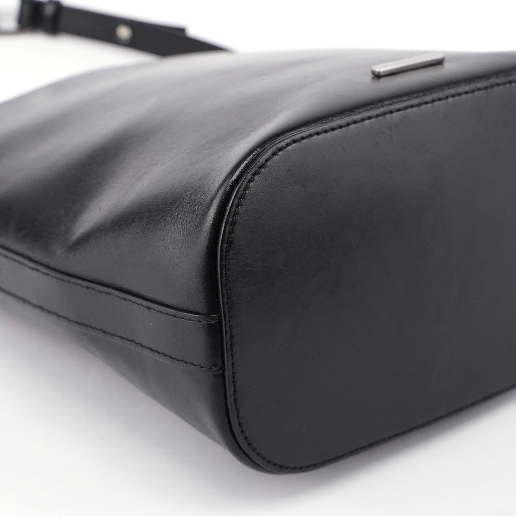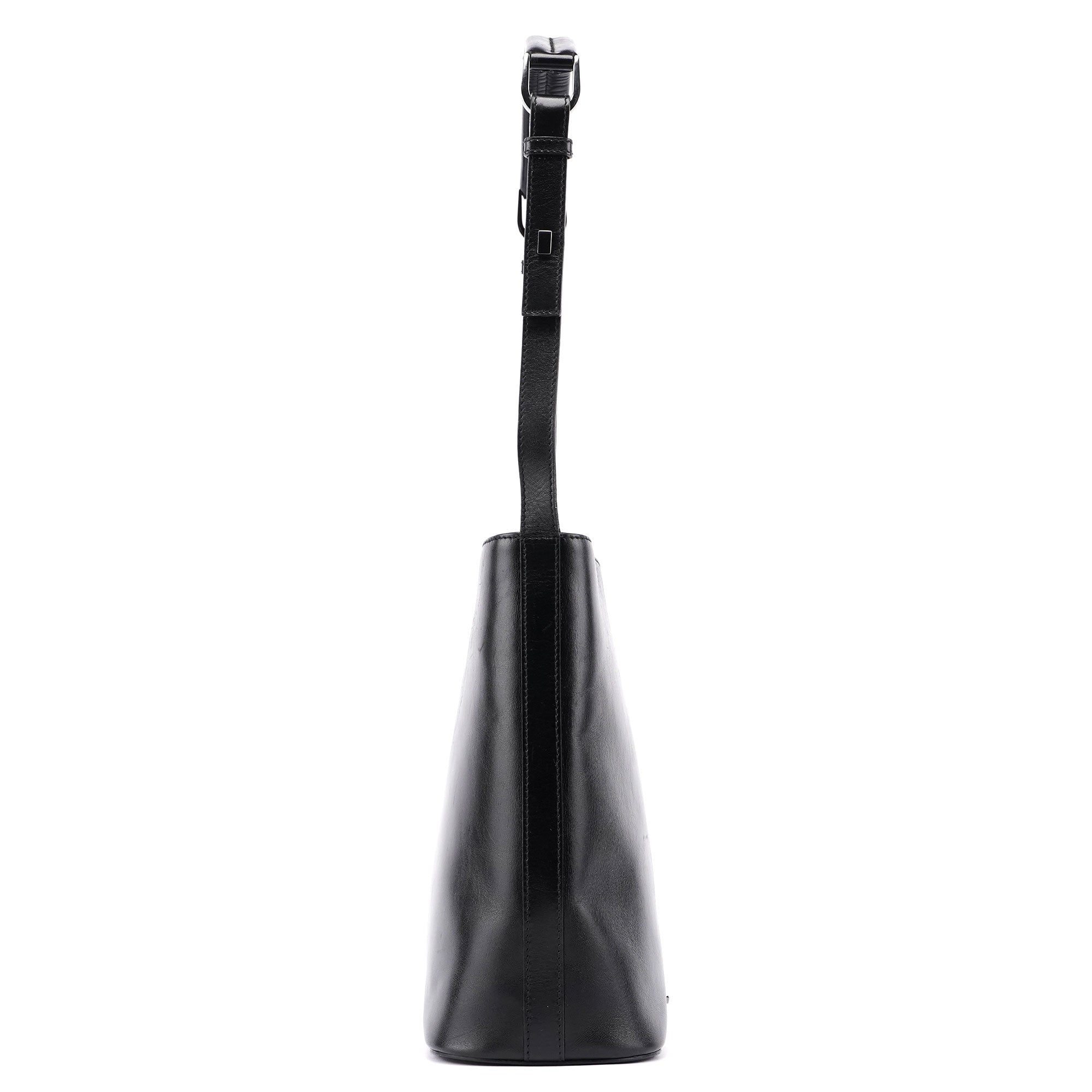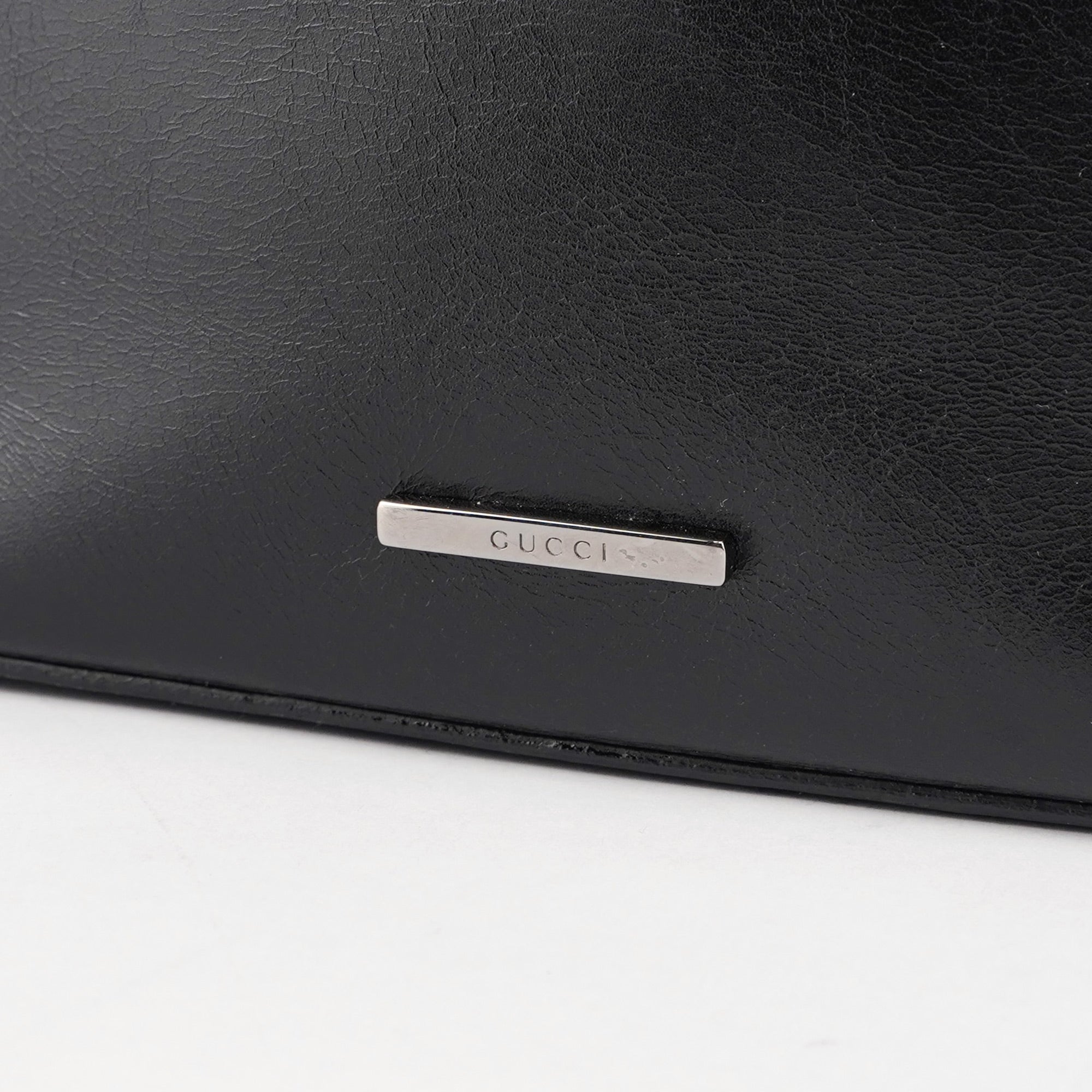 Designed by Tom Ford in the late 1990s, this Gucci Vitello bucket bag is handcrafted in black calfskin leather and features silver-tone hardware and three compartments, one with a zipper closure. The interior is lined in GG monogram satin with an interior zipper pocket. The Gucci logo plate adorns the front, showcasing timeless elegance.