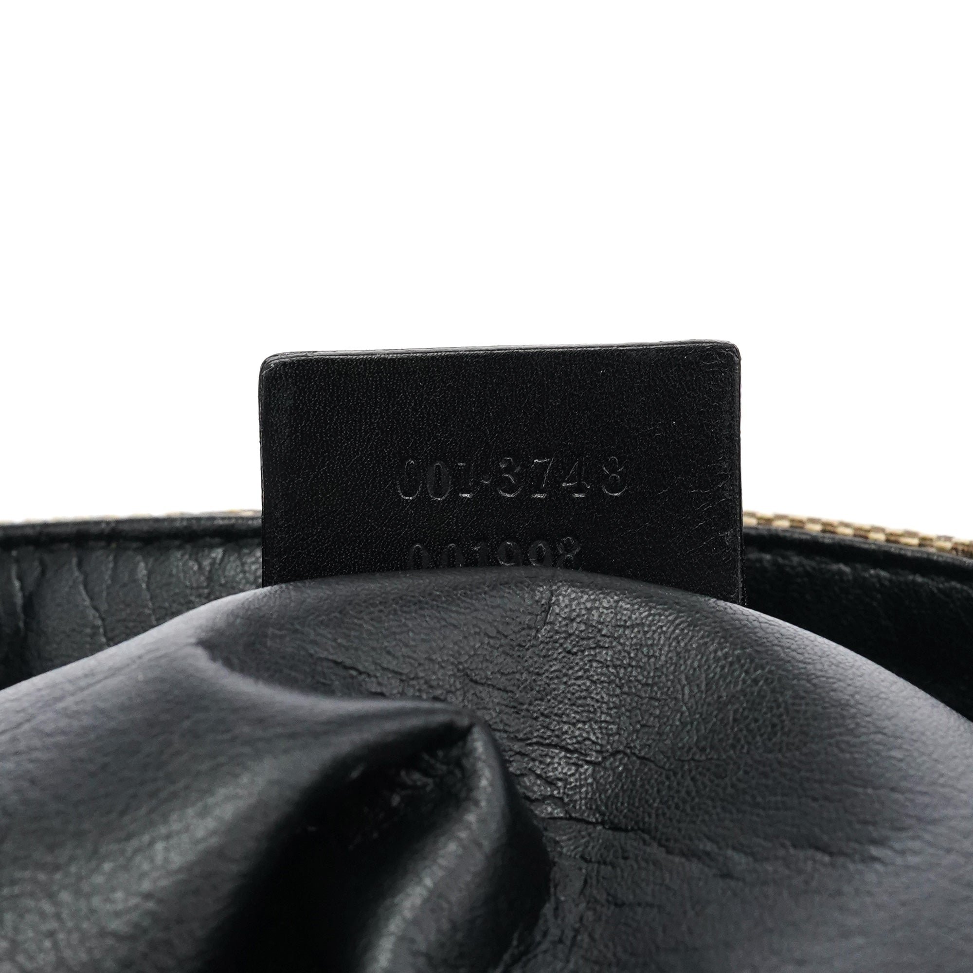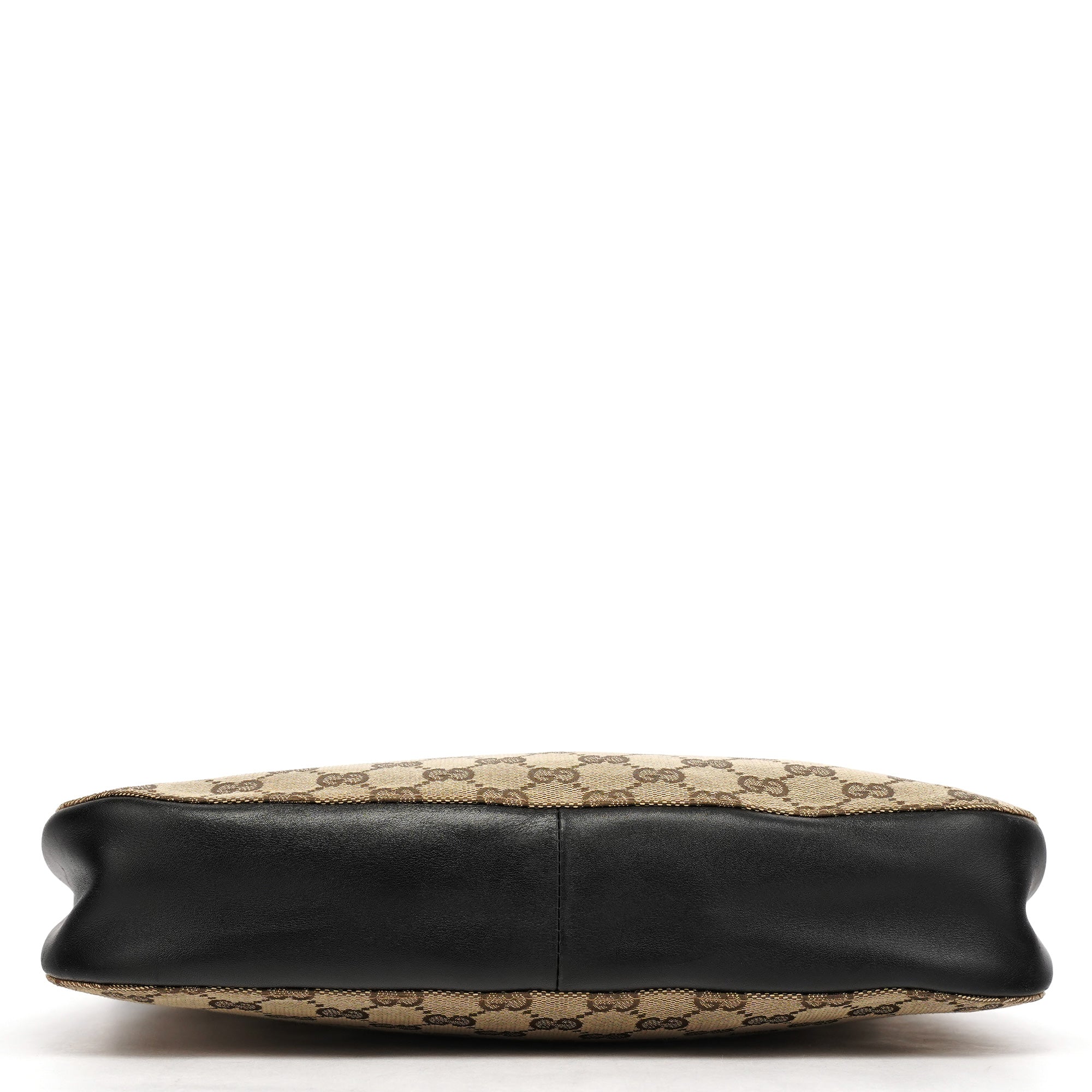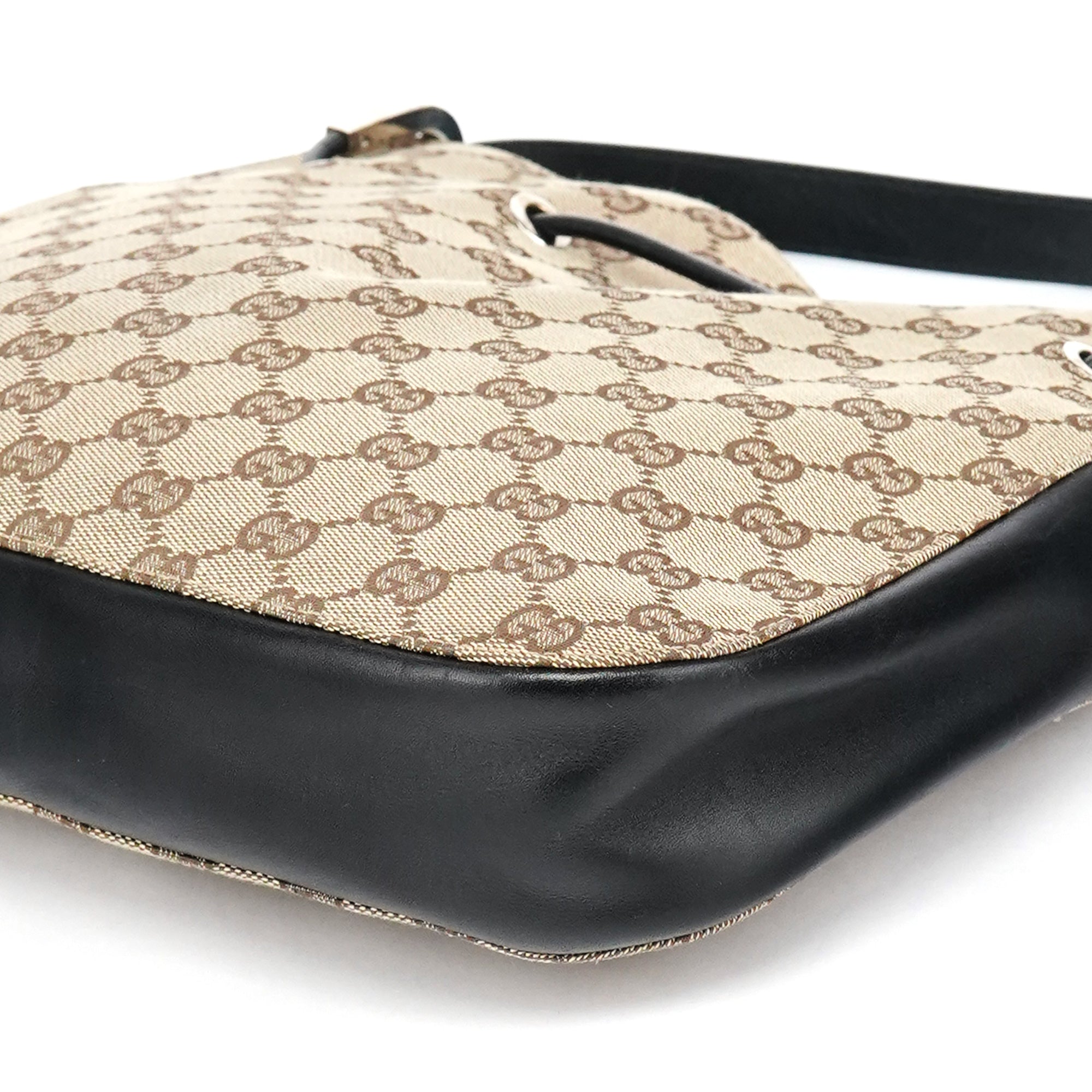 Designed by Tom Ford in the late 1990s, this Gucci GG shoulder bag is handcrafted from beige GG monogram canvas with black calfskin leather trim. Silver-tone hardware engraved with the Gucci logo accents the drawstring-style closure, offering easy access. The interior is lined in smooth black calfskin and features a zip pocket for added functionality.