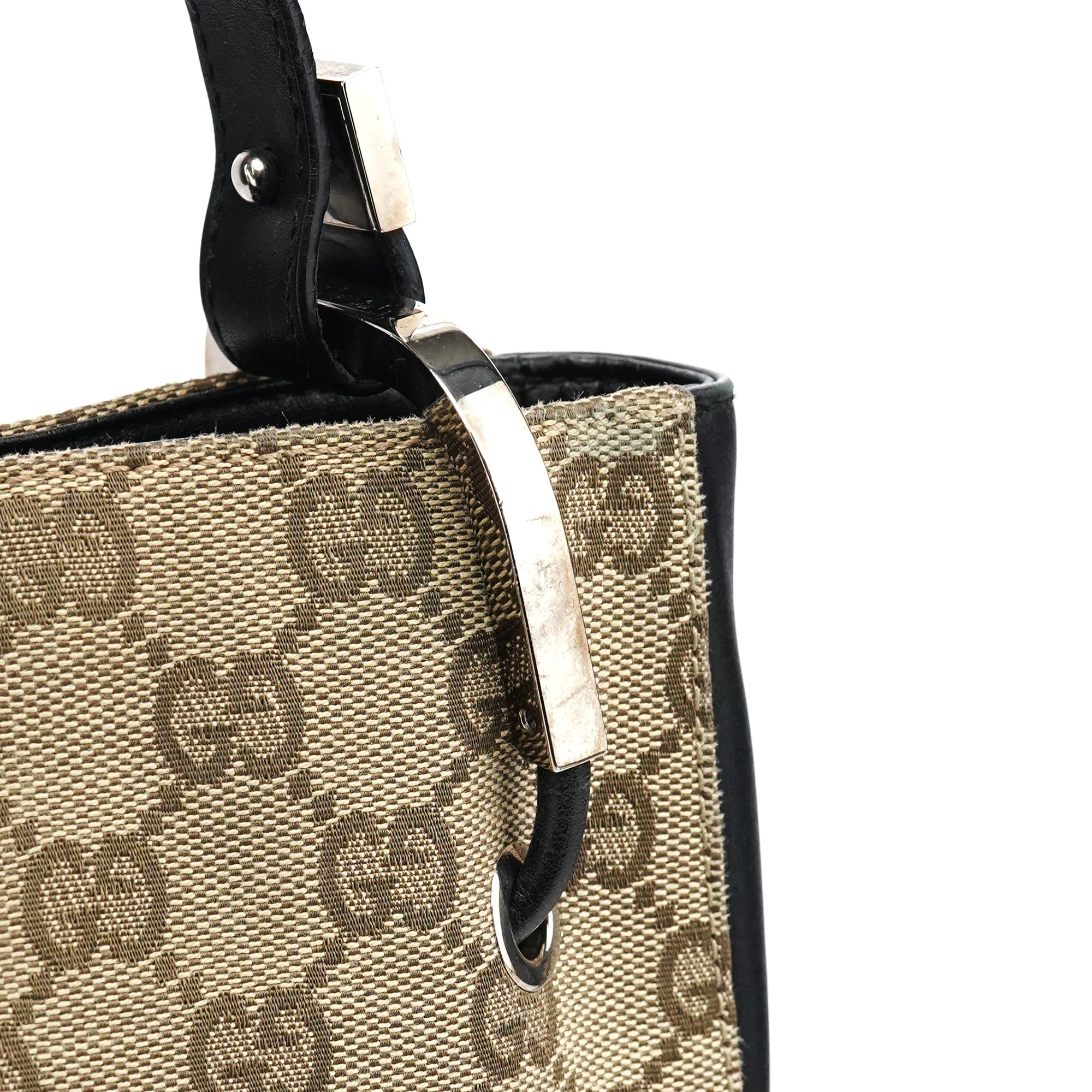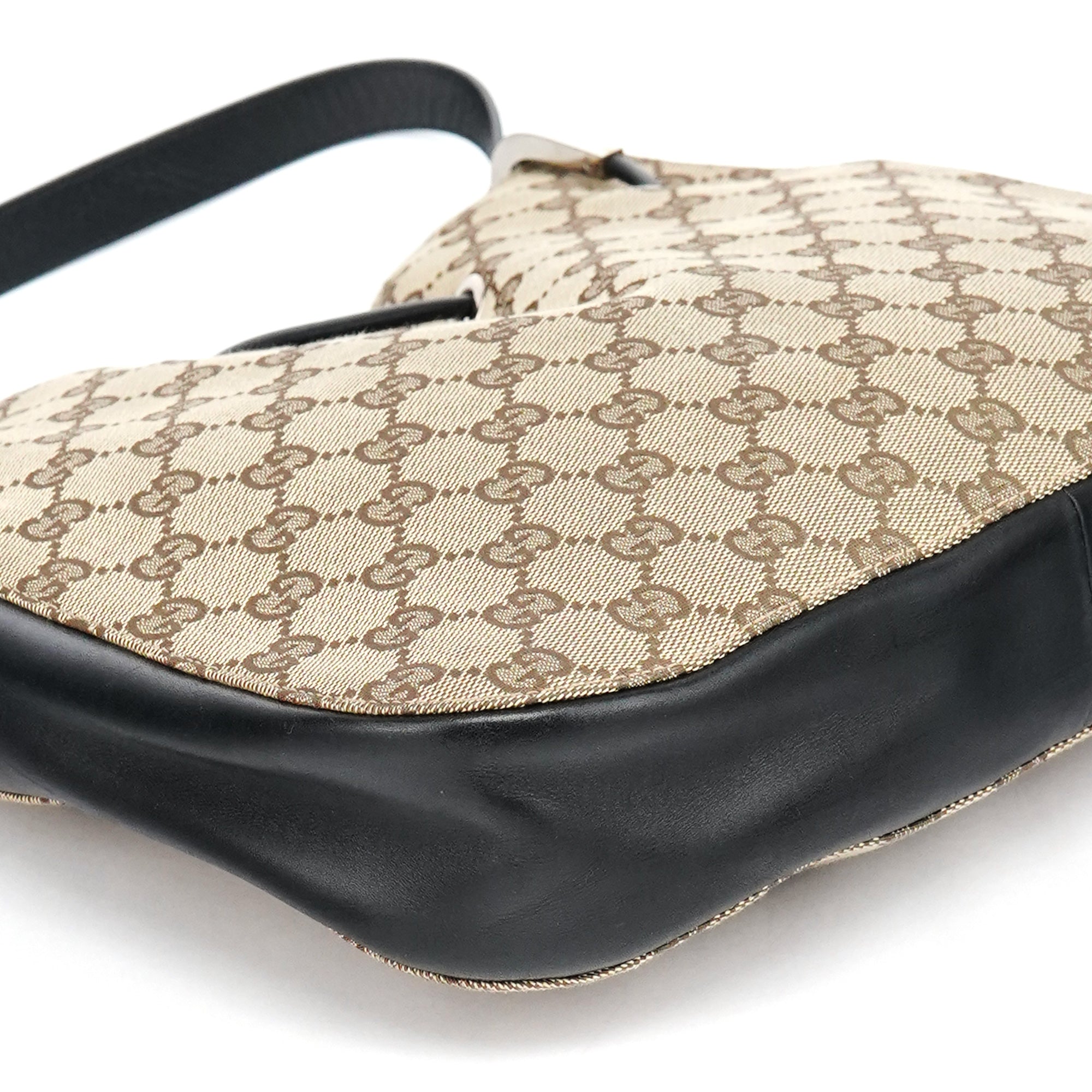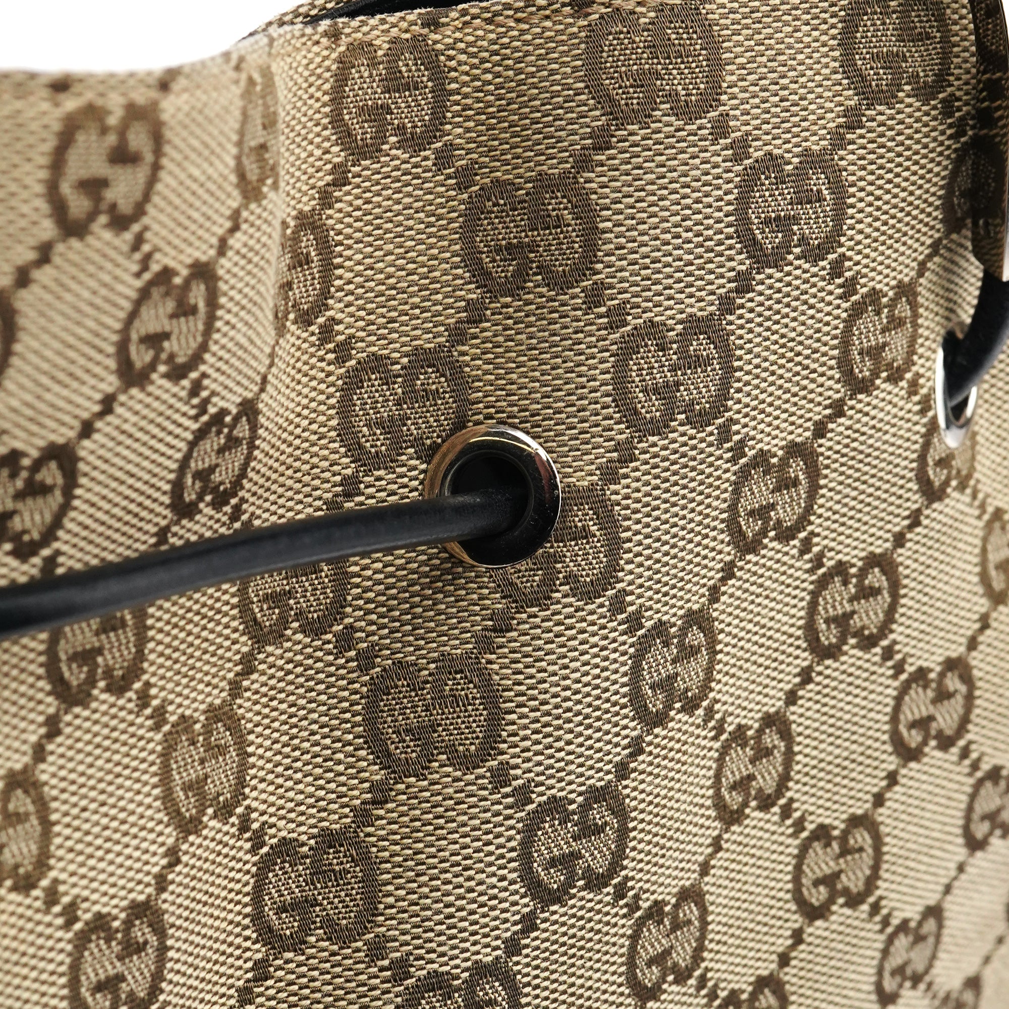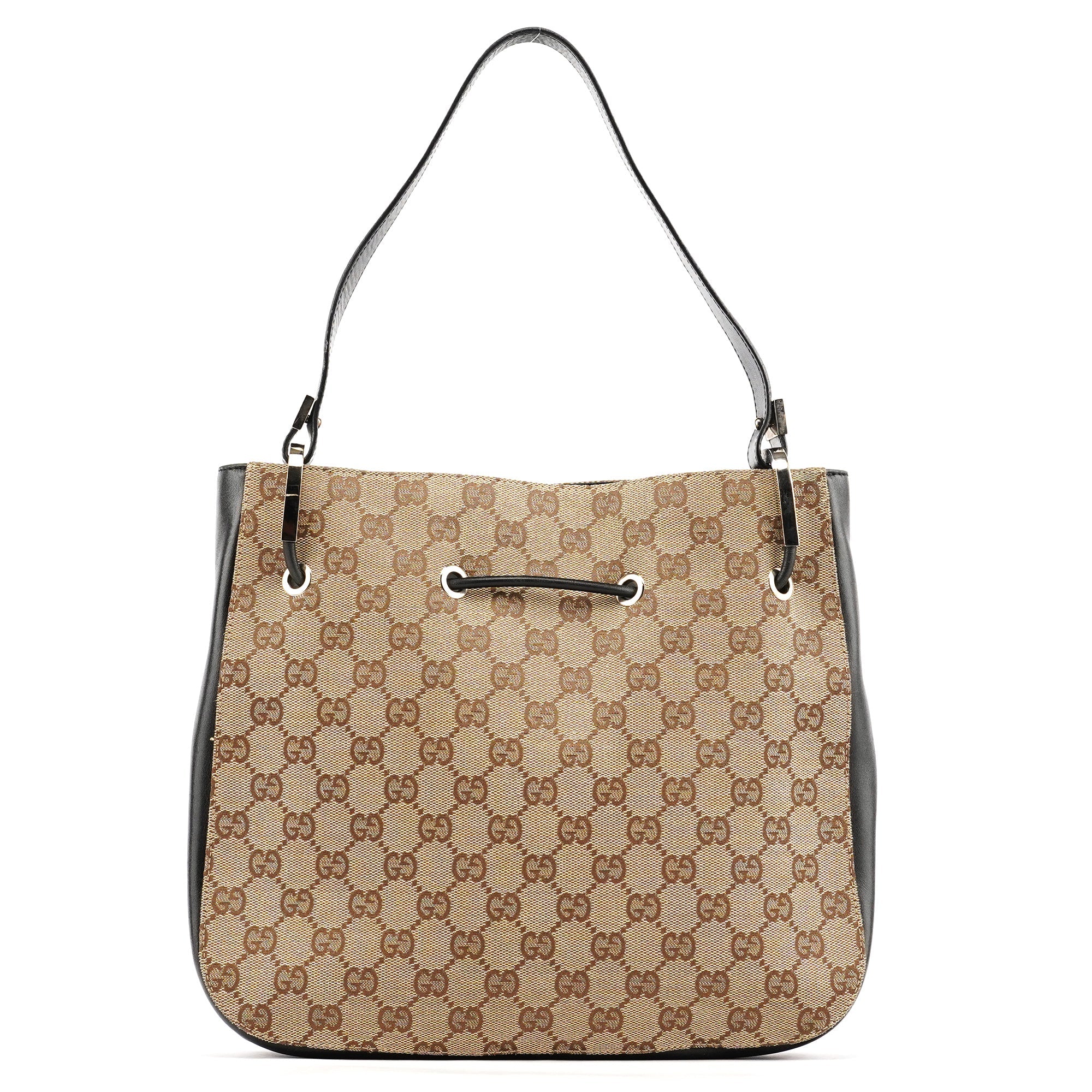 Designed by Tom Ford in the late 1990s, this Gucci GG shoulder bag is handcrafted from beige GG monogram canvas with black calfskin leather trim. Silver-tone hardware engraved with the Gucci logo accents the drawstring-style closure, offering easy access. The interior is lined in smooth black calfskin and features a zip pocket for added functionality.