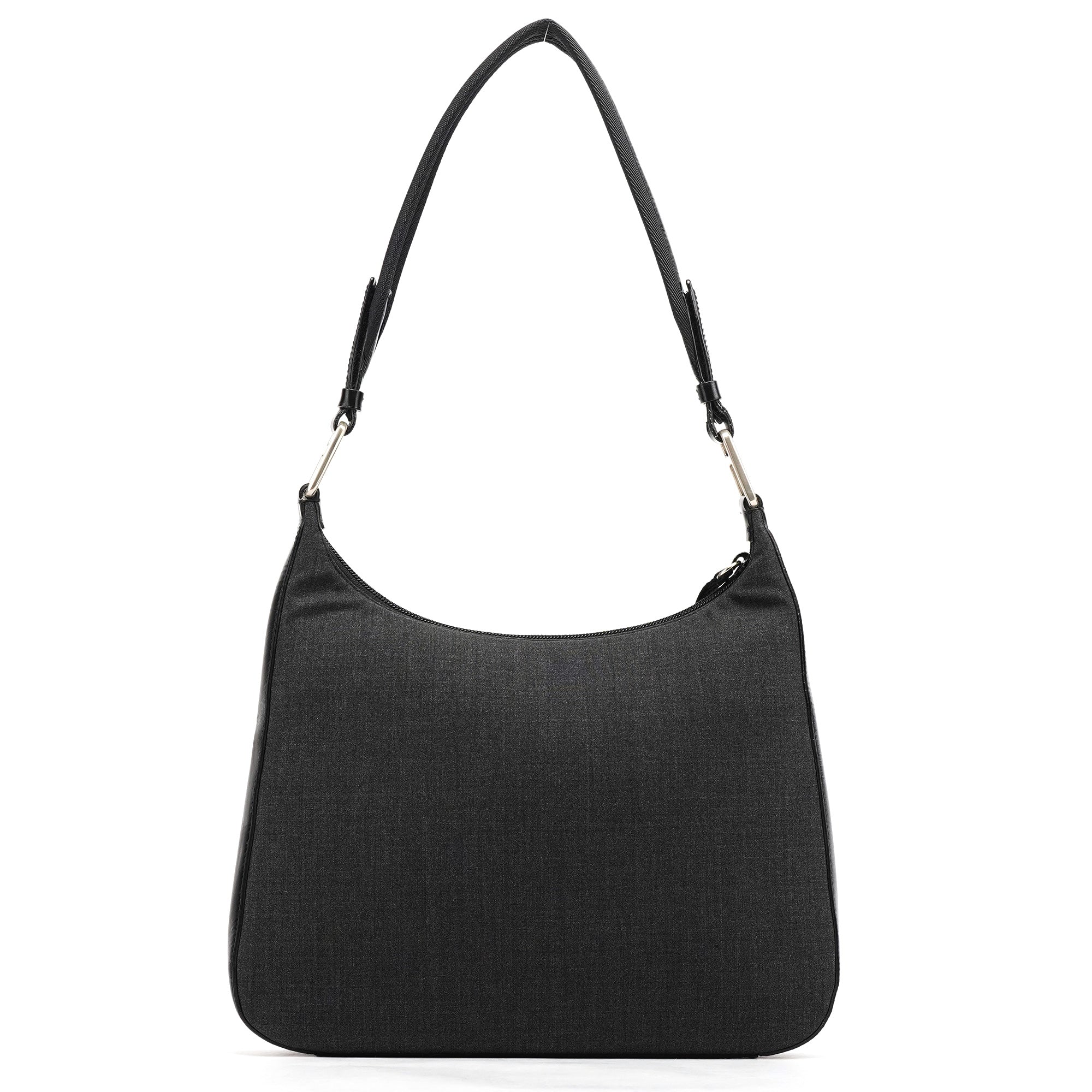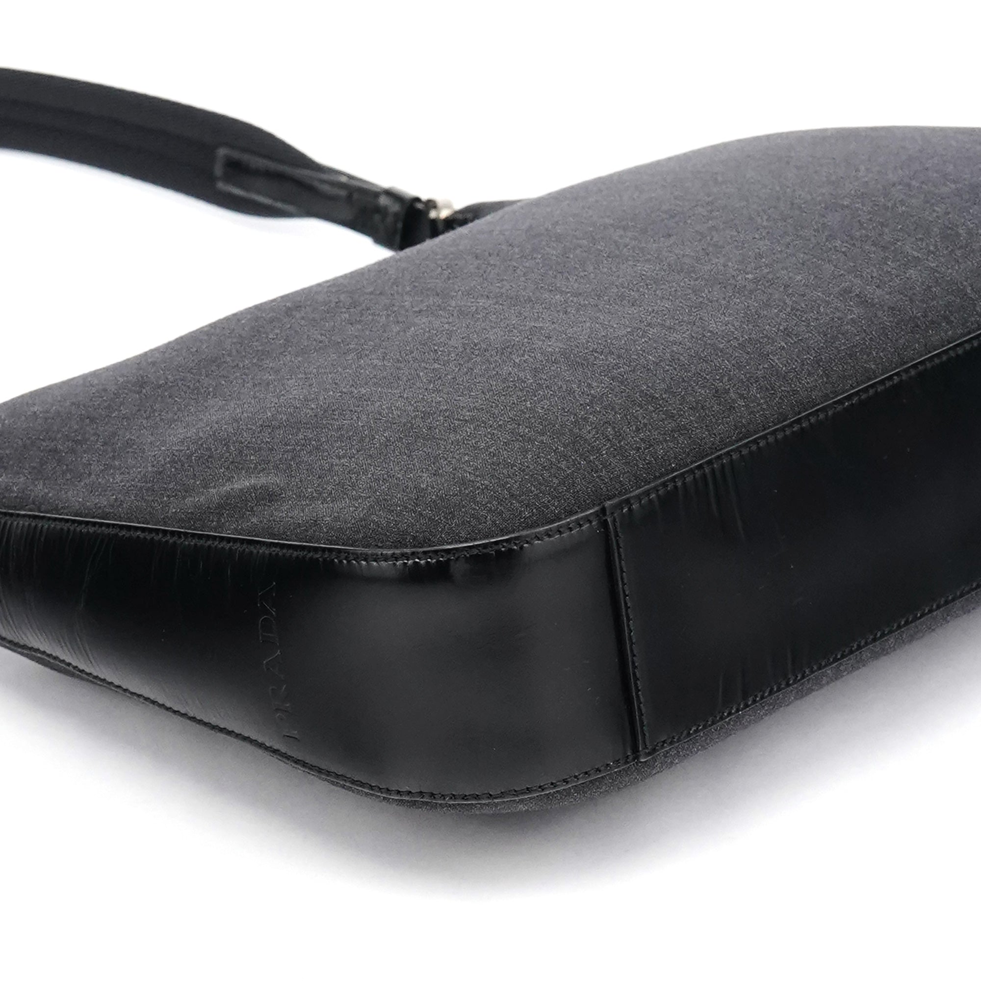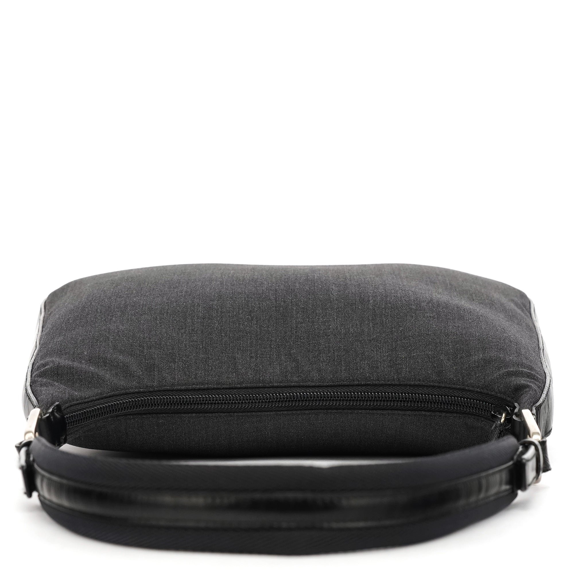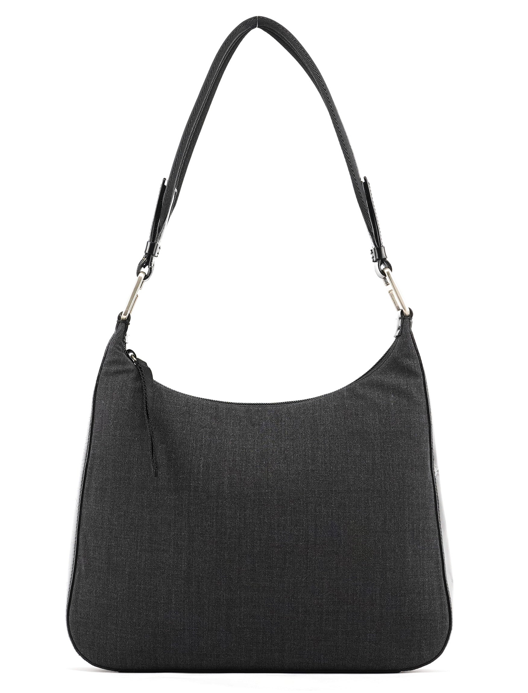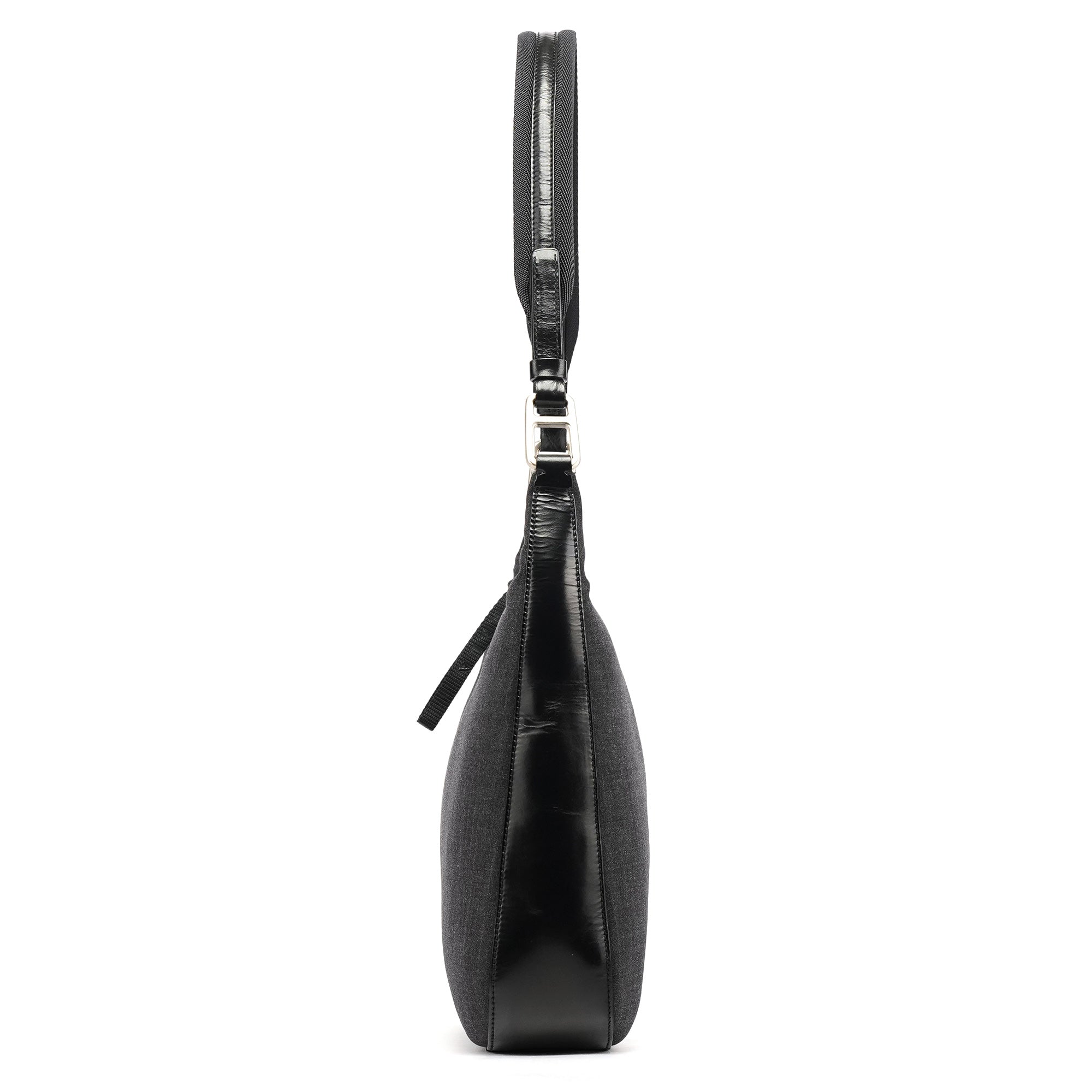 Designed in the late 1990s by Miuccia Prada, this Prada Tessuto shoulder bag is crafted in charcoal-grey nylon with black leather trim. The curved, streamlined silhouette features a top zip closure, a reinforced shoulder strap with brushed silver-tone hardware, and a black jacquard-logo interior with a zipped pocket.