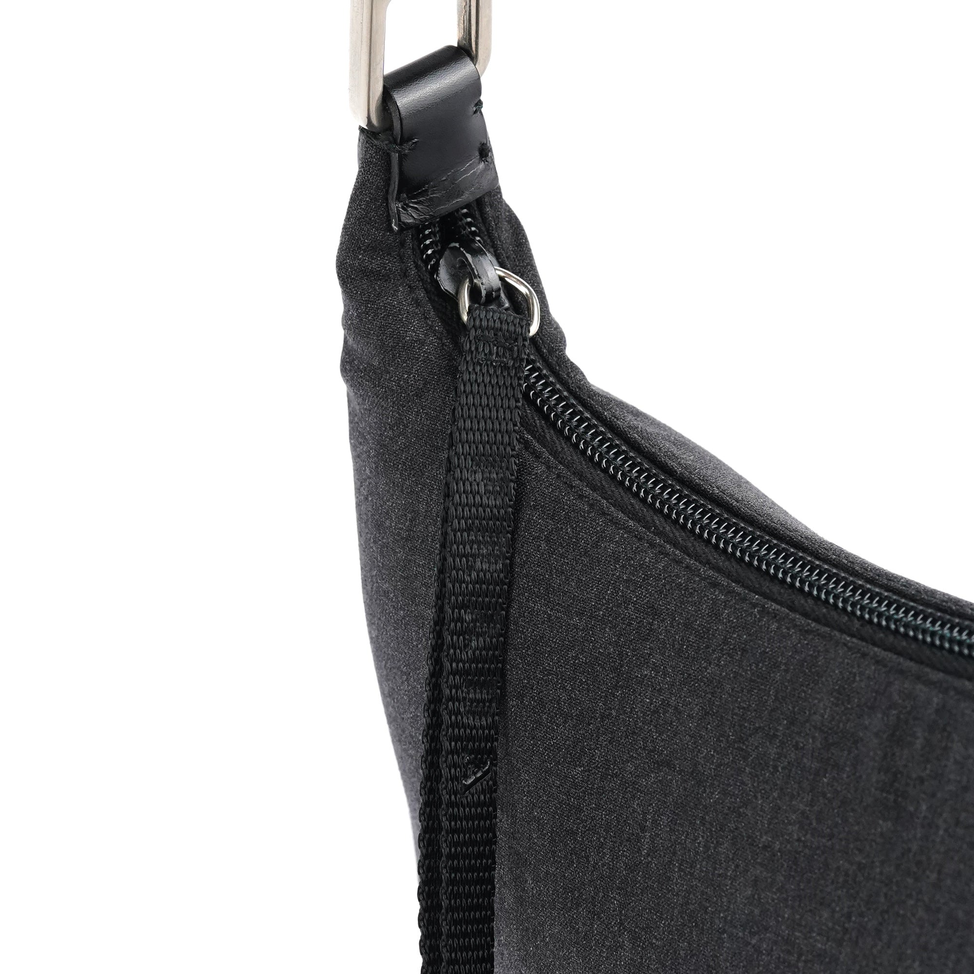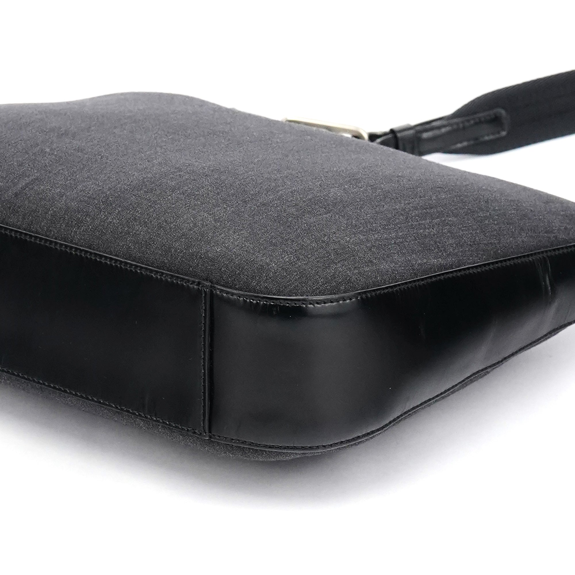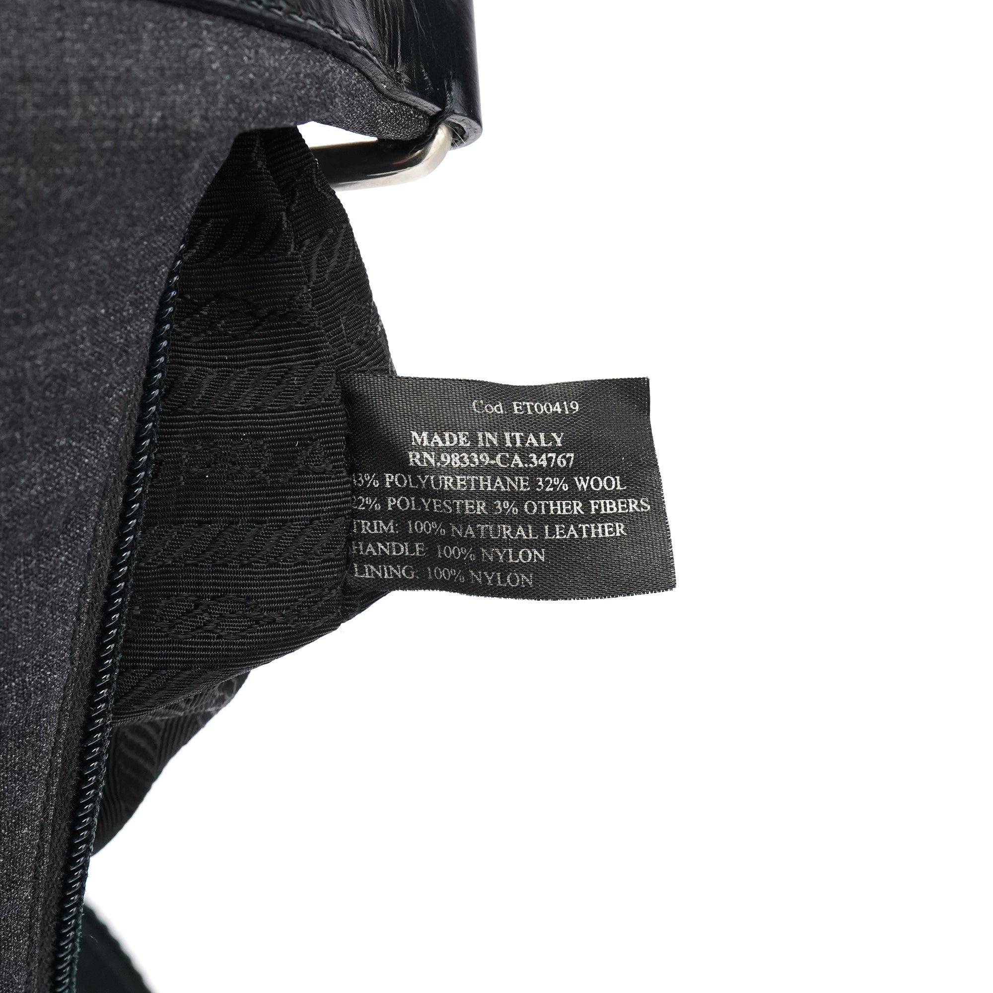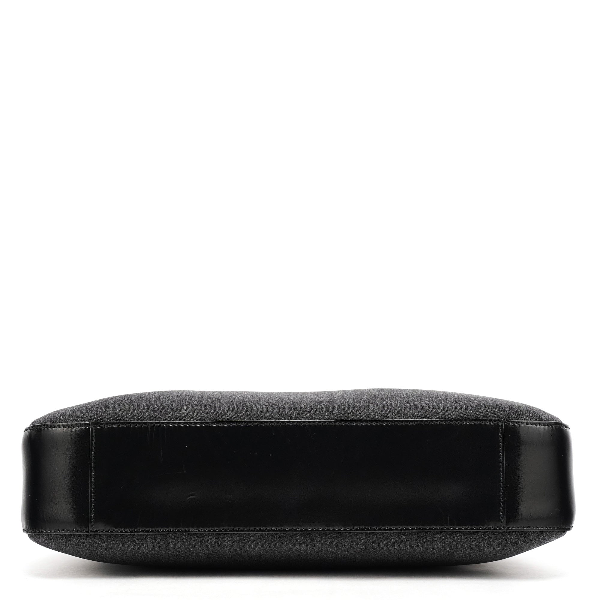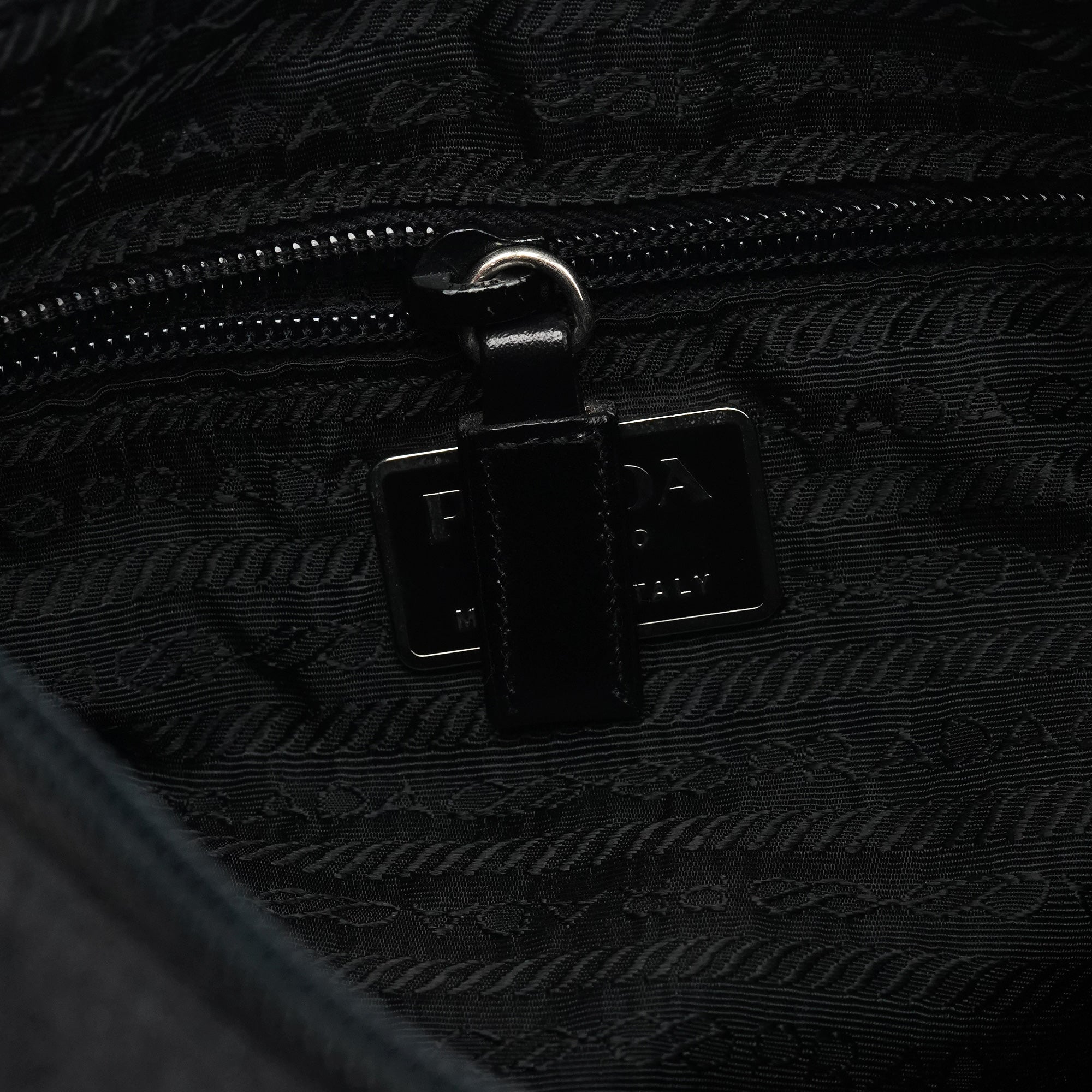 Designed in the late 1990s by Miuccia Prada, this Prada Tessuto shoulder bag is crafted in charcoal-grey nylon with black leather trim. The curved, streamlined silhouette features a top zip closure, a reinforced shoulder strap with brushed silver-tone hardware, and a black jacquard-logo interior with a zipped pocket.