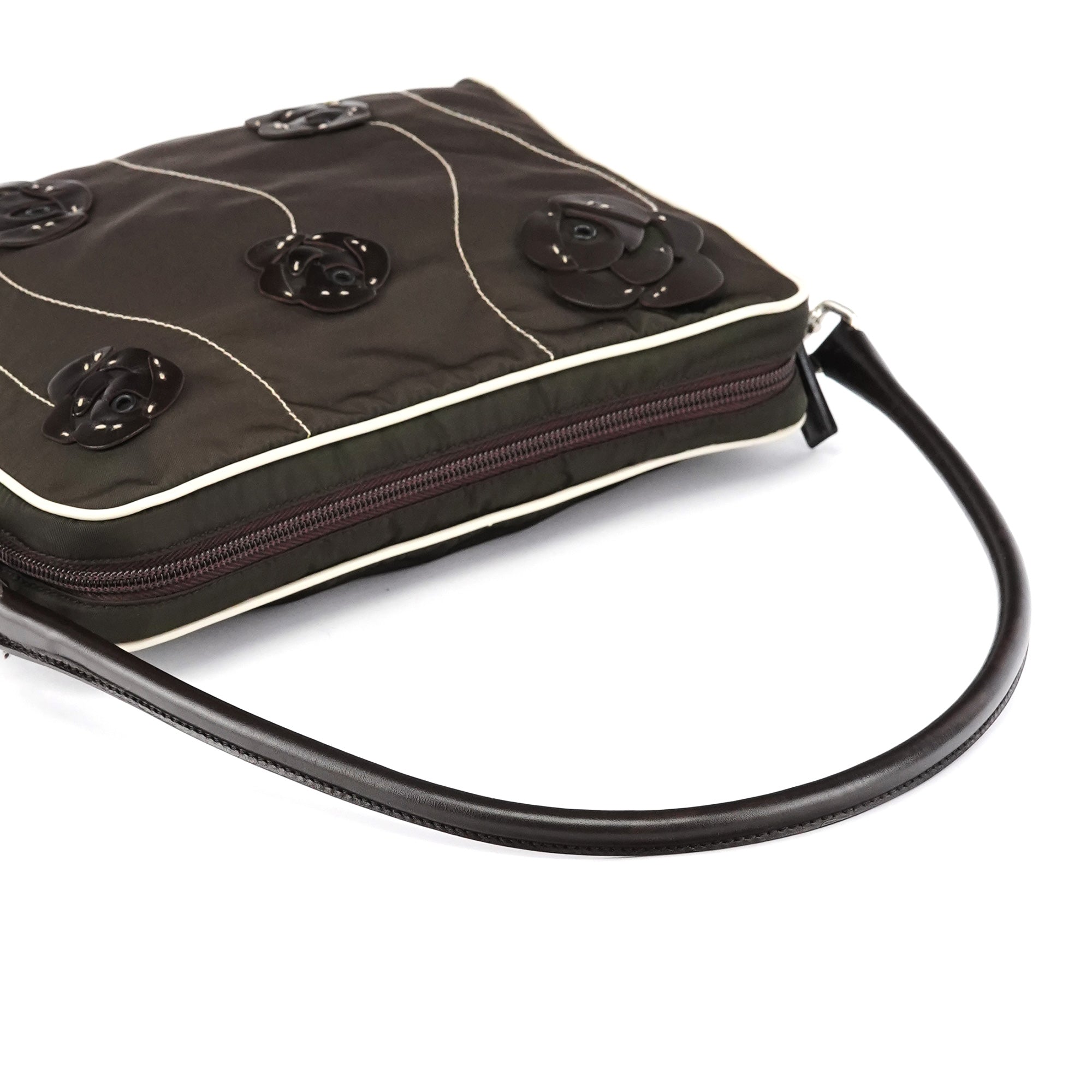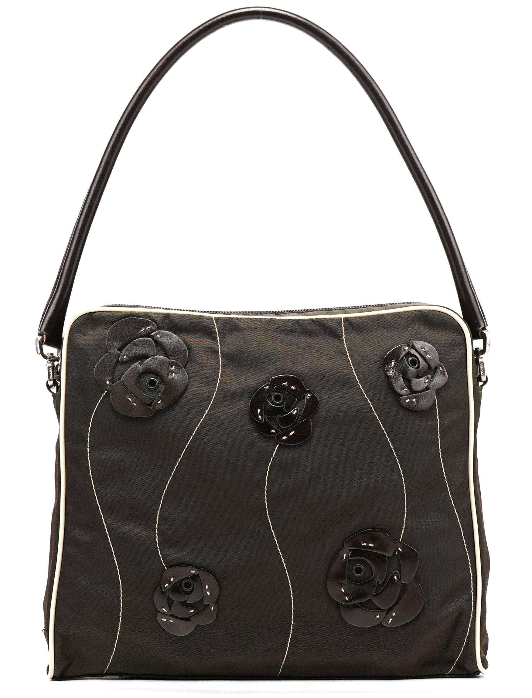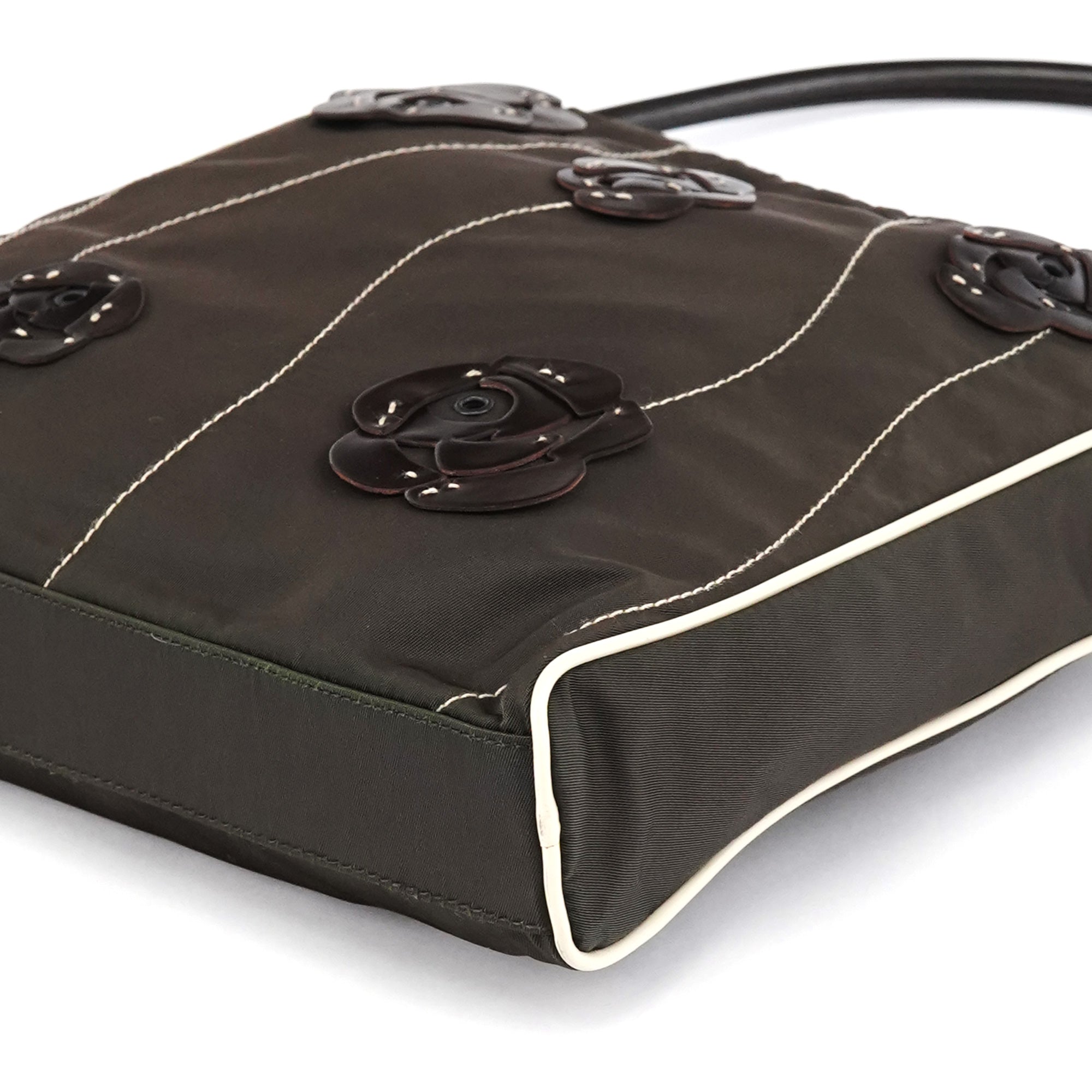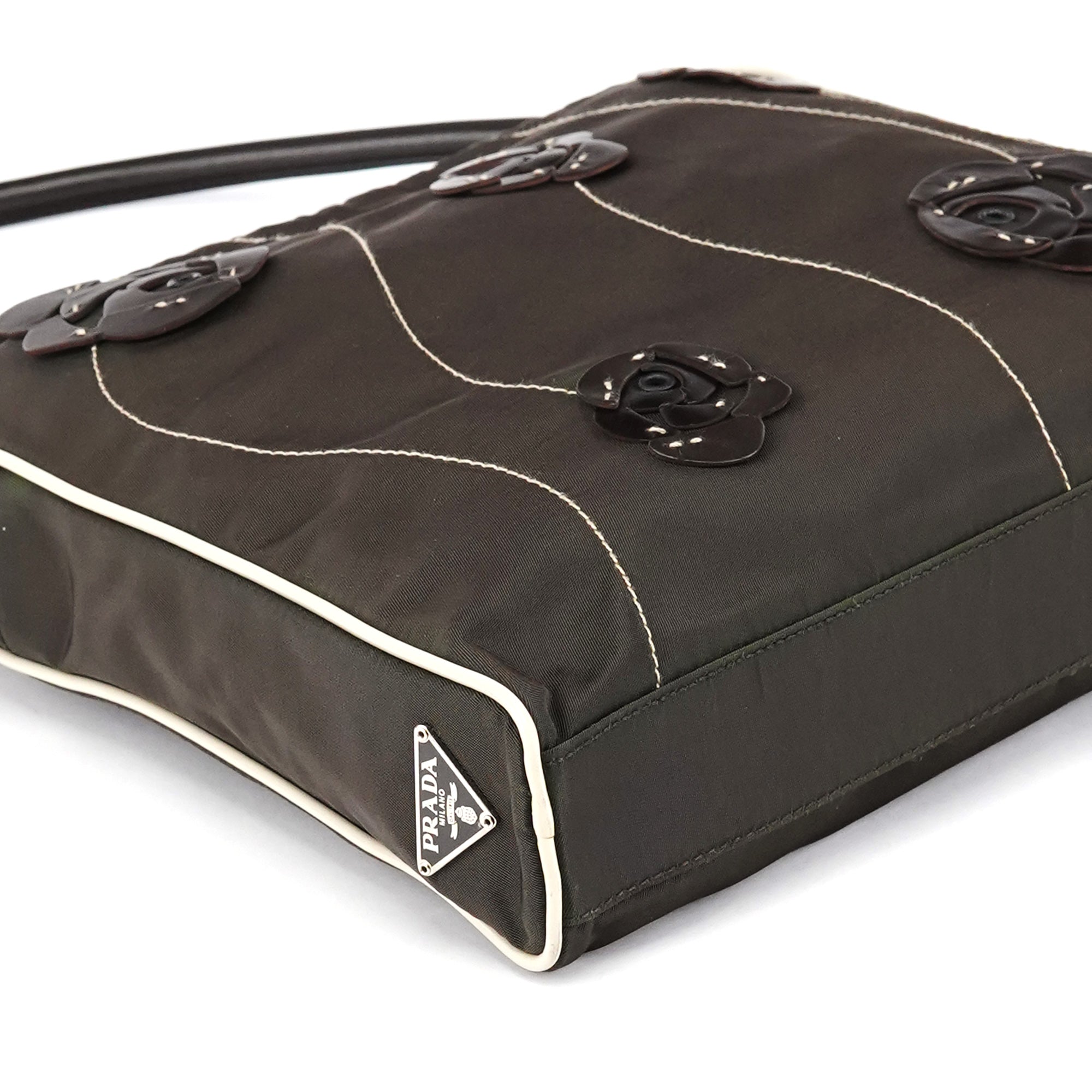 Designed in the early 2000s by Miuccia Prada, this Tessuto shoulder bag features brown nylon with contrast ivory piping and dark-brown calfskin floral appliqué. The structured silhouette is finished with silver-tone hardware and a matching shoulder strap.