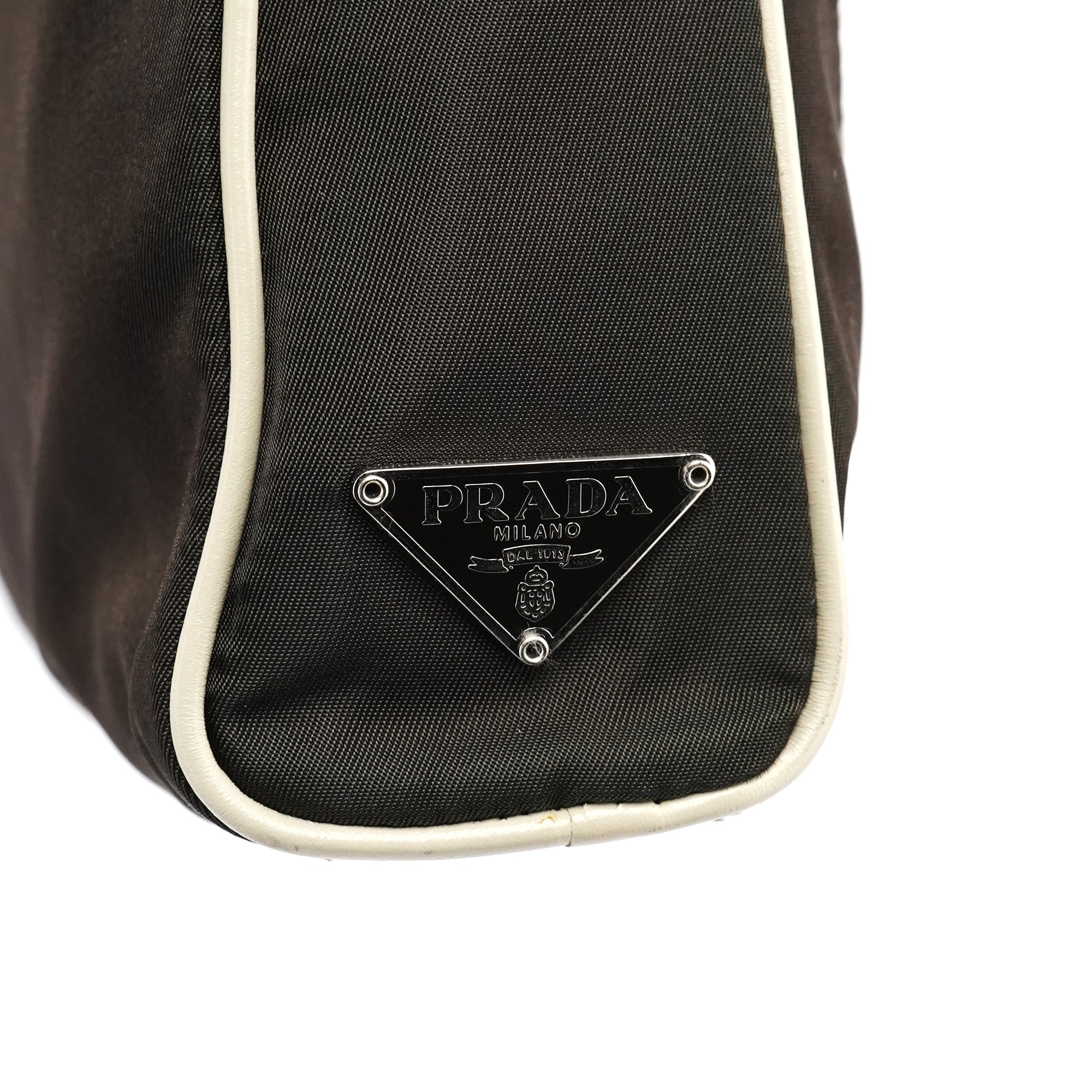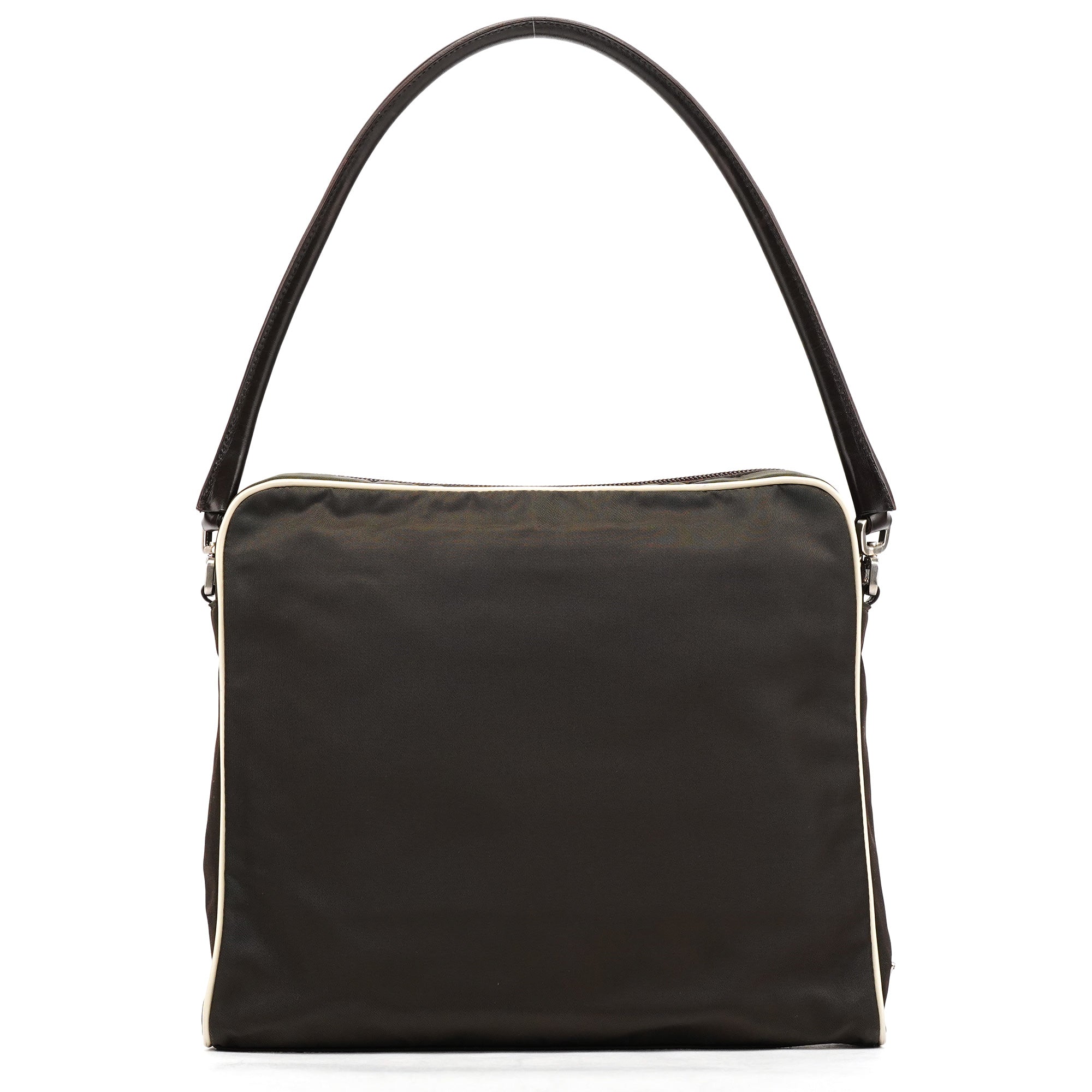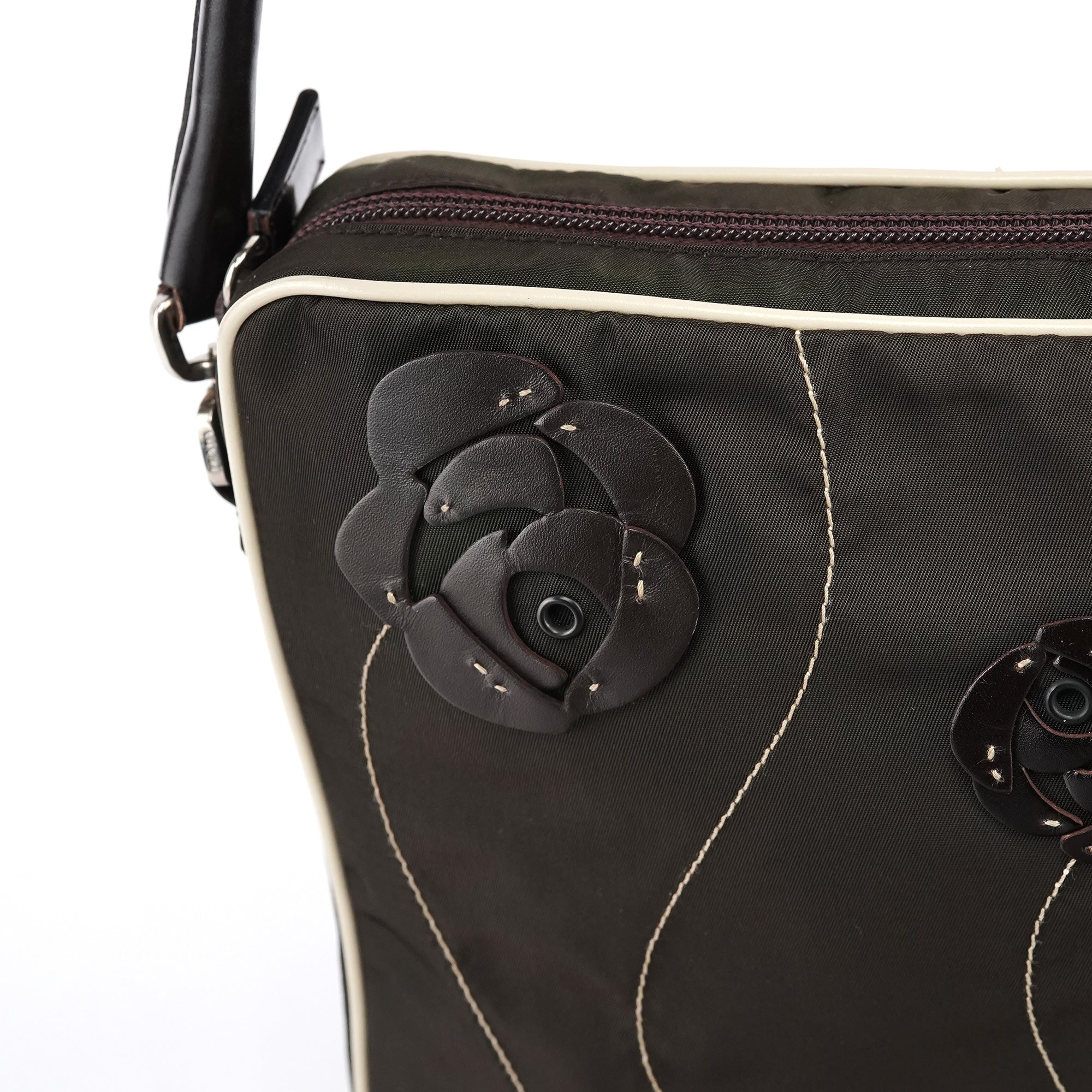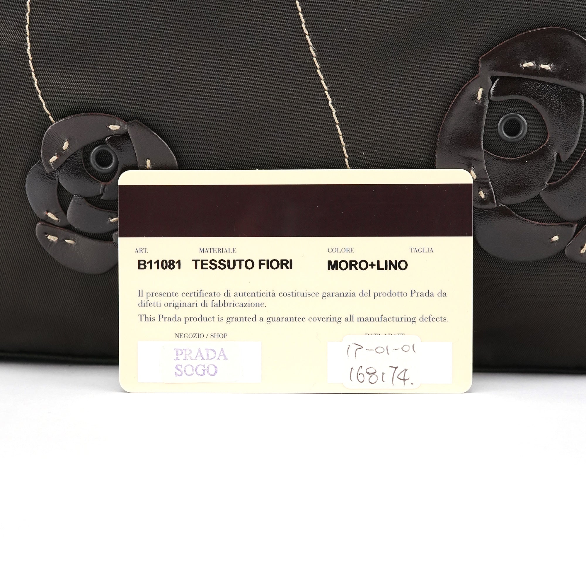 Designed in the early 2000s by Miuccia Prada, this Tessuto shoulder bag features brown nylon with contrast ivory piping and dark-brown calfskin floral appliqué. The structured silhouette is finished with silver-tone hardware and a matching shoulder strap.