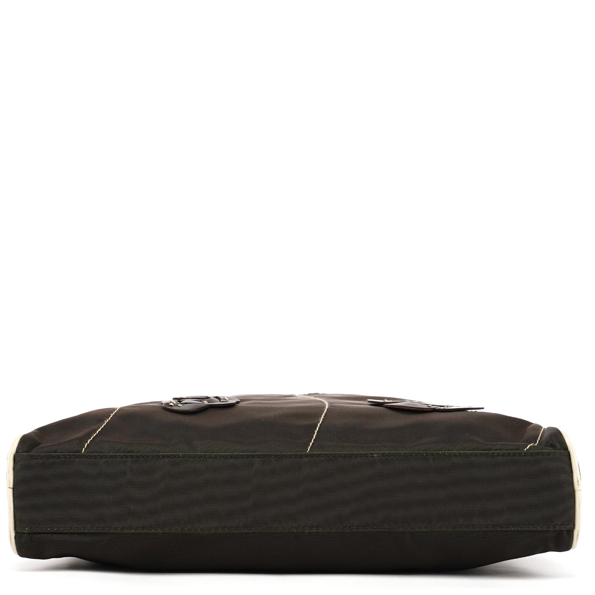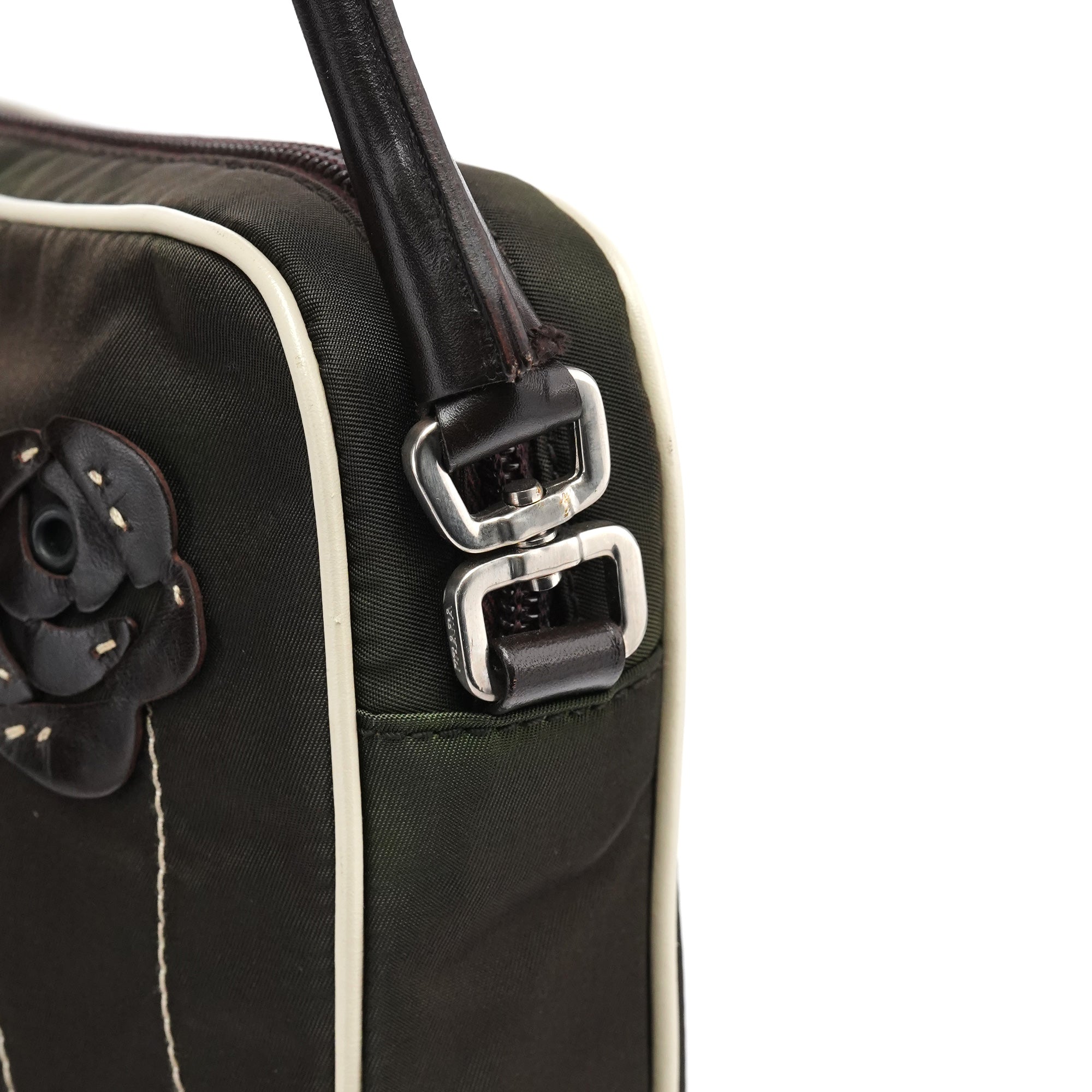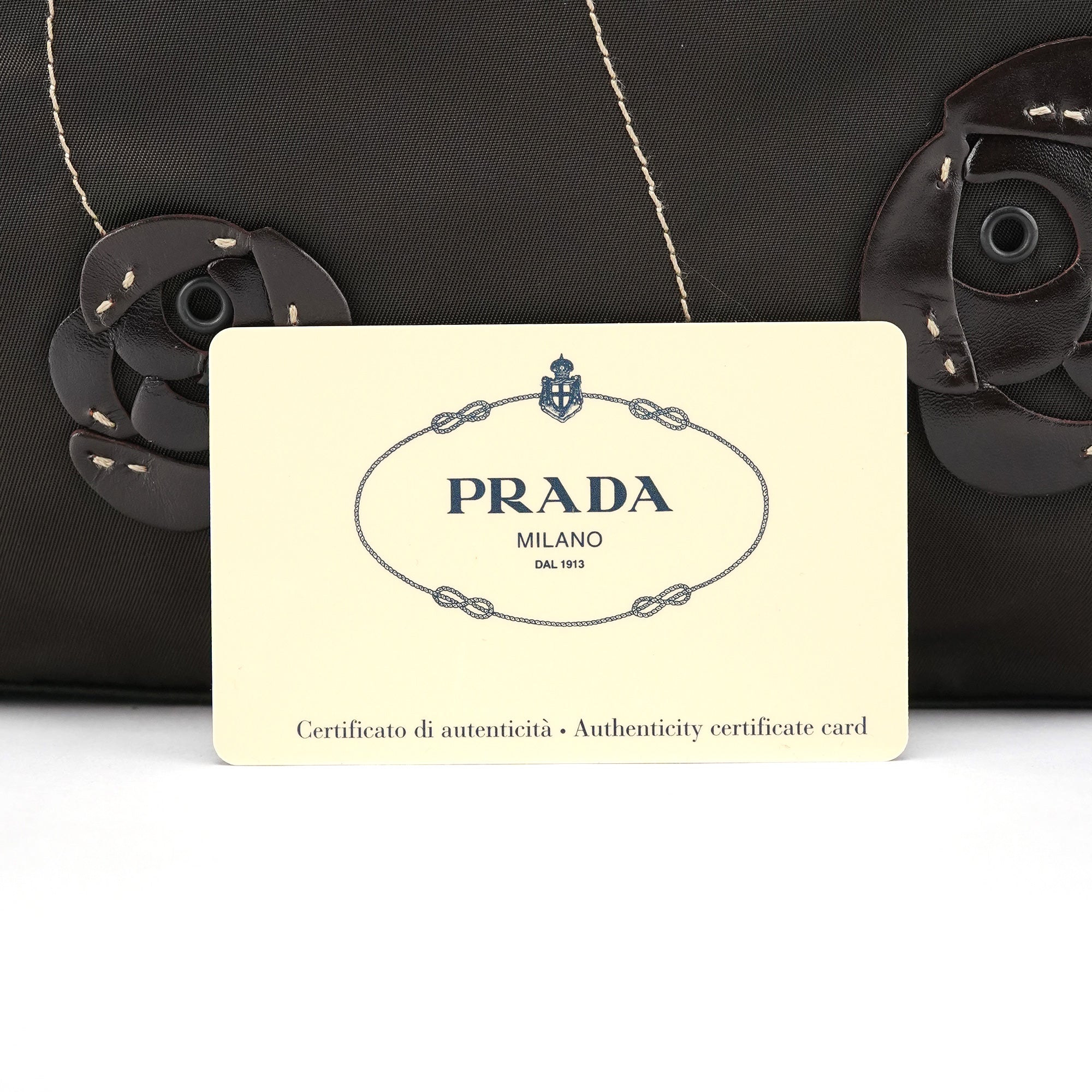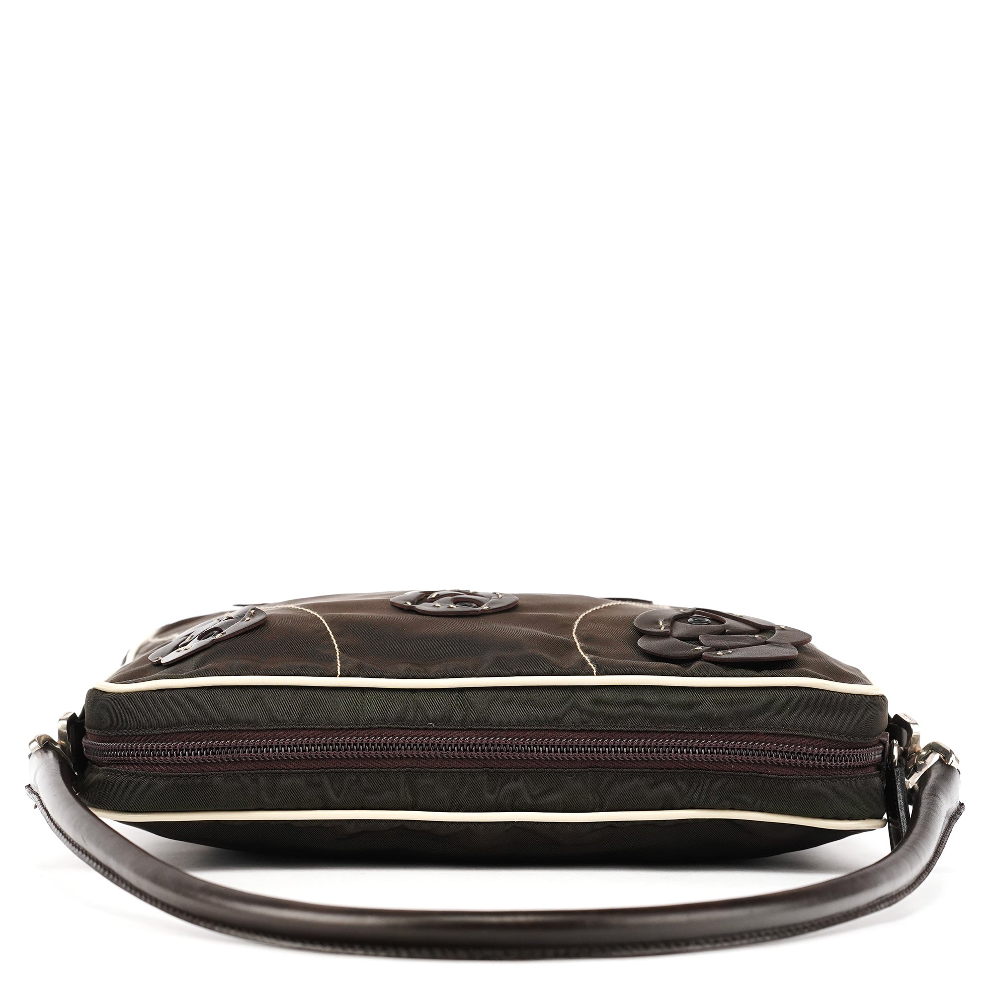 Designed in the early 2000s by Miuccia Prada, this Tessuto shoulder bag features brown nylon with contrast ivory piping and dark-brown calfskin floral appliqué. The structured silhouette is finished with silver-tone hardware and a matching shoulder strap.