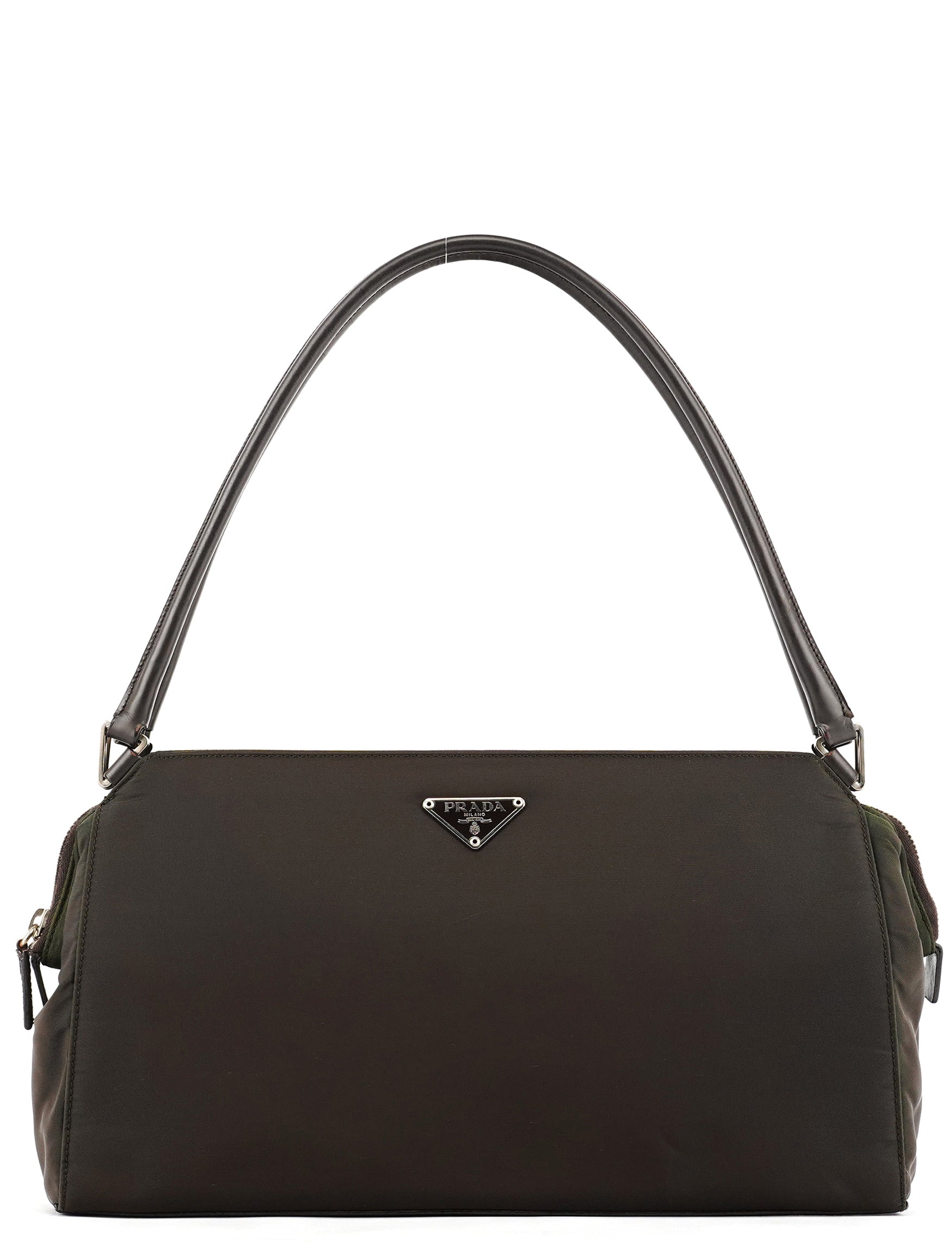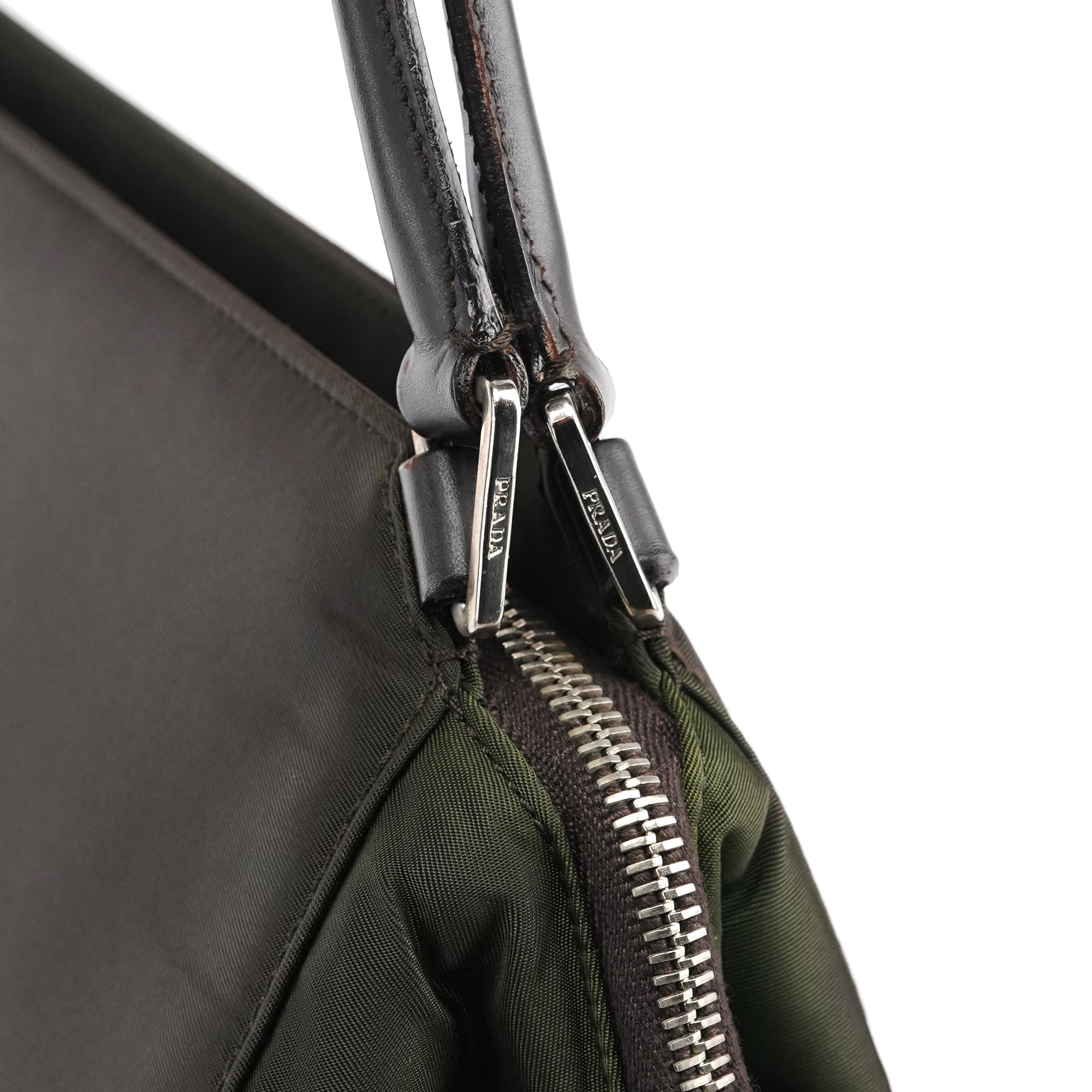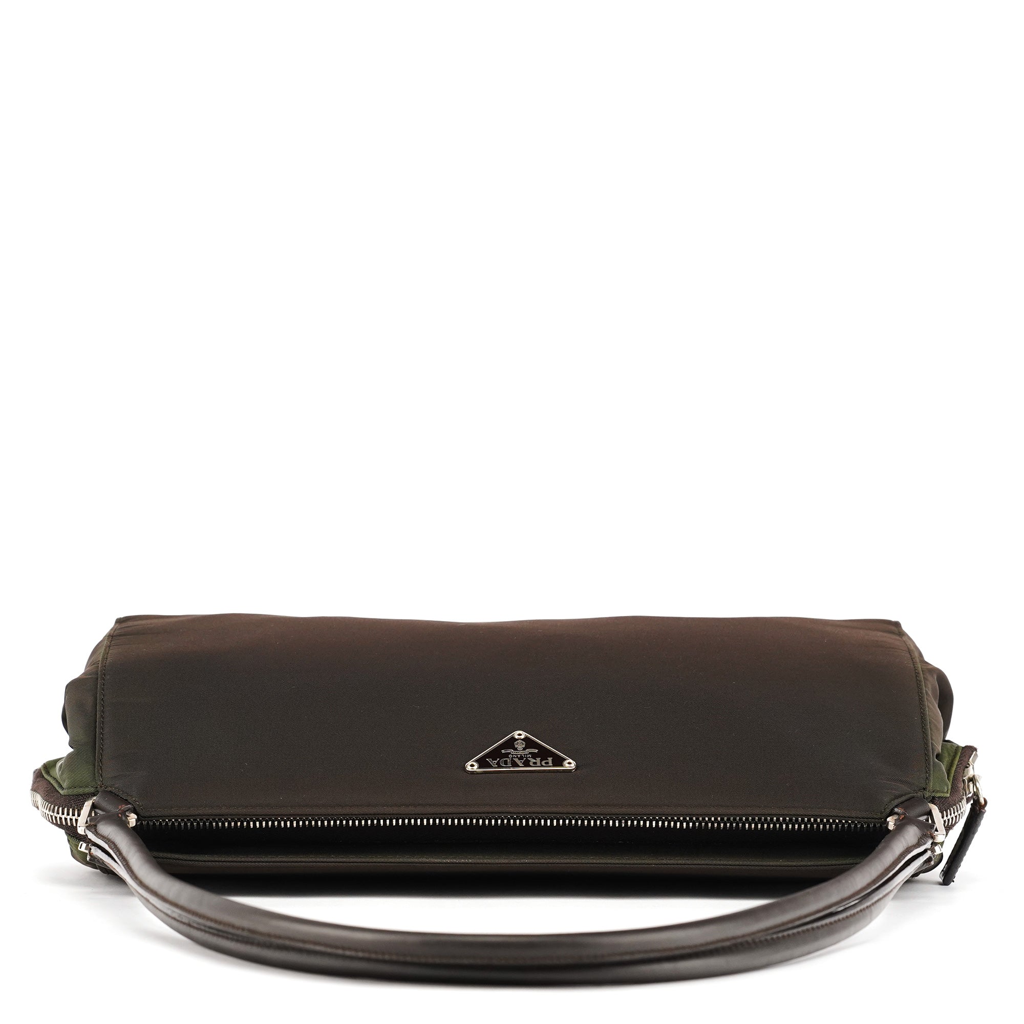 Designed in the early 2000s by Miuccia Prada, this Tessuto Chic shoulder bag is crafted in deep military-green nylon with matching dark leather trim. The structured silhouette is finished with the enamelled Prada triangle logo and fitted with silver-tone zipper leading into the main compartment. The interior features the signature jacquard lining with a zipped pocket.