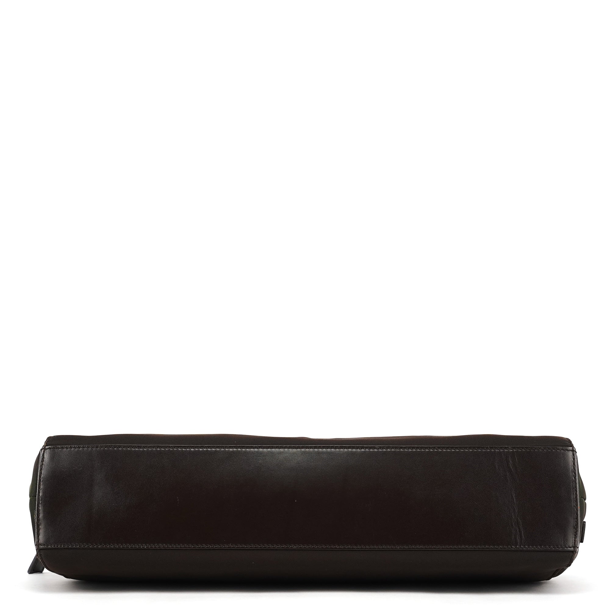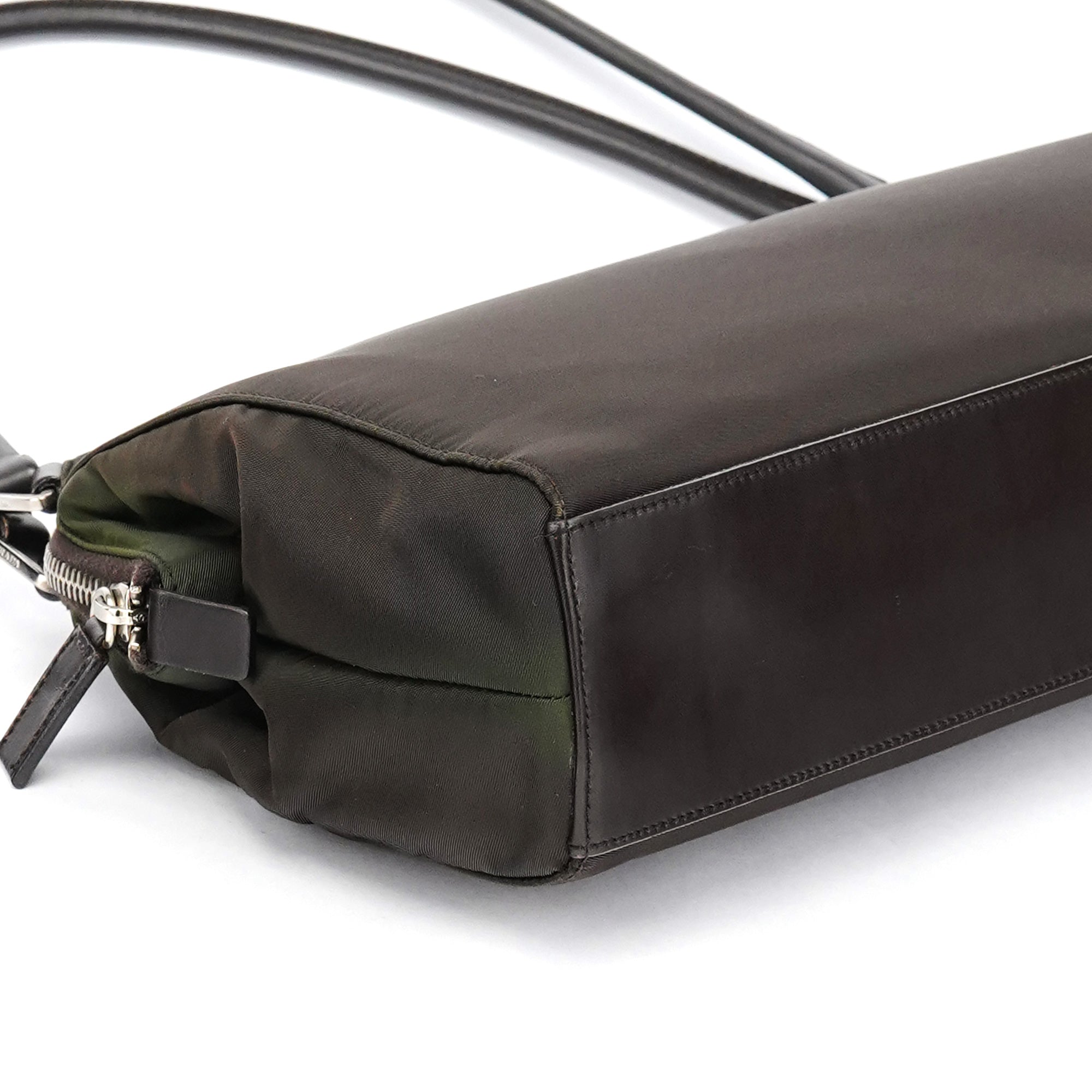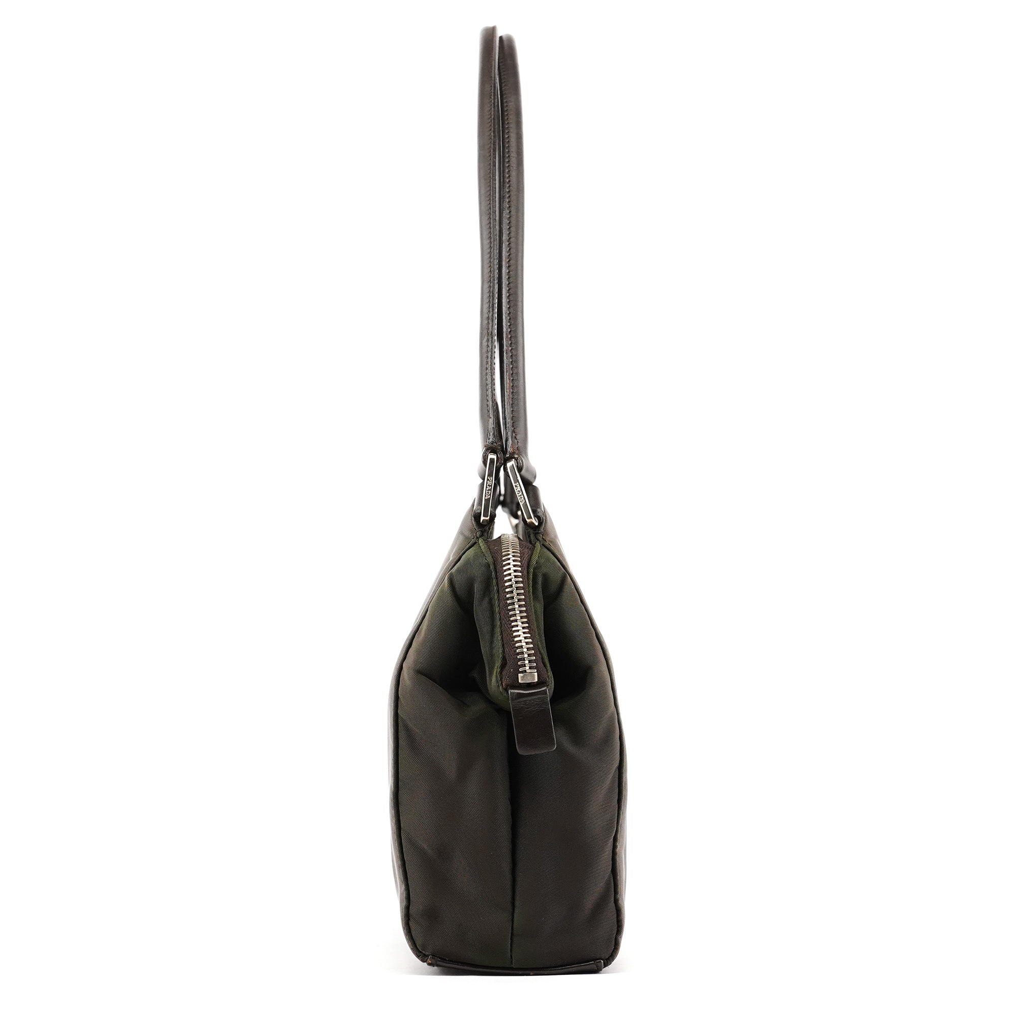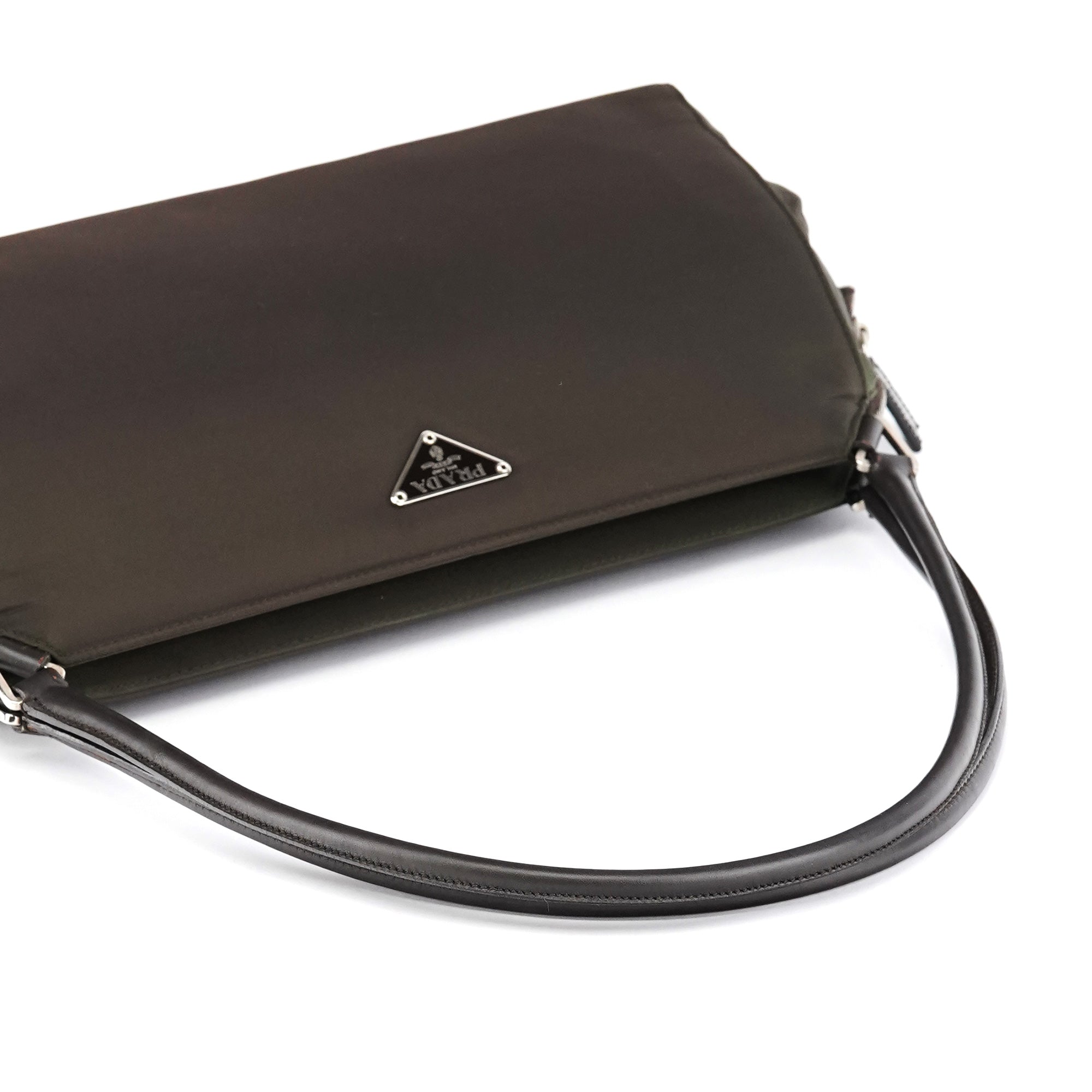 Designed in the early 2000s by Miuccia Prada, this Tessuto Chic shoulder bag is crafted in deep military-green nylon with matching dark leather trim. The structured silhouette is finished with the enamelled Prada triangle logo and fitted with silver-tone zipper leading into the main compartment. The interior features the signature jacquard lining with a zipped pocket.
