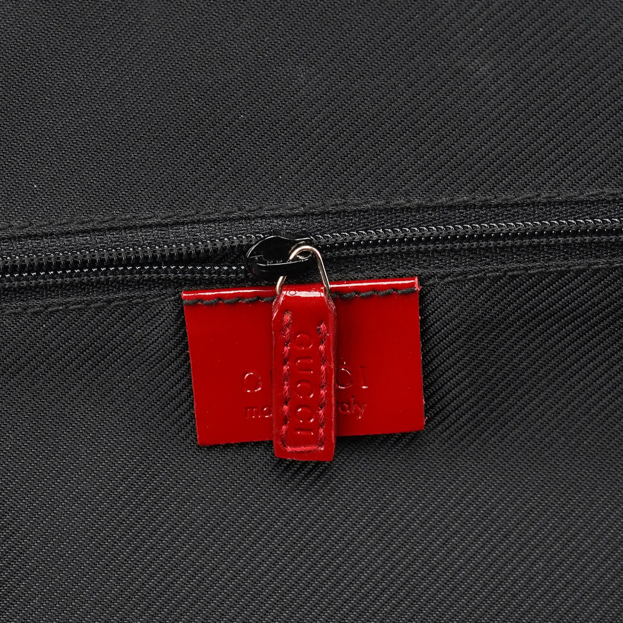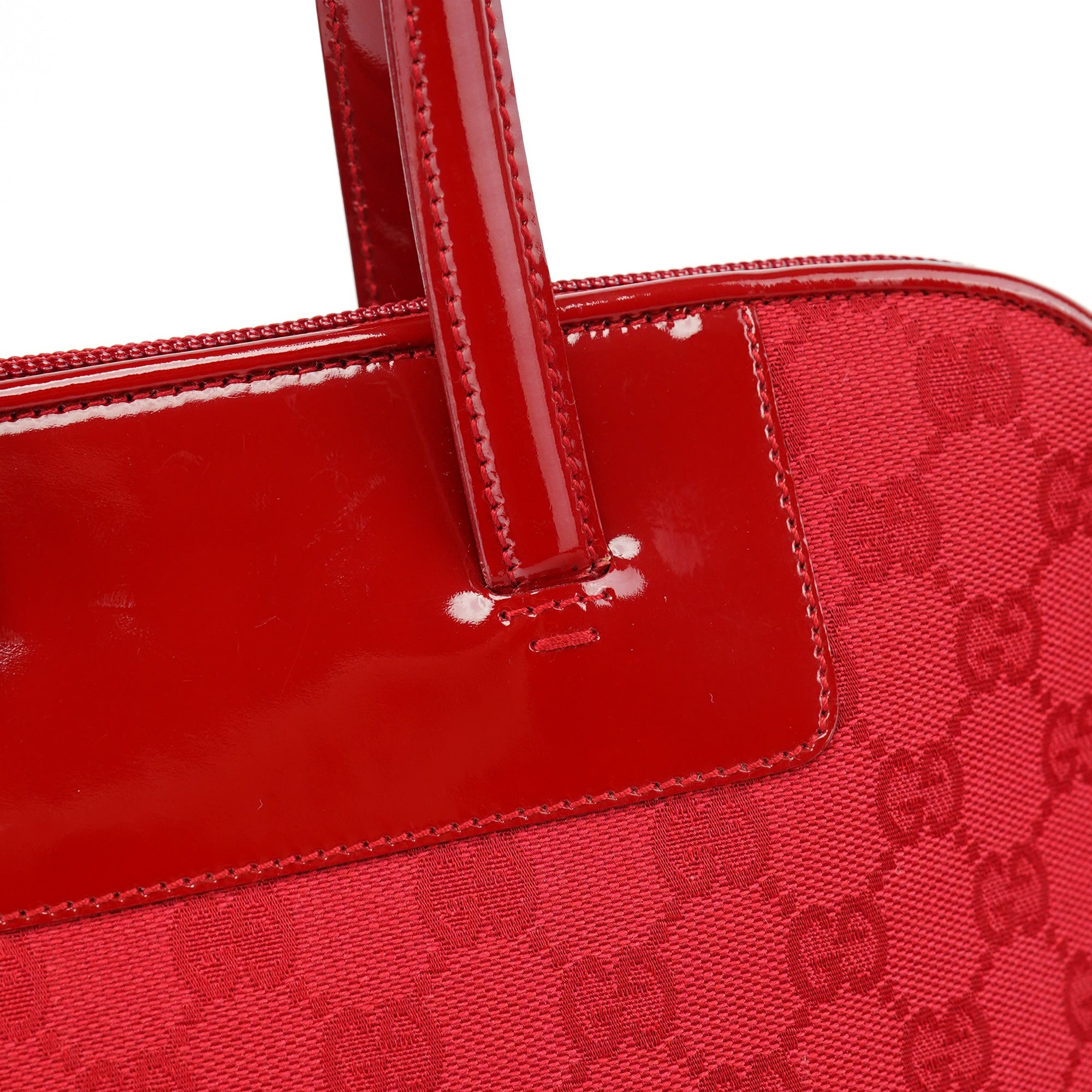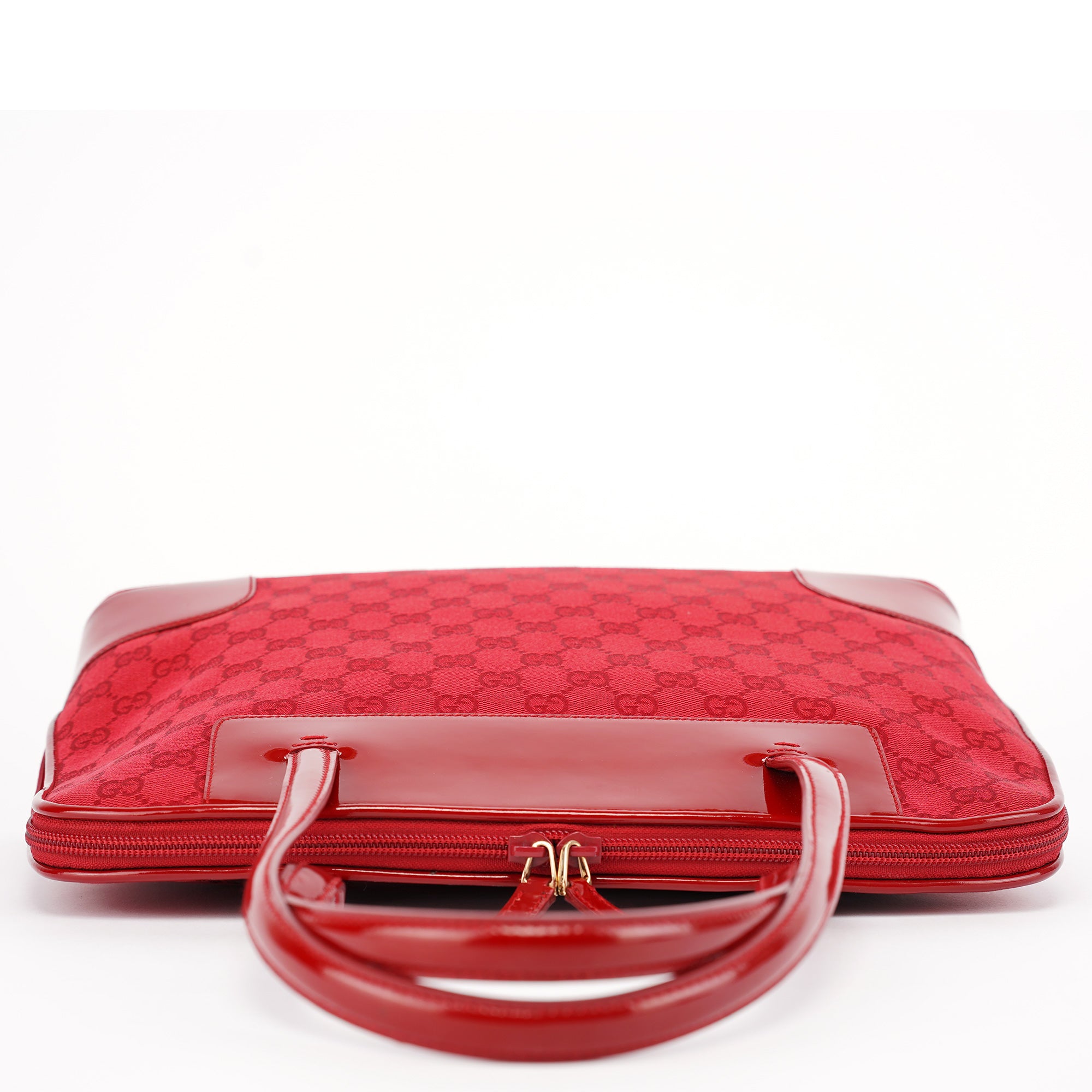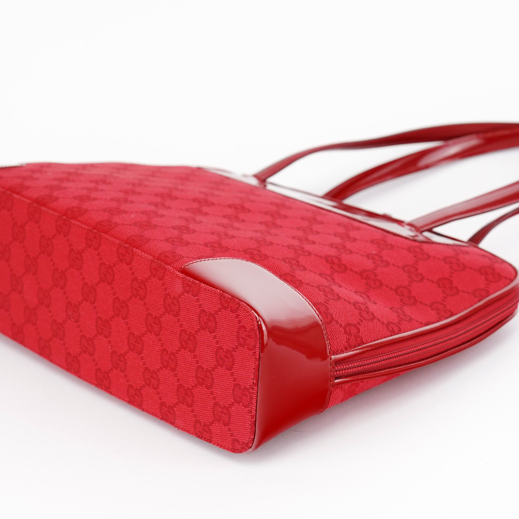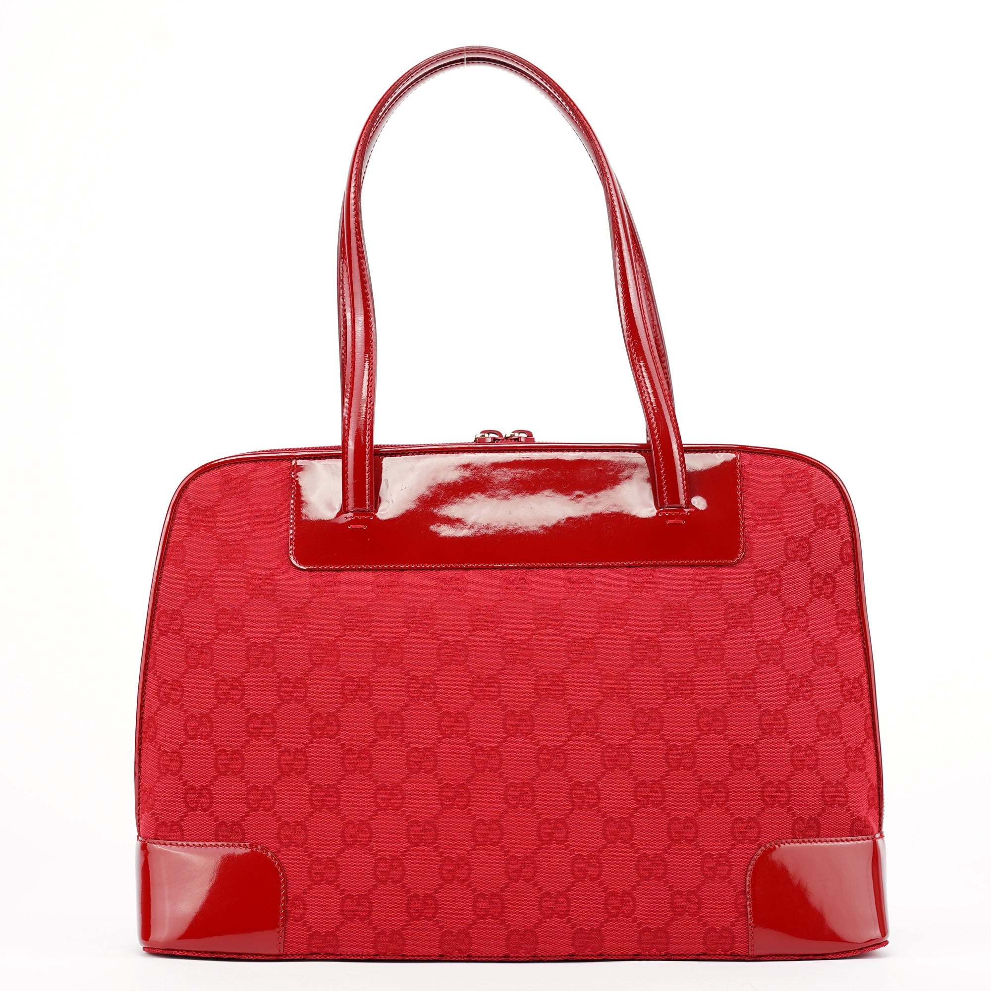 Designed in the late 1990s by Tom Ford, this Gucci tote bag is crafted from red GG canvas with tonal patent leather trim and dual structured handles. The structured silhouette is finished with a top zip closure and a black nylon interior with a slip pocket. A striking archival style perfect for daily use.