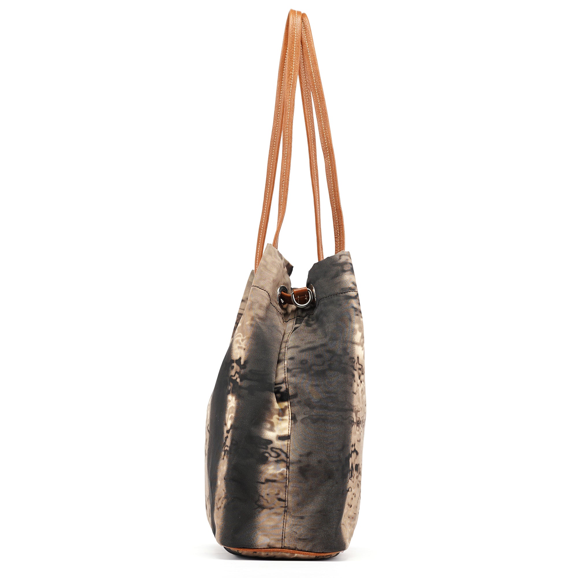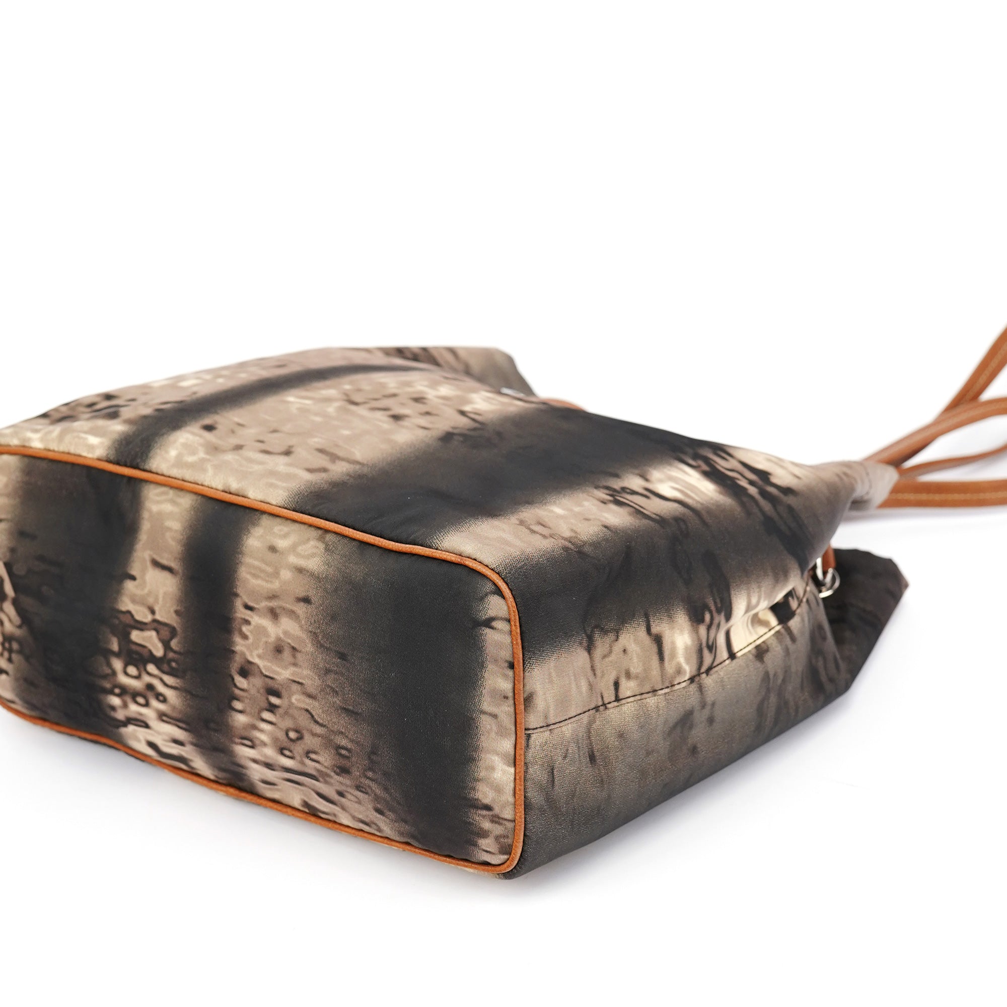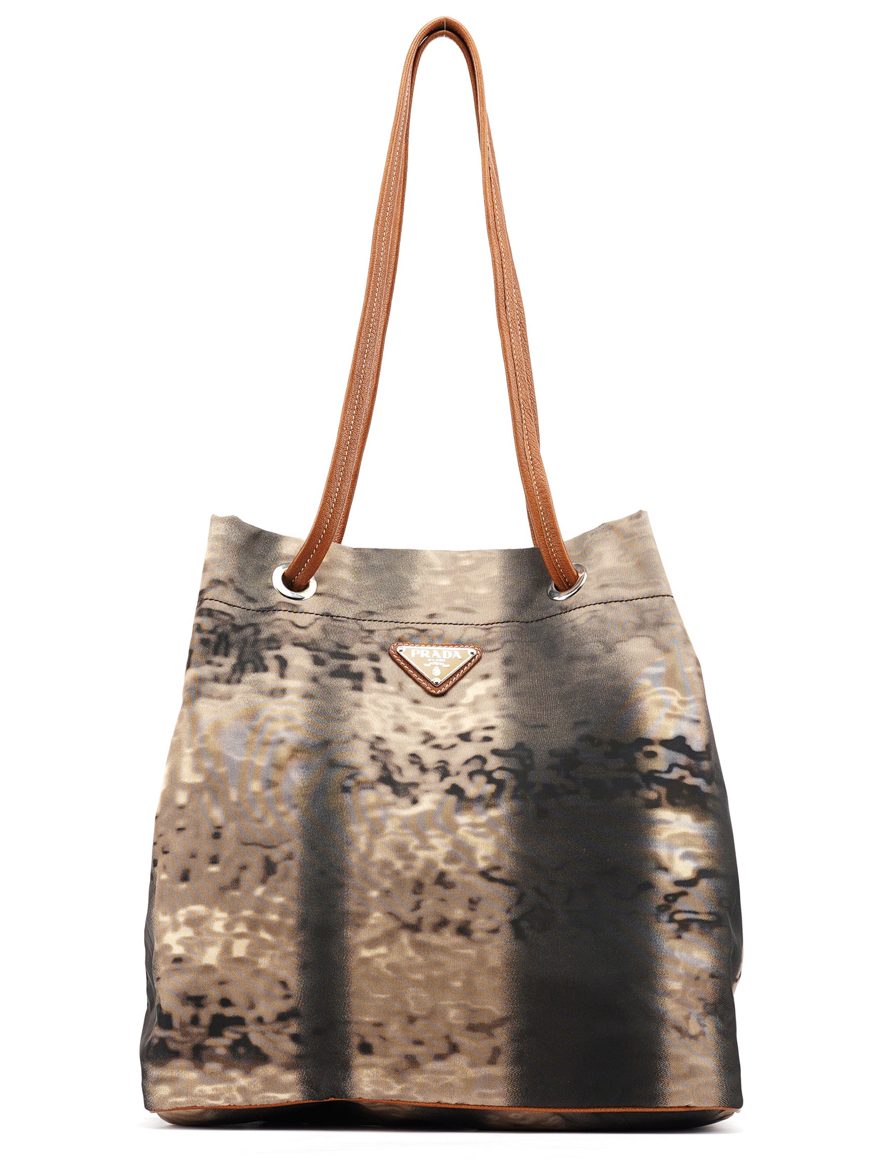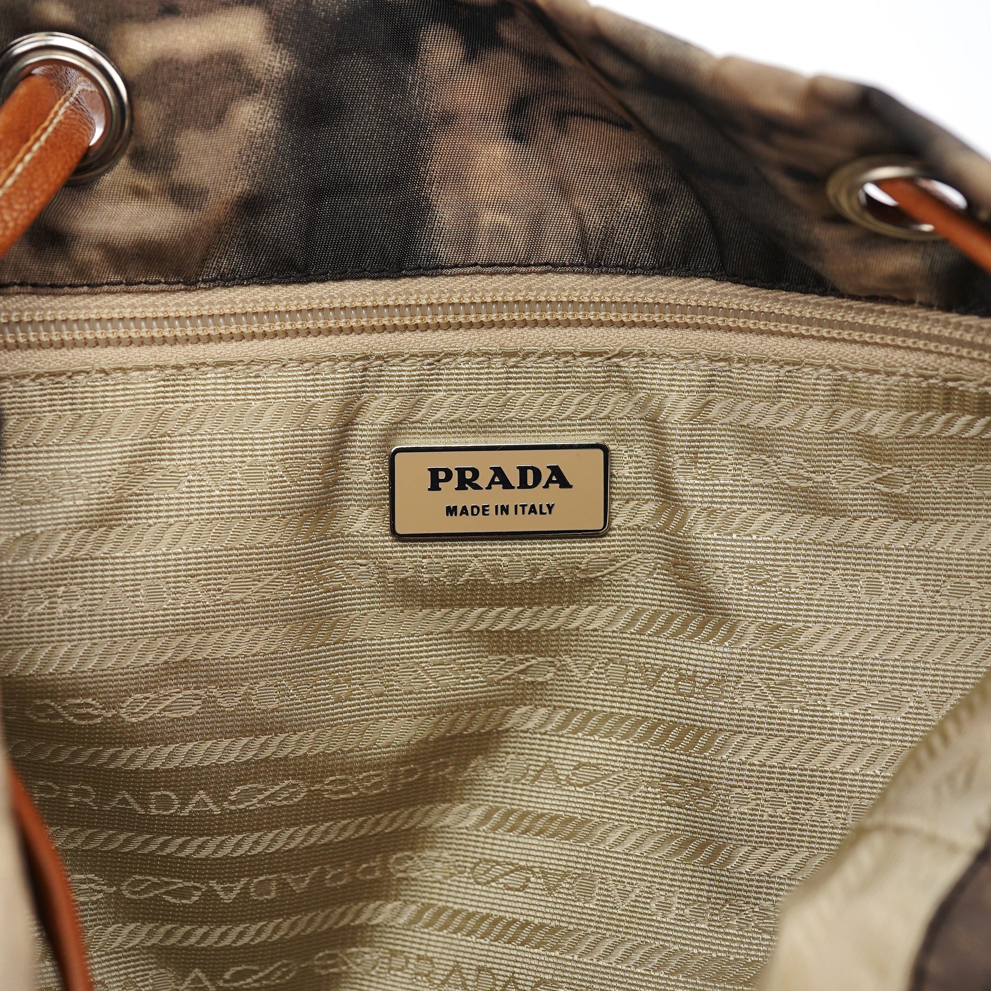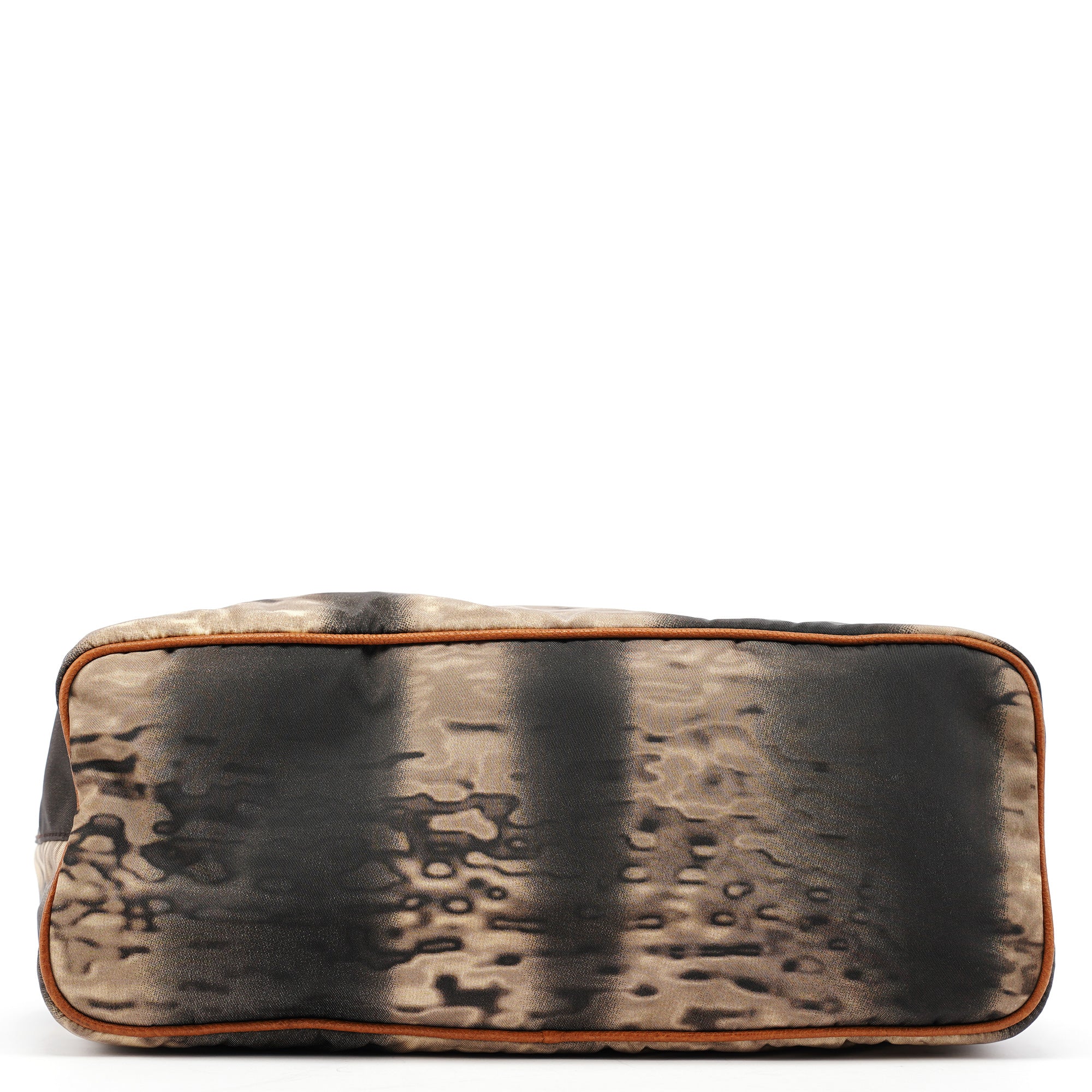 Designed in the early 2000s by Miuccia Prada, this lightweight Prada tote features abstract printed nylon in neutral brown and black tones, finished with tan leather shoulder straps and silver-tone grommets. The signature enamel triangle logo sits prominently on the front, while the interior is lined in monogram jacquard fabric with a zip pocket and Prada’s signature metal logo plaque.