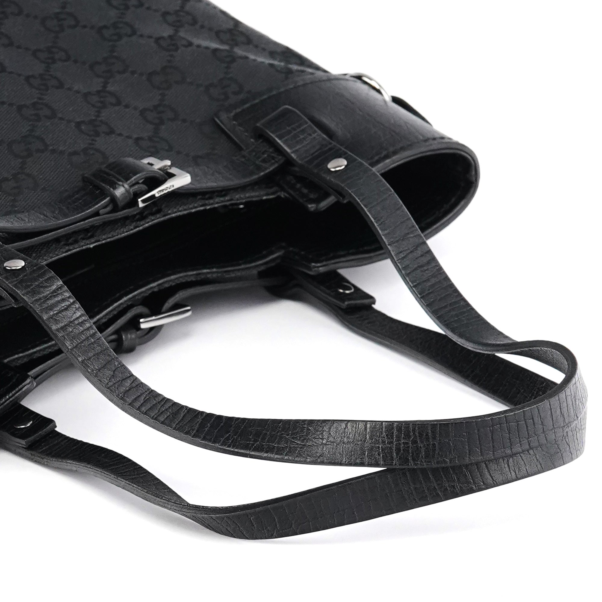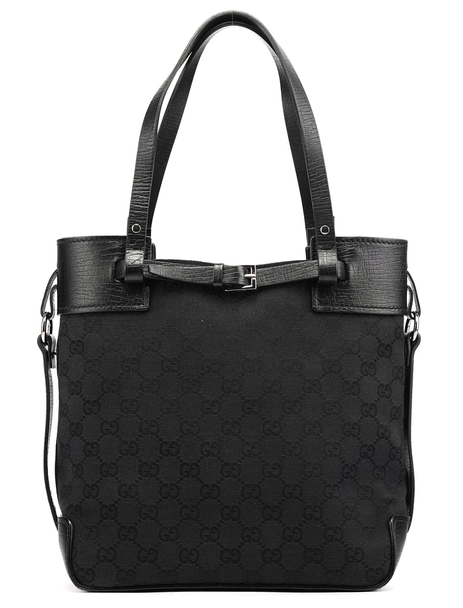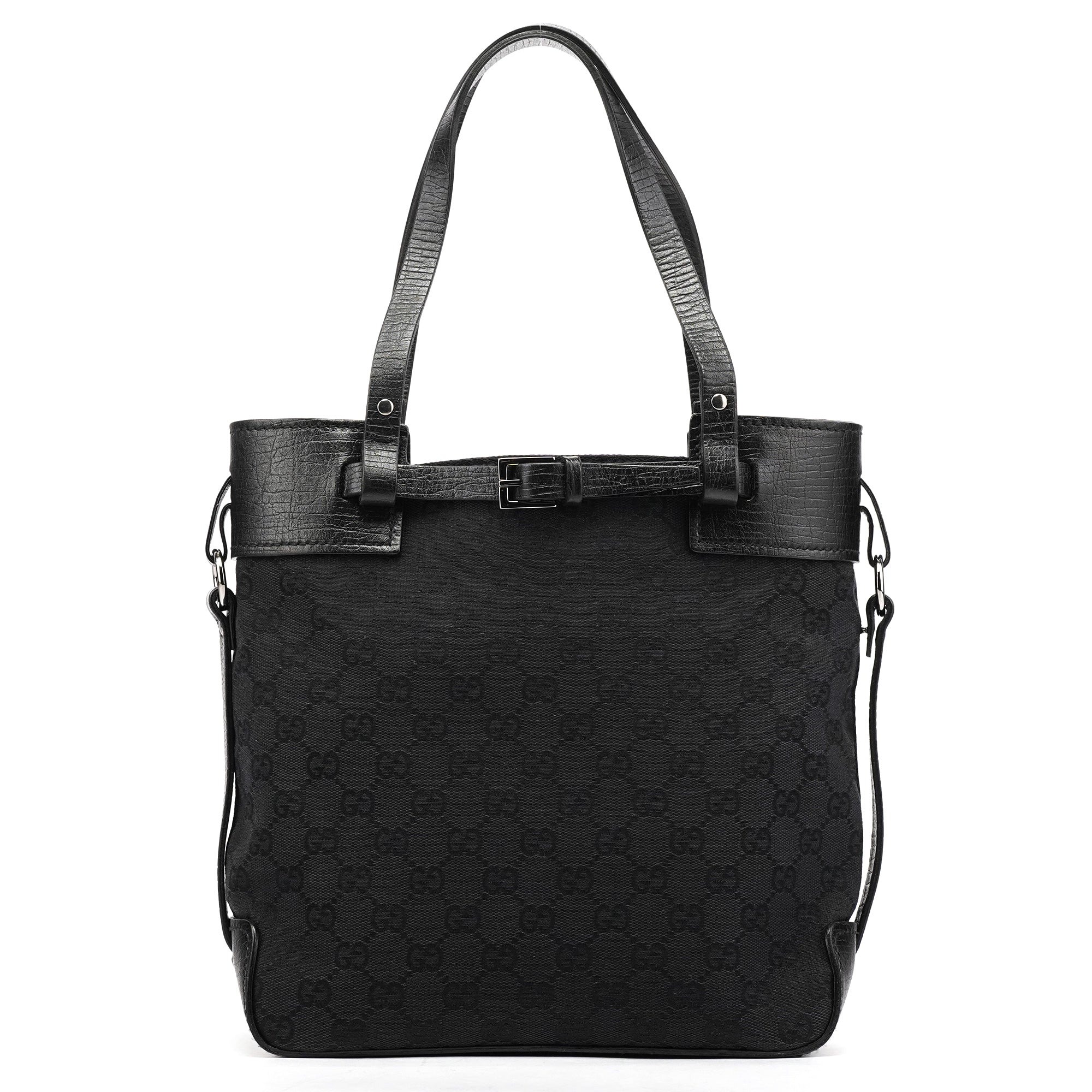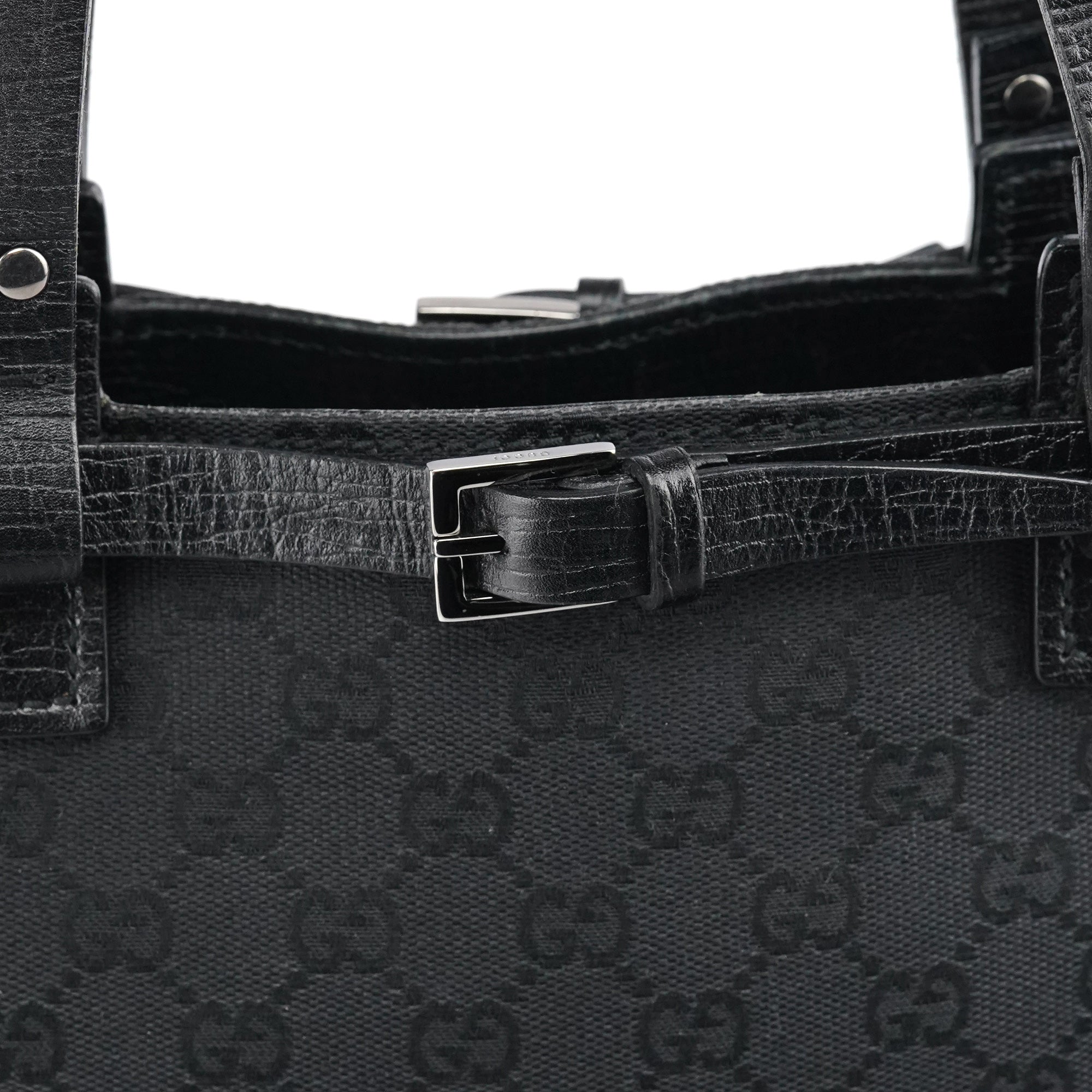 Designed in the early 2000s by Tom Ford, this Gucci GG tote bag is crafted in black monogram canvas with textured black leather trim. The structured silhouette is accented with a slim belt detail, dual top handles, and a detachable shoulder strap. The interior offers practical storage with a zip pocket for daily essentials.
