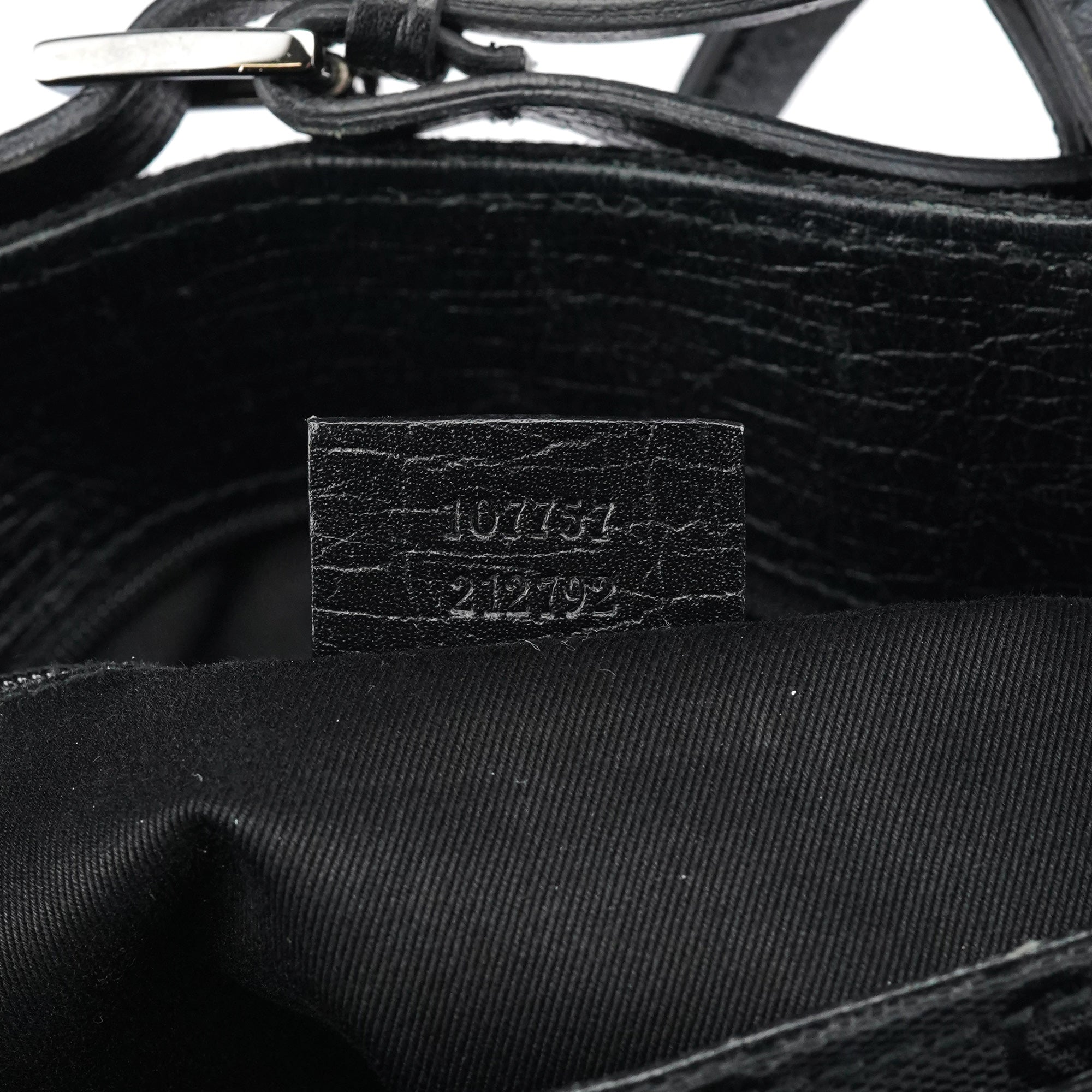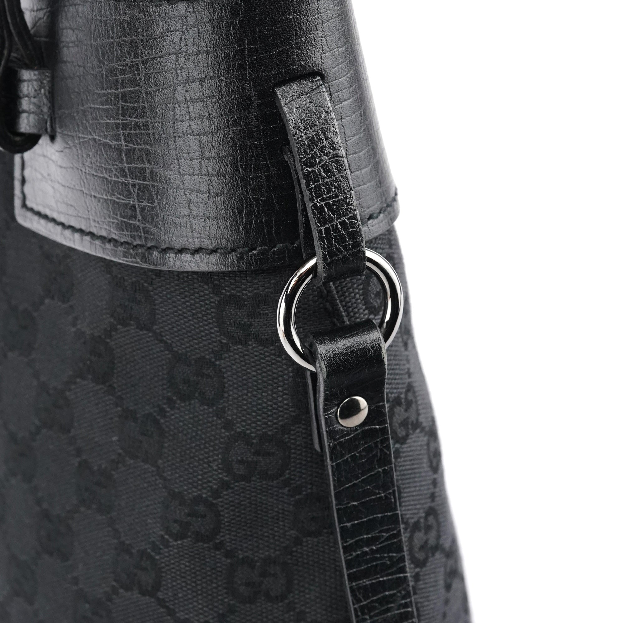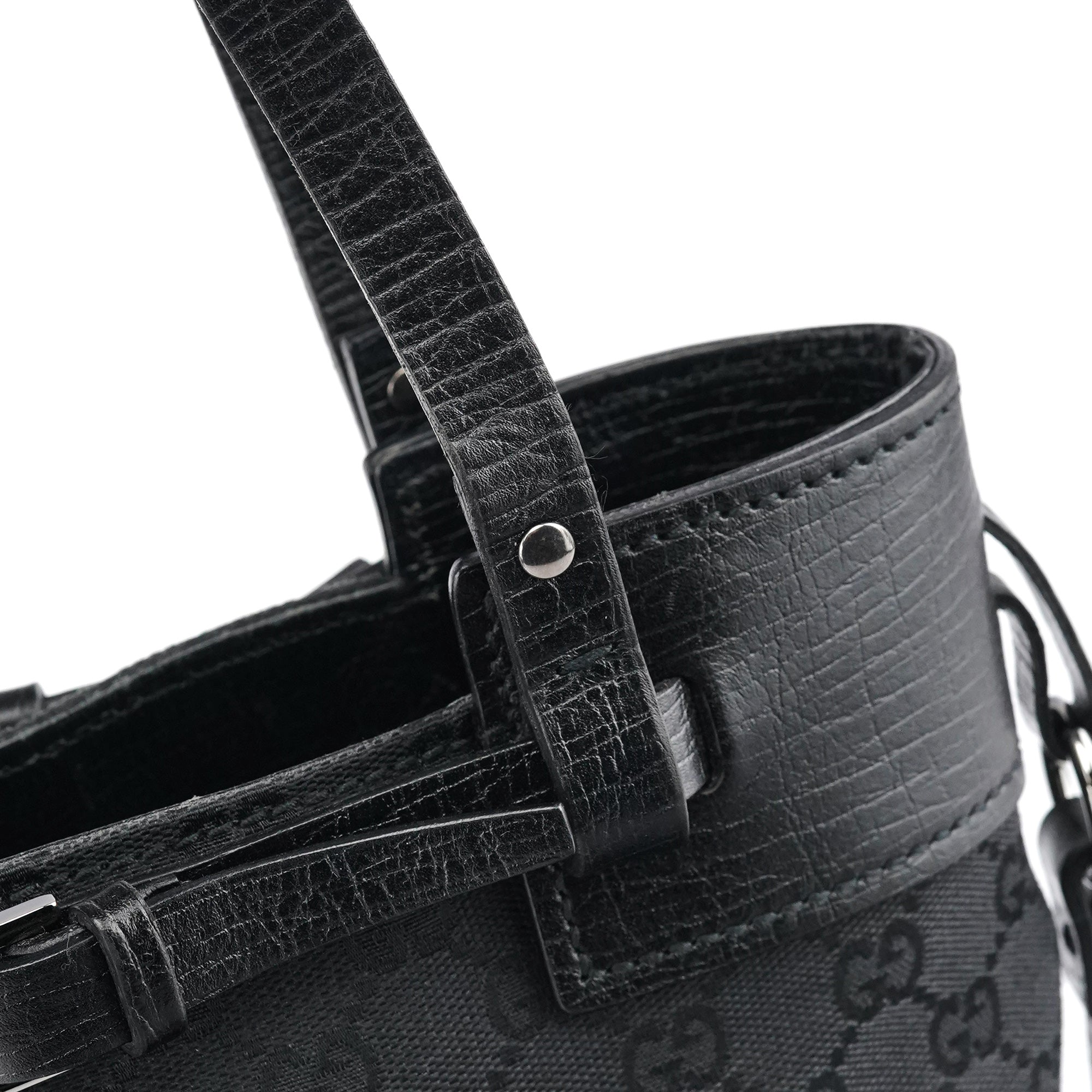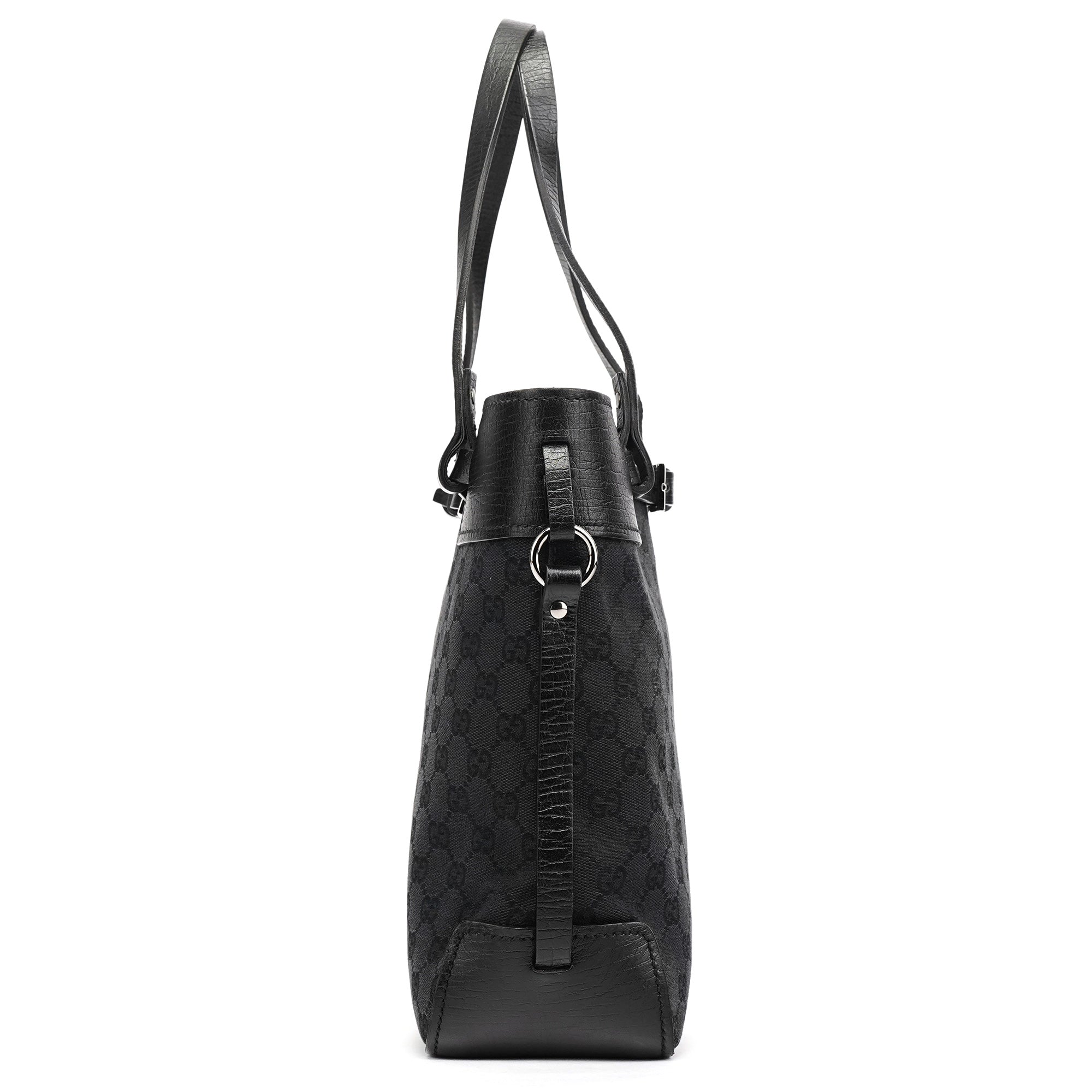 Designed in the early 2000s by Tom Ford, this Gucci GG tote bag is crafted in black monogram canvas with textured black leather trim. The structured silhouette is accented with a slim belt detail, dual top handles, and a detachable shoulder strap. The interior offers practical storage with a zip pocket for daily essentials.