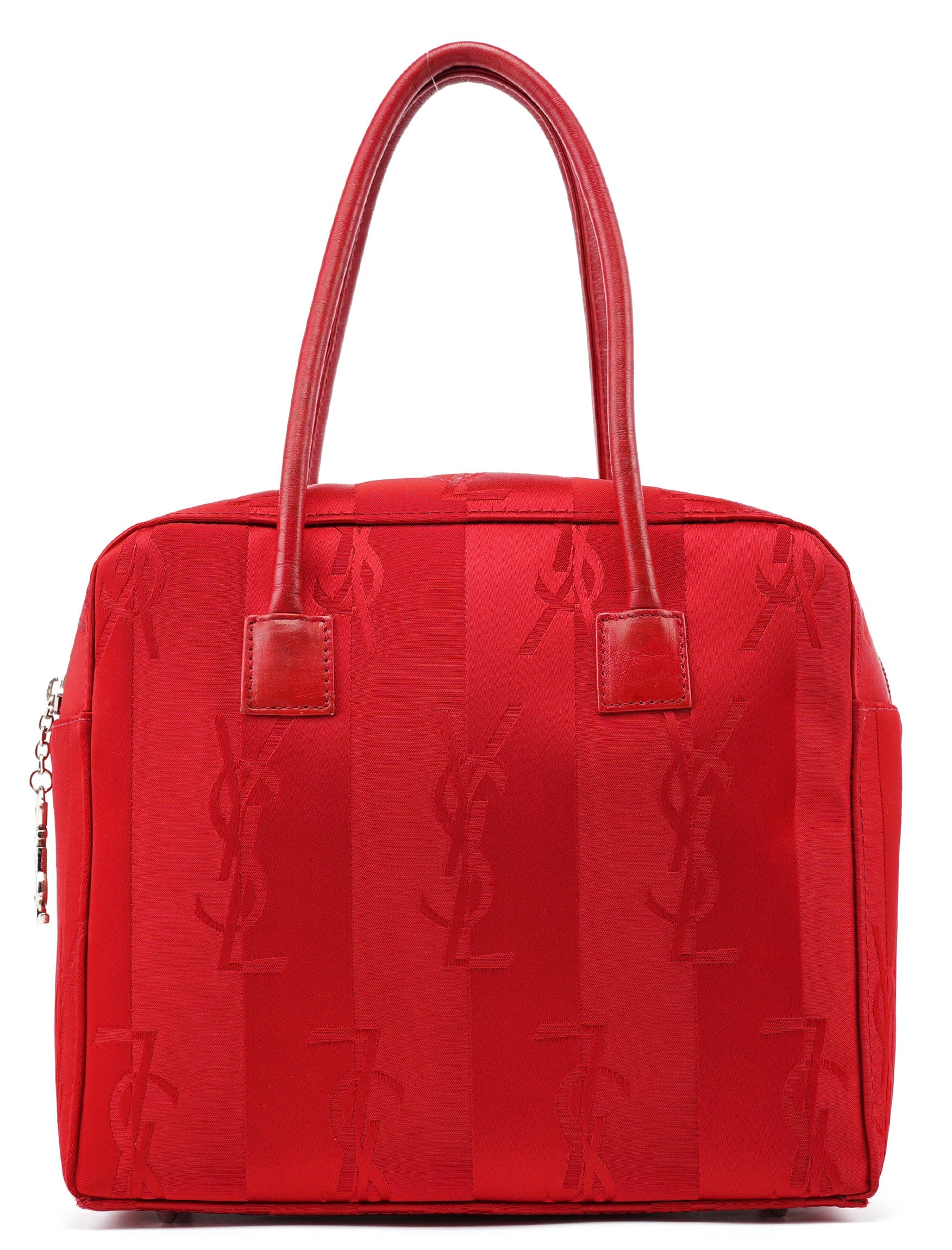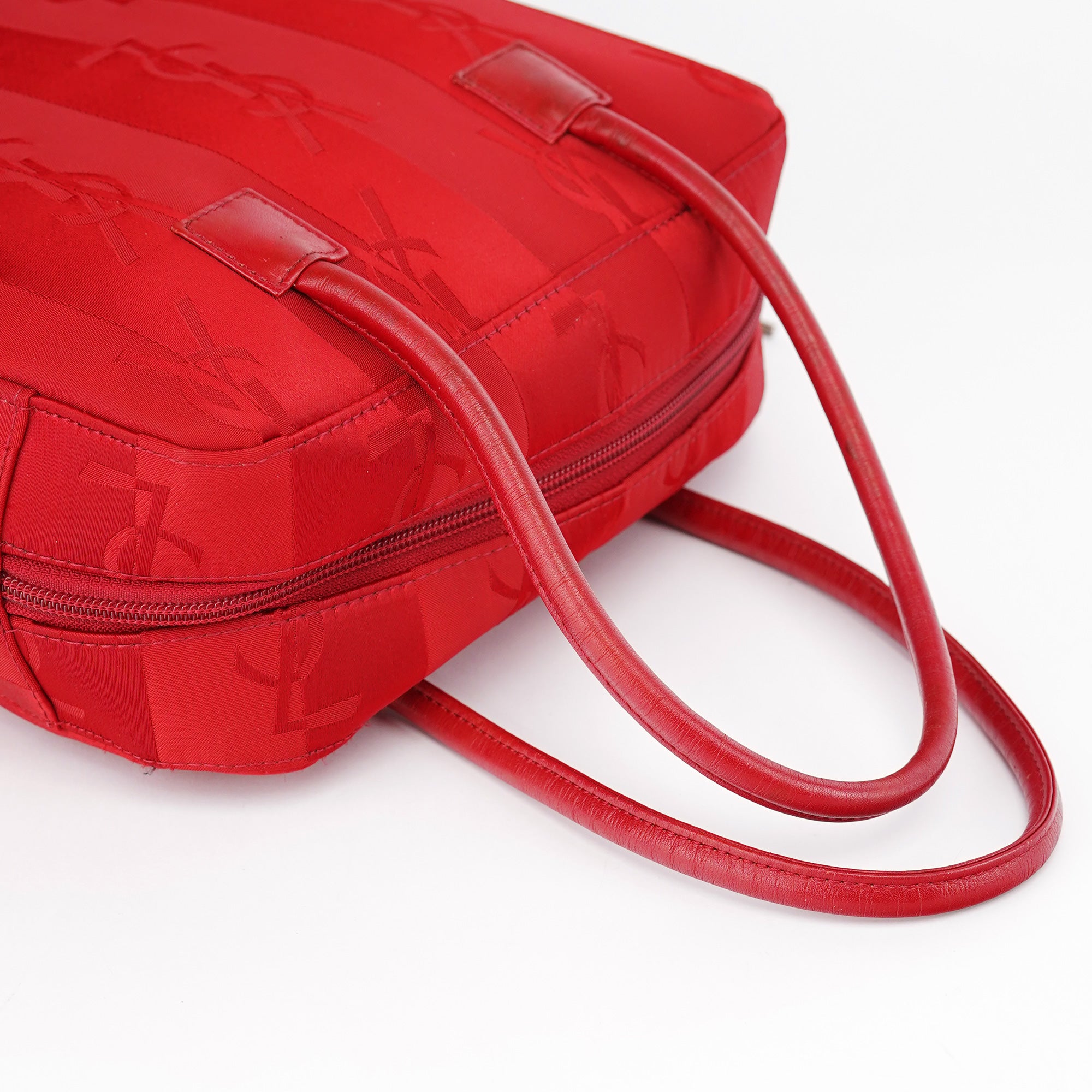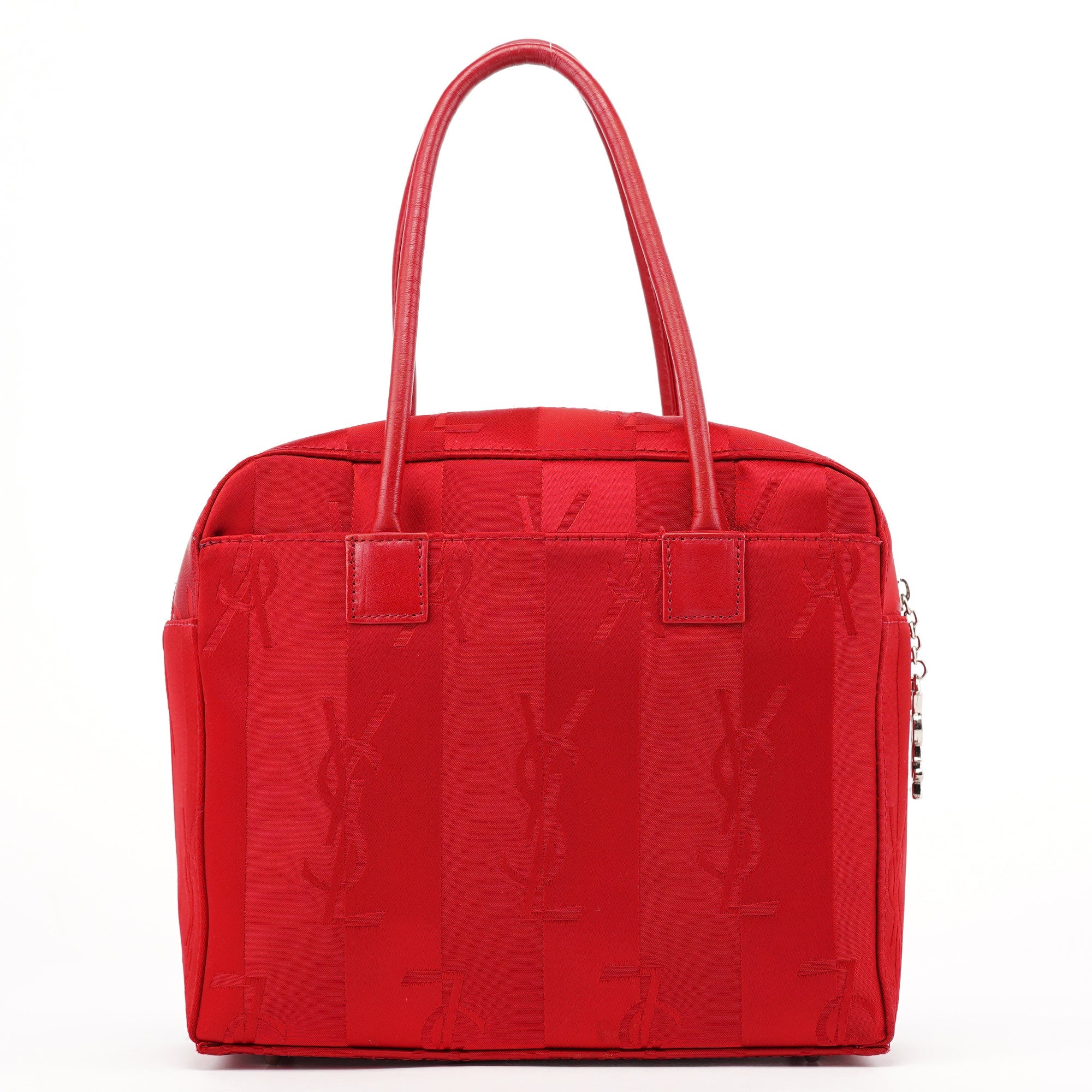 Designed in the late 1990s, this Yves Saint Laurent tote is crafted from vibrant red satin jacquard with tonal vertical stripes and all-over YSL monogram embroidery. The structured rectangular silhouette is framed by matching top handles and features a top zip closure. The interior is lined in black satin logo fabric with a single zip pocket.
