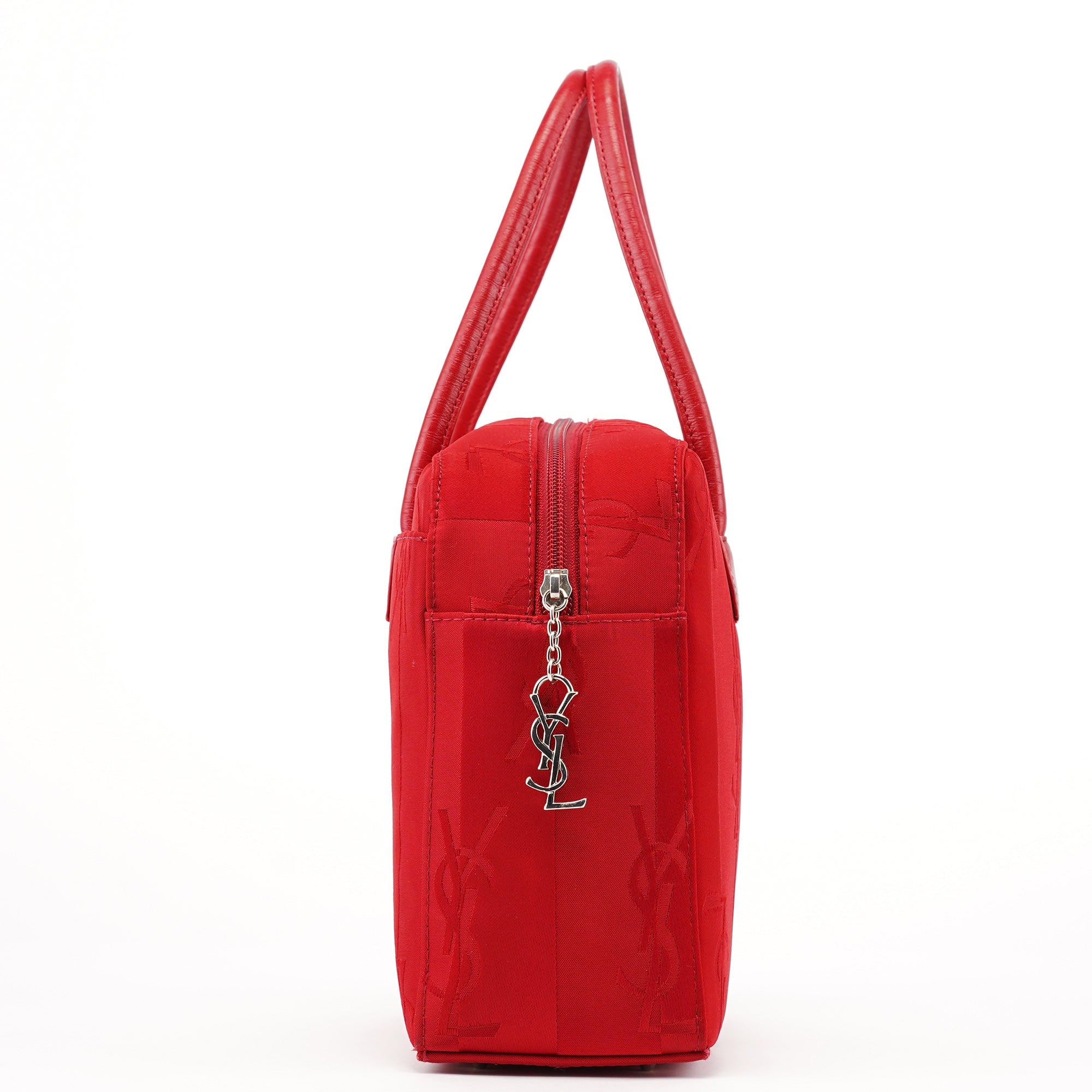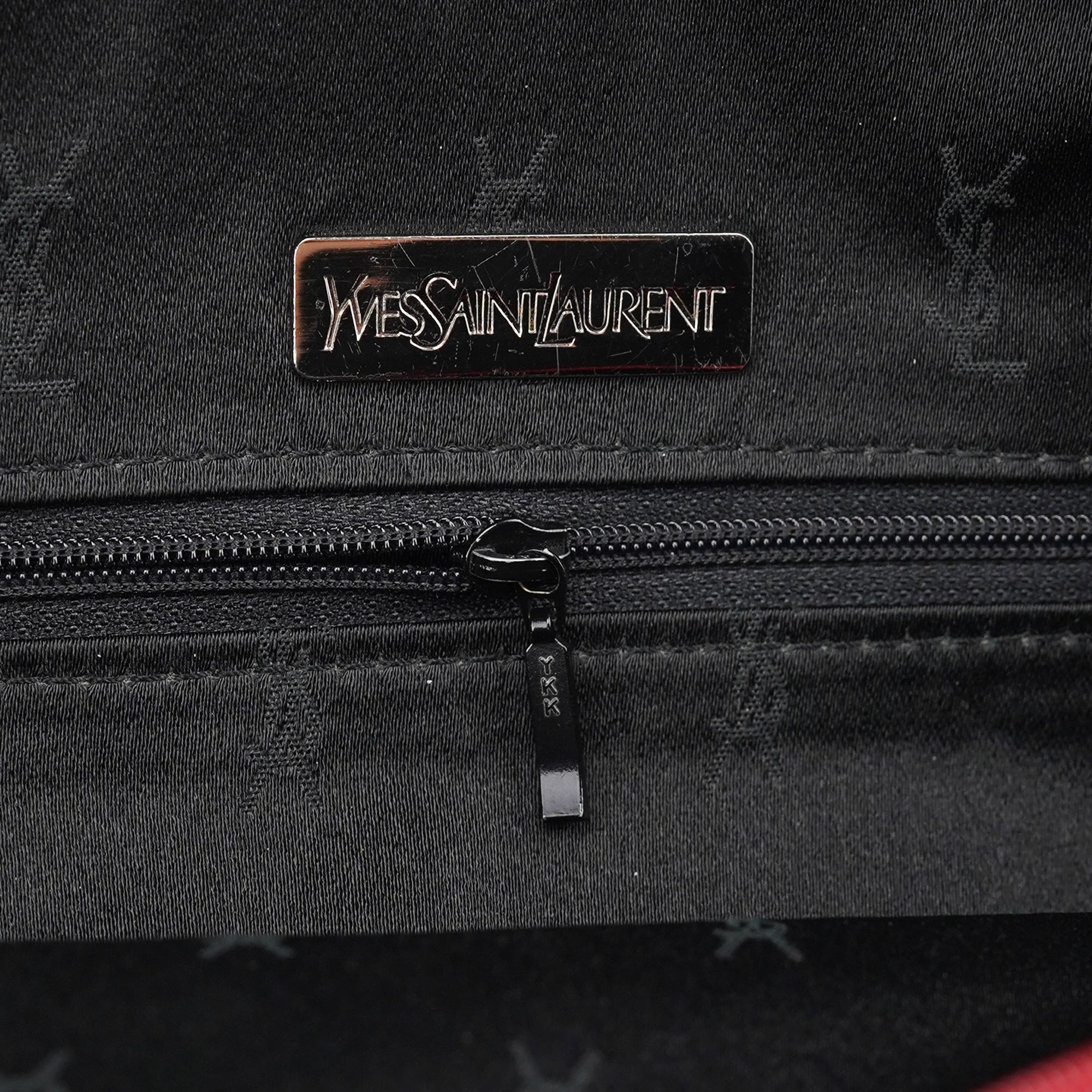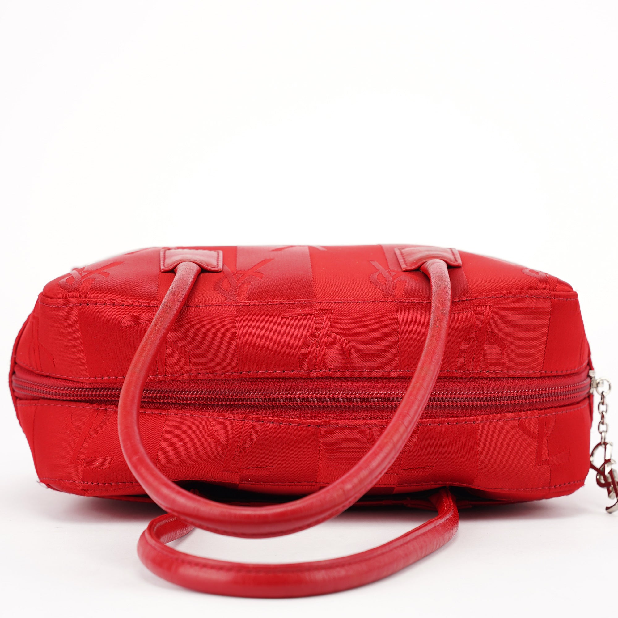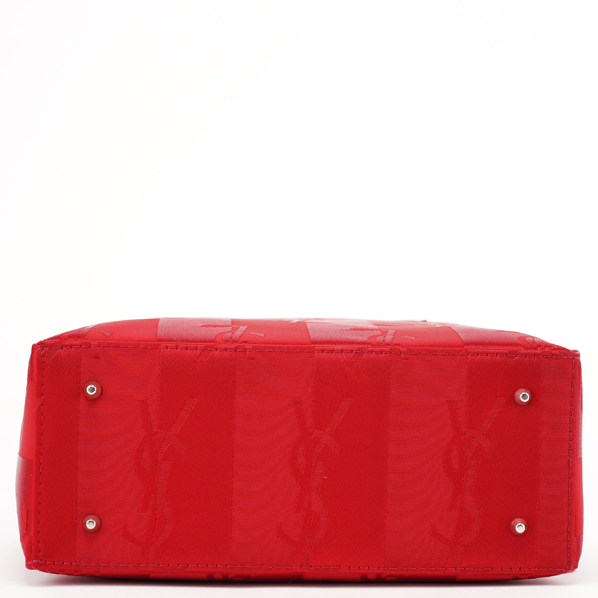 Designed in the late 1990s, this Yves Saint Laurent tote is crafted from vibrant red satin jacquard with tonal vertical stripes and all-over YSL monogram embroidery. The structured rectangular silhouette is framed by matching top handles and features a top zip closure. The interior is lined in black satin logo fabric with a single zip pocket.