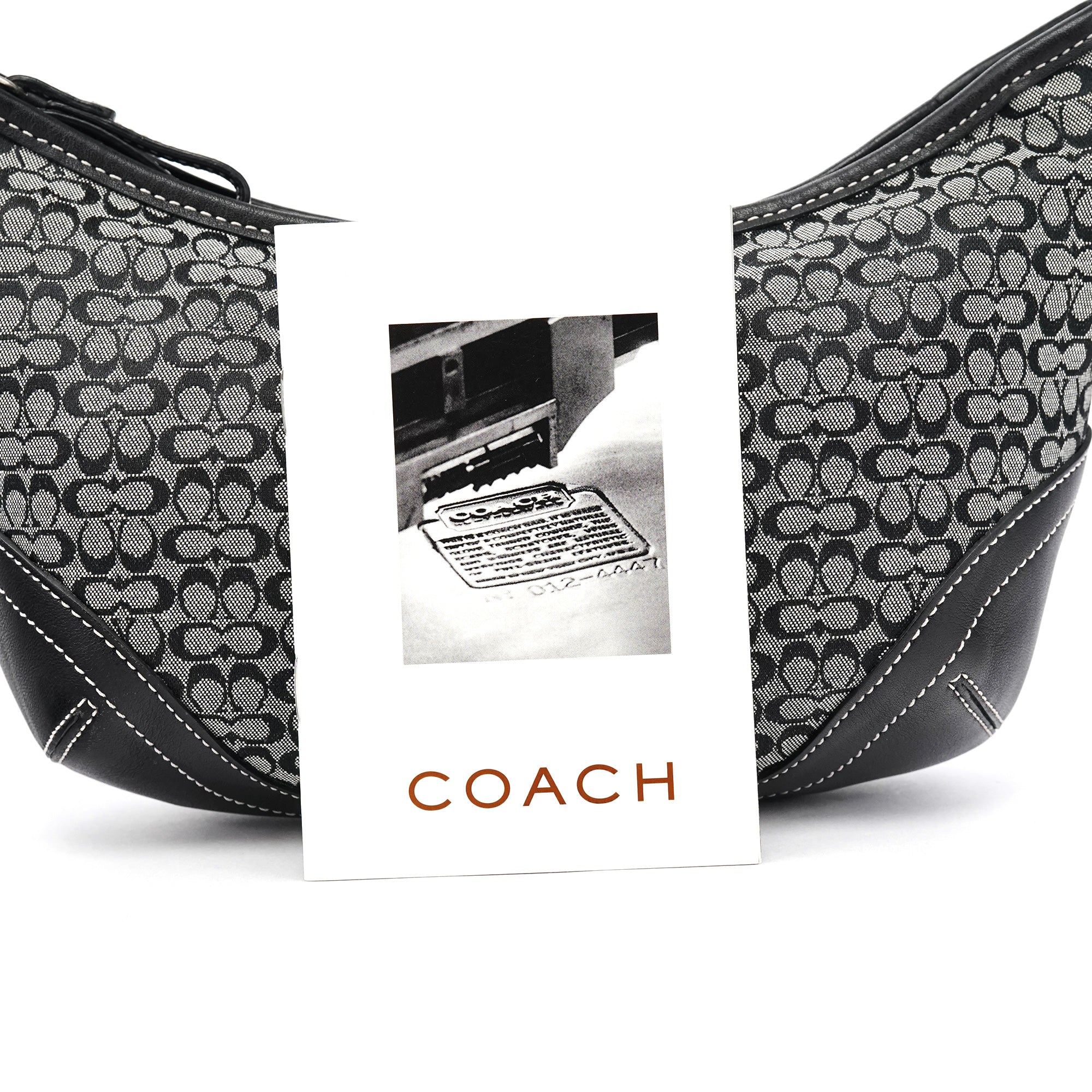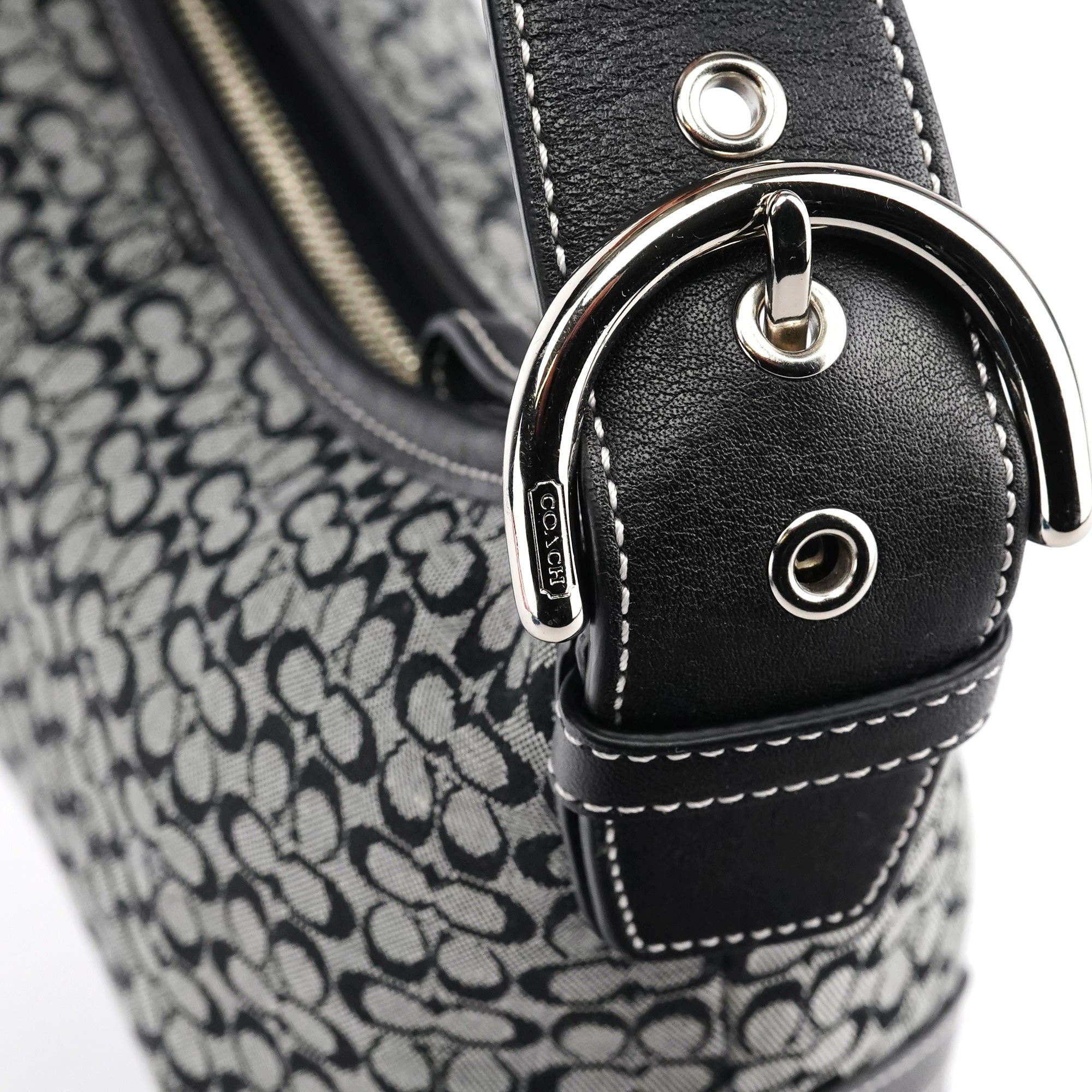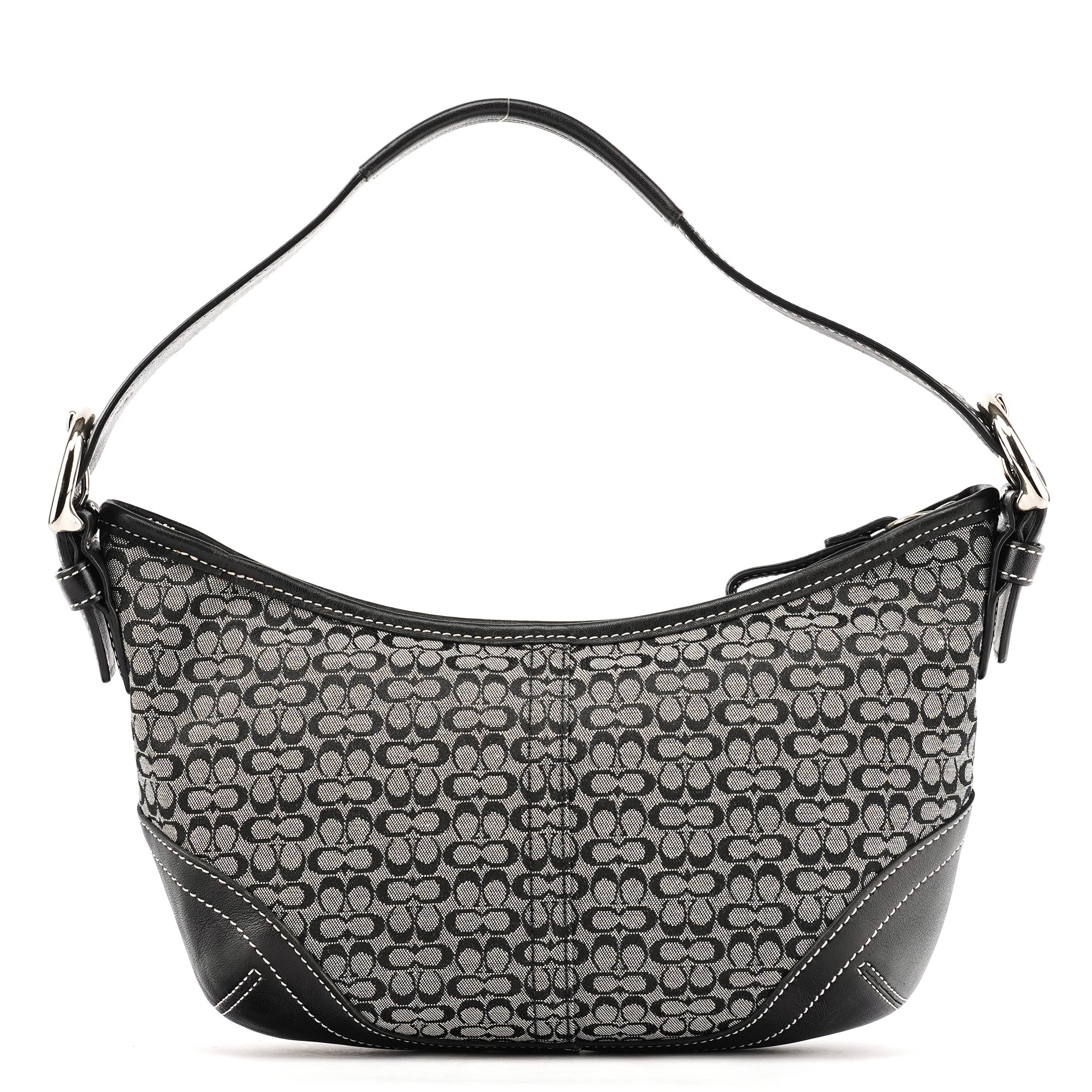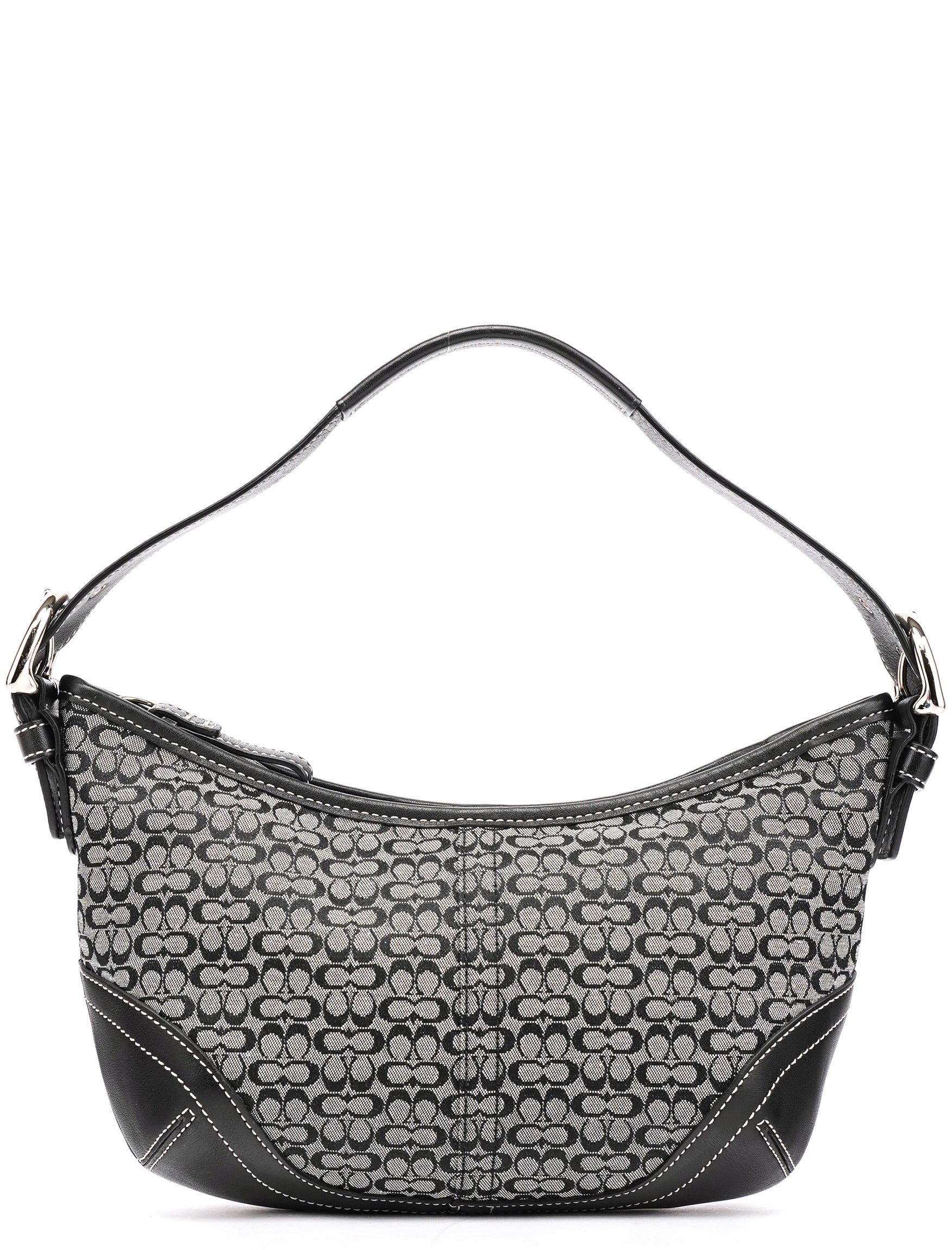 Designed in the early 2000s, this Coach Signature C shoulder bag is crafted in grey monogram canvas with smooth black leather trim. A compact silhouette with a zip-top closure, it pairs the brand’s classic aesthetic with everyday versatility.