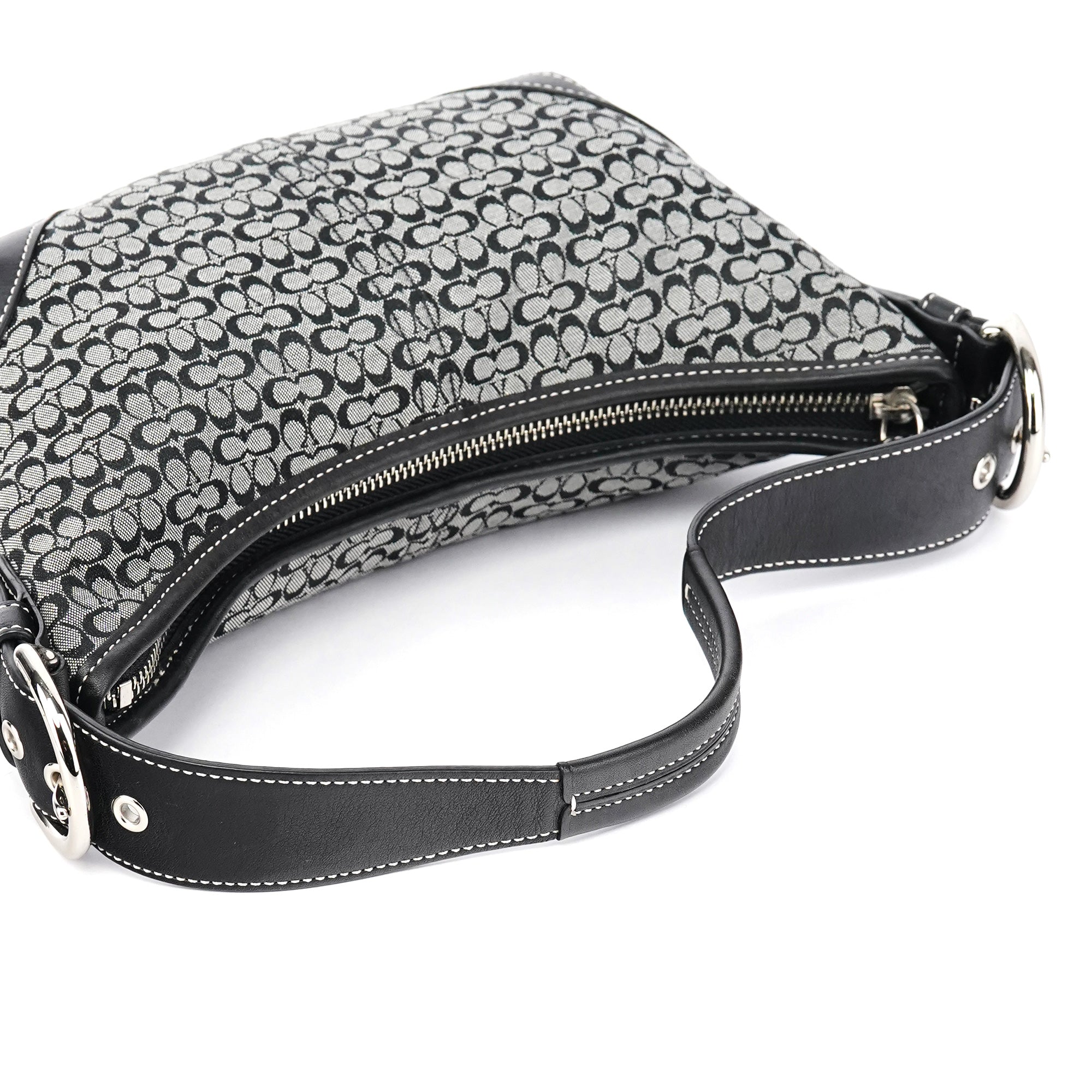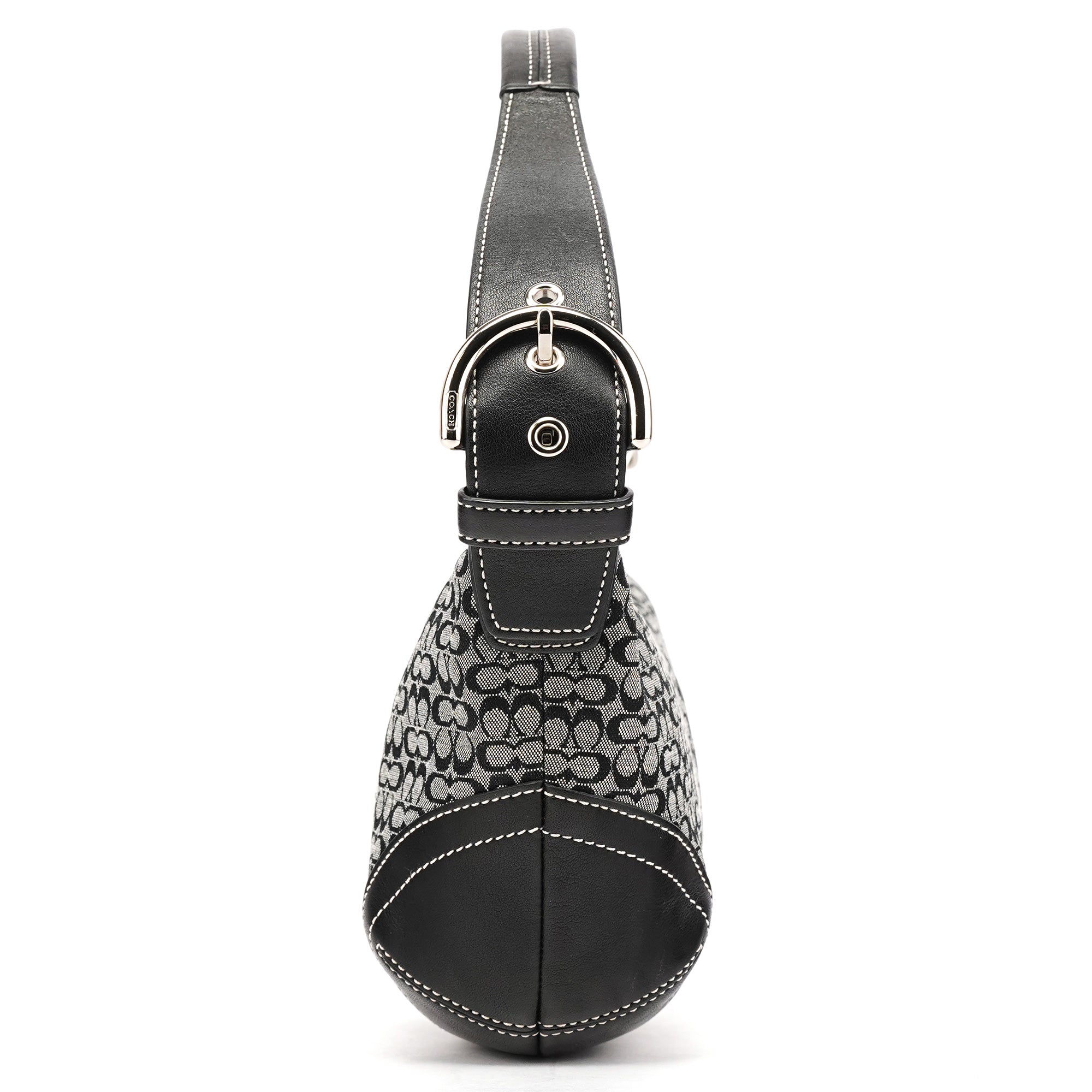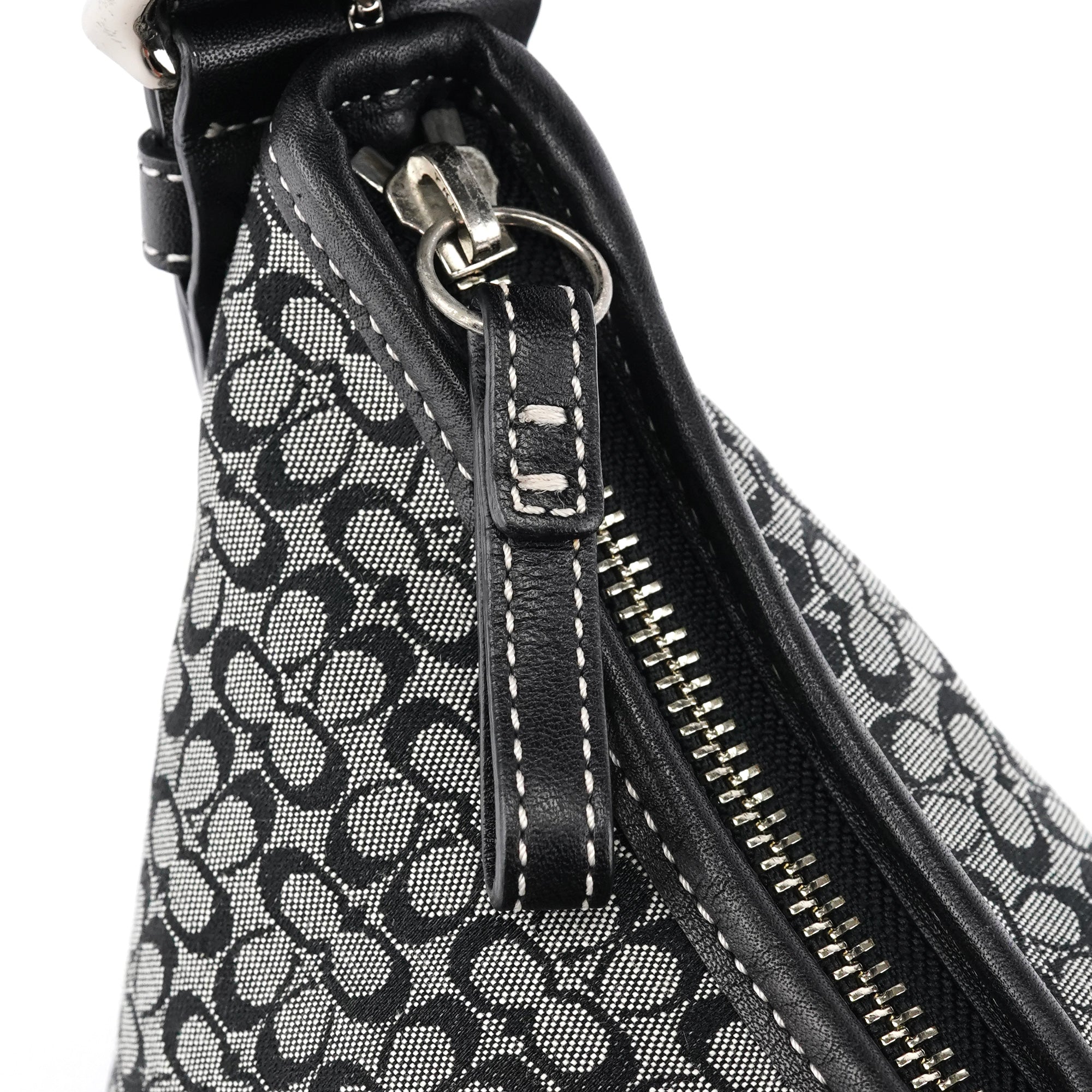 Designed in the early 2000s, this Coach Signature C shoulder bag is crafted in grey monogram canvas with smooth black leather trim. A compact silhouette with a zip-top closure, it pairs the brand’s classic aesthetic with everyday versatility.