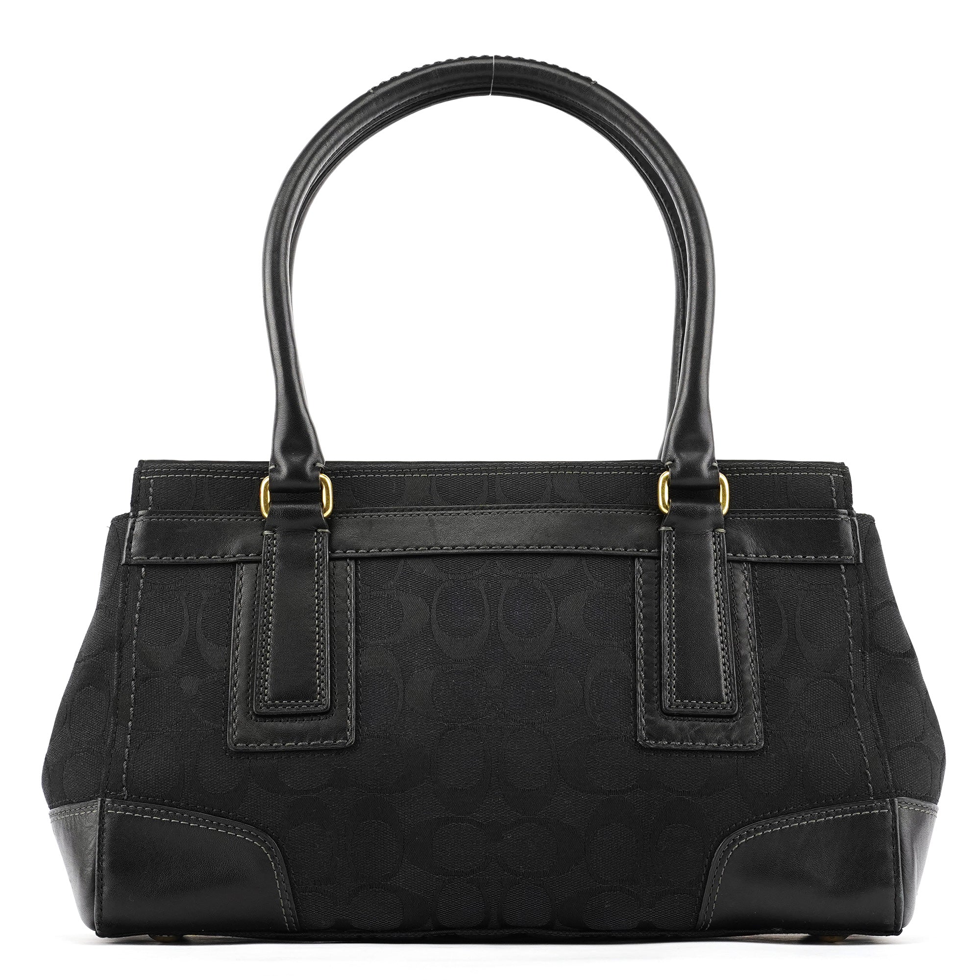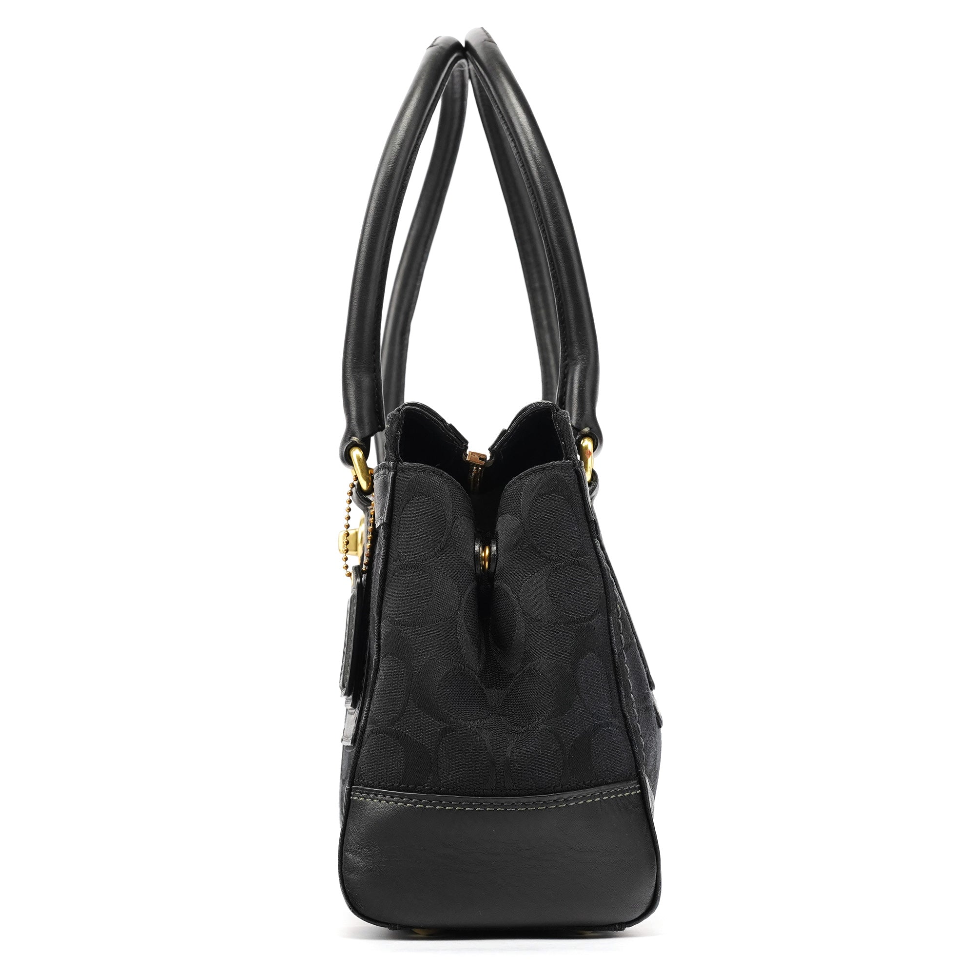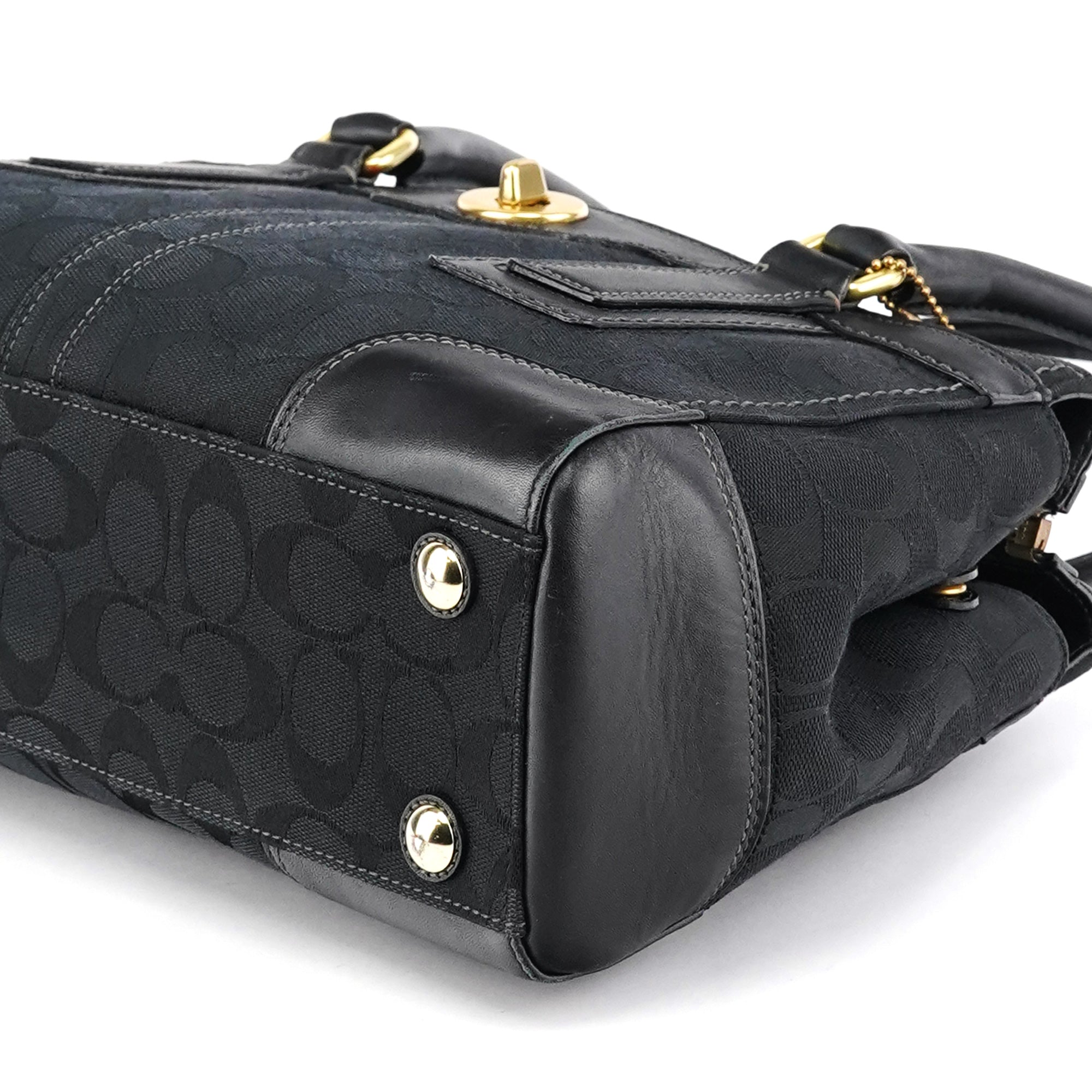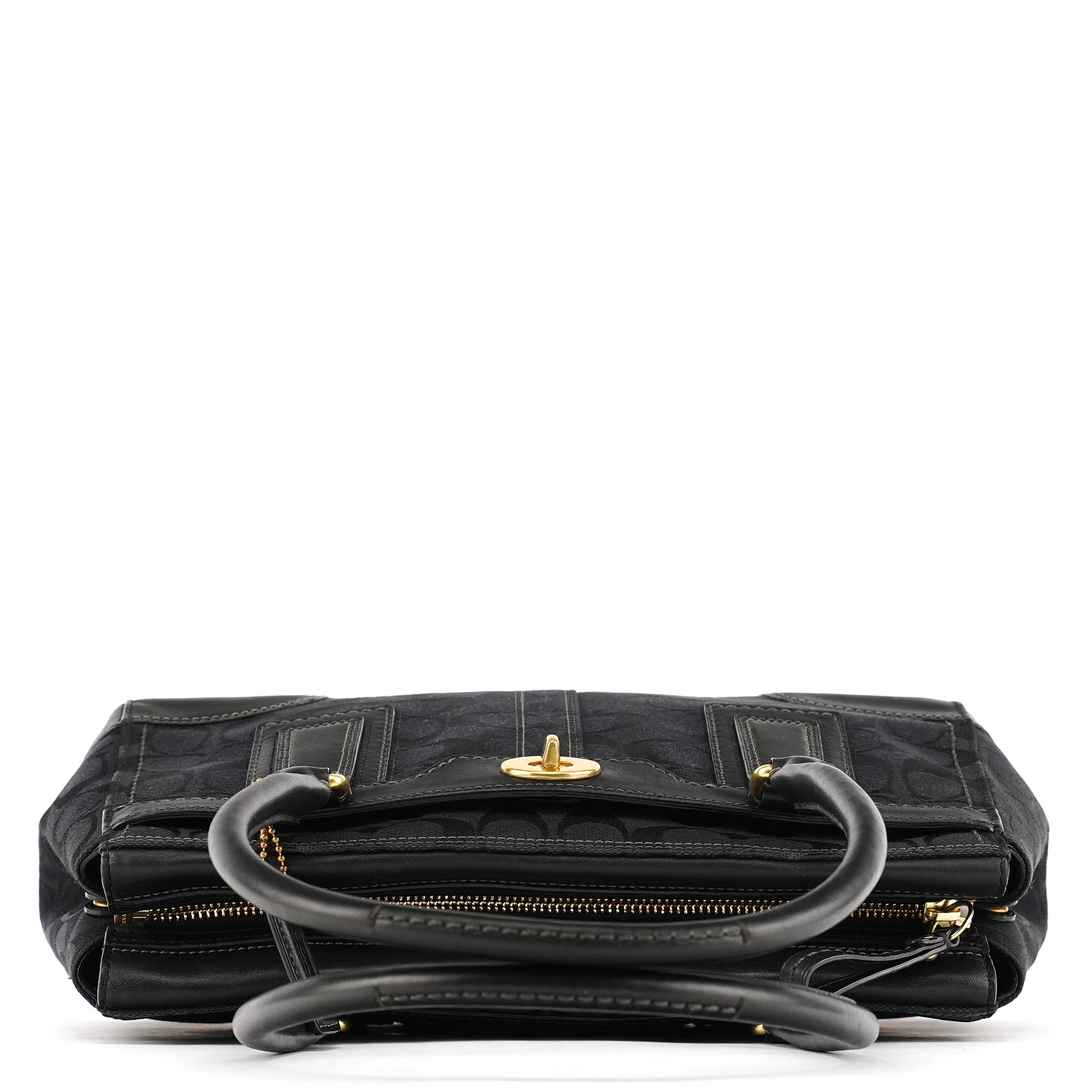 Designed in the mid 2000s, this Coach turnlock tote is crafted from black signature jacquard canvas with black leather trim, finished with gold-tone hardware, rolled shoulder straps, an exterior turnlock pocket, and a top zip closure.