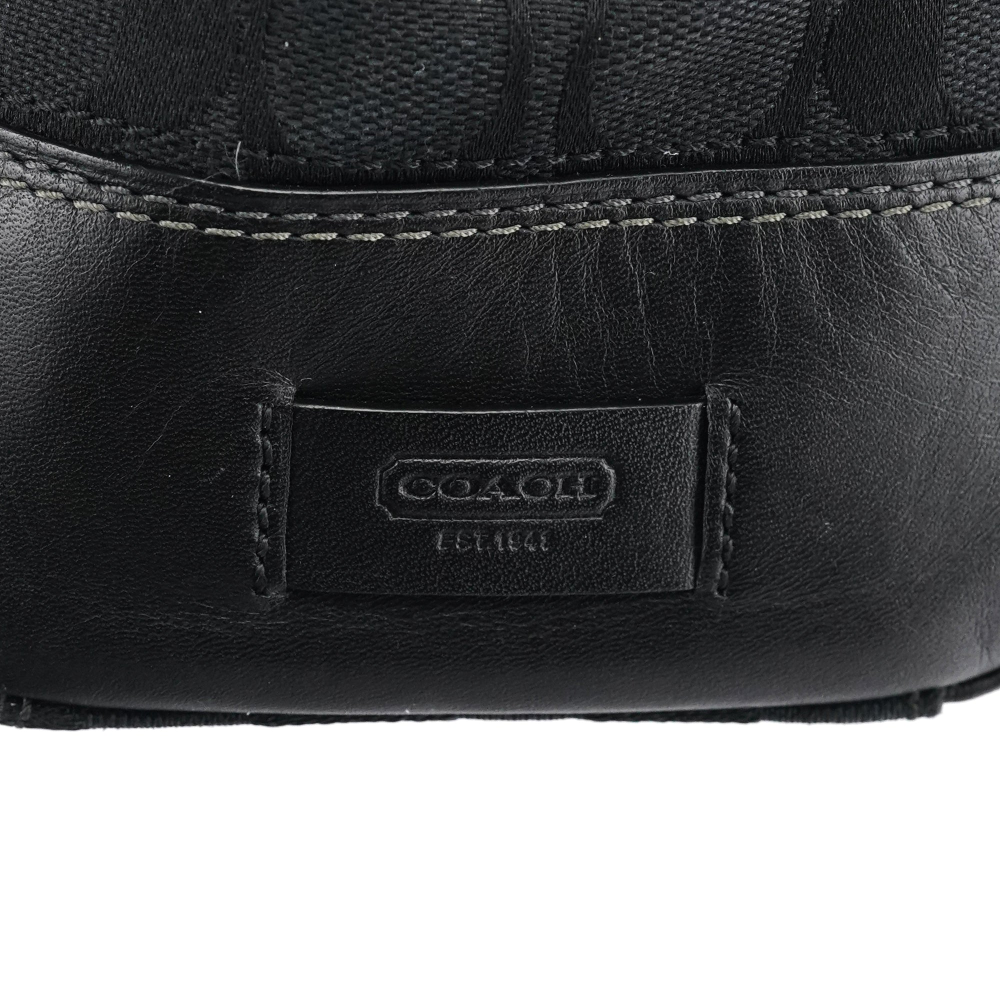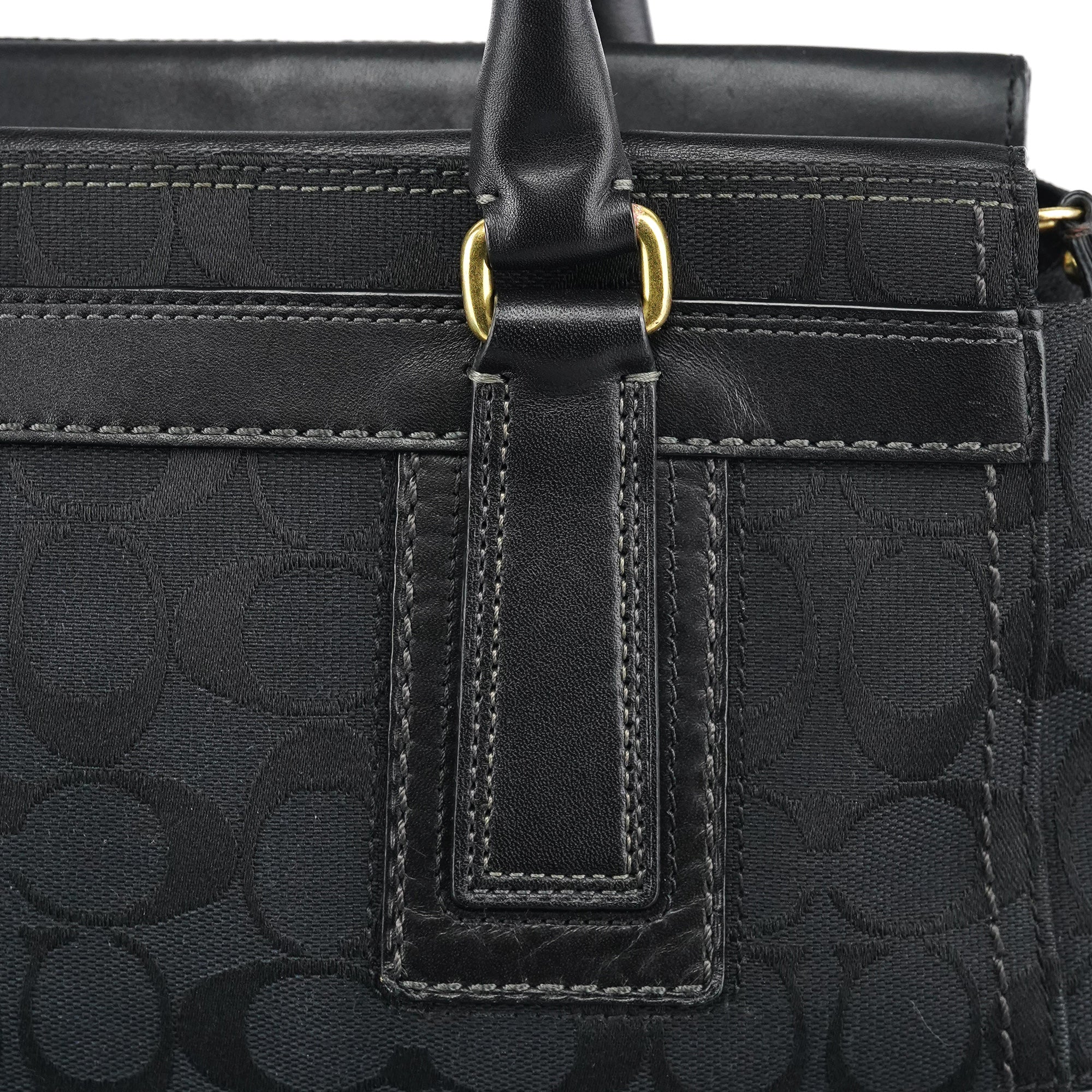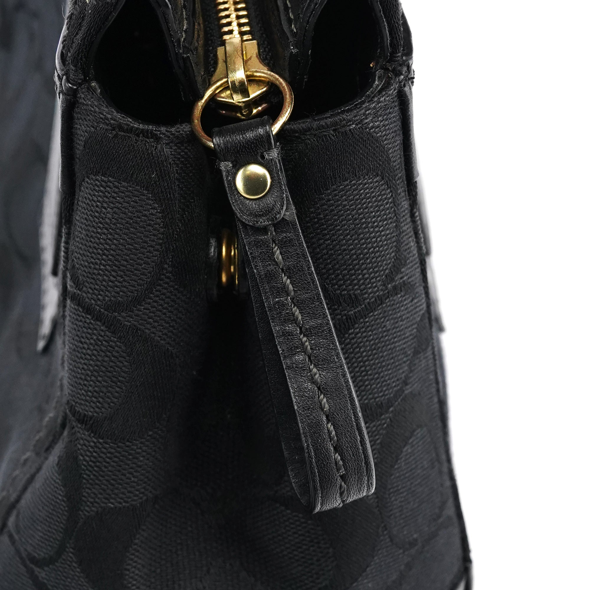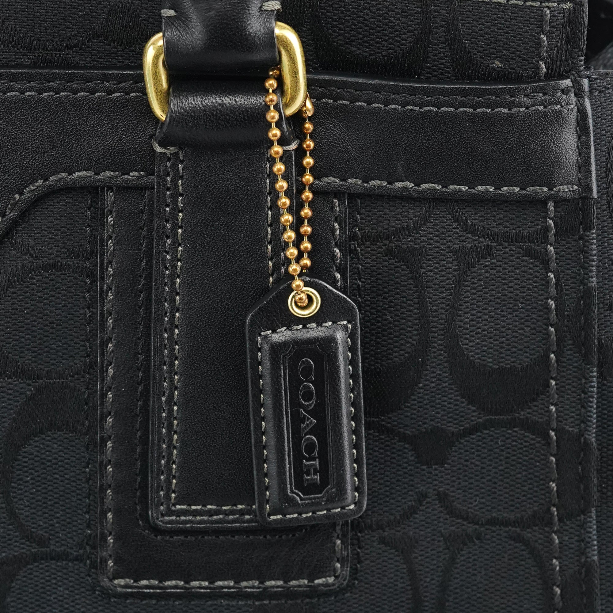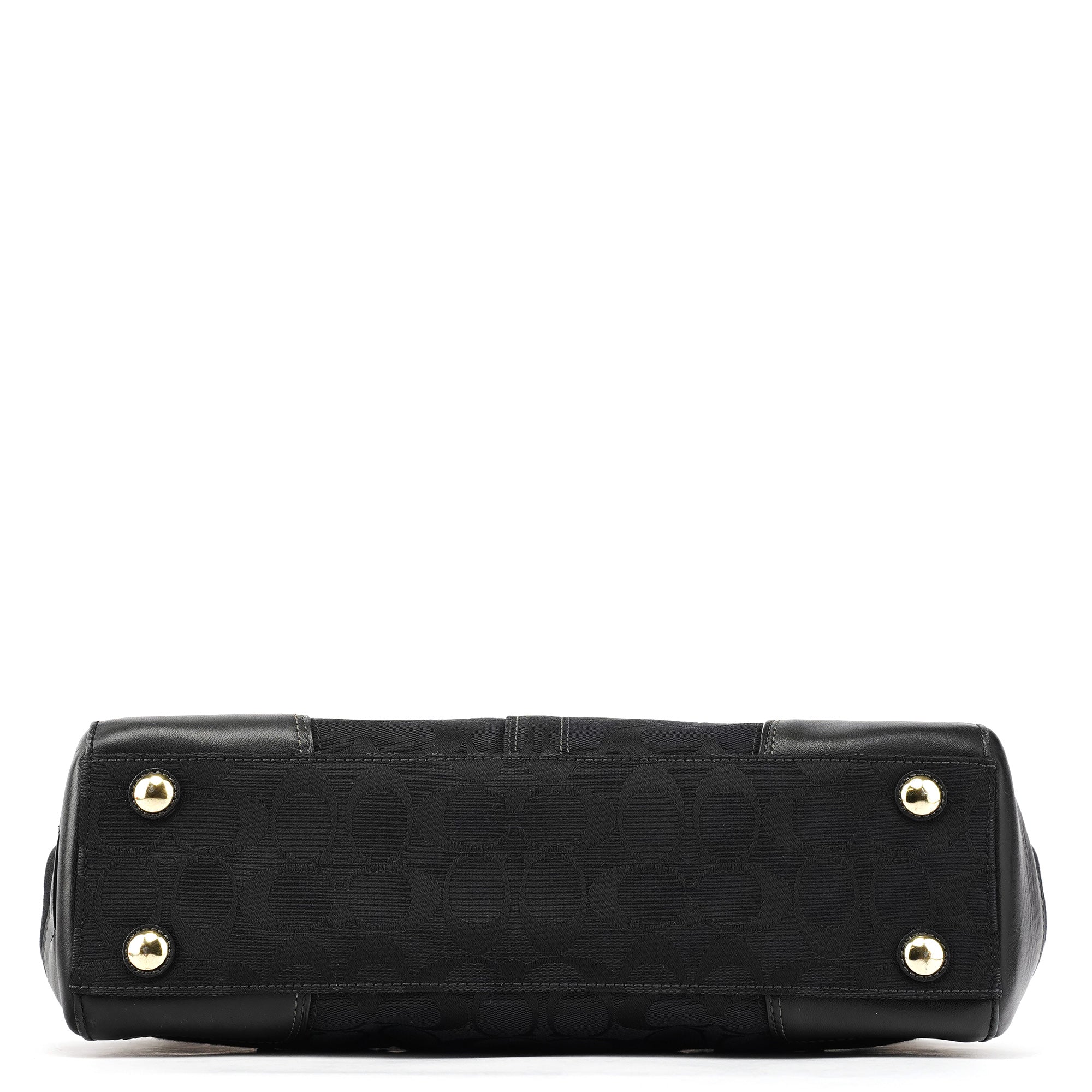 Designed in the mid 2000s, this Coach turnlock tote is crafted from black signature jacquard canvas with black leather trim, finished with gold-tone hardware, rolled shoulder straps, an exterior turnlock pocket, and a top zip closure.