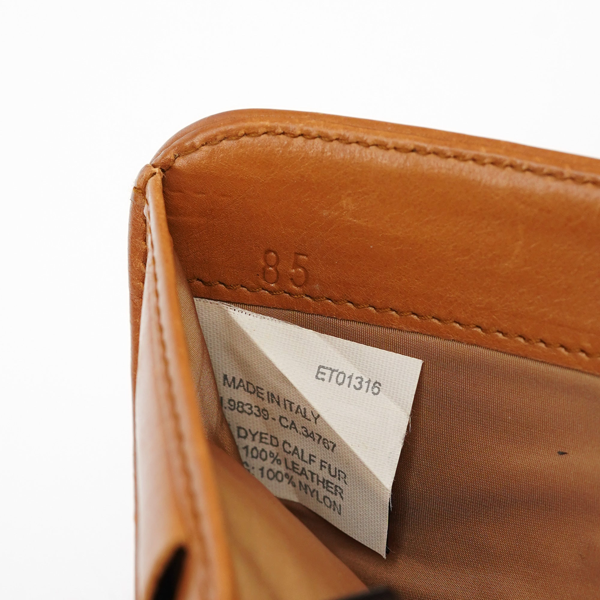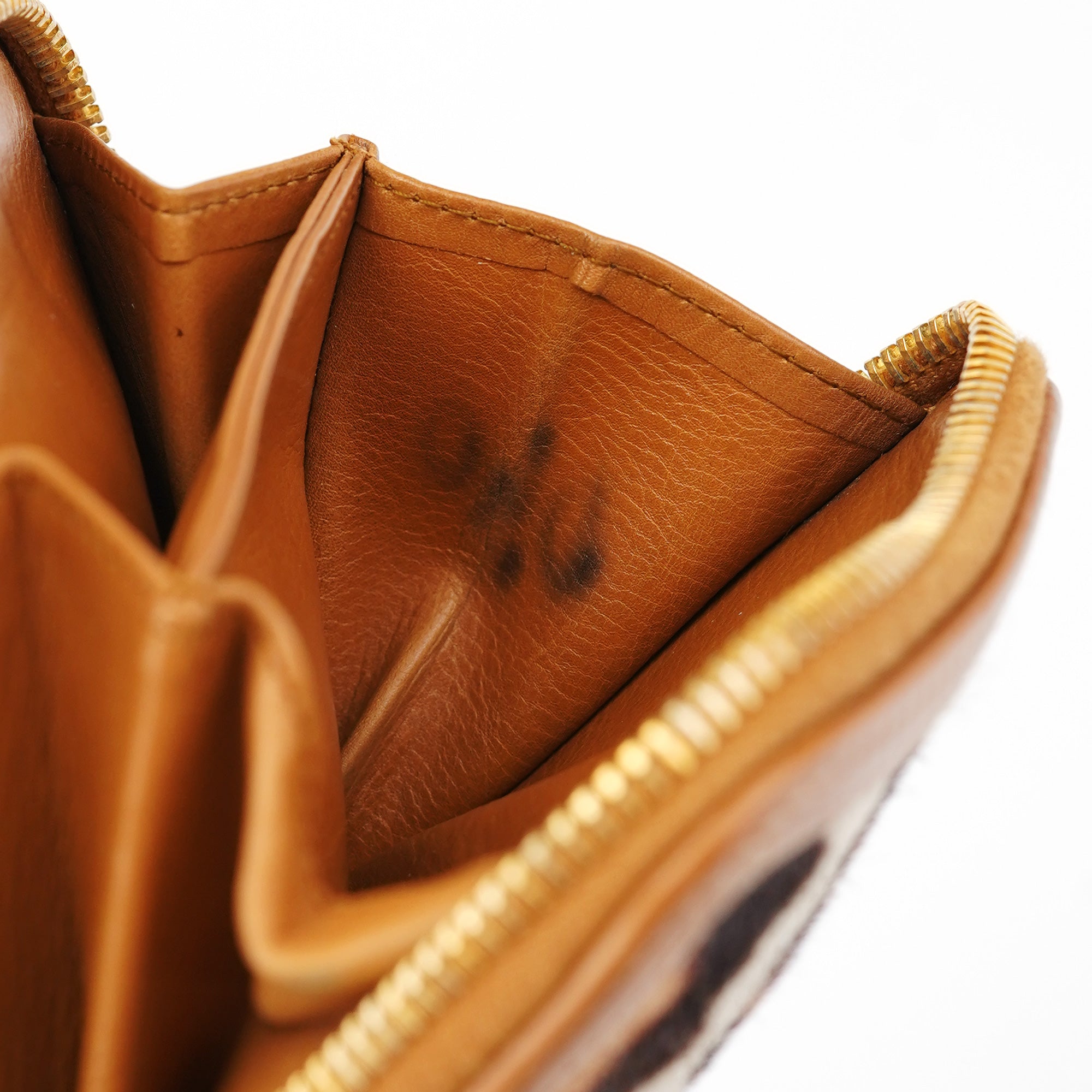 Designed in the late 1990s by Miuccia Prada, this Miu Miu wallet is crafted from calf hair in a bold leopard print with tan leather trim. It features a zip-around structure with gold-tone hardware, a leather bow accent, and a tonal leather interior with card slots and snap fastening.