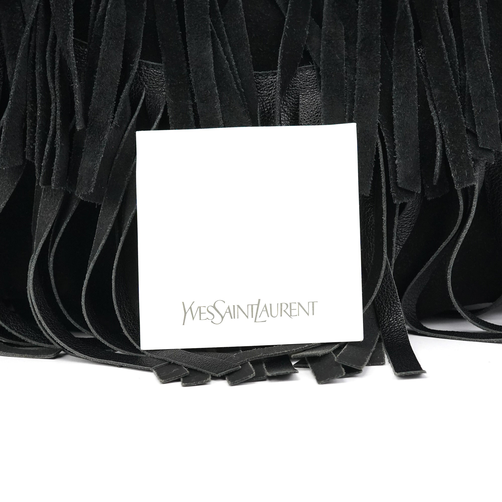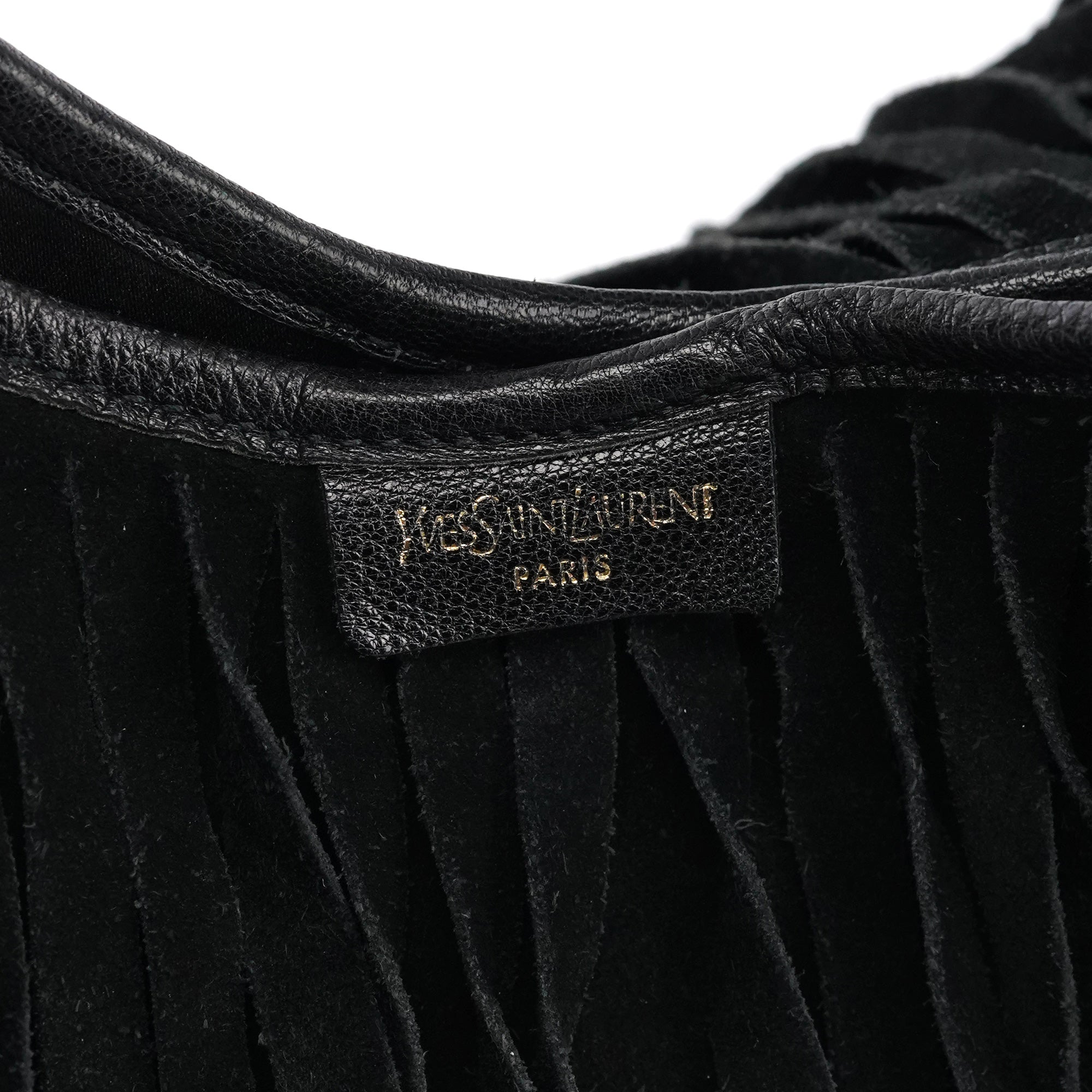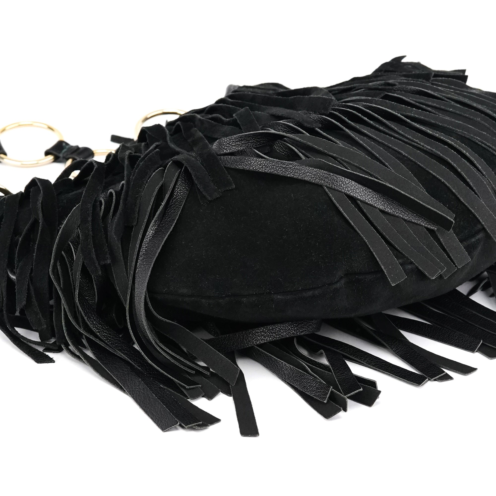 Designed in the early 2000s by Tom Ford, this Yves Saint Laurent Boheme Fringe shoulder bag is crafted from cascading black suede fringe with smooth calfskin accents. The curved silhouette is finished with a gold-tone ring-linked shoulder strap and a magnetic top closure. The interior is lined in black fabric with a zip pocket for essentials.
