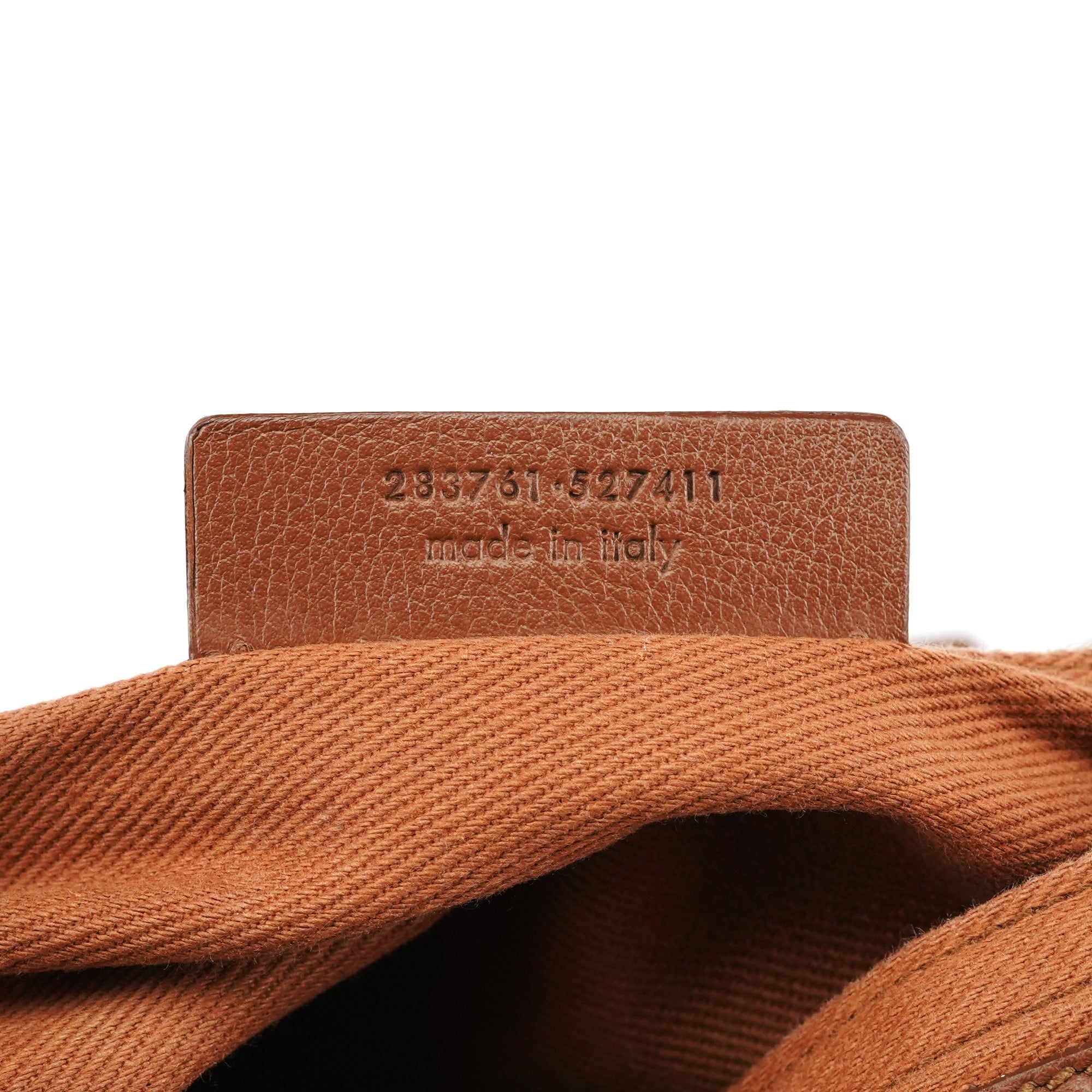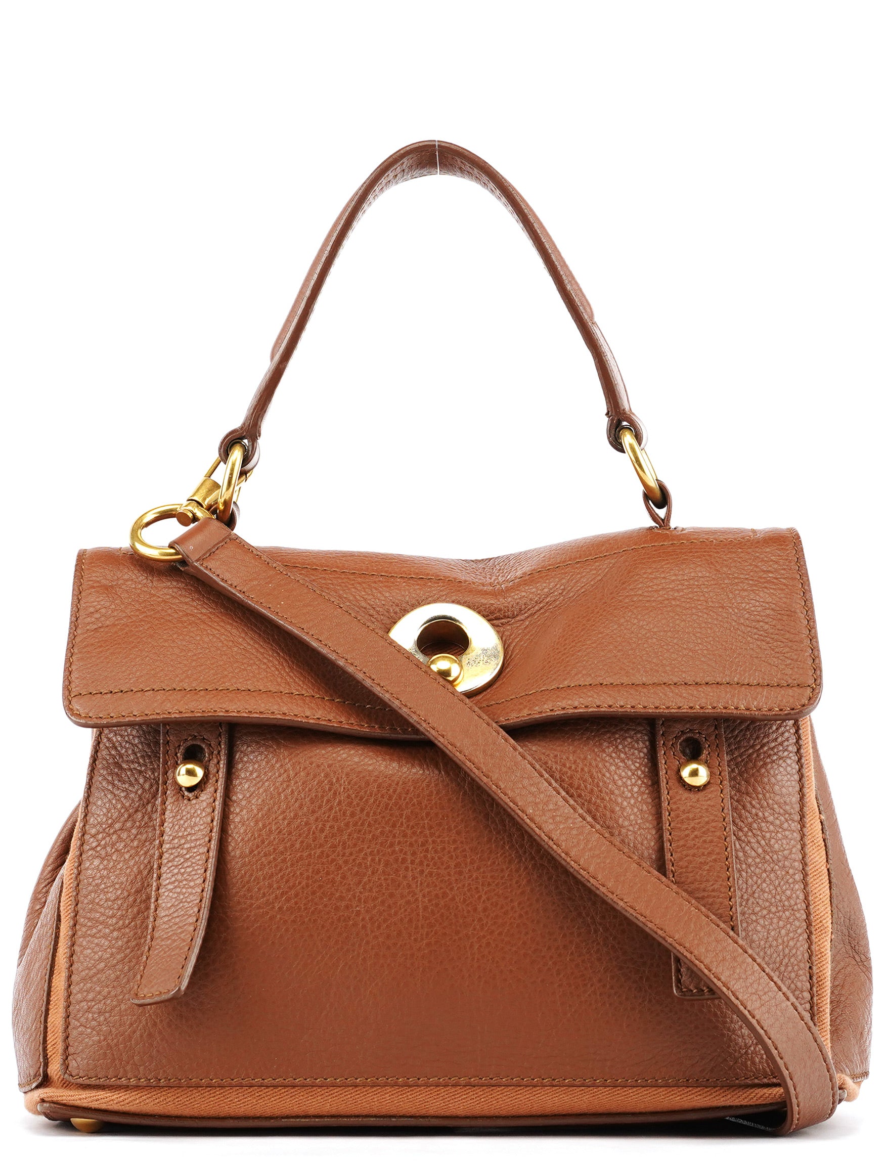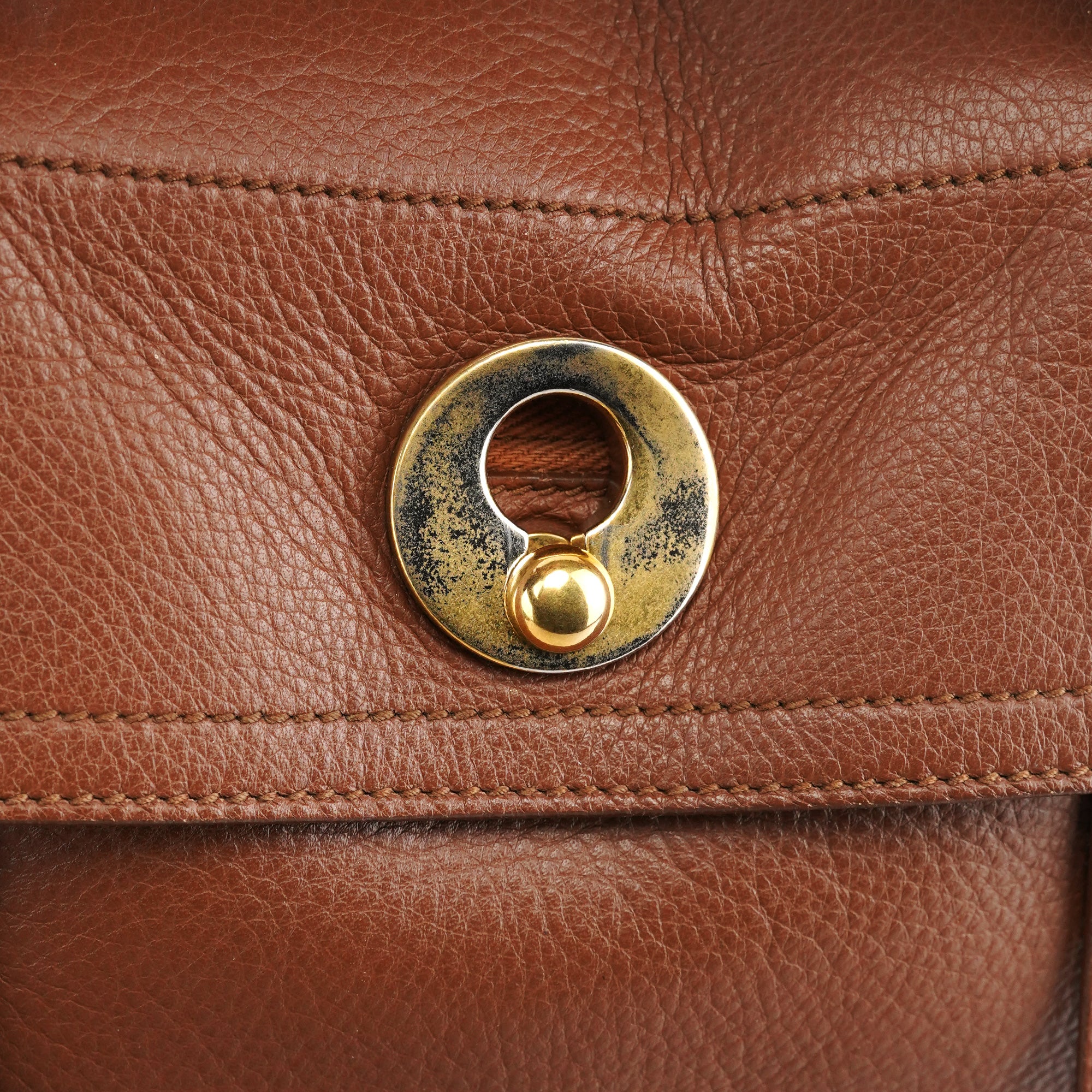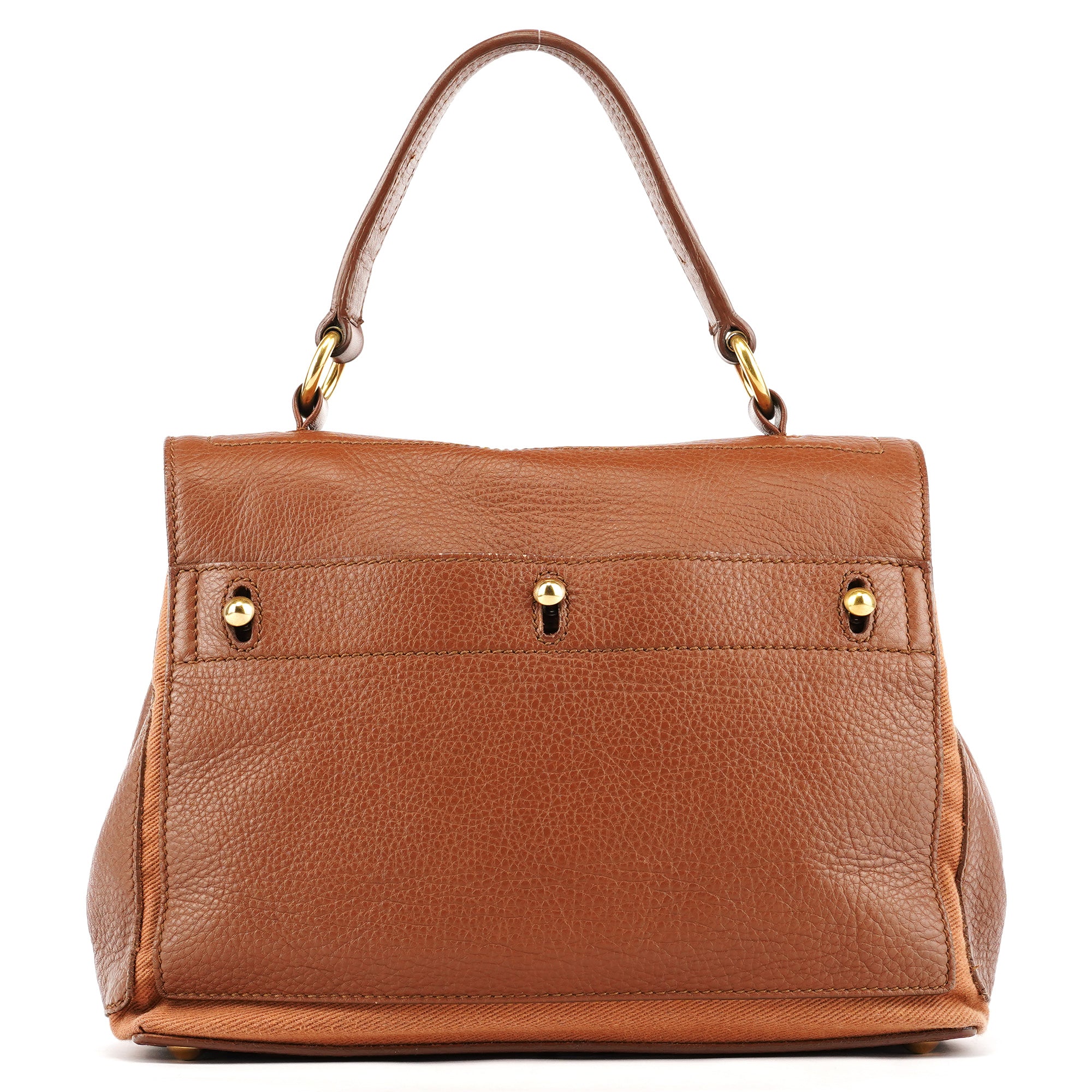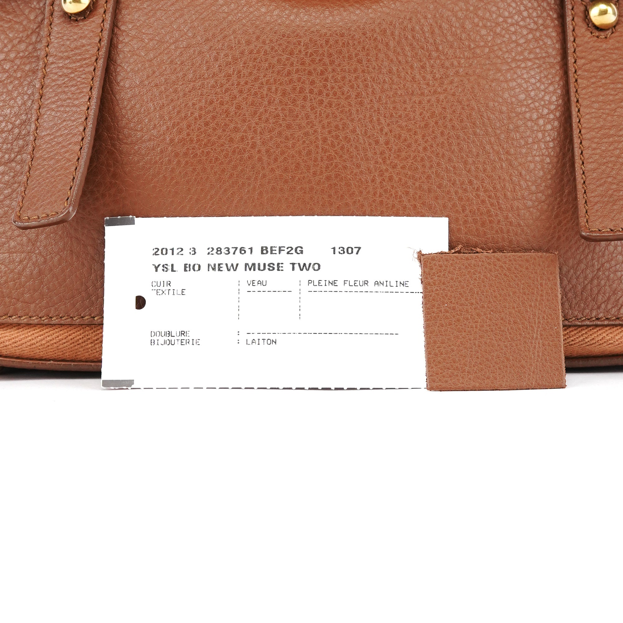 Designed in the late 2000s, this Yves Saint Laurent Muse Two 2-way bag is crafted in tan grained leather with a structured silhouette, gold-tone hardware, and the signature turn-lock closure. The design features double top handles, a detachable shoulder strap, and external side straps that frame the bag’s shape. The interior is lined in tonal canvas with an interior zipper pocket.