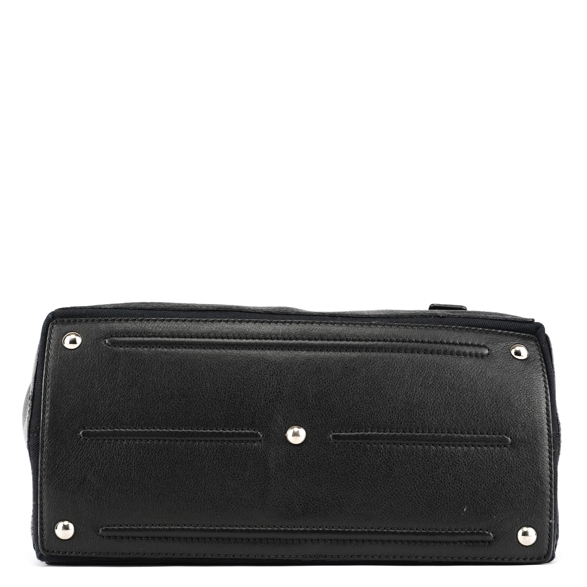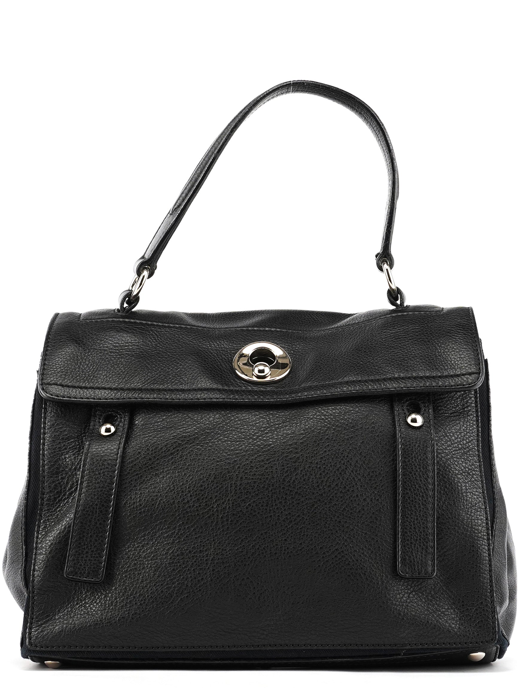 Designed in the late 2000s, this Yves Saint Laurent Muse Two bag is crafted in black leather with tonal canvas side panels and gold hardware. It features a structured silhouette, top handle, front flap with turn-lock closure, and a spacious interior lined in canvas with a zip pocket for daily essentials.