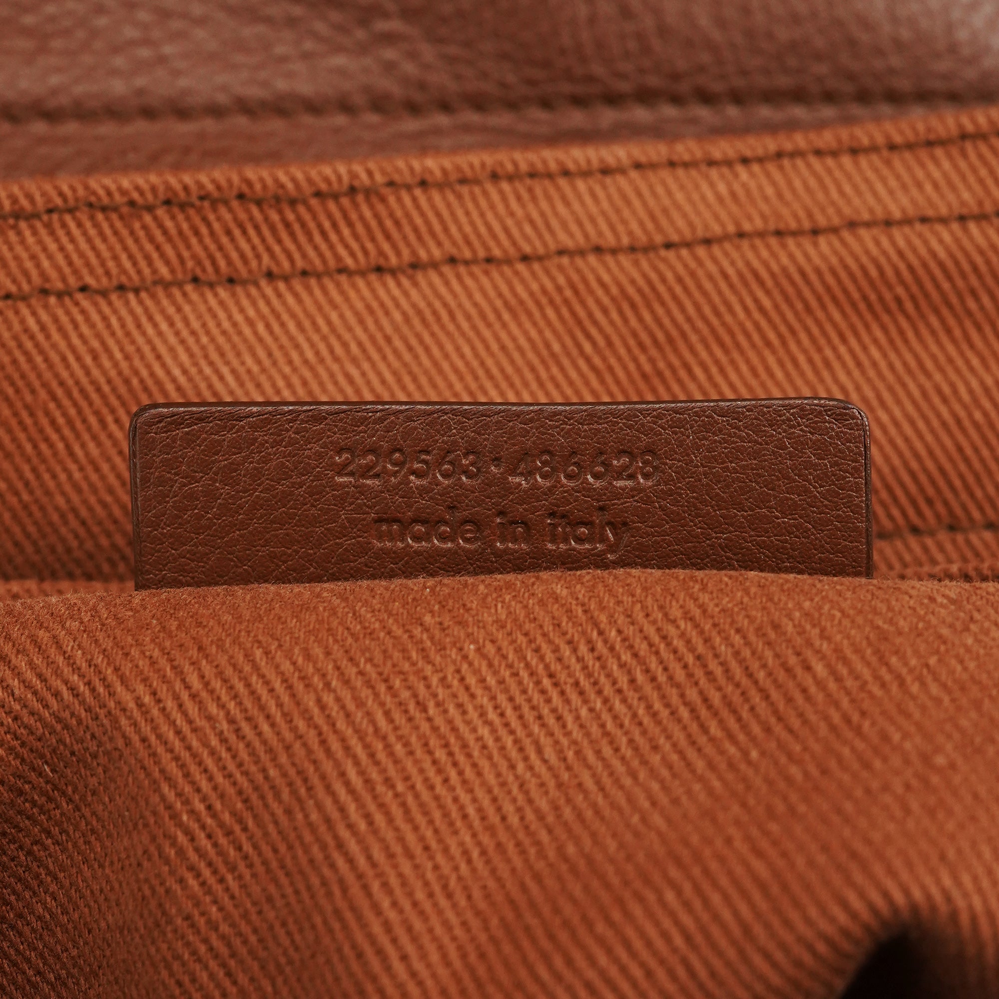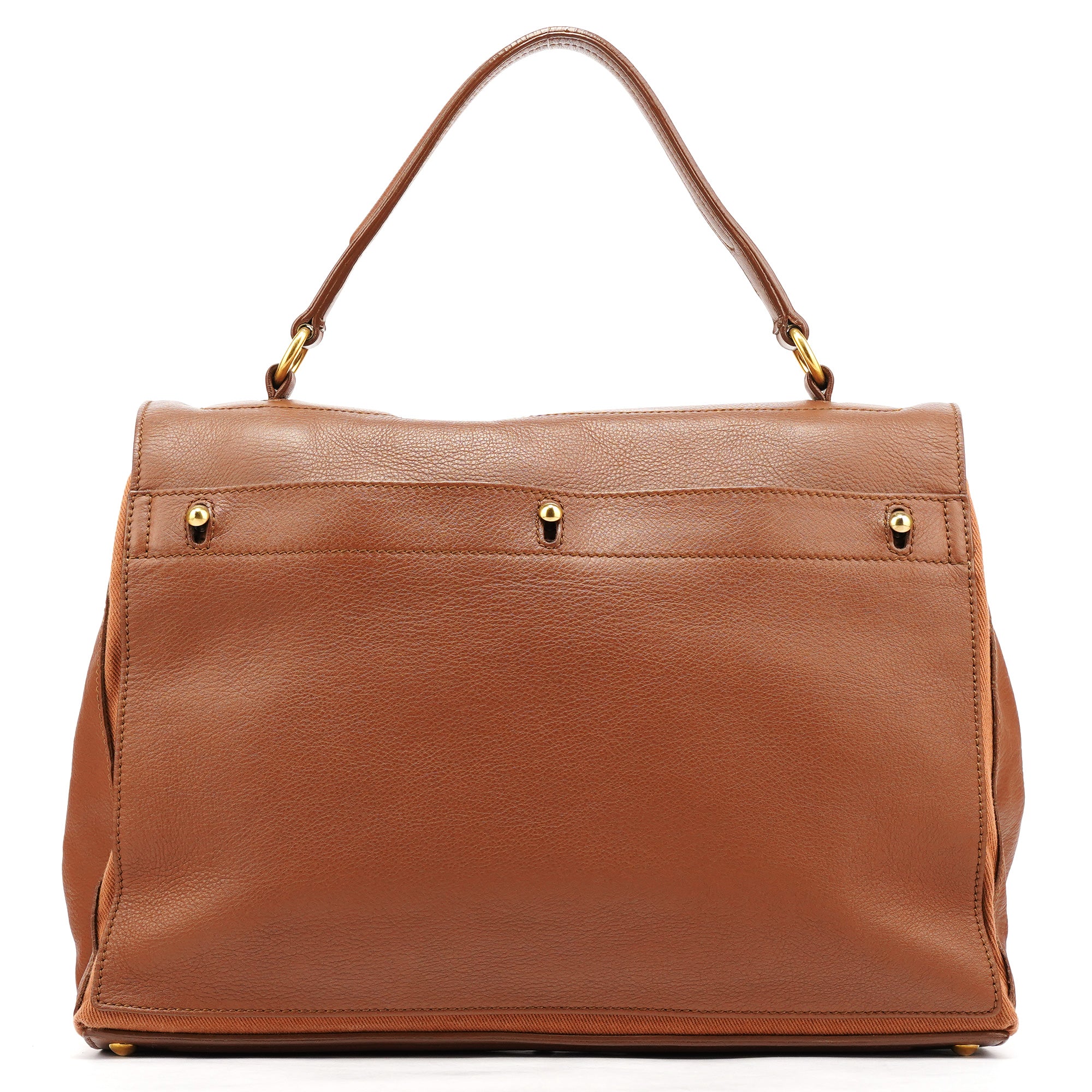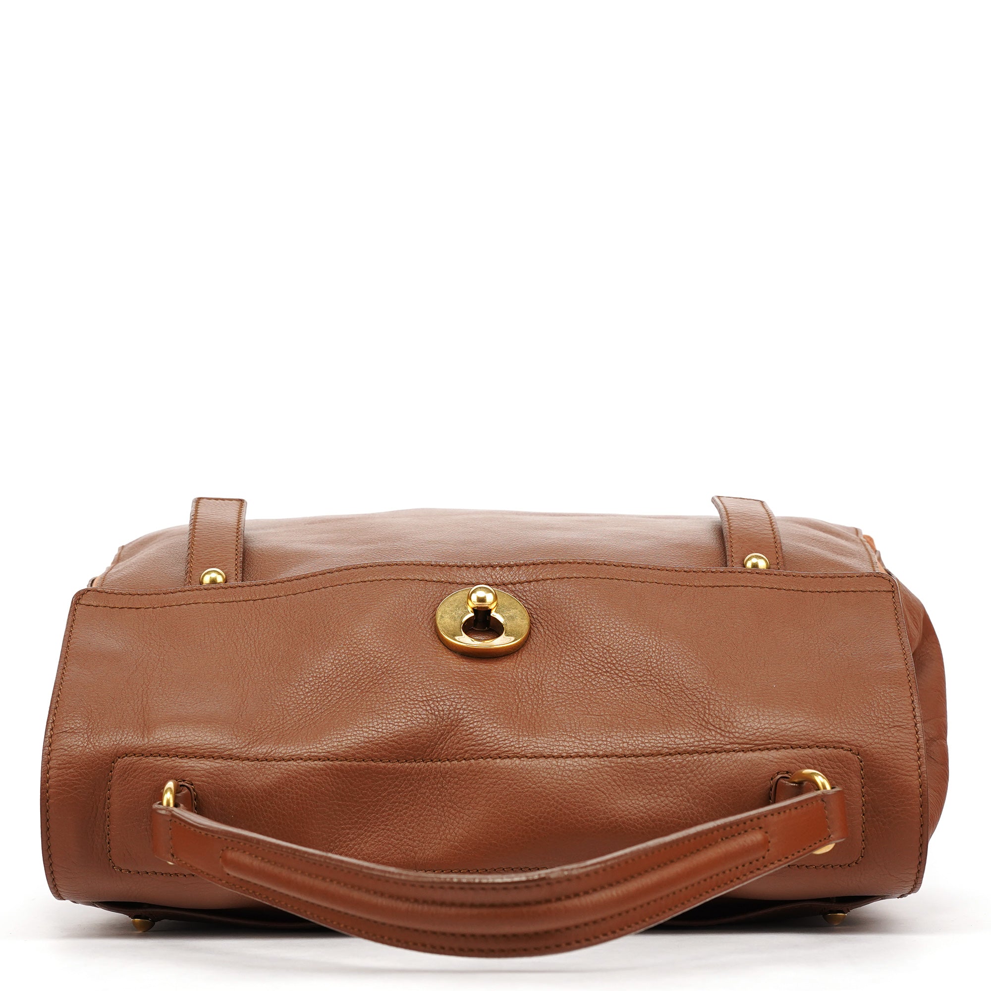 Designed in the late 2000s, this Yves Saint Laurent Muse Two bag is crafted in brown leather with a structured silhouette, gold-tone hardware, dual top handles, and a zip-top closure, finished with a fabric-lined interior and interior zip pocket.