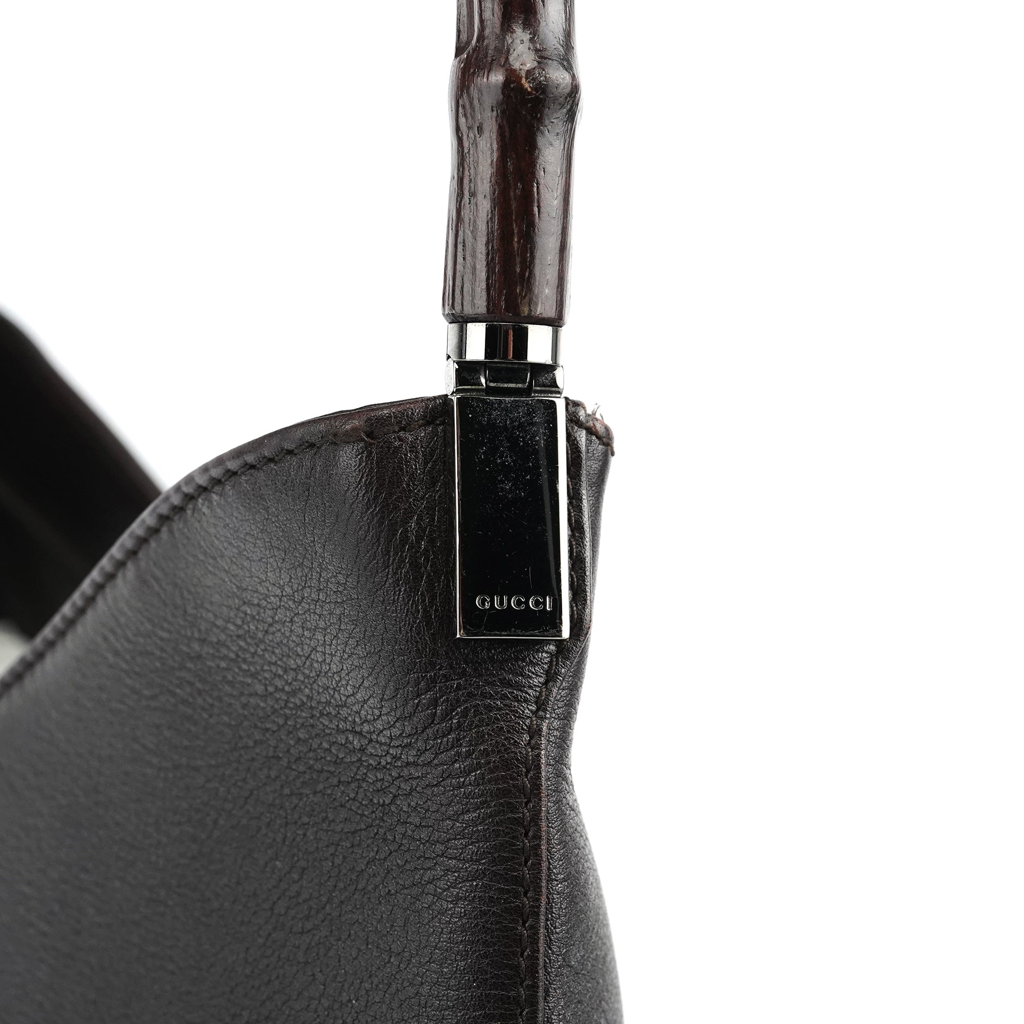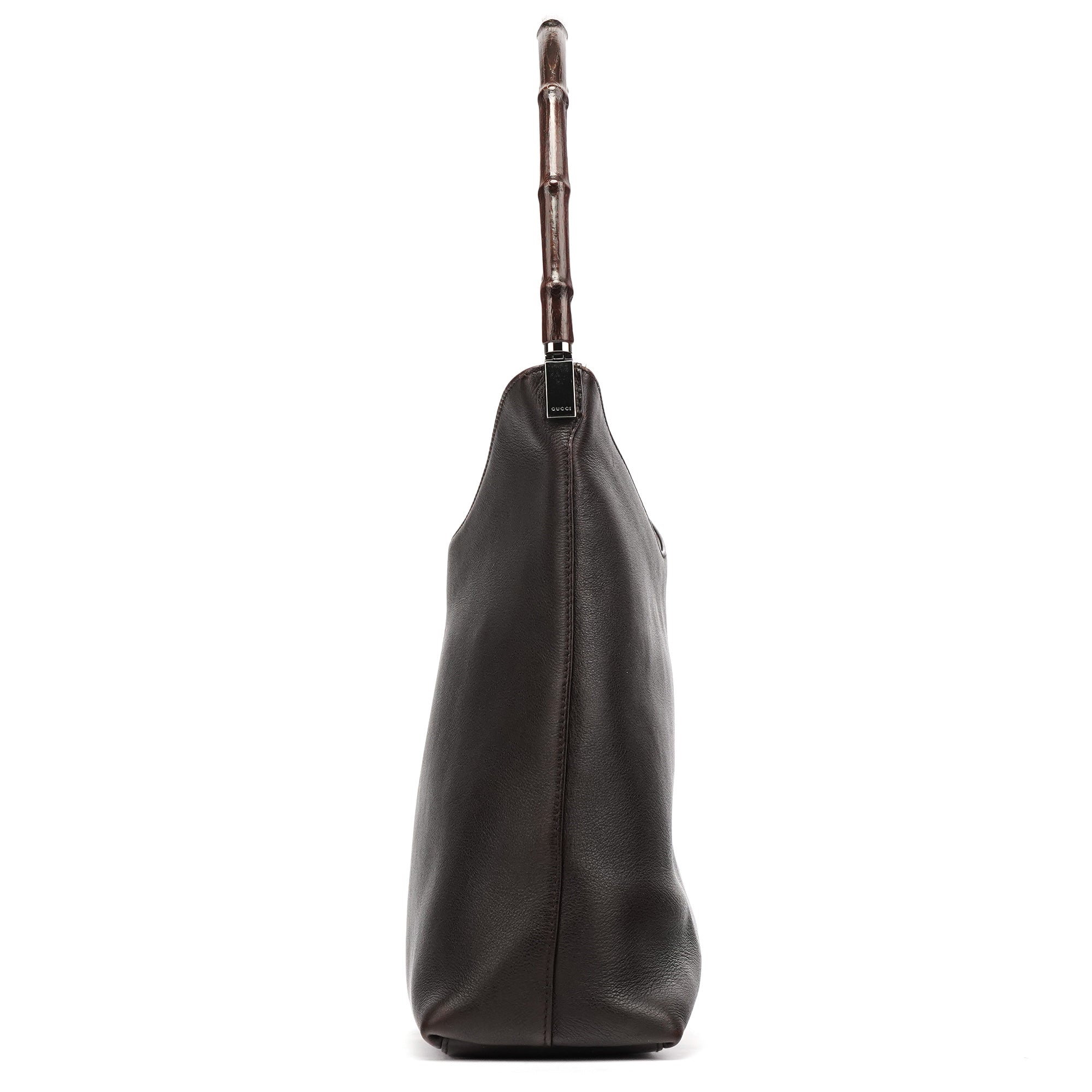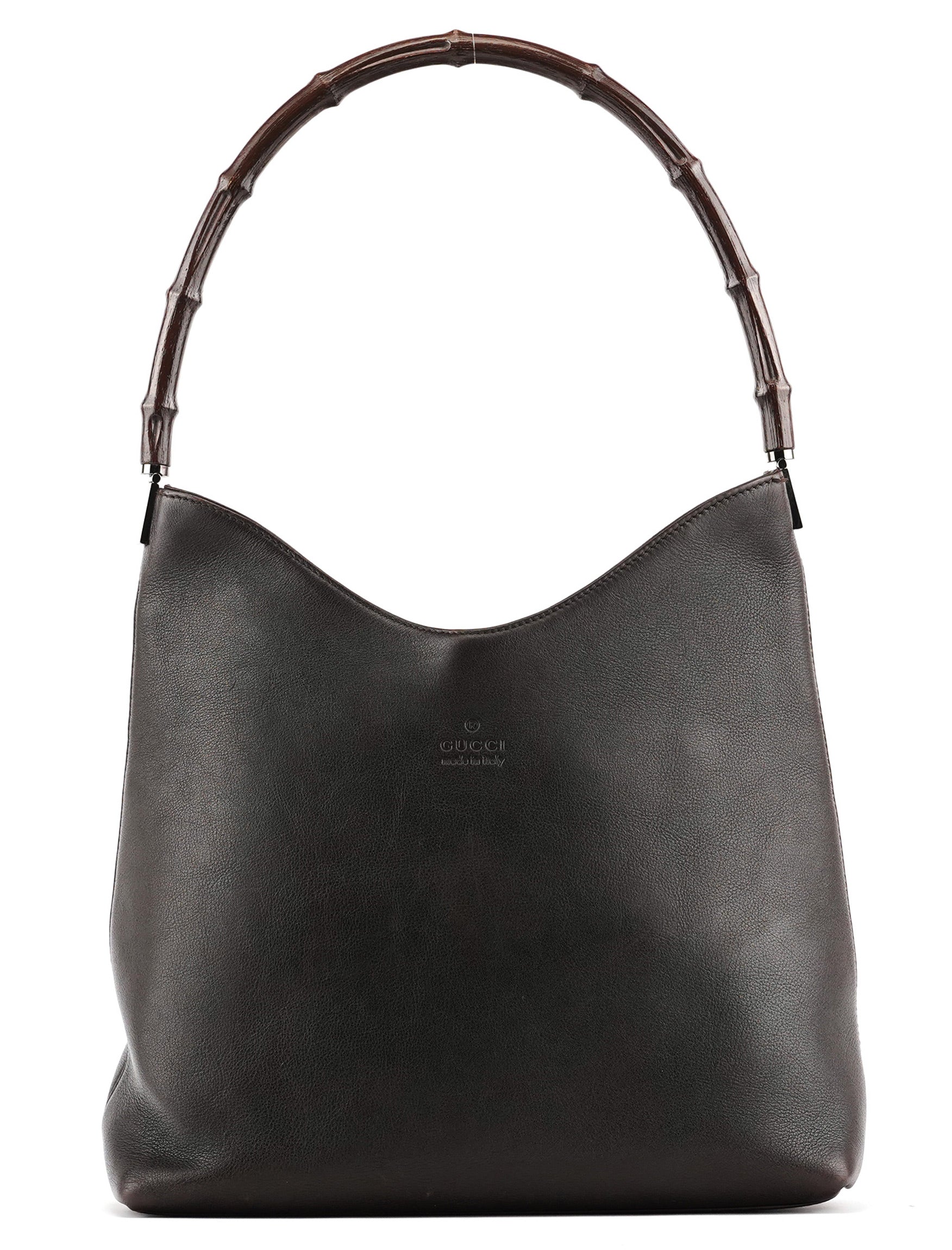 Designed in the late 1990s by Tom Ford, this Gucci Bamboo shoulder bag is crafted in dark brown calfskin leather with silver-tone hardware. The minimalist silhouette is elevated by the house’s iconic curved bamboo handle — a design emblem that fuses heritage craftsmanship with Ford’s refined sensuality. The interior is lined in smooth fabric with a zip pocket for essentials.