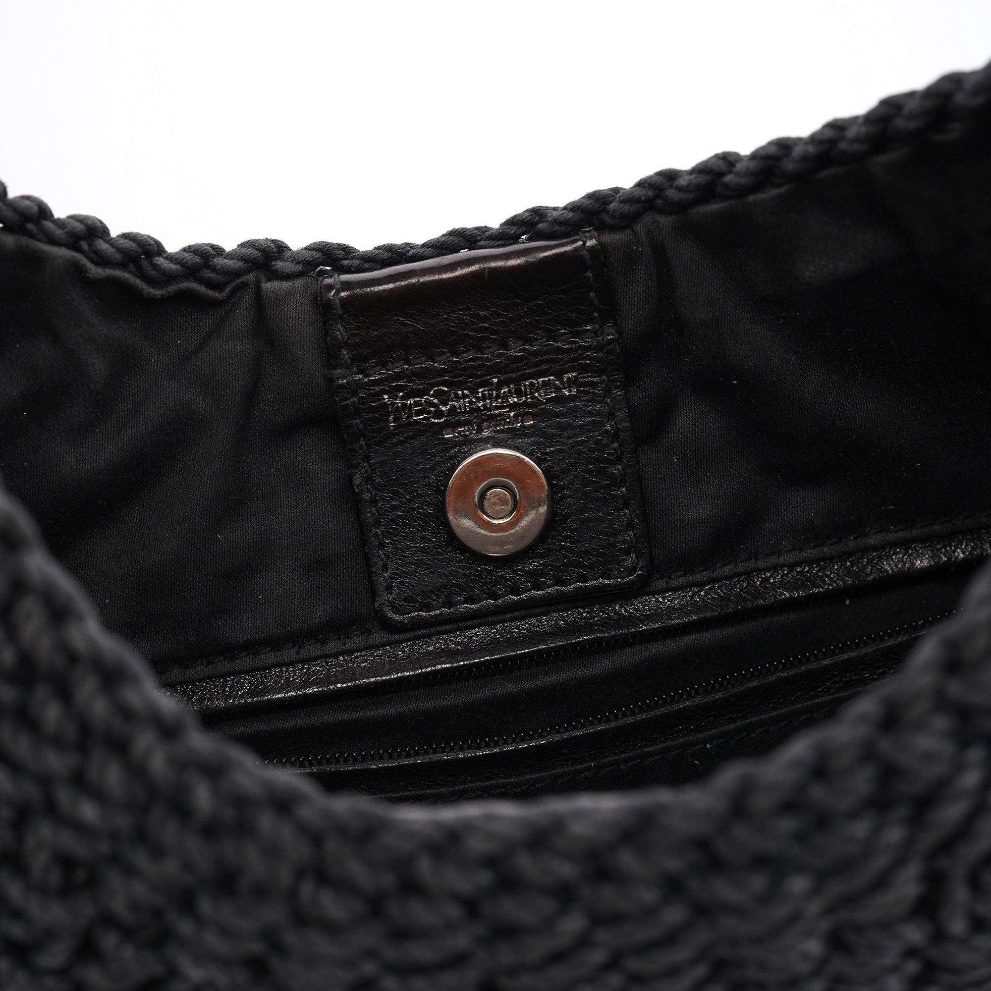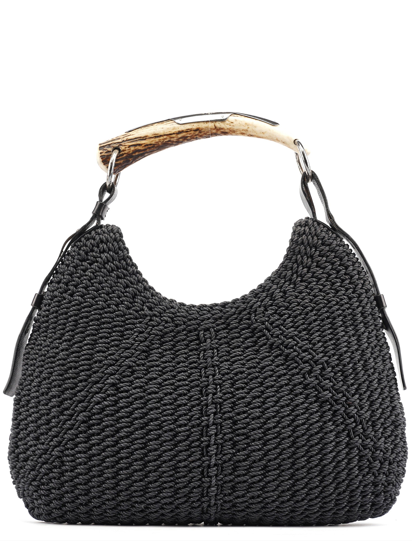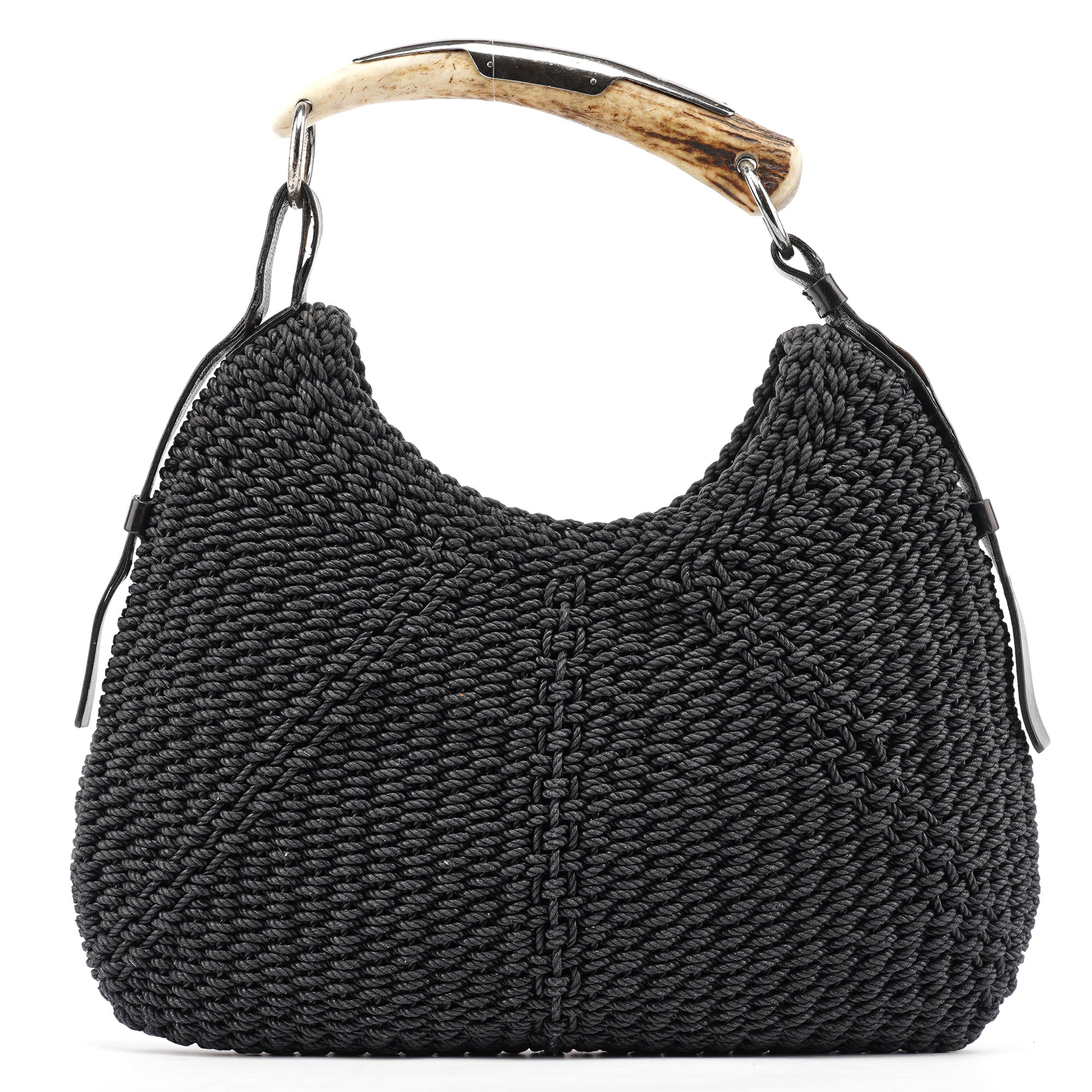 Designed in the early 2000s by Tom Ford for Yves Saint Laurent, the Mombasa hobo bag features tightly braided black rope with a sculptural deer horn handle — one of the era’s most iconic accessories. The natural handle is reinforced with silver-tone plating, attached by black leather tabs and engraved metal rings. The bag opens to a black satin interior with a zippered pocket and matching leather trim.