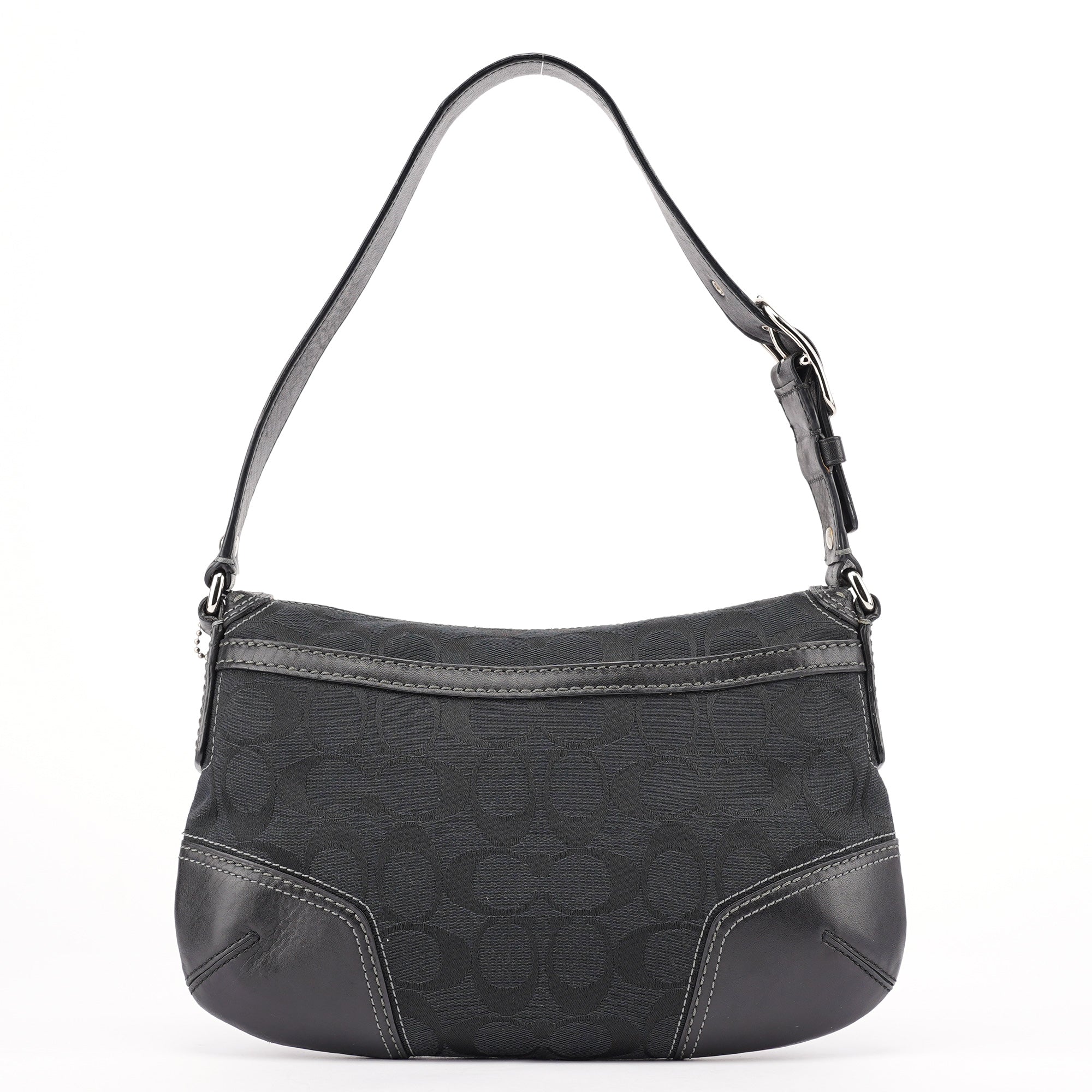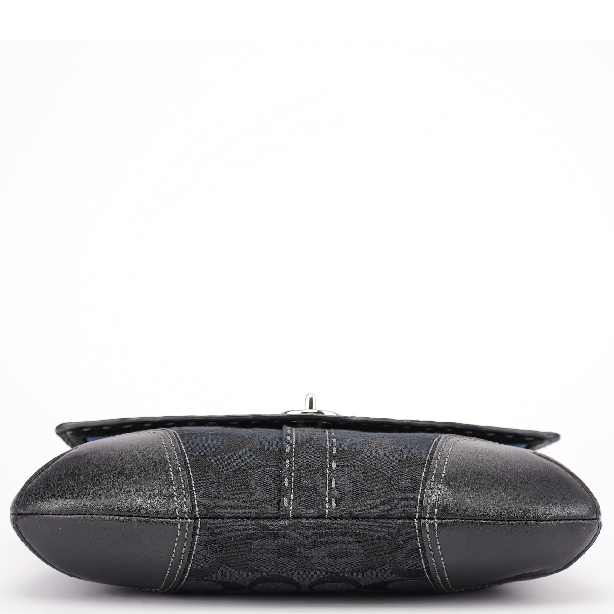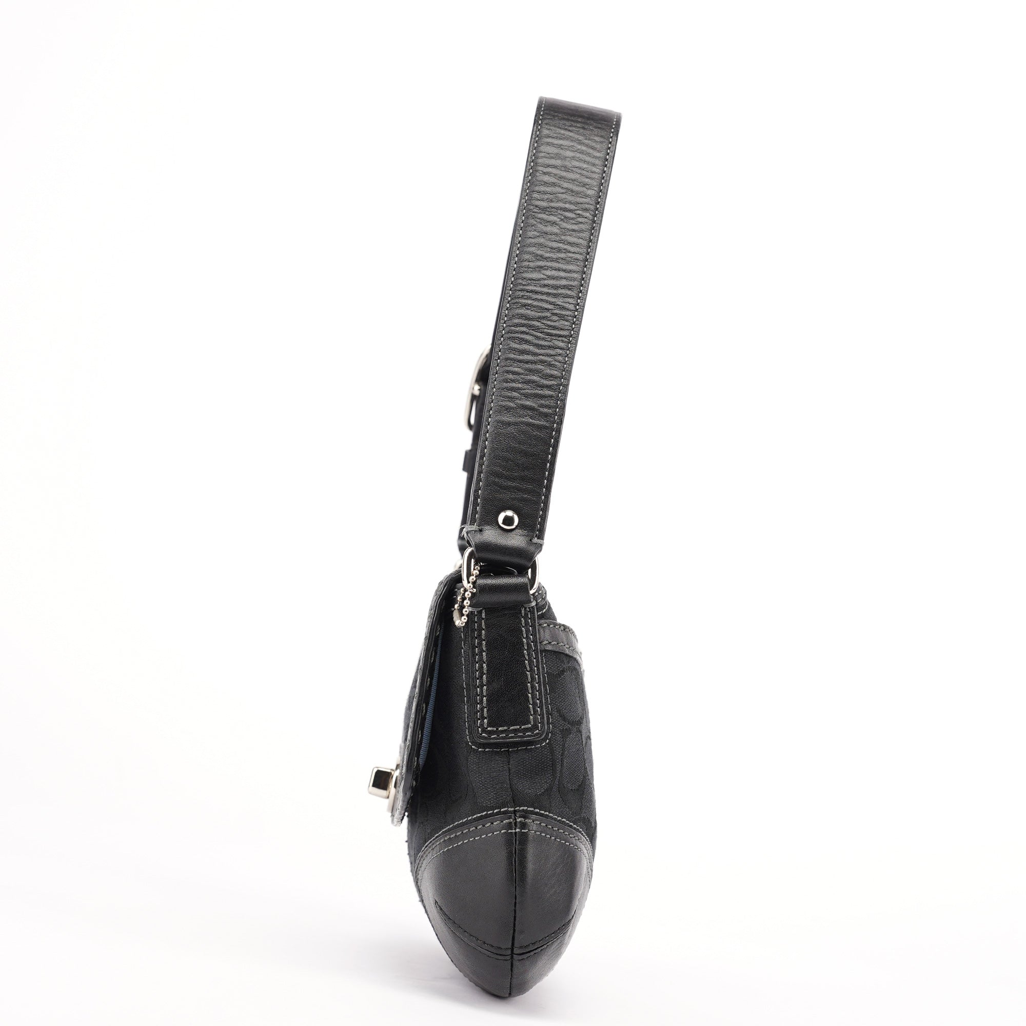 Designed in the early 2000s by Coach, this Coach Soho black jacquard flap bag features the brand’s signature monogram canvas with tonal leather trim and contrast stitching. The structured silhouette is finished with silver-tone turn-lock hardware, a single flat strap, and reinforced corners for durability. The interior is lined in pale blue fabric and includes a zip pocket for secure storage.