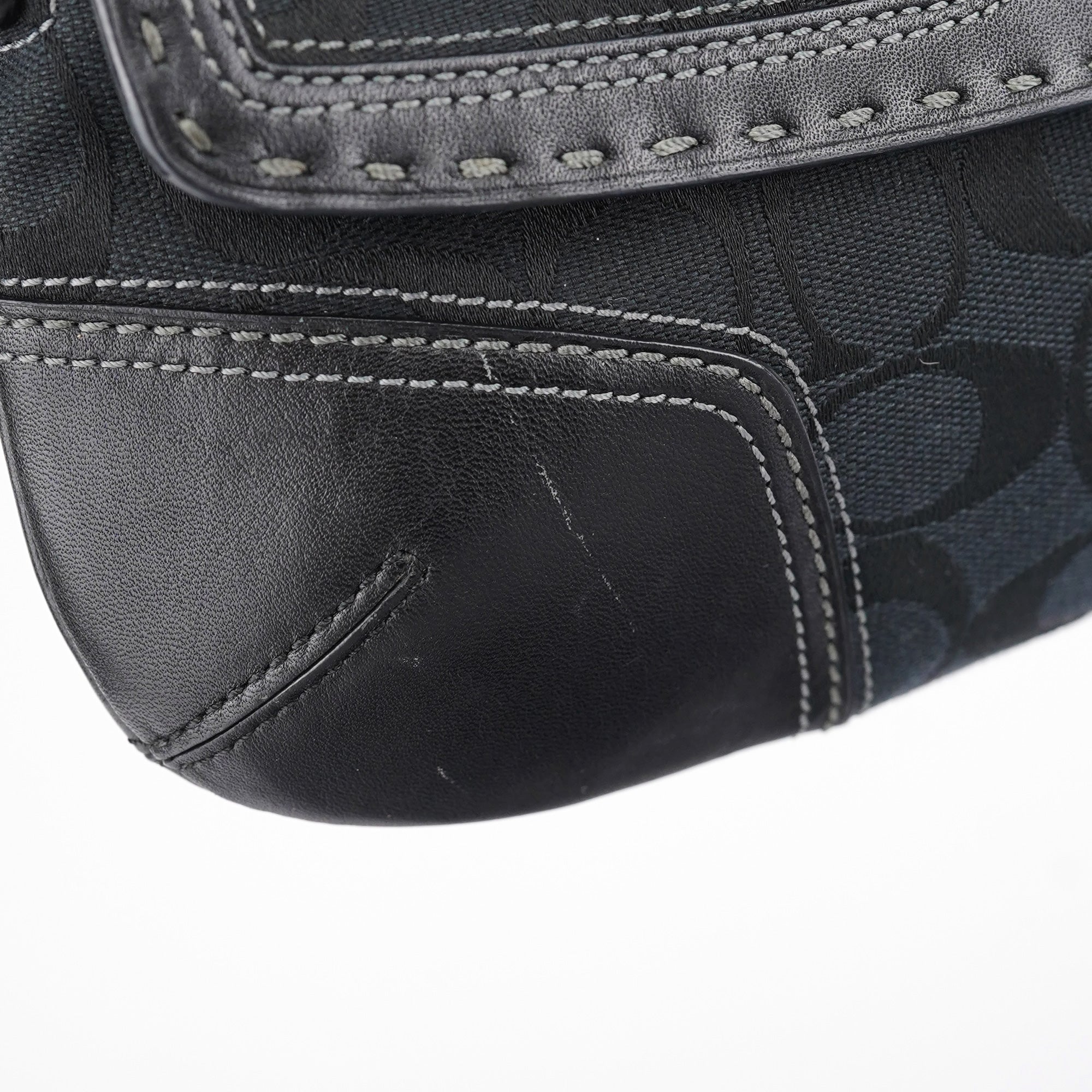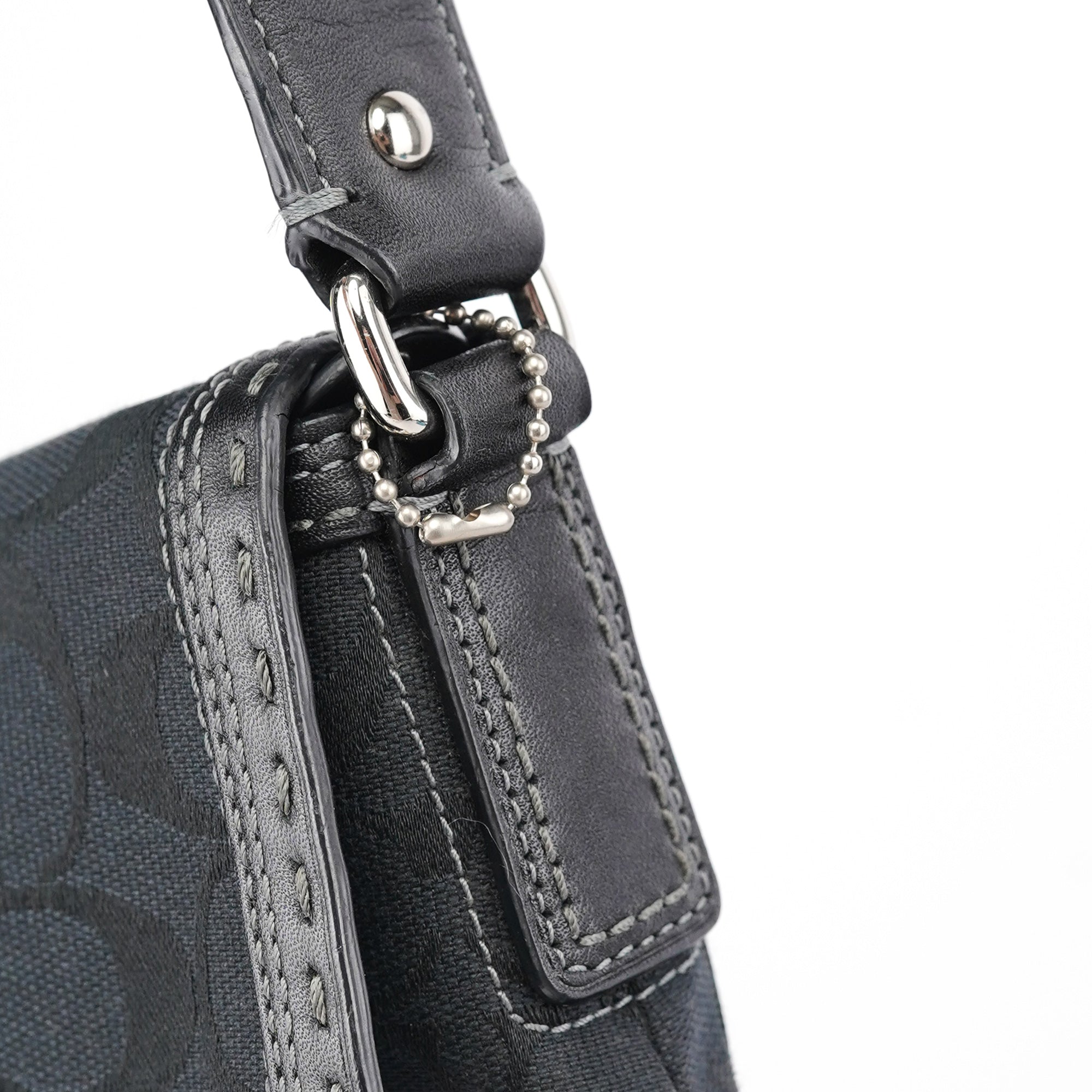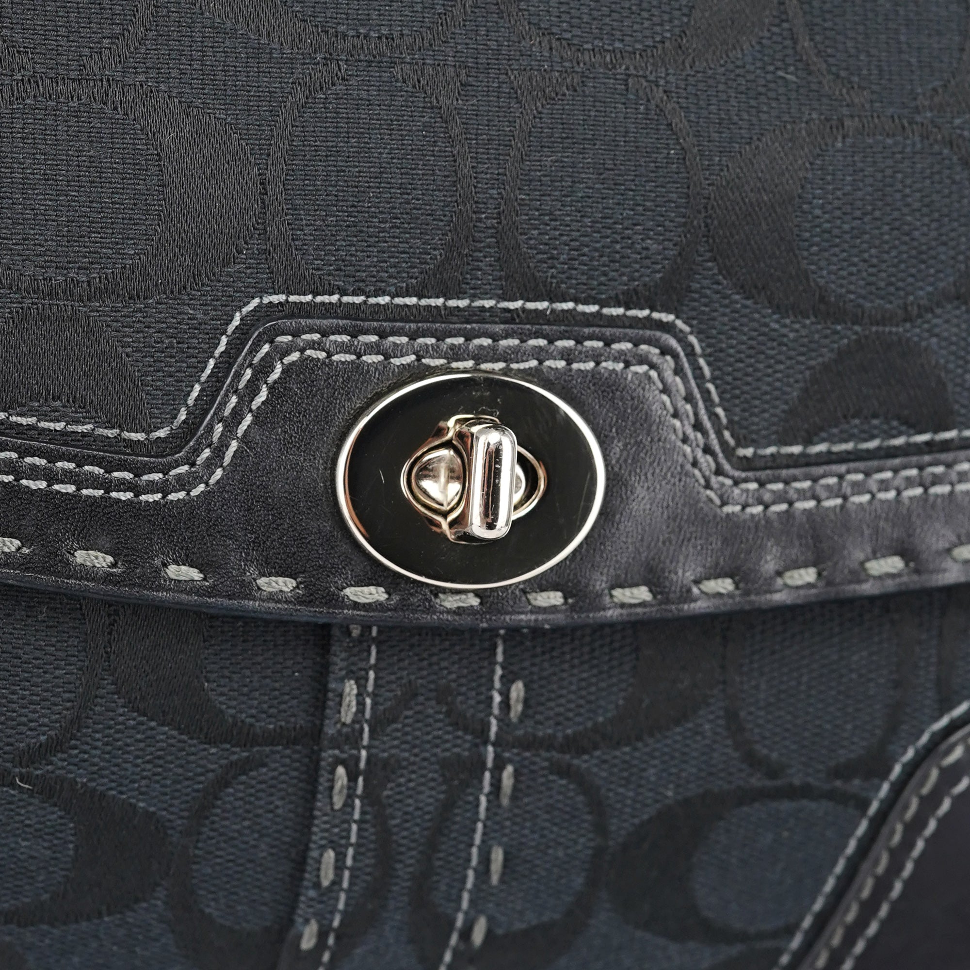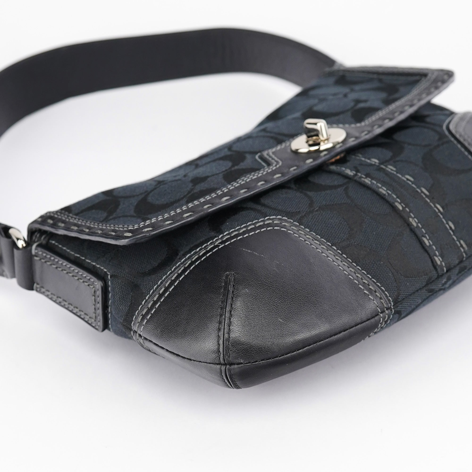Designed in the early 2000s by Coach, this Coach Soho black jacquard flap bag features the brand’s signature monogram canvas with tonal leather trim and contrast stitching. The structured silhouette is finished with silver-tone turn-lock hardware, a single flat strap, and reinforced corners for durability. The interior is lined in pale blue fabric and includes a zip pocket for secure storage.