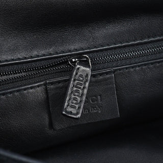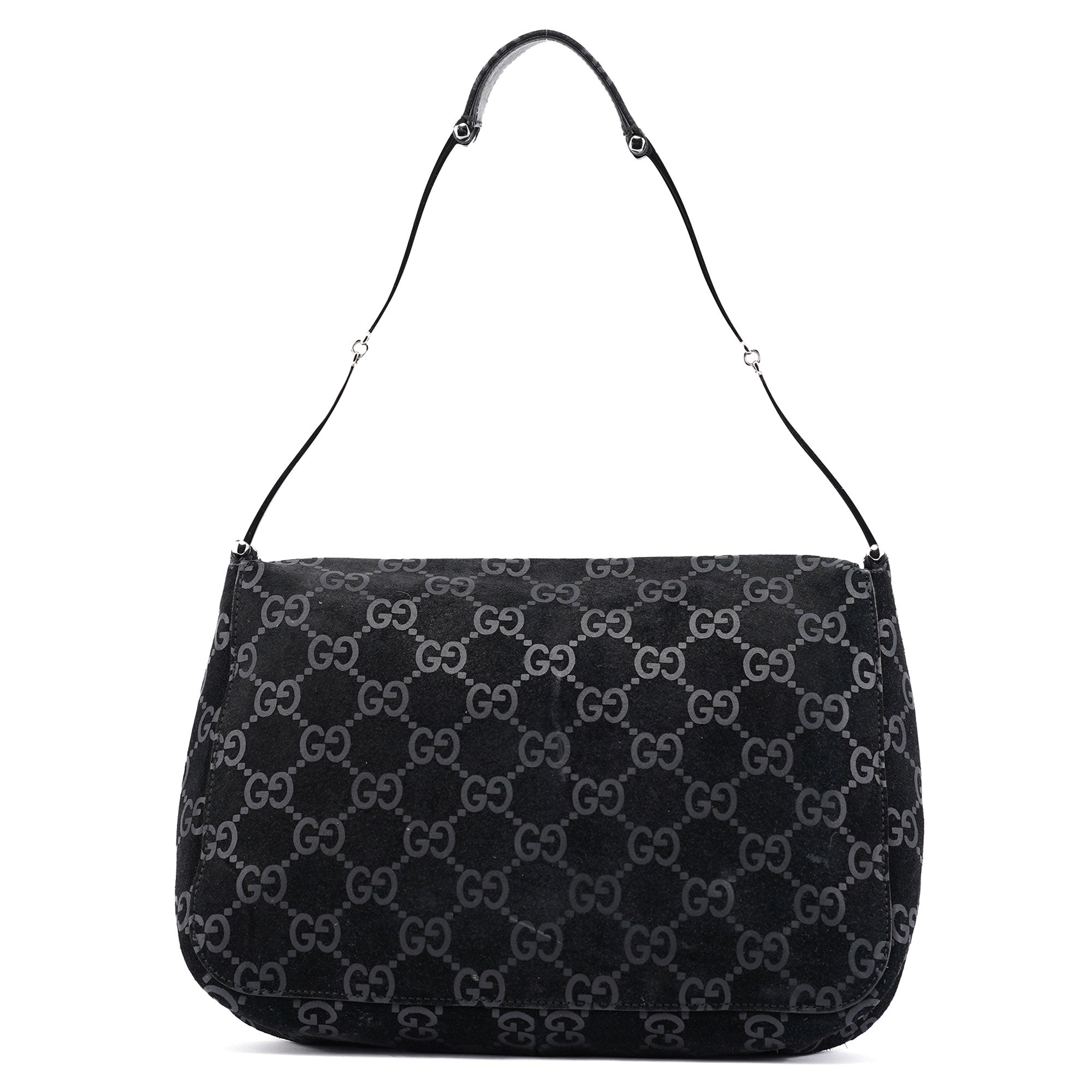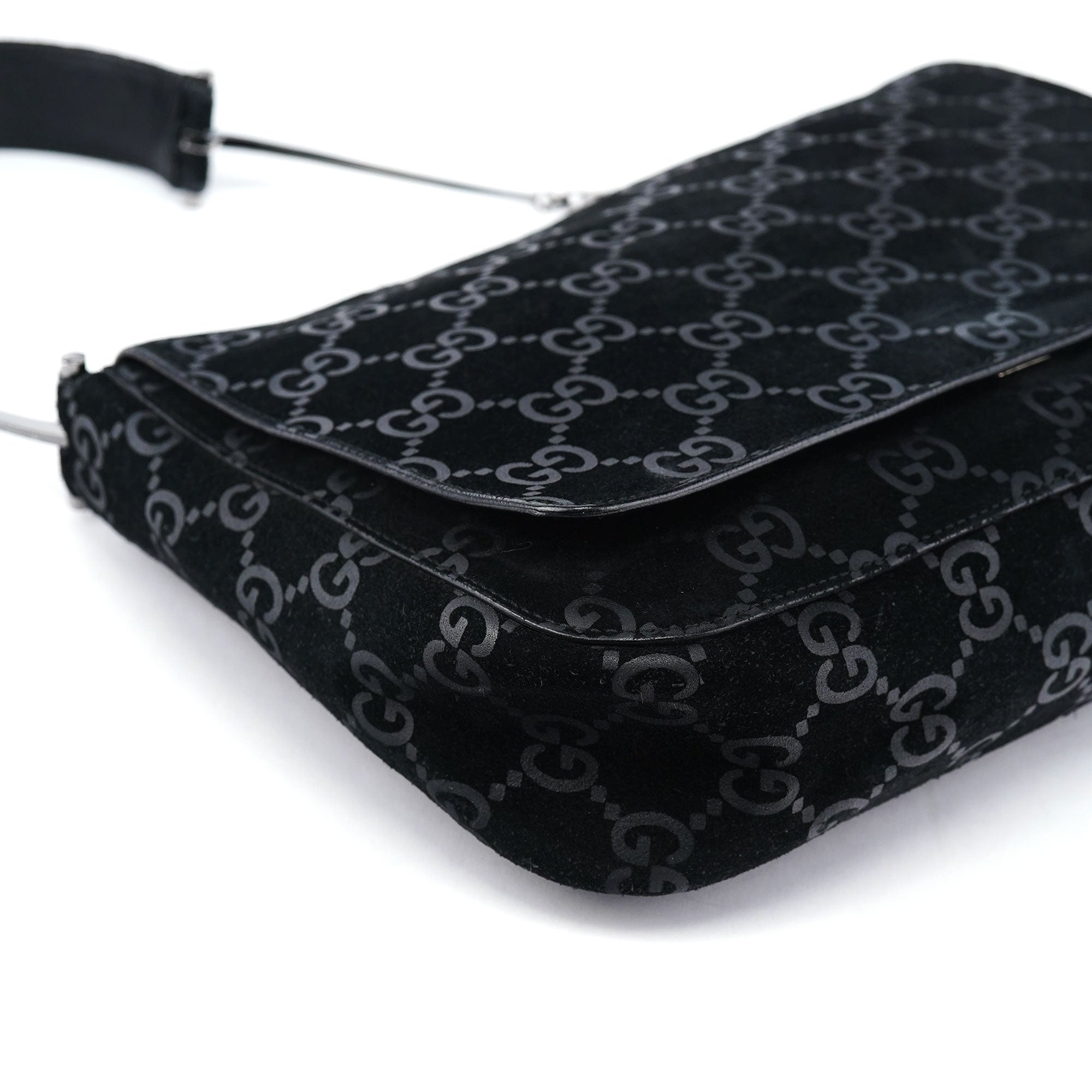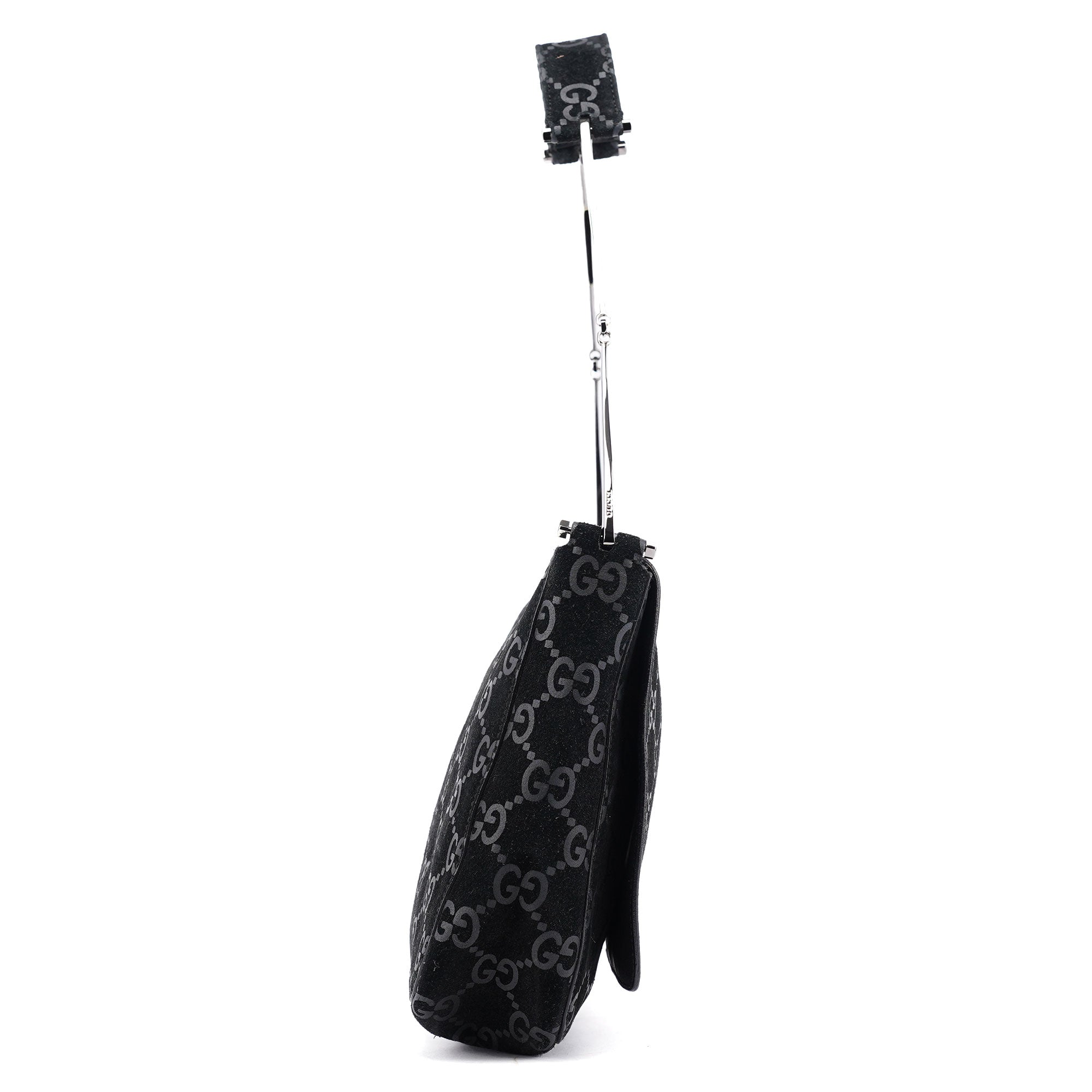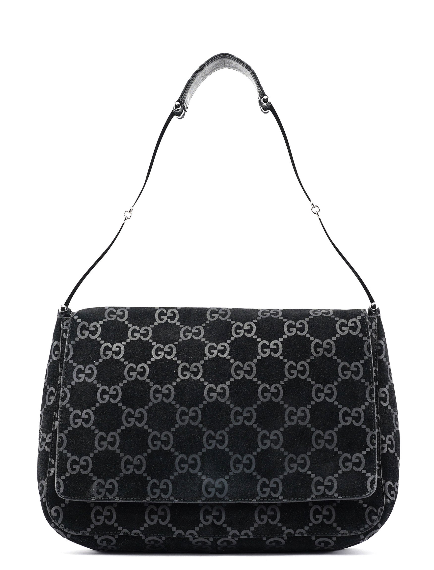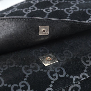 Designed by Tom Ford in 1997, the Gucci GG Horsebit shoulder bag is crafted from black GG monogram suede with black calfskin leather trim. It features silver-tone hardware, including a signature horsebit handle engraved with the Gucci logo. A magnetic closure secures the calfskin leather-lined interior, which includes a zipper pocket for organization, blending timeless elegance with modern sophistication.