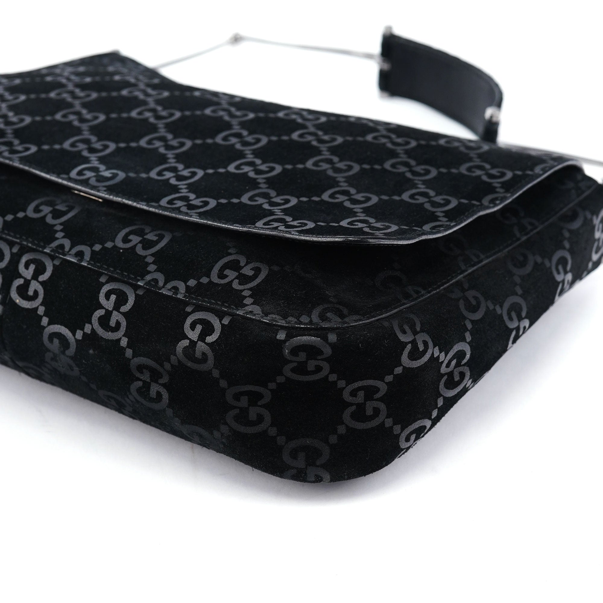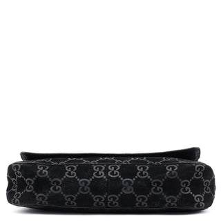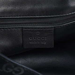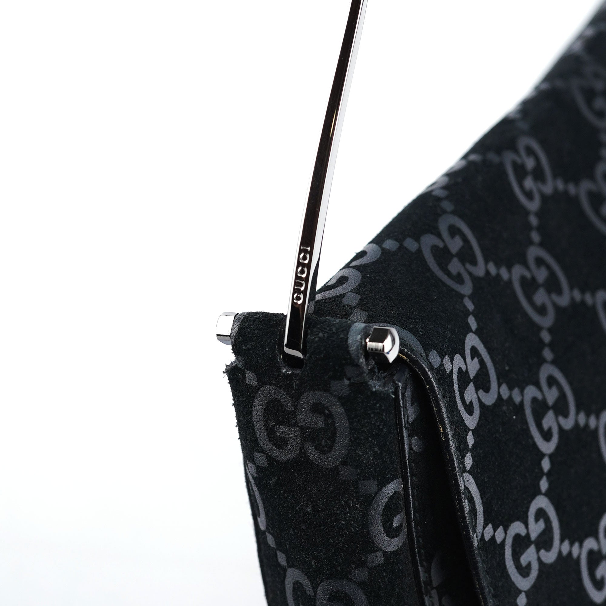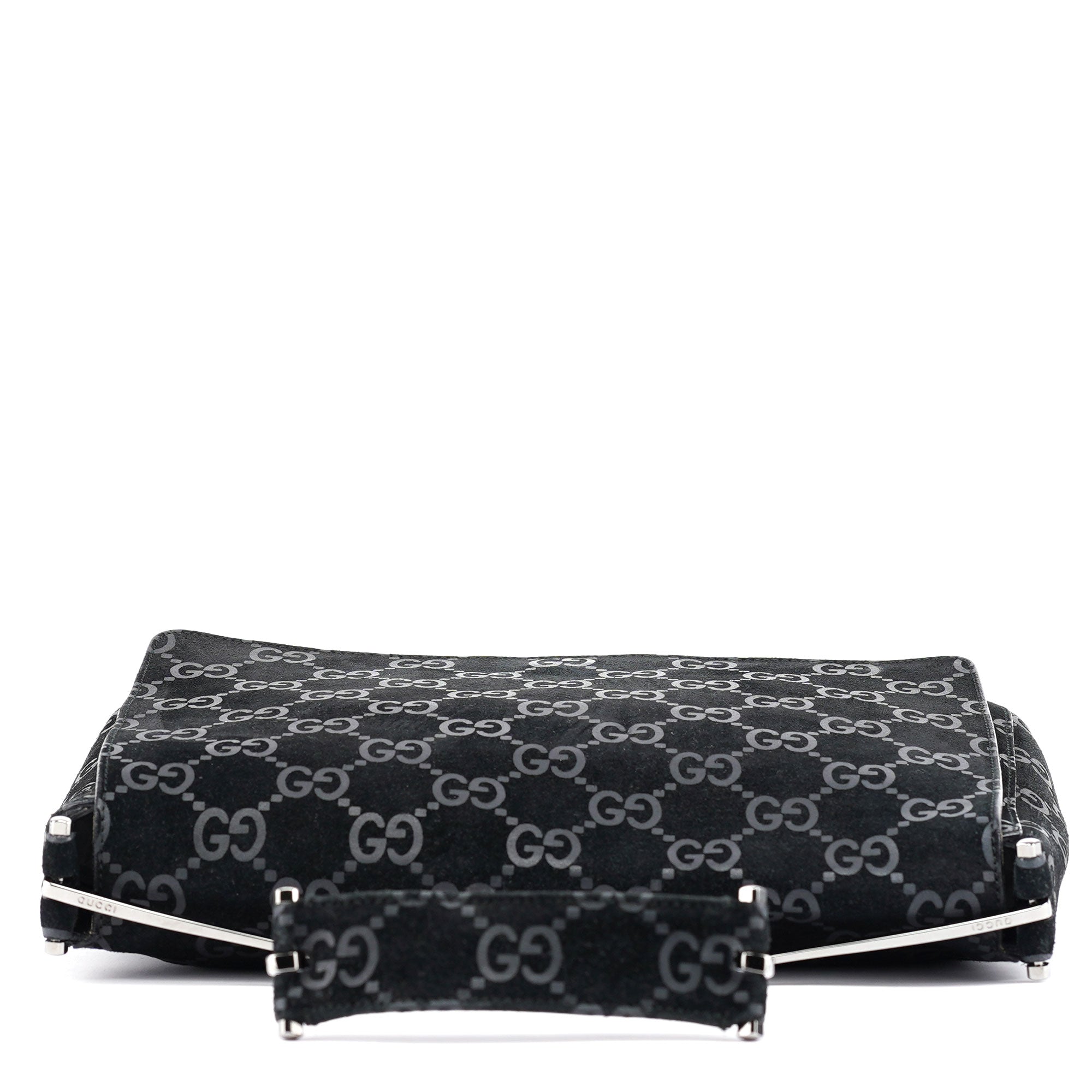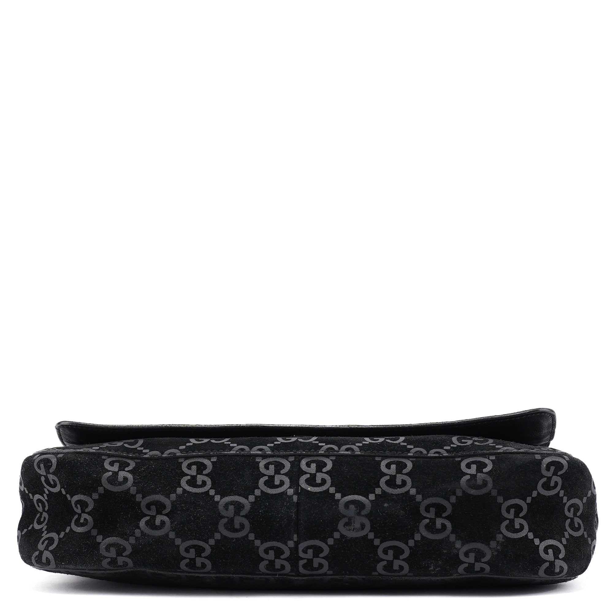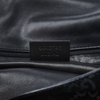 Designed by Tom Ford in 1997, the Gucci GG Horsebit shoulder bag is crafted from black GG monogram suede with black calfskin leather trim. It features silver-tone hardware, including a signature horsebit handle engraved with the Gucci logo. A magnetic closure secures the calfskin leather-lined interior, which includes a zipper pocket for organization, blending timeless elegance with modern sophistication.