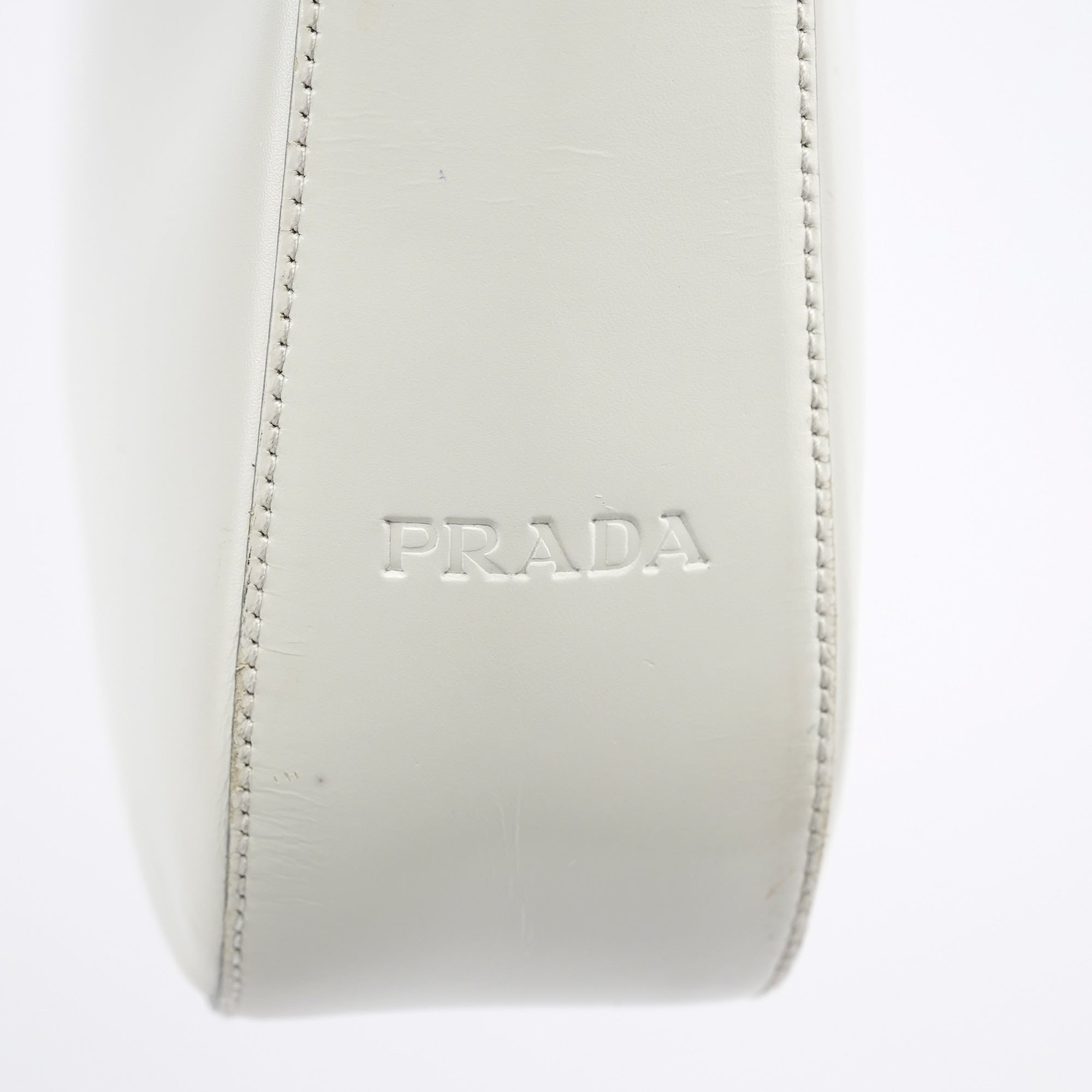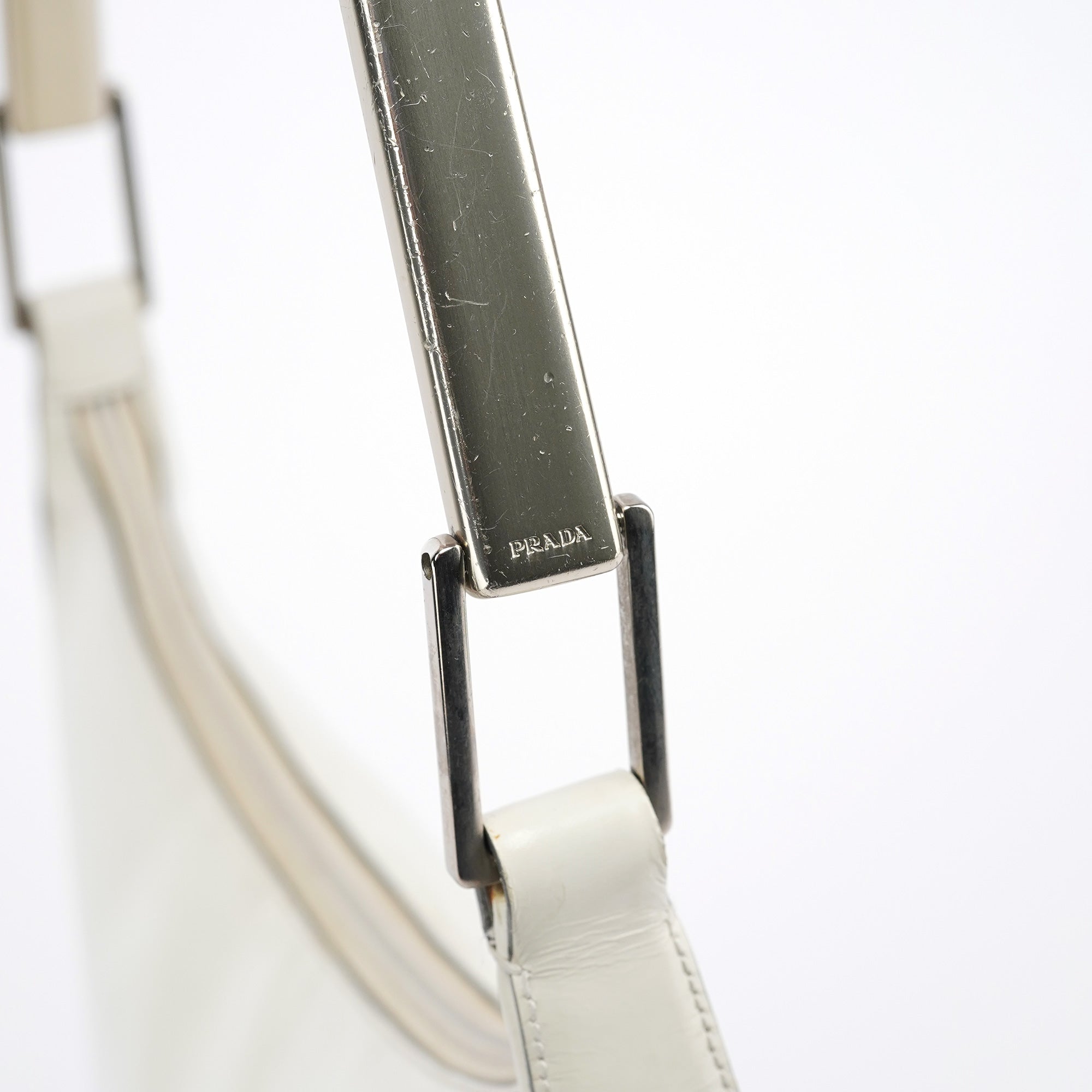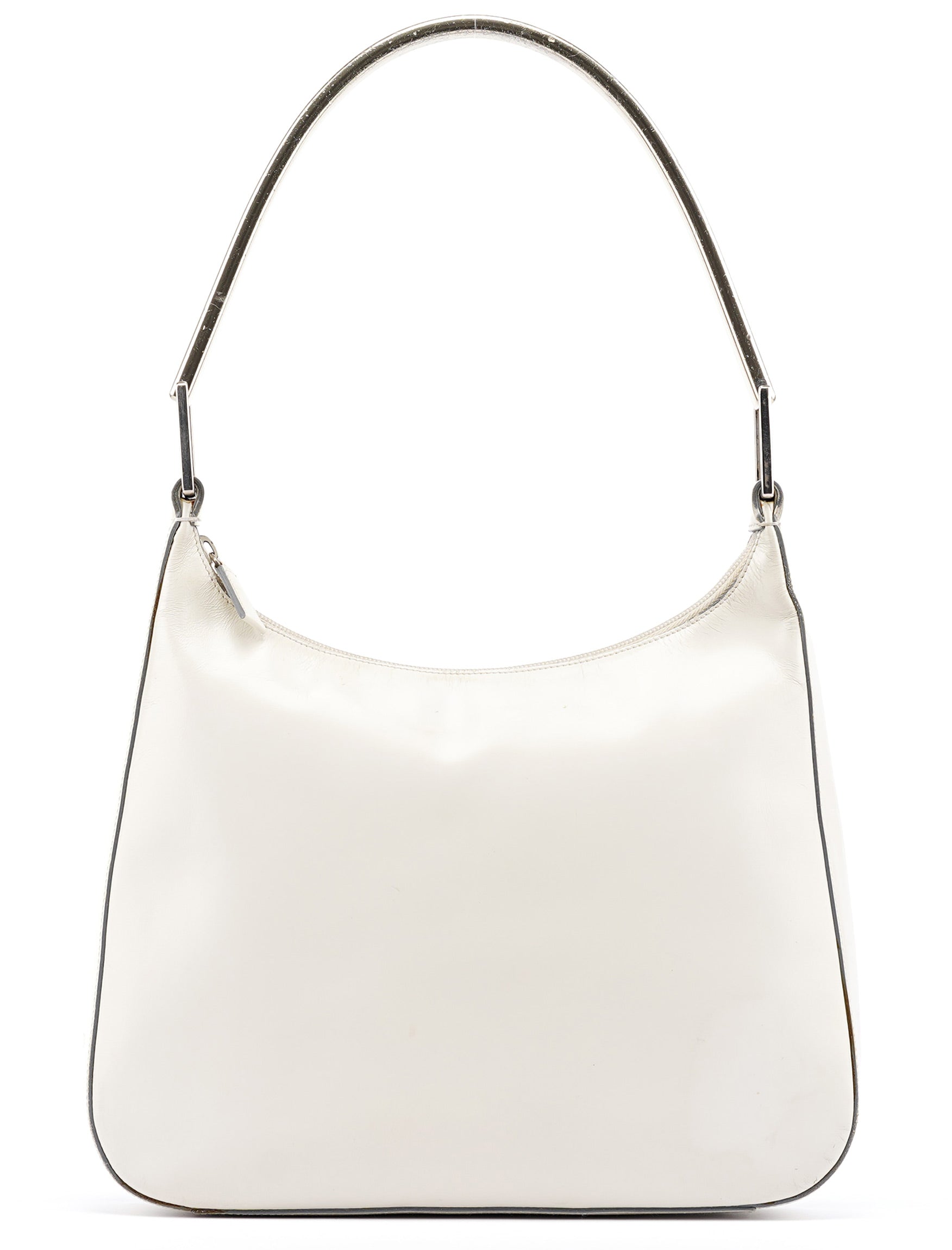 Designed for the 1998 collection by Miuccia Prada, this Prada Vitello Metal shoulder bag is crafted in smooth white calfskin leather with a sleek silhouette and embossed Prada logo on the side. It features a structured shape, stainless steel handle with Prada logo engraving, a zip closure, and a spacious interior lined in signature jacquard with a zip pocket for essentials. As featured in the 1998 campaign.