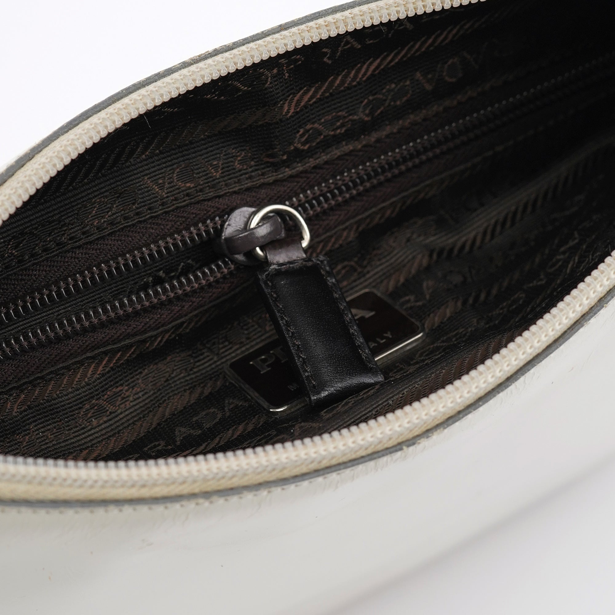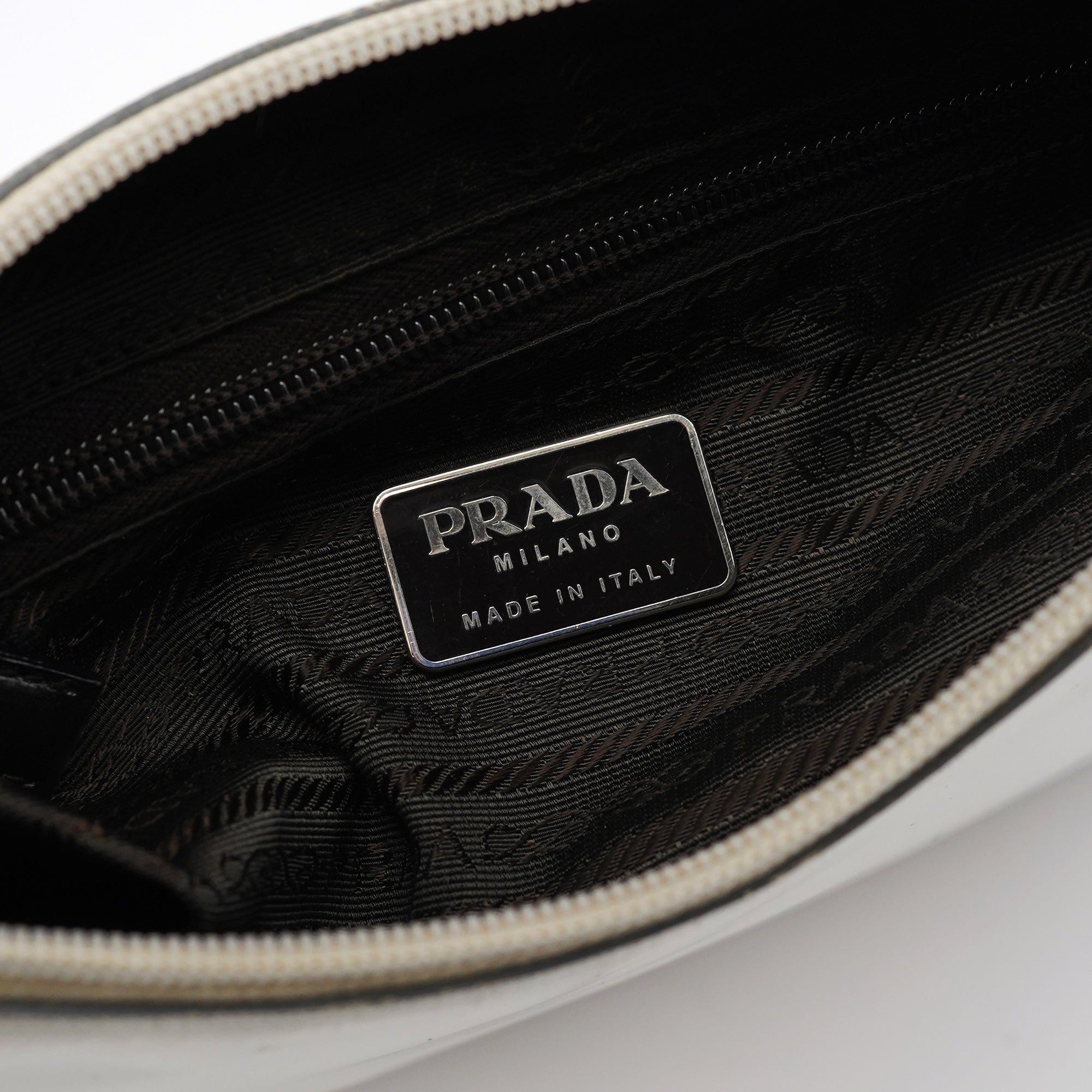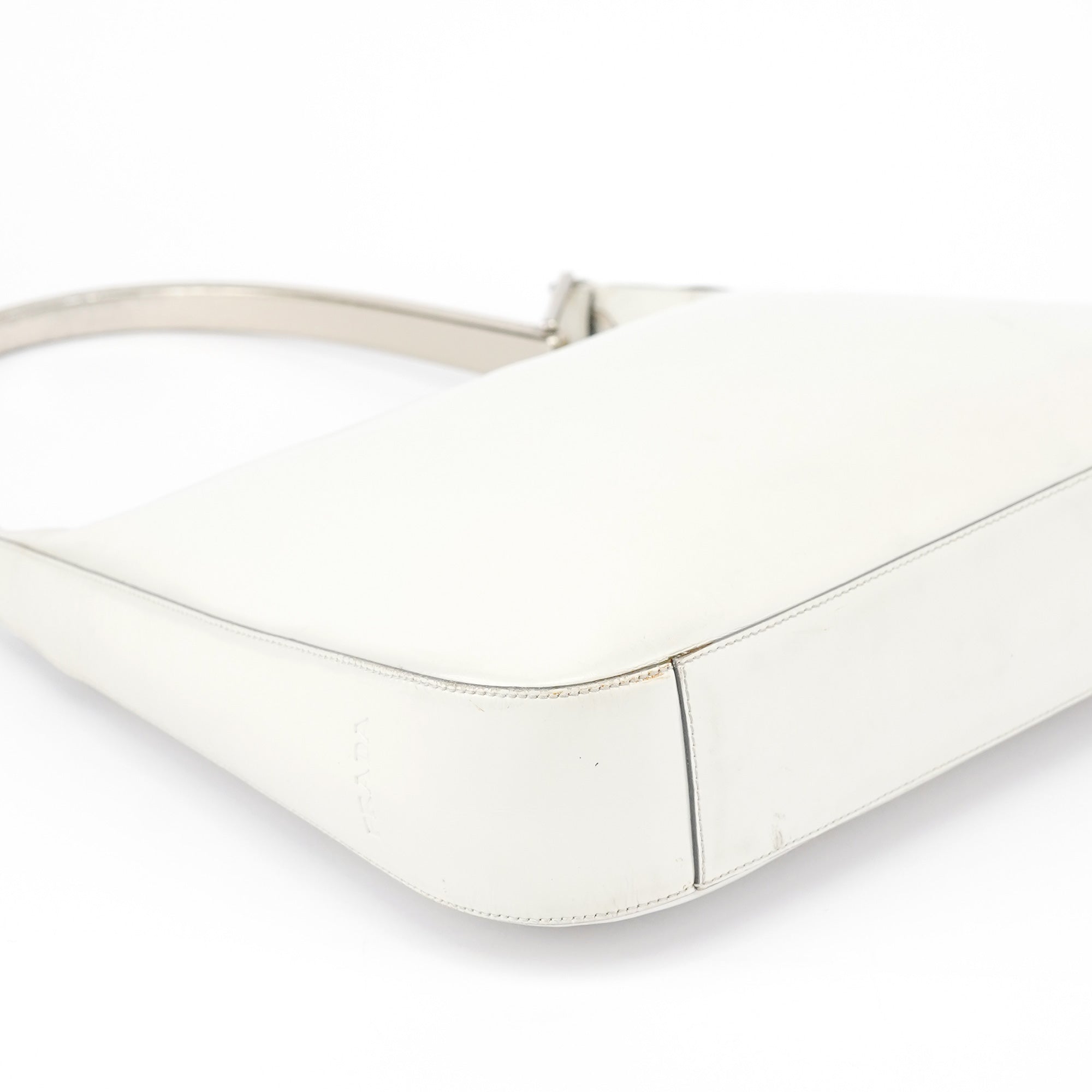 Designed for the 1998 collection by Miuccia Prada, this Prada Vitello Metal shoulder bag is crafted in smooth white calfskin leather with a sleek silhouette and embossed Prada logo on the side. It features a structured shape, stainless steel handle with Prada logo engraving, a zip closure, and a spacious interior lined in signature jacquard with a zip pocket for essentials. As featured in the 1998 campaign.