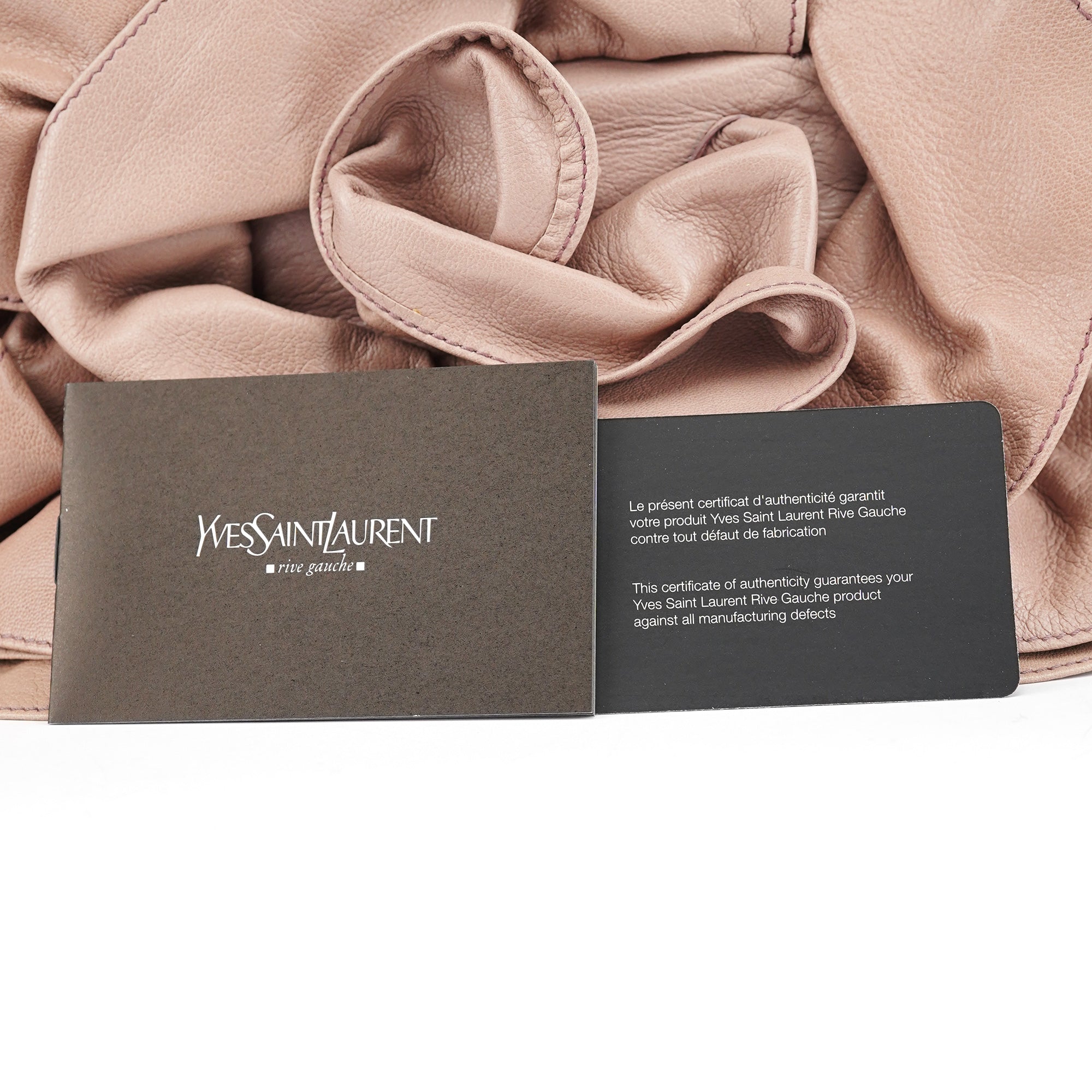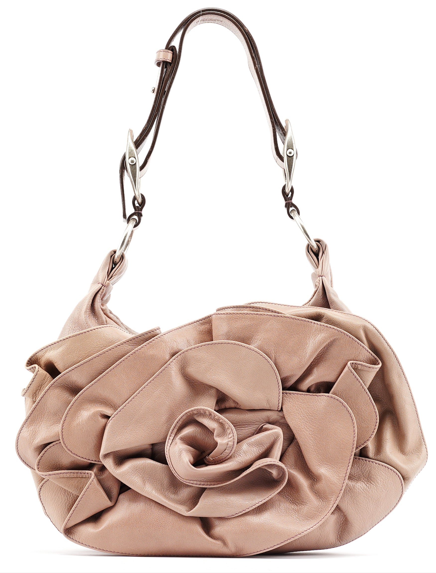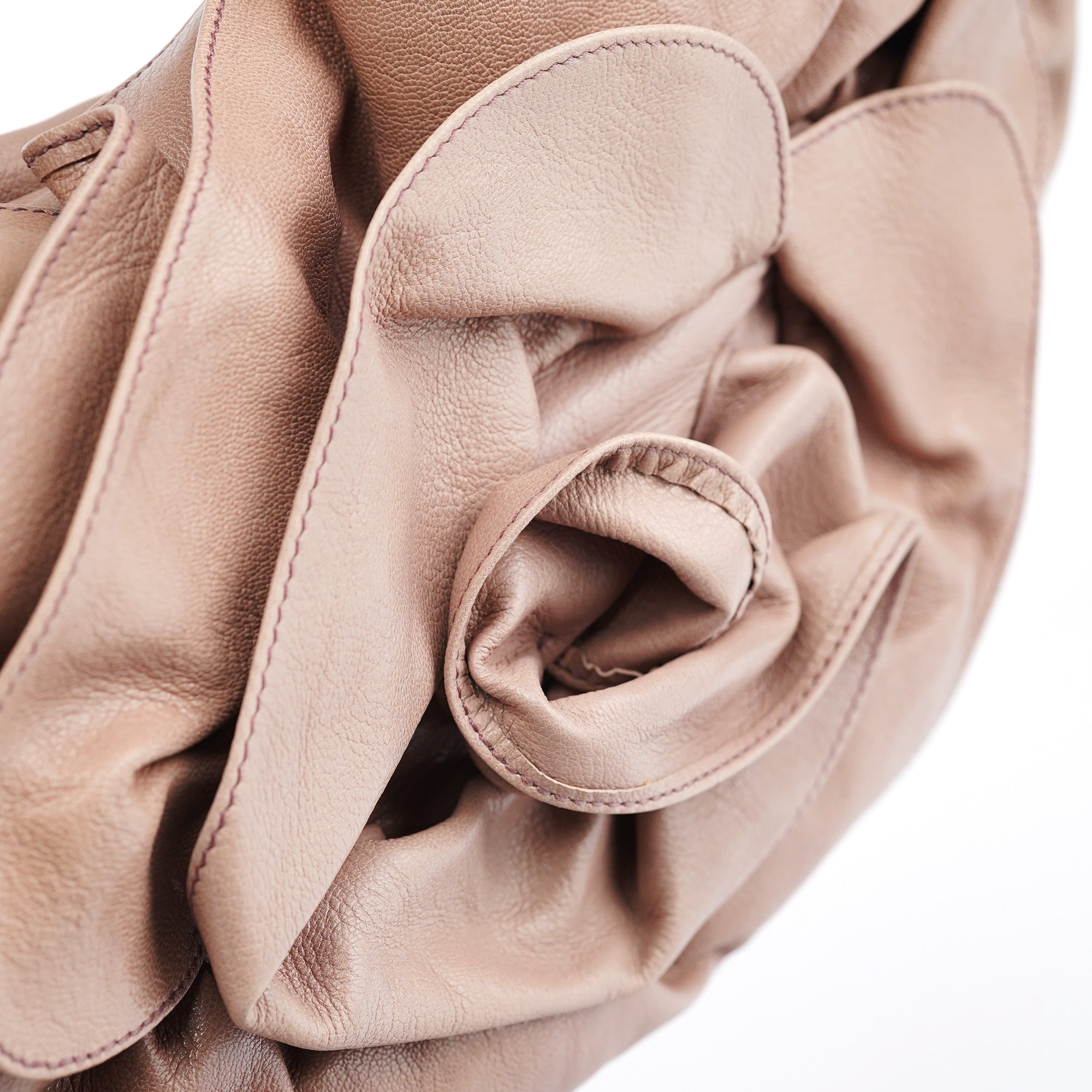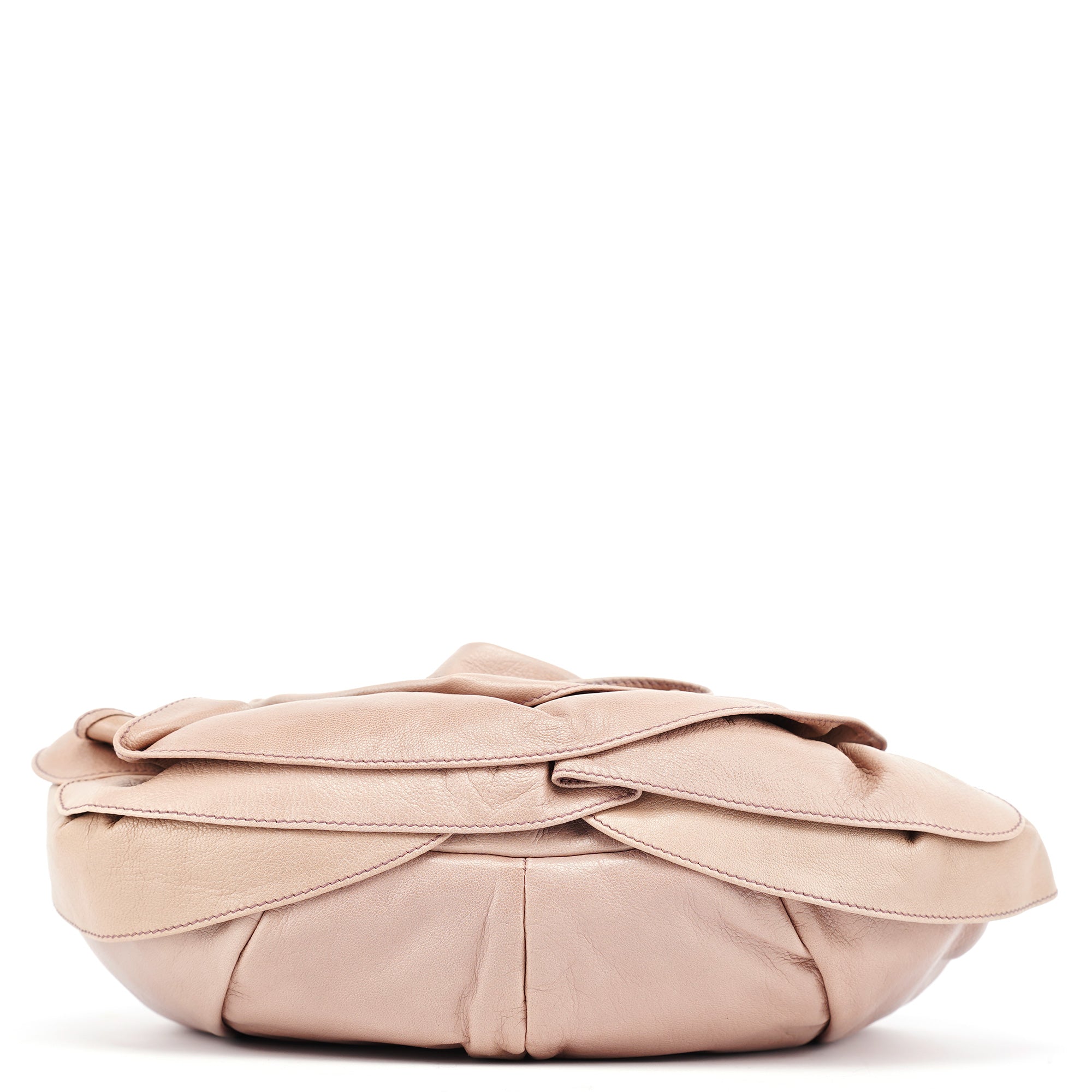 Designed in 2003 by Tom Ford, this vintage Yves Saint Laurent Nadja shoulder bag showcases the model's signature oversized rose motif in soft pink beige leather. The romantic floral appliqué creates dramatic texture across the front, while the relaxed hobo silhouette features gold-tone hardware and a comfortable shoulder strap.