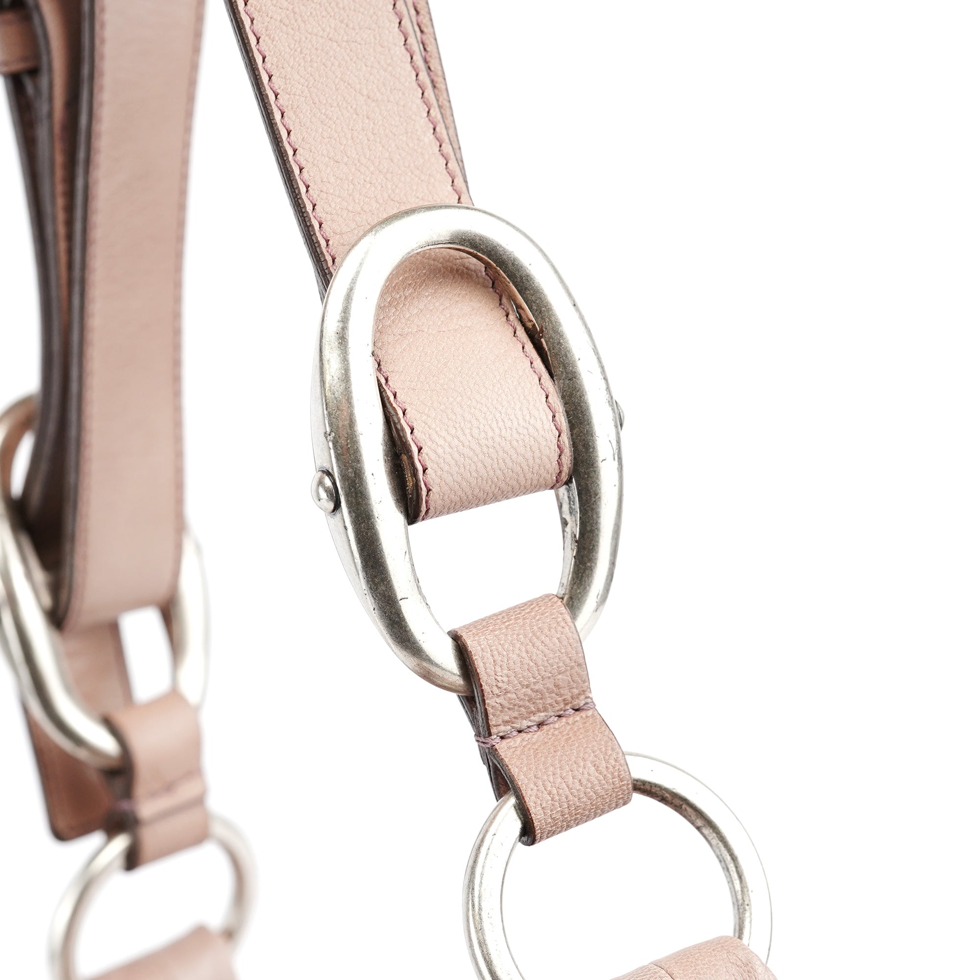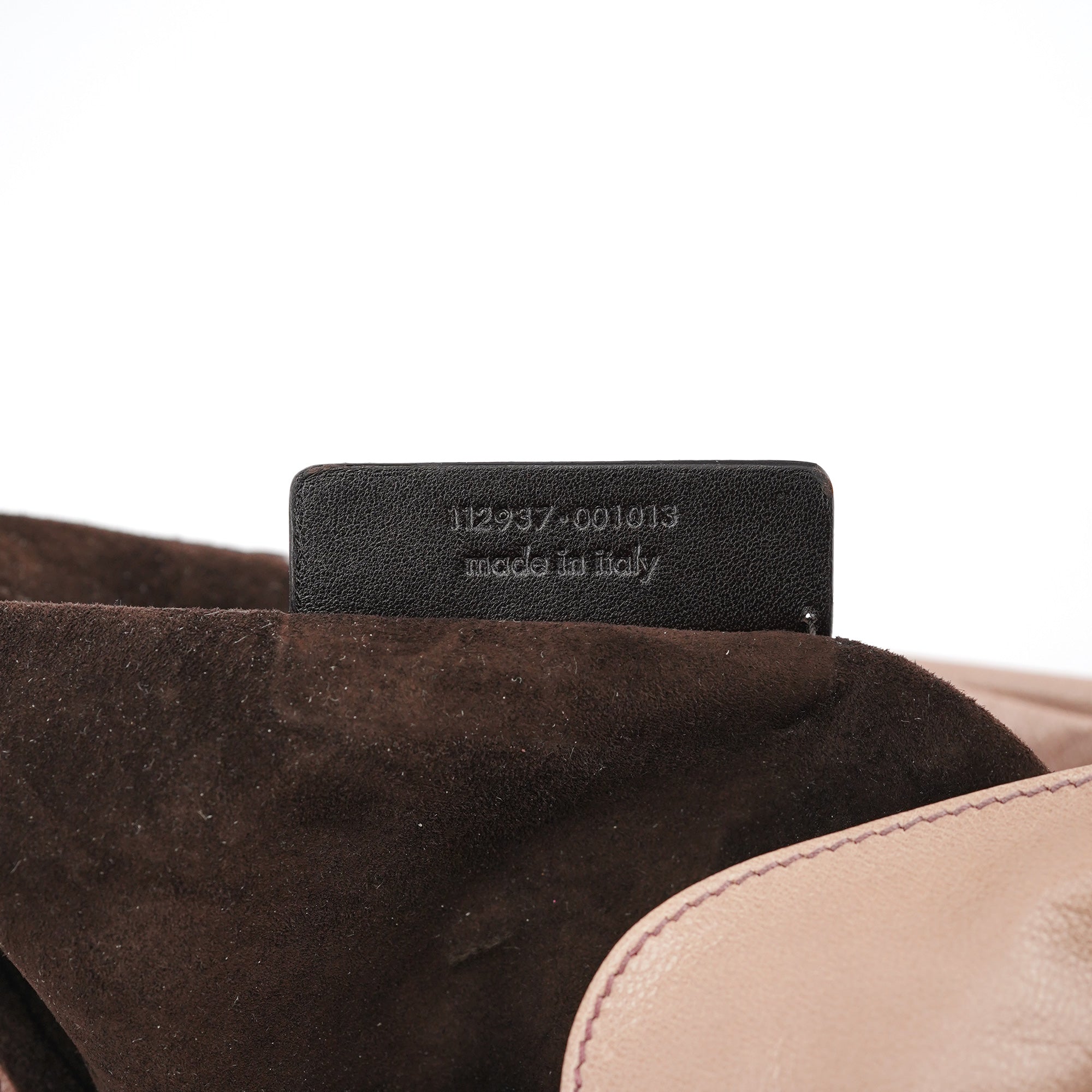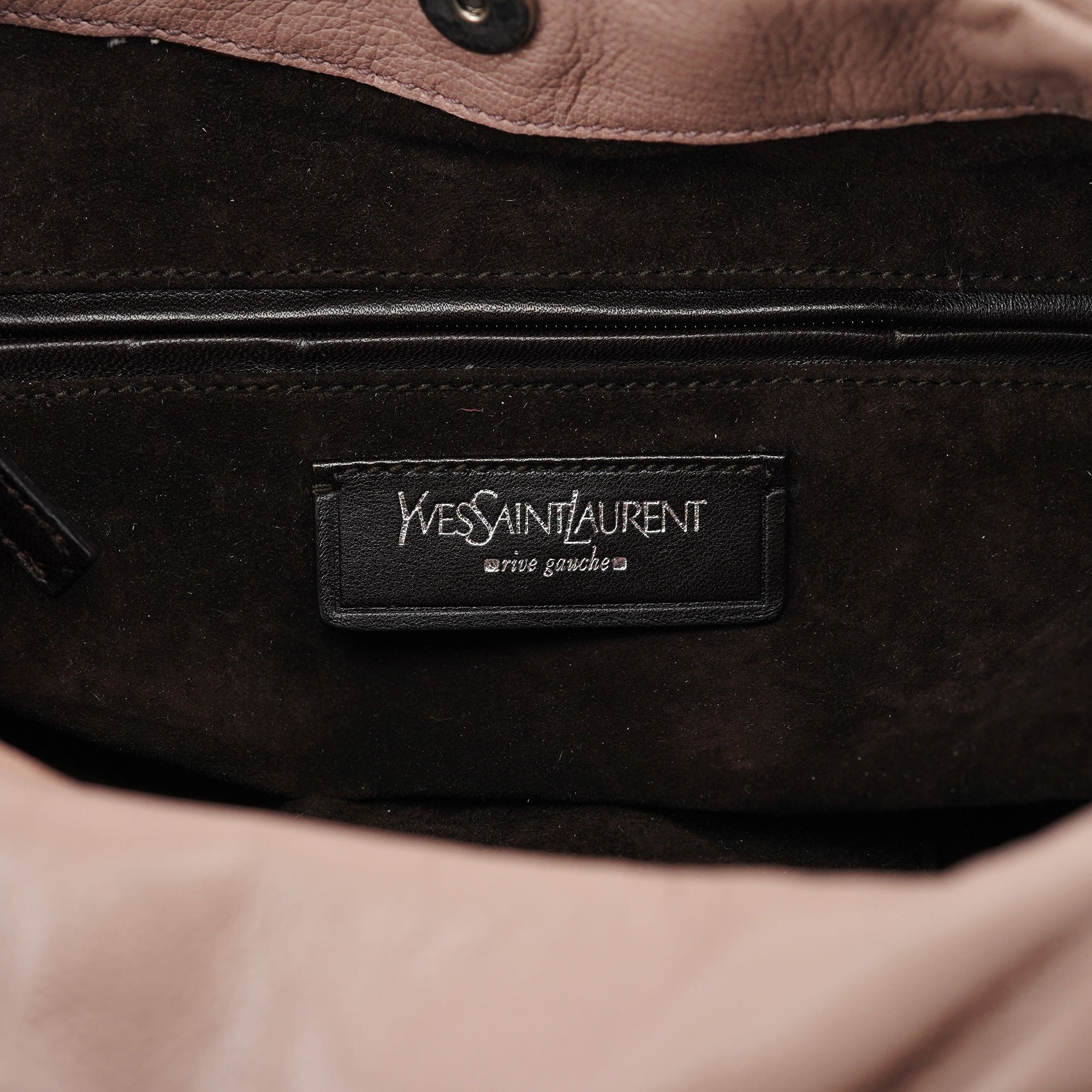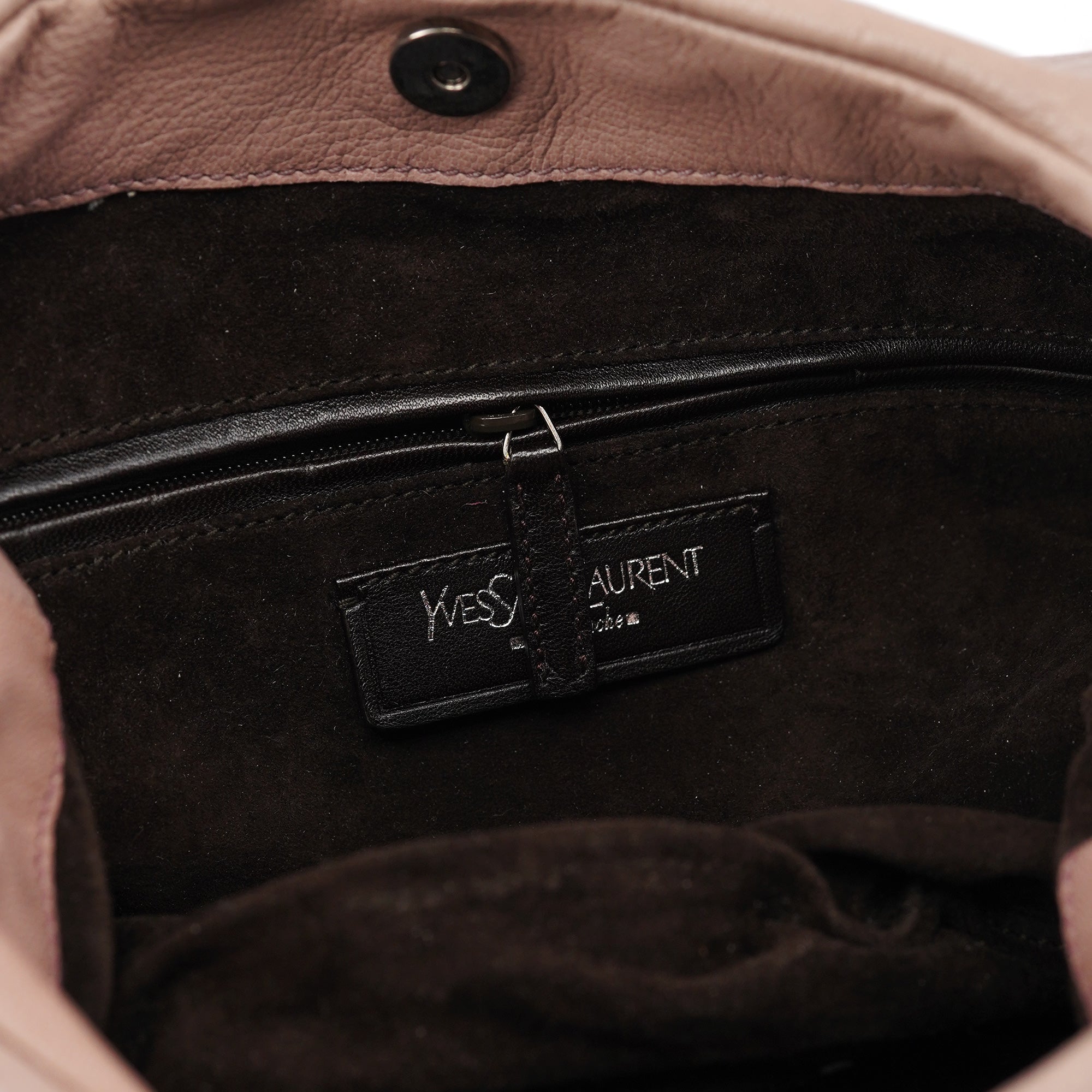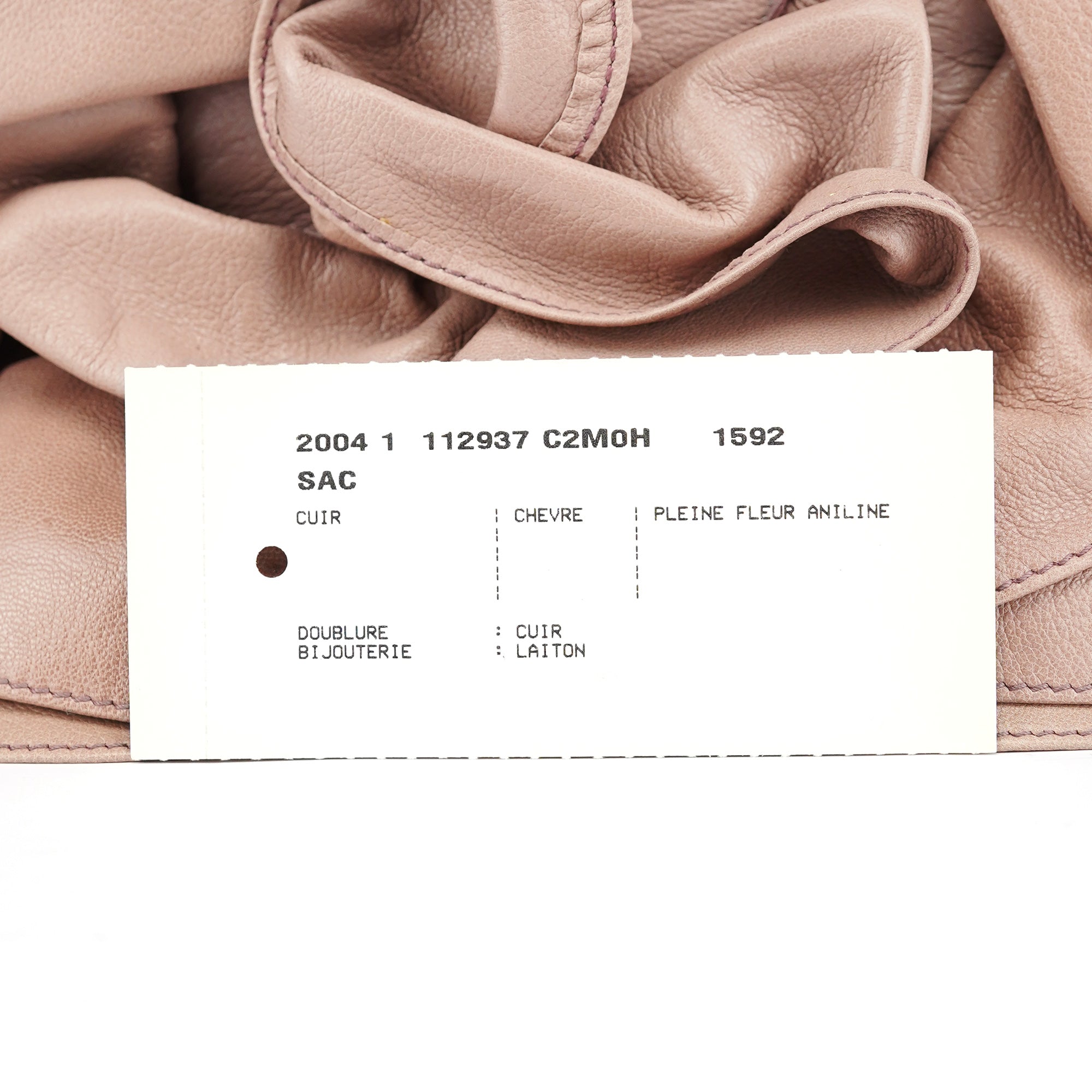 Designed in 2003 by Tom Ford, this vintage Yves Saint Laurent Nadja shoulder bag showcases the model's signature oversized rose motif in soft pink beige leather. The romantic floral appliqué creates dramatic texture across the front, while the relaxed hobo silhouette features gold-tone hardware and a comfortable shoulder strap.