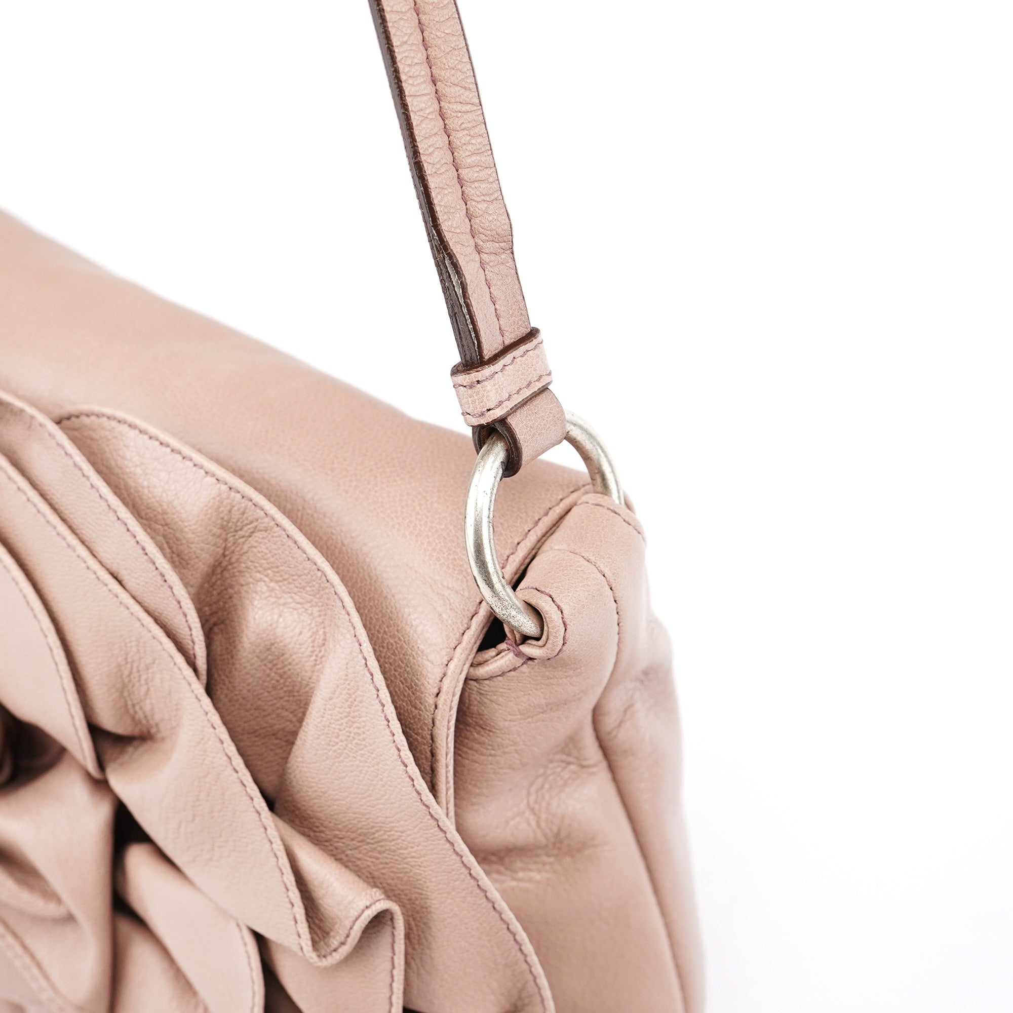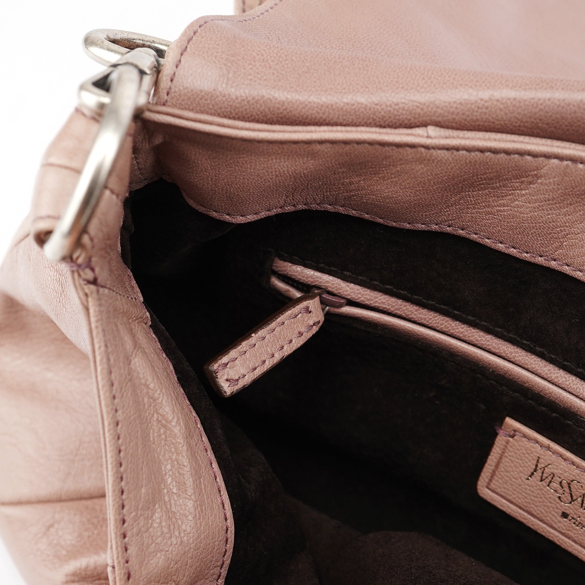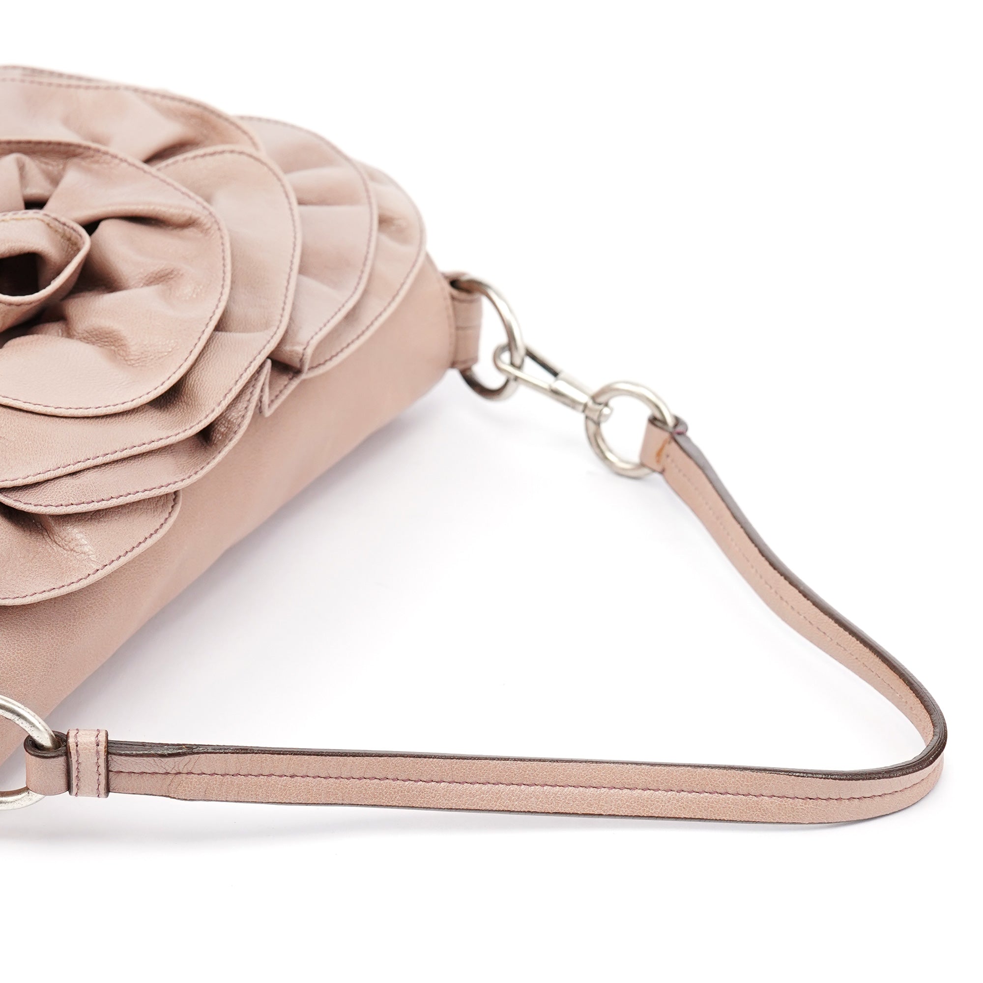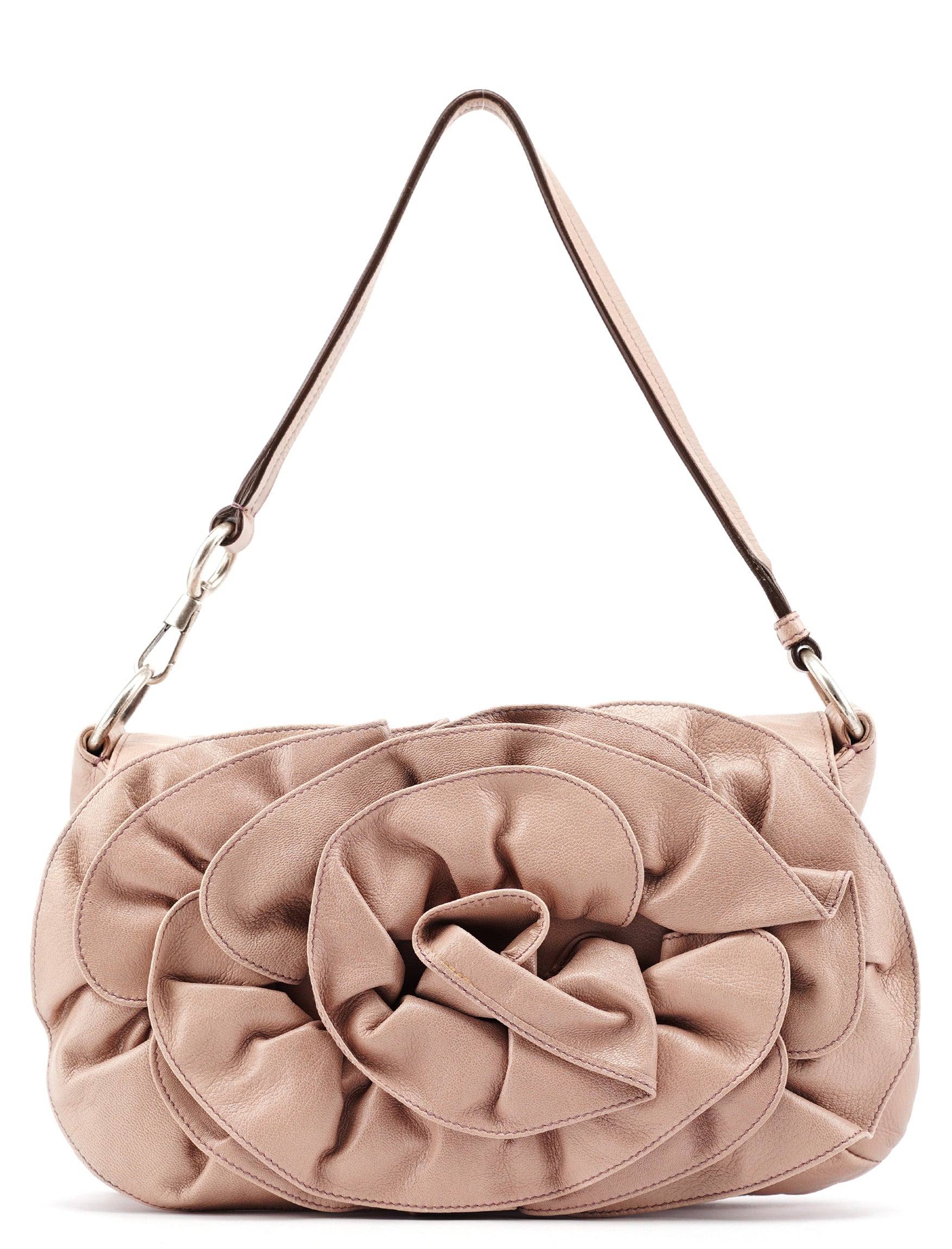 Designed in 2003 by Tom Ford, this Yves Saint Laurent Nadja shoulder bag is crafted in soft pink leather and features the collection’s signature oversized rose applique on the front. It includes a single flat shoulder strap, silver-tone hardware, and a flap closure that opens to a suede-lined interior with a zip pocket.