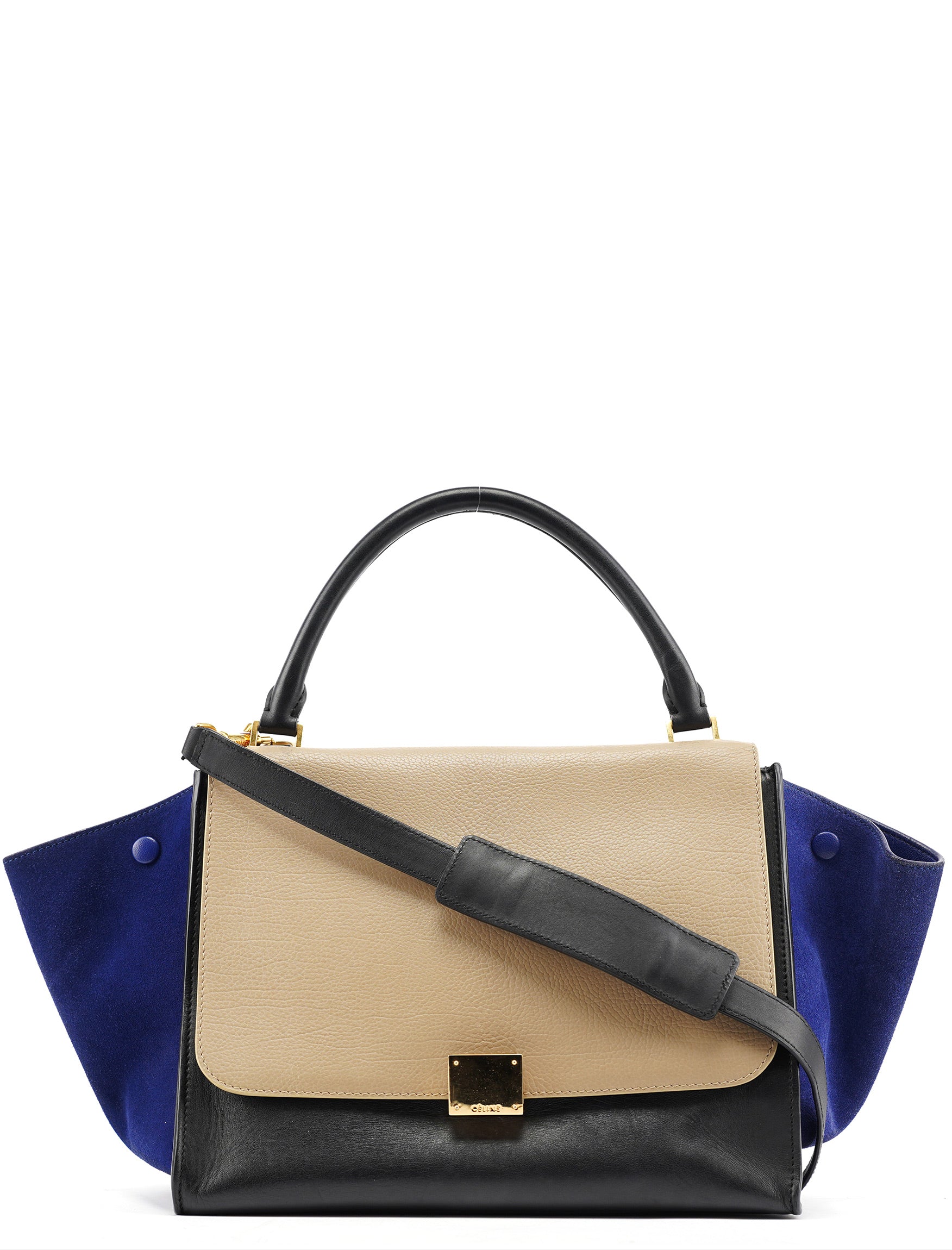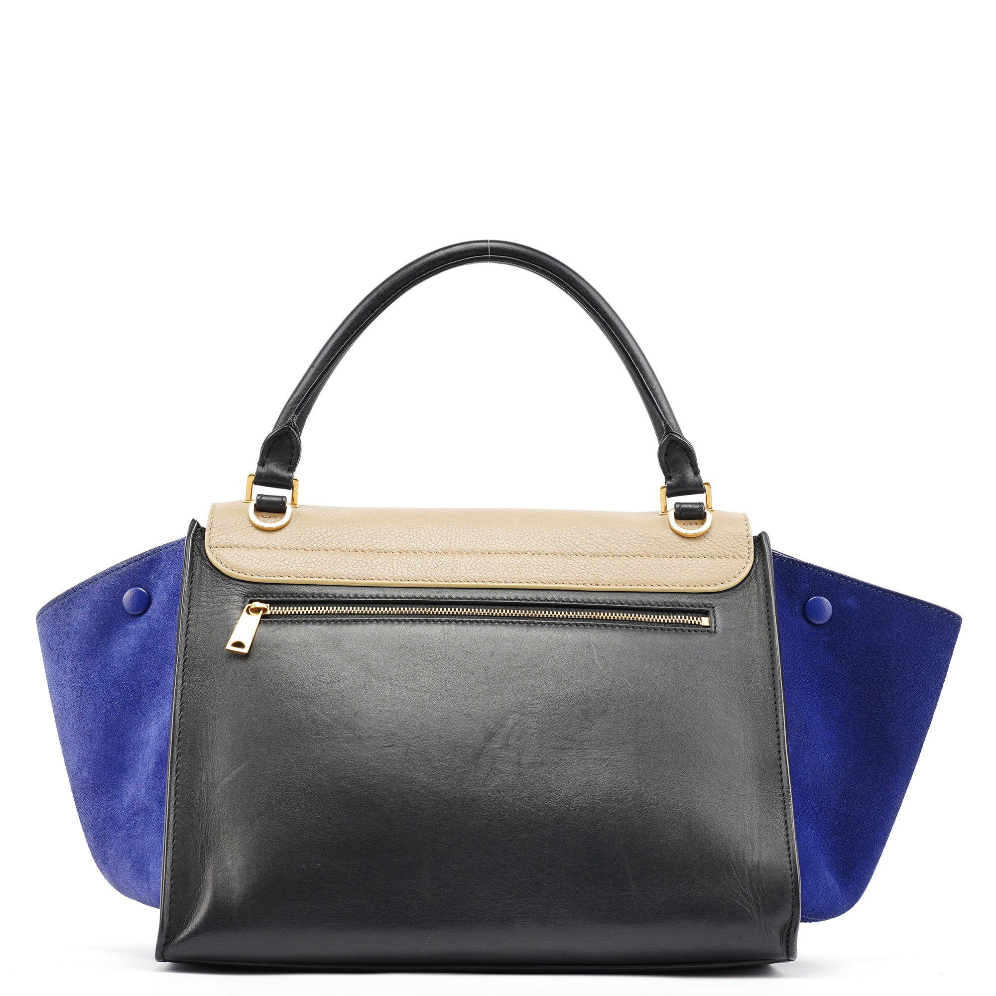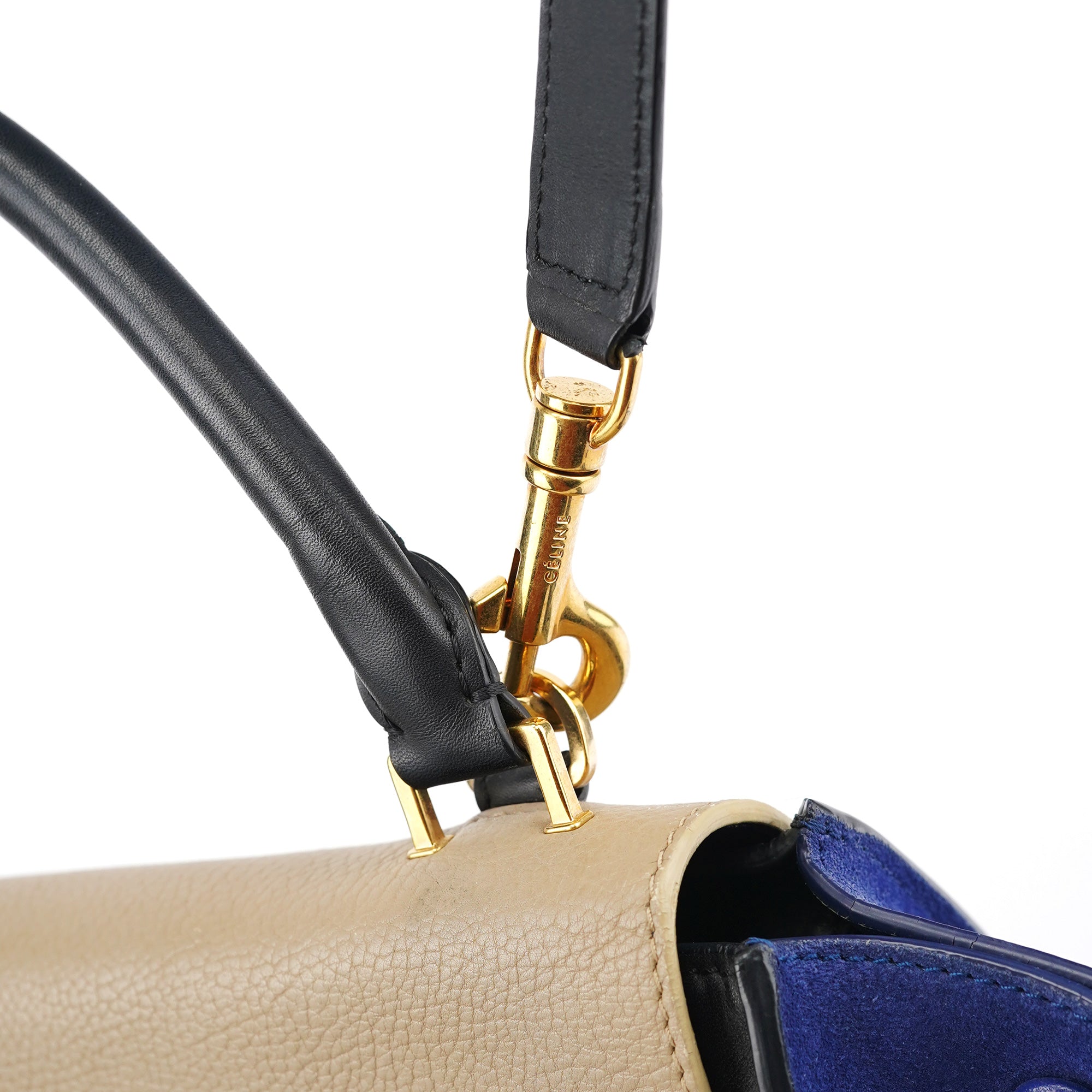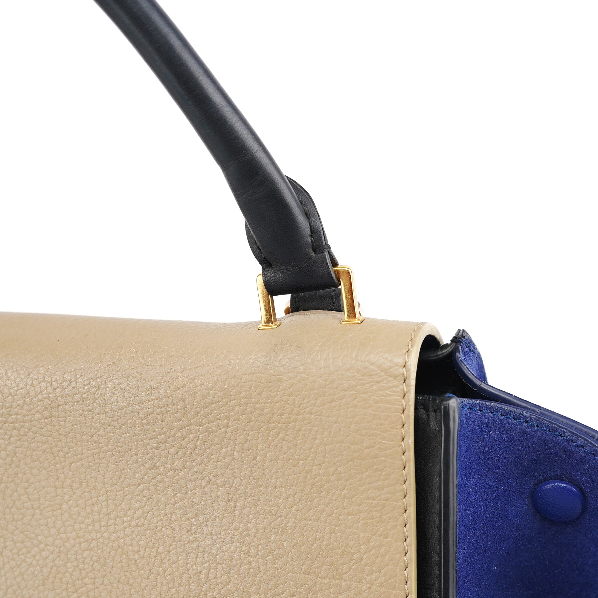 Designed in 2010 by Phoebe Philo, this vintage Céline Trapeze shoulder bag showcases the model's innovative geometric design in a sophisticated colorblock combination of beige, navy, and taupe leather. The distinctive trapezoidal wings and rectangular metal logo plaque exemplify Philo's minimalist aesthetic that transformed Céline. The structured silhouette features a fold-over flap with signature push-lock closure and includes an adjustable shoulder strap for versatile 2-way styling.