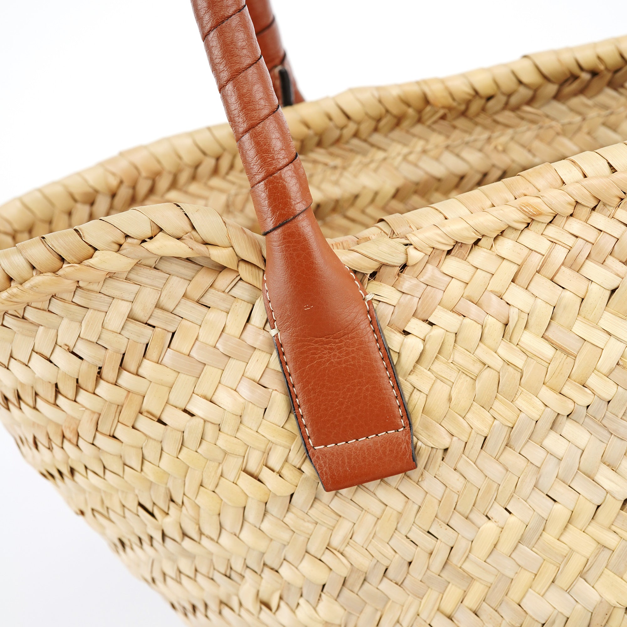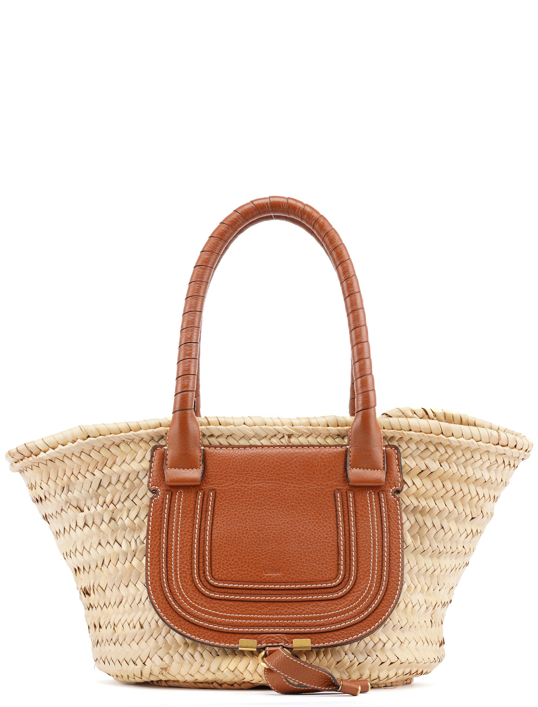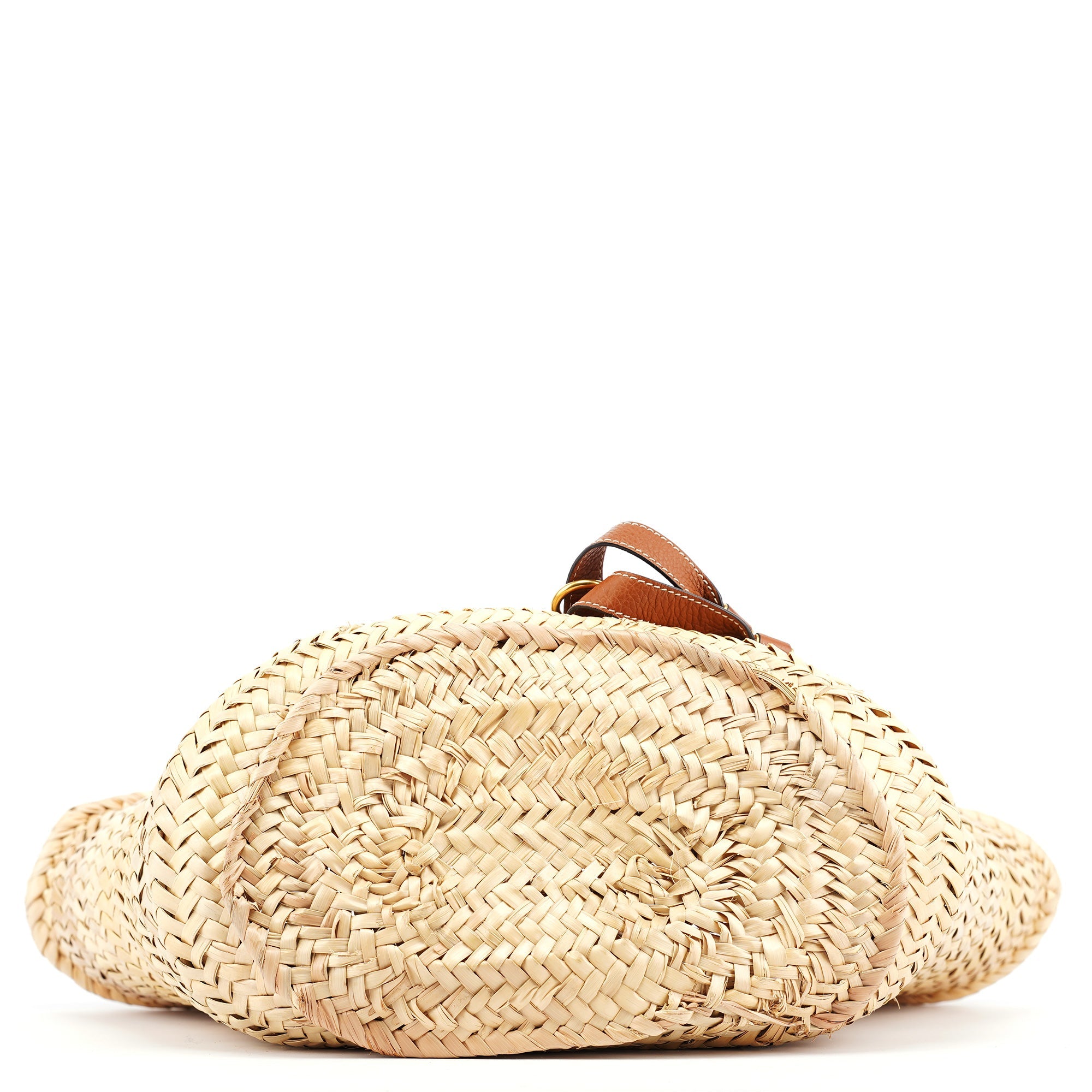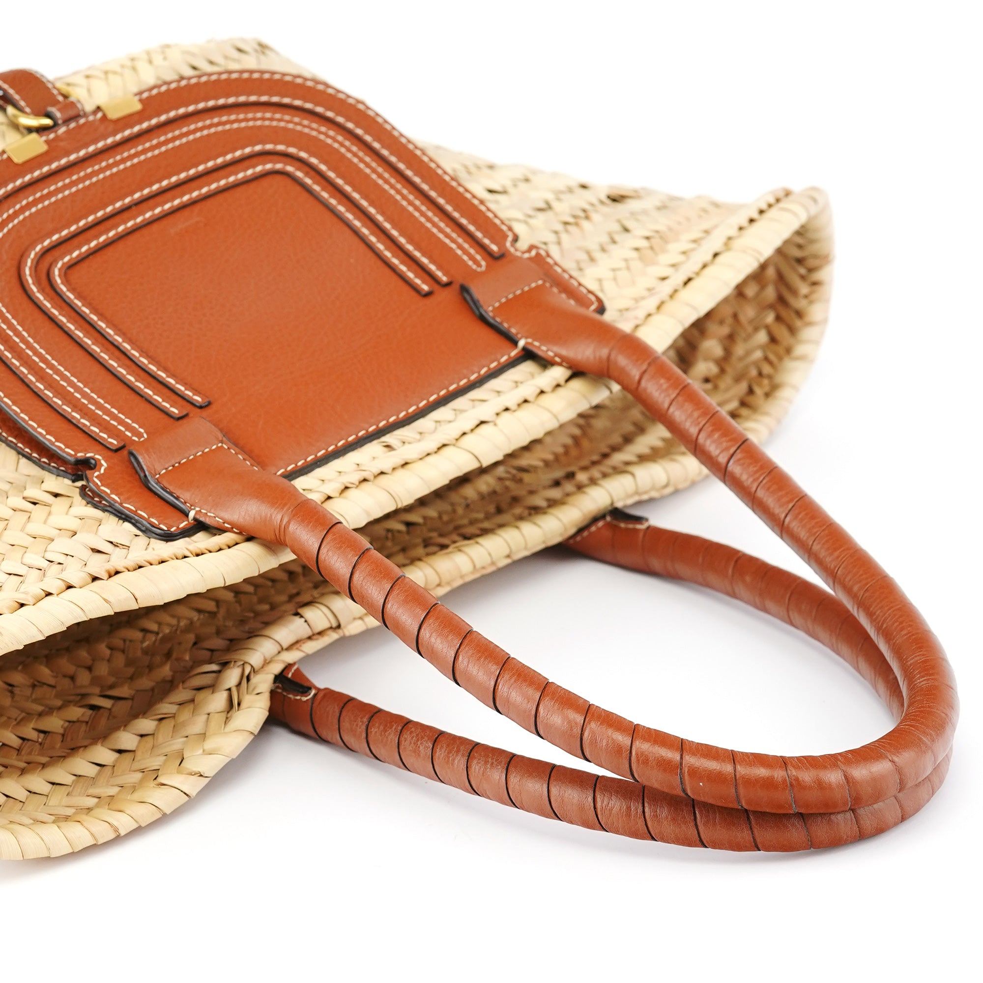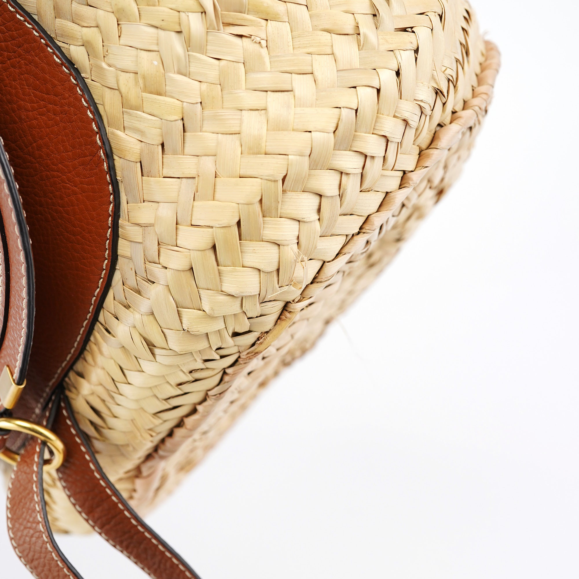 Designed in the 2010s, this vintage Chloé Raffia Marcie basket tote combines natural woven raffia with supple brown leather trim. The spacious tote silhouette features the signature Marcie front pocket with contrast white topstitching and curved saddle-inspired lines, complemented by rolled leather handles and gold-tone hardware. The mixed-media construction epitomizes Chloé's bohemian aesthetic, blending artisanal craftsmanship with Parisian sophistication.