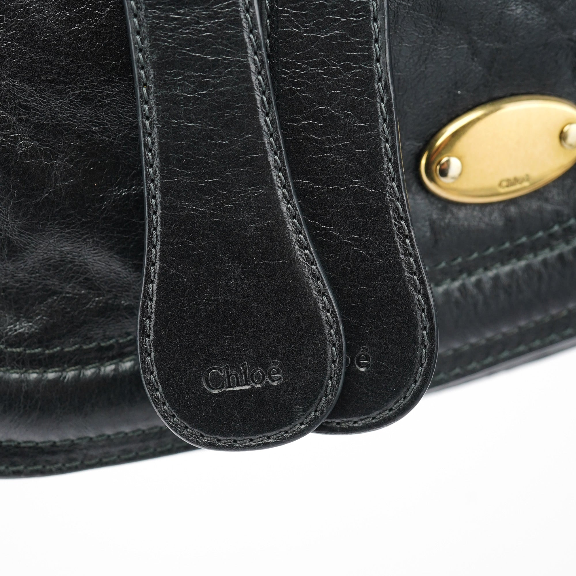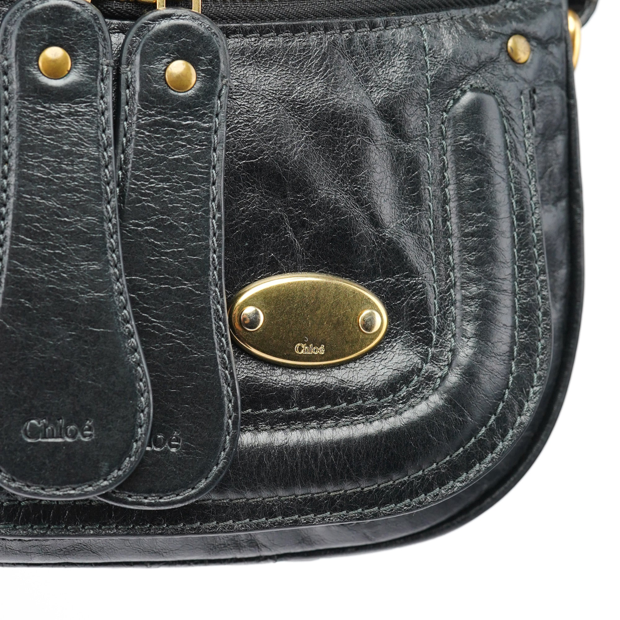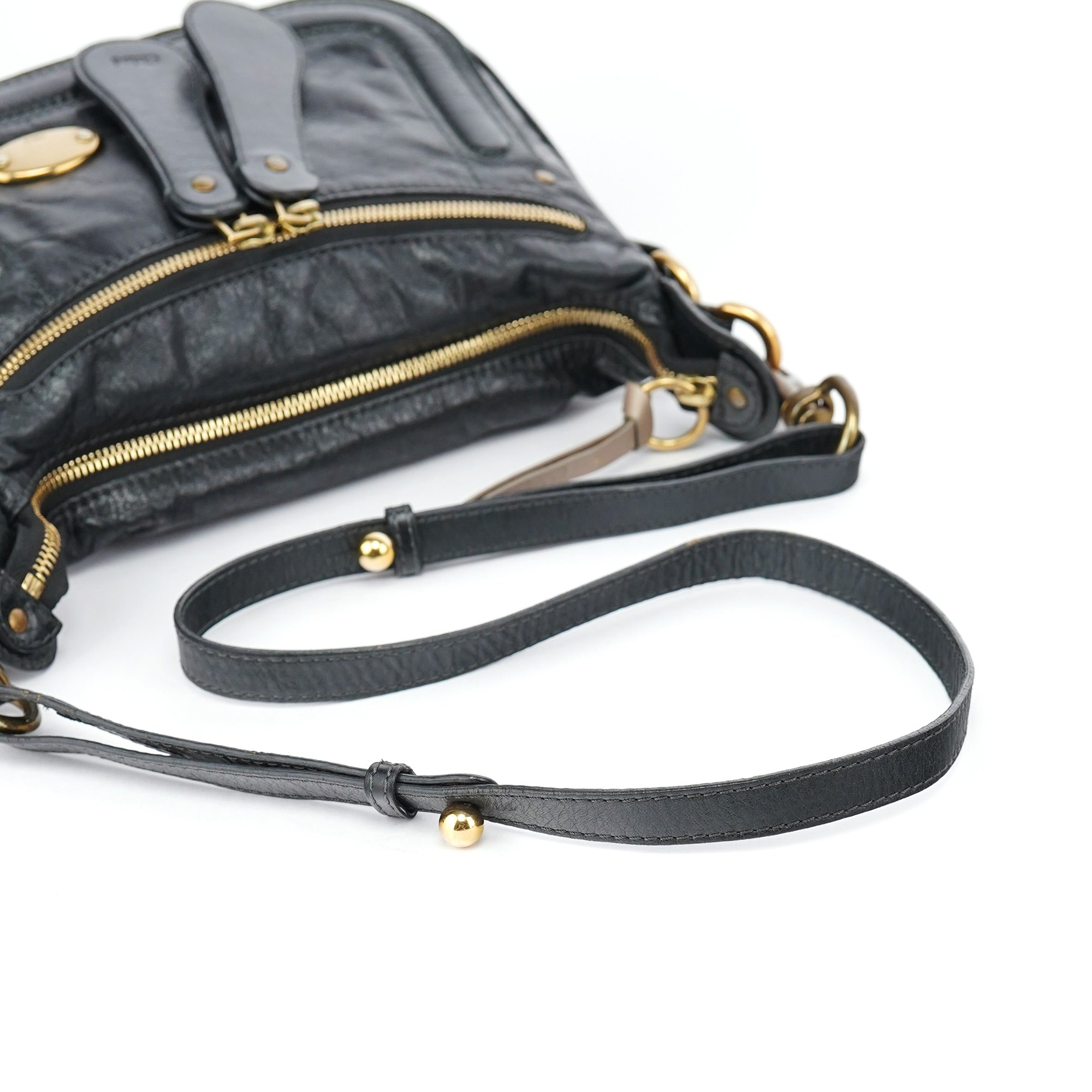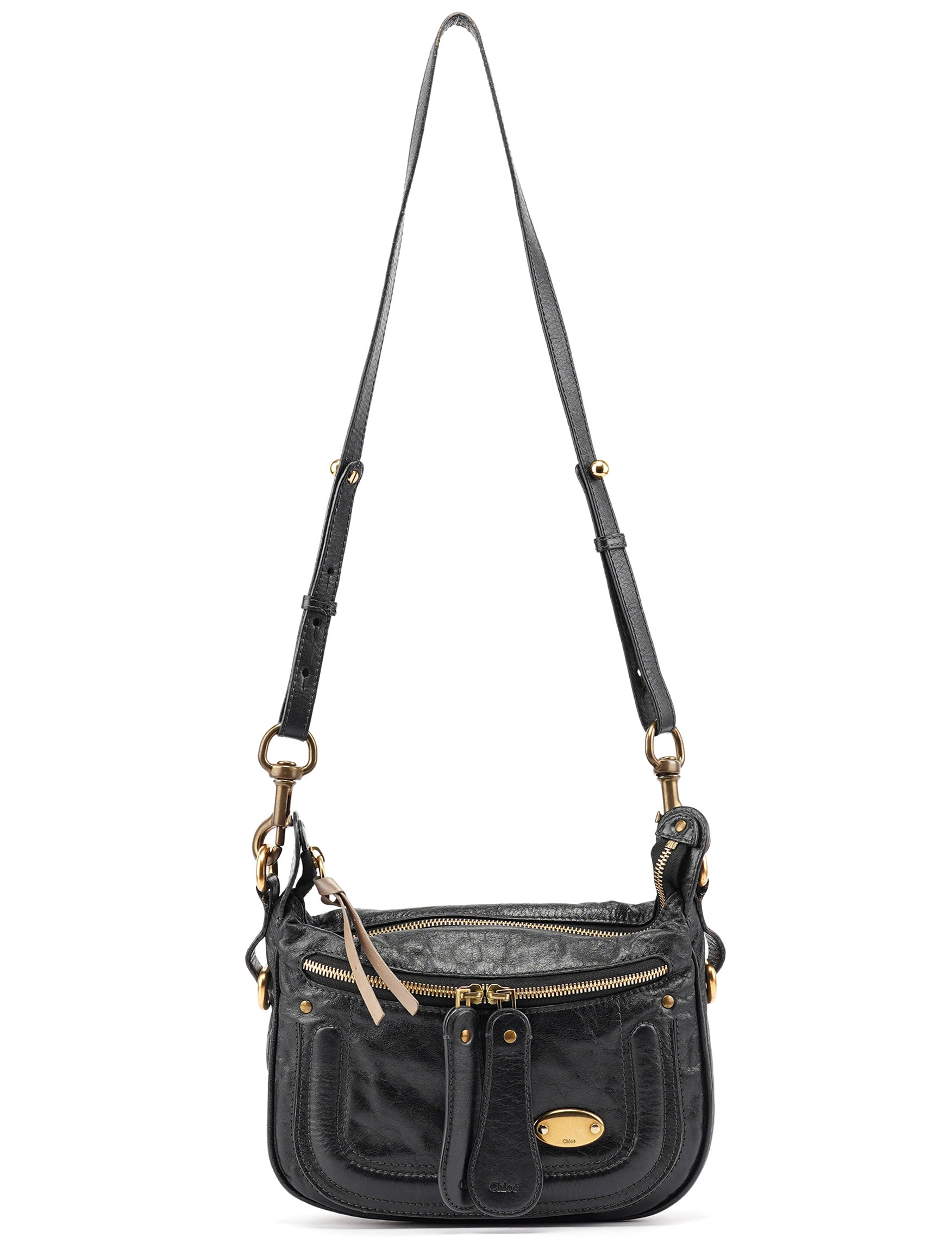 Designed in the early 2000s by Phoebe Philo, the Chloé Bay crossbody bag is crafted in supple black lambskin with tonal topstitching and signature gold oval hardware. This crossbody silhouette features a zippered top, oversized front pocket with dual vertical straps, and an adjustable shoulder strap. The spacious interior is lined in fabric and fitted with a slip pocket and zip compartment.
