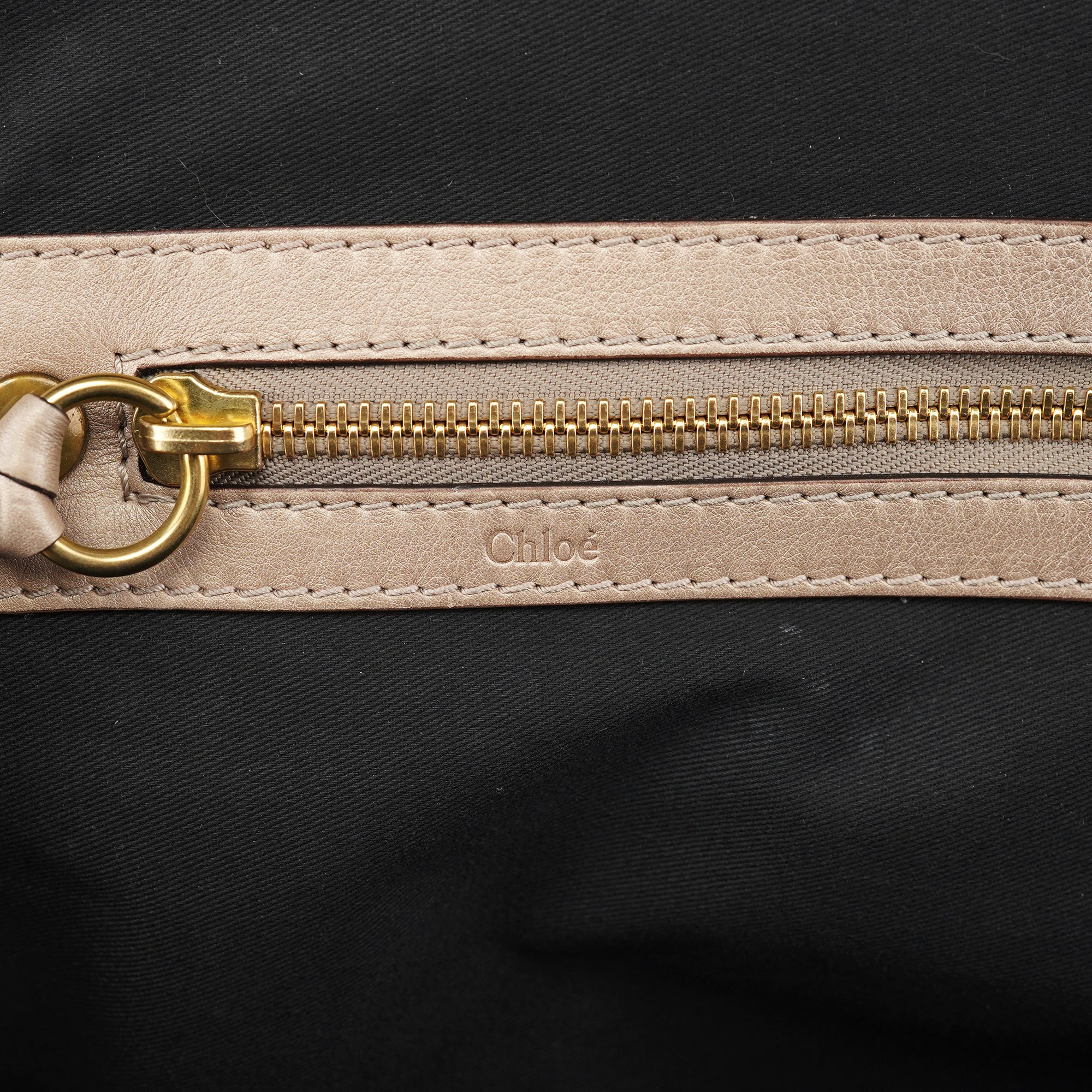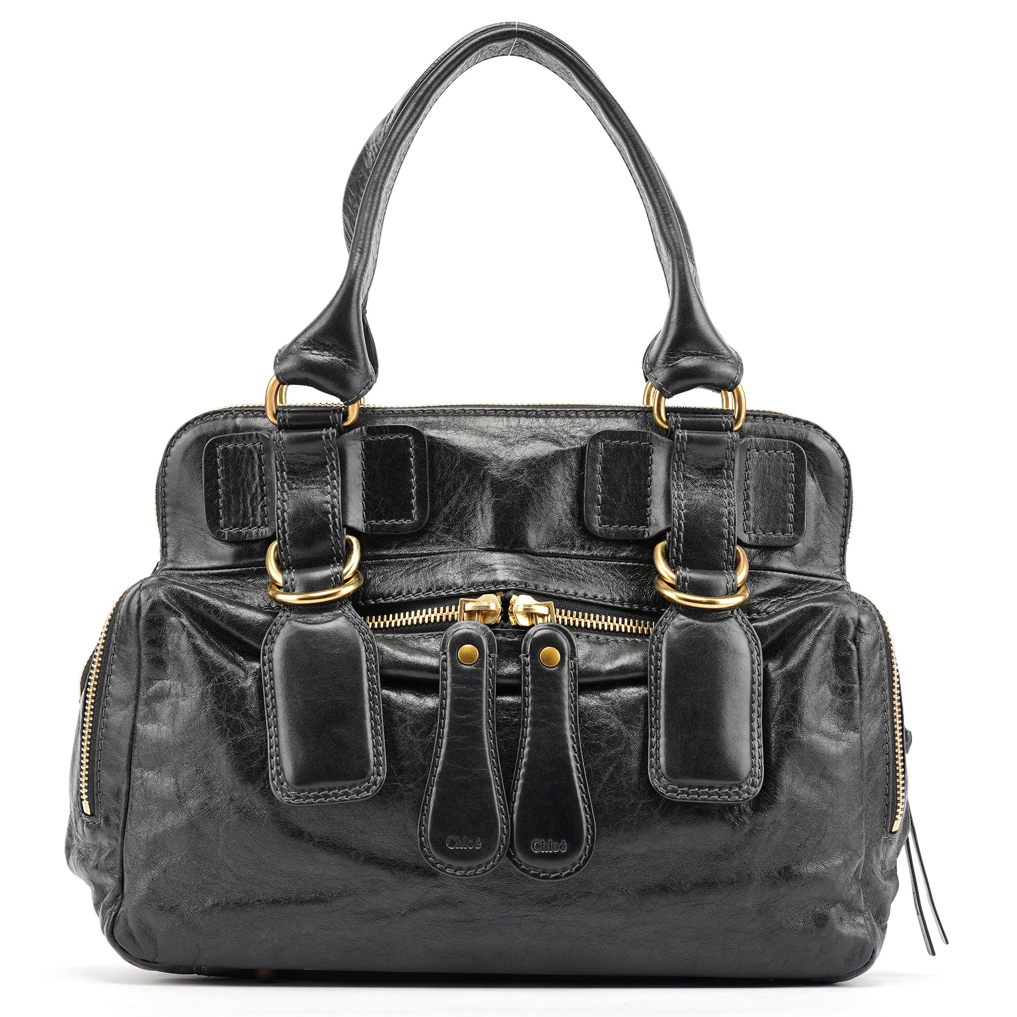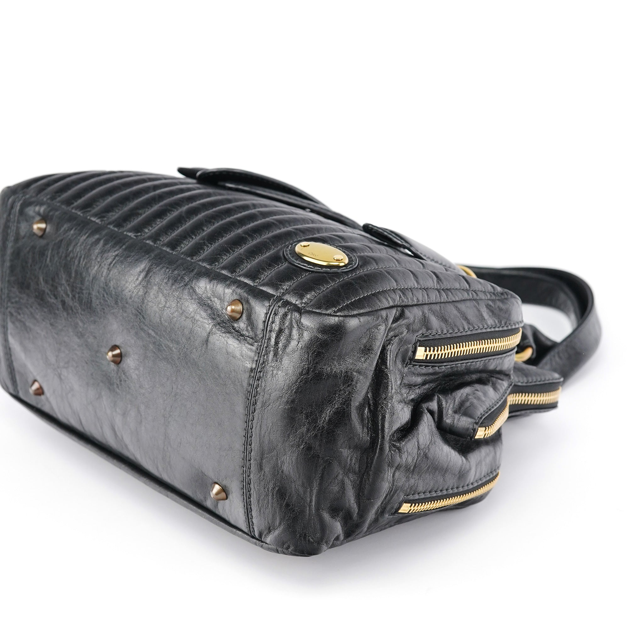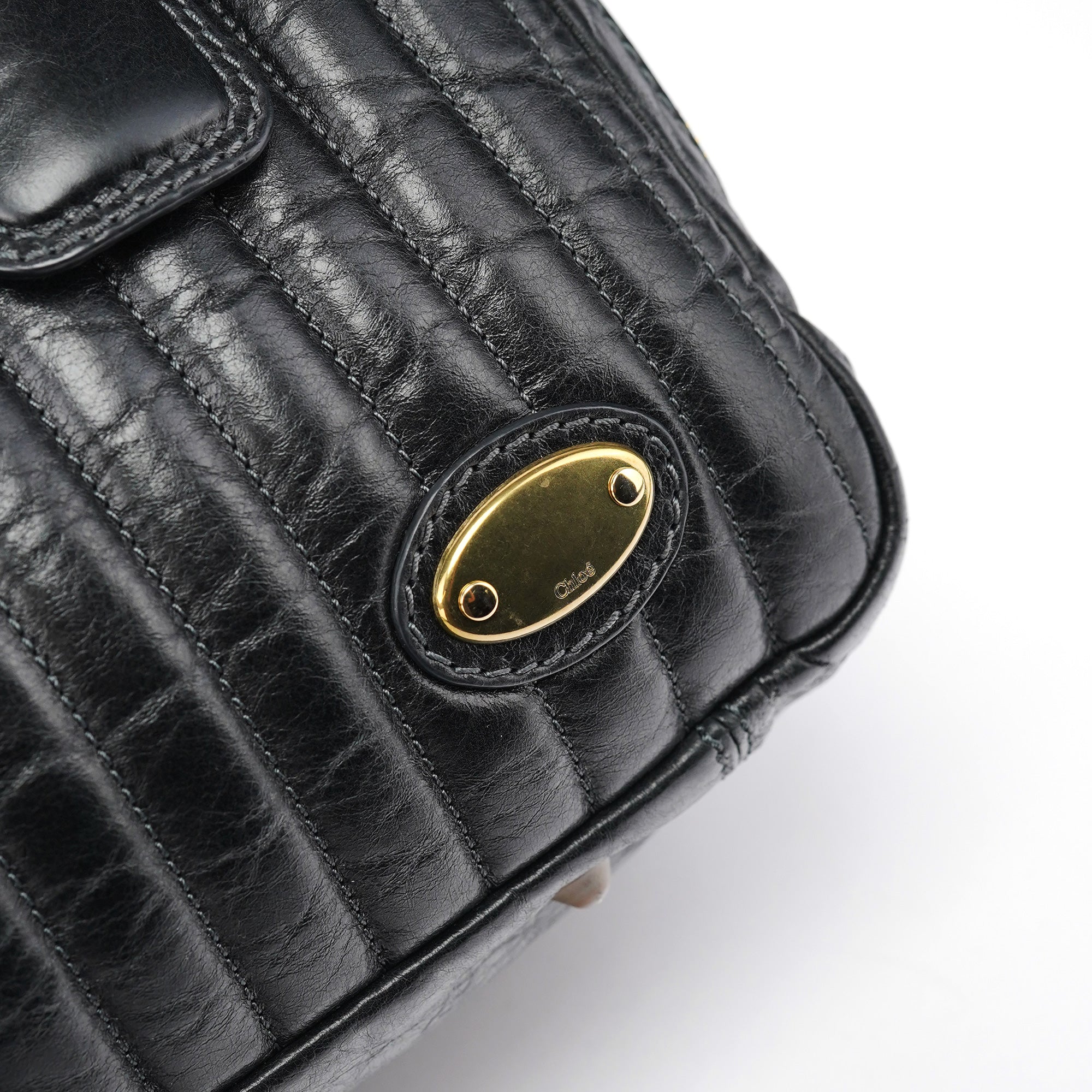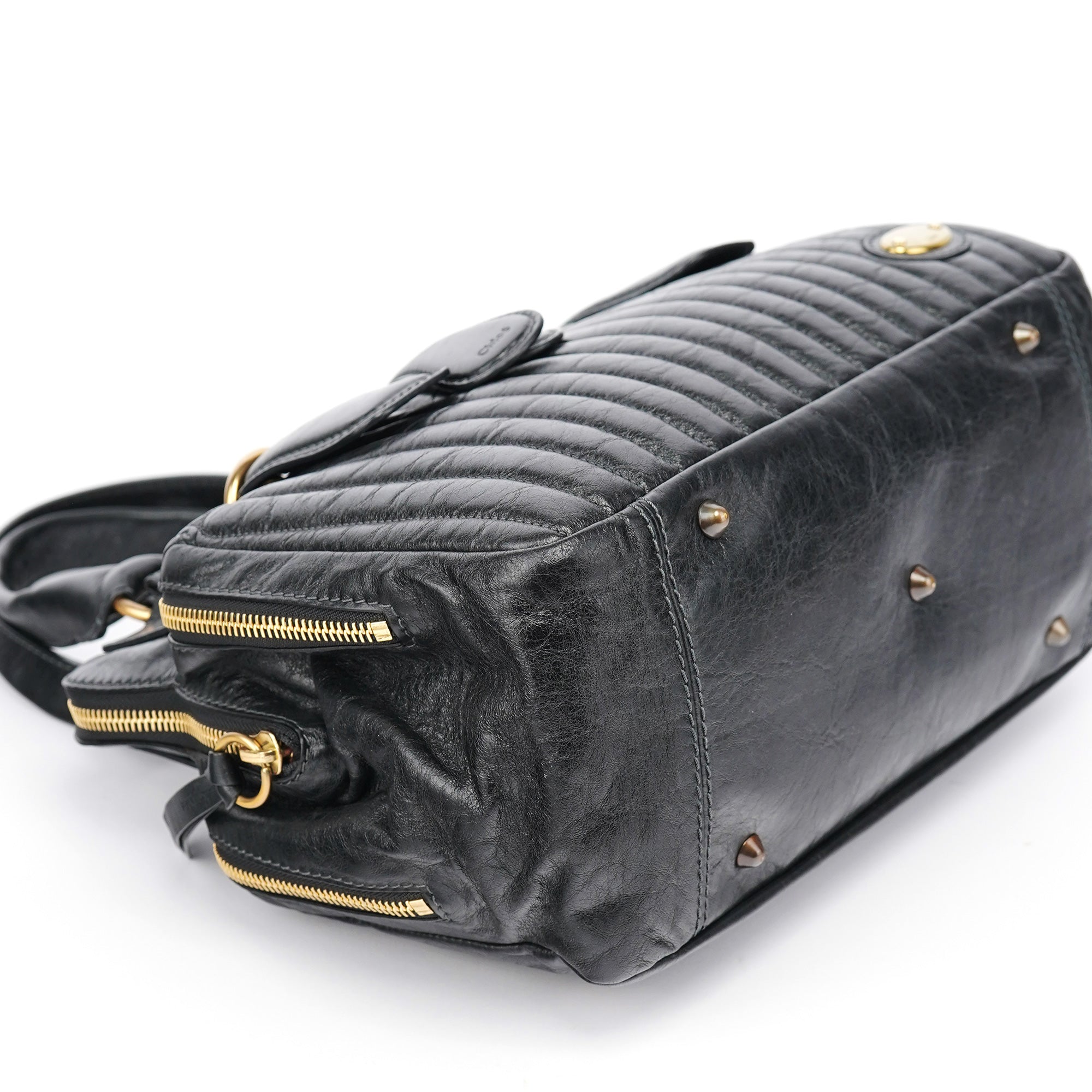 Designed in the early 2000s by Phoebe Philo, this vintage Chloé Bay showcases the model's distinctive quilted leather construction and multiple exterior pockets that made it a sought-after style. Crafted in black glazed leather with a high-shine finish, the bag features gold-tone hardware including decorative rings and multiple zipper closures, dual top handles, and the architectural pocket detailing that defines the Bay's utilitarian-luxe aesthetic.