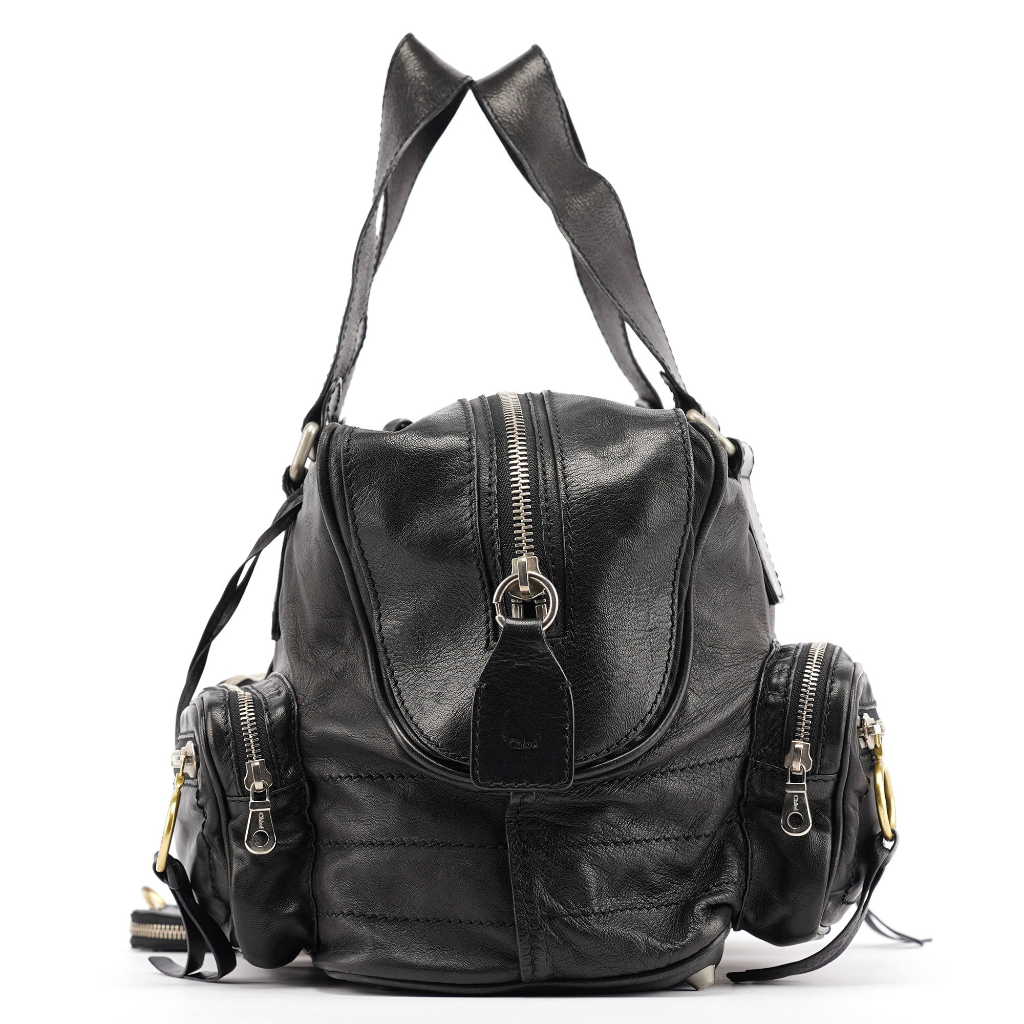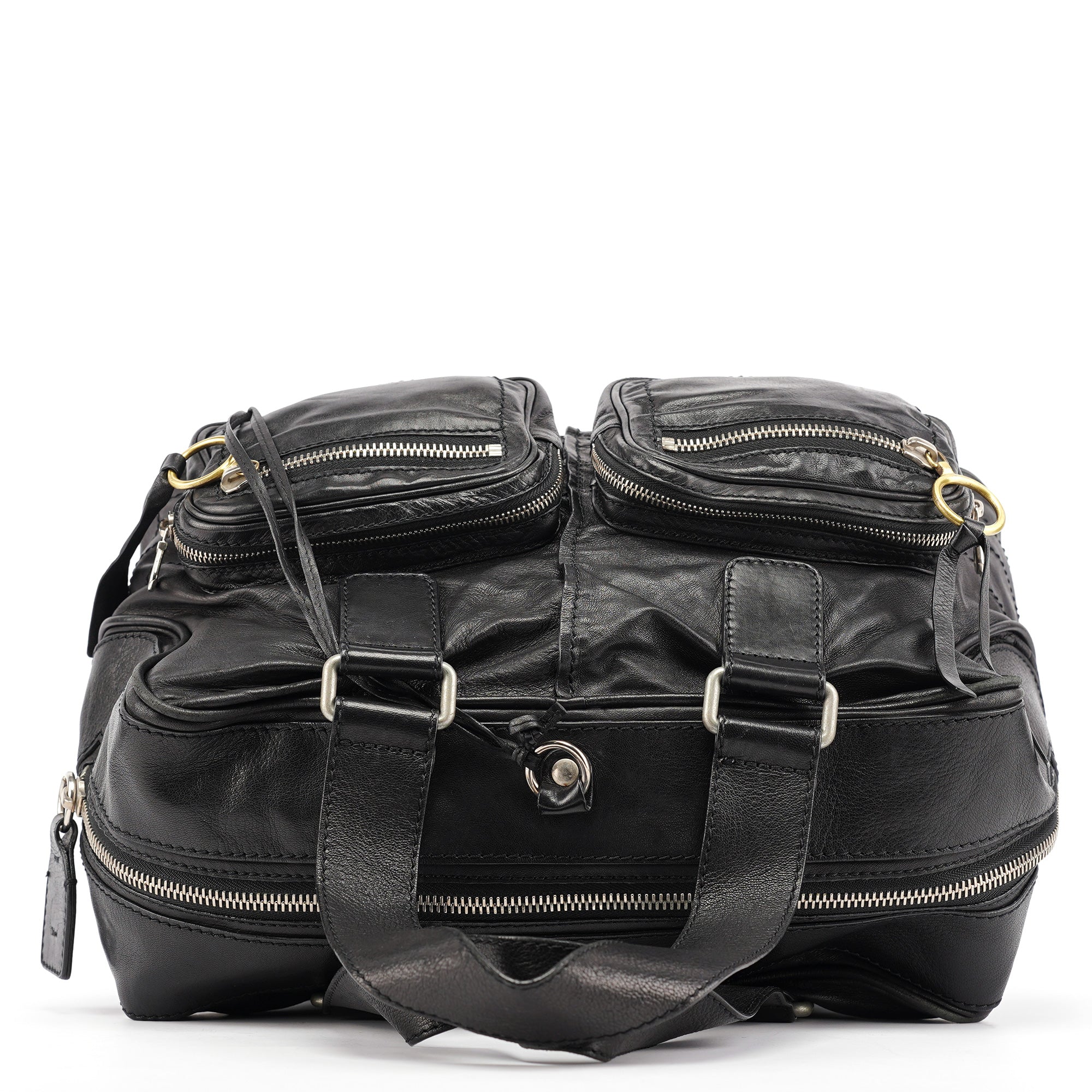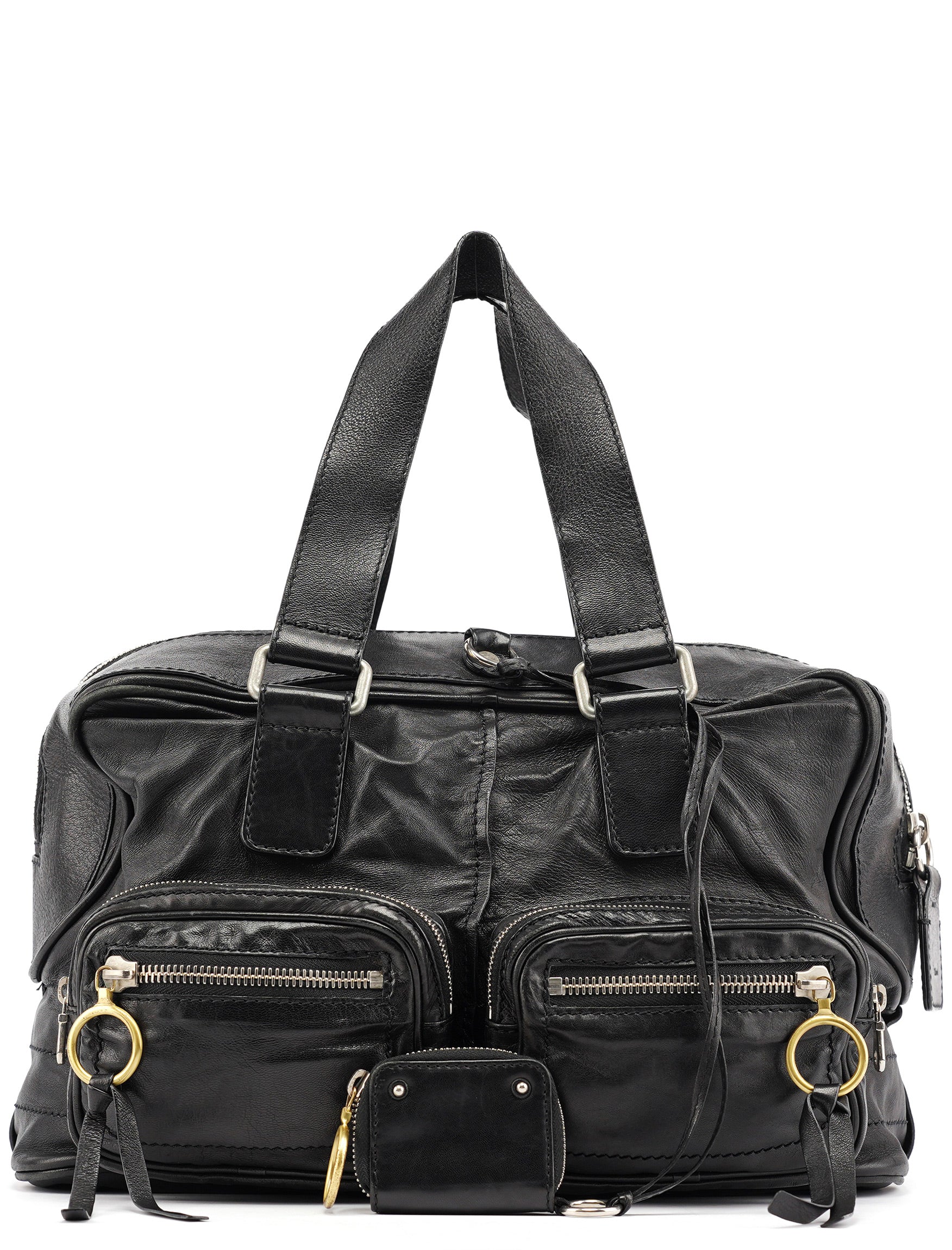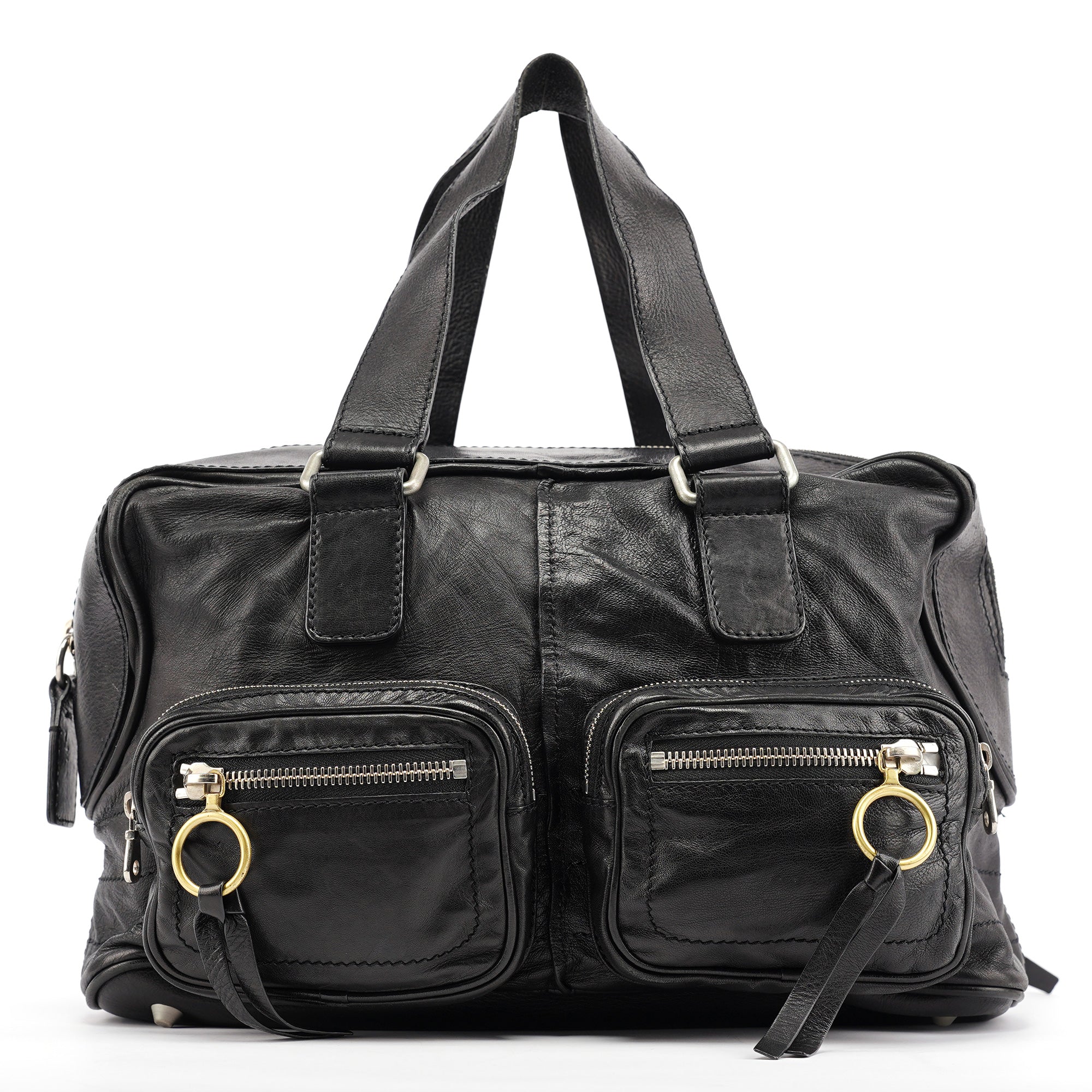 Designed in the early 2000s by Phoebe Philo, this vintage Chloé Betty handbag exemplifies Philo's rock-chic aesthetic in supple black leather. The architectural silhouette features multiple front zip pockets with oversized gold-tone ring pulls, dual top handles, and a spacious main compartment with zip closure. The edgy design combines functional utility with downtown sophistication.
