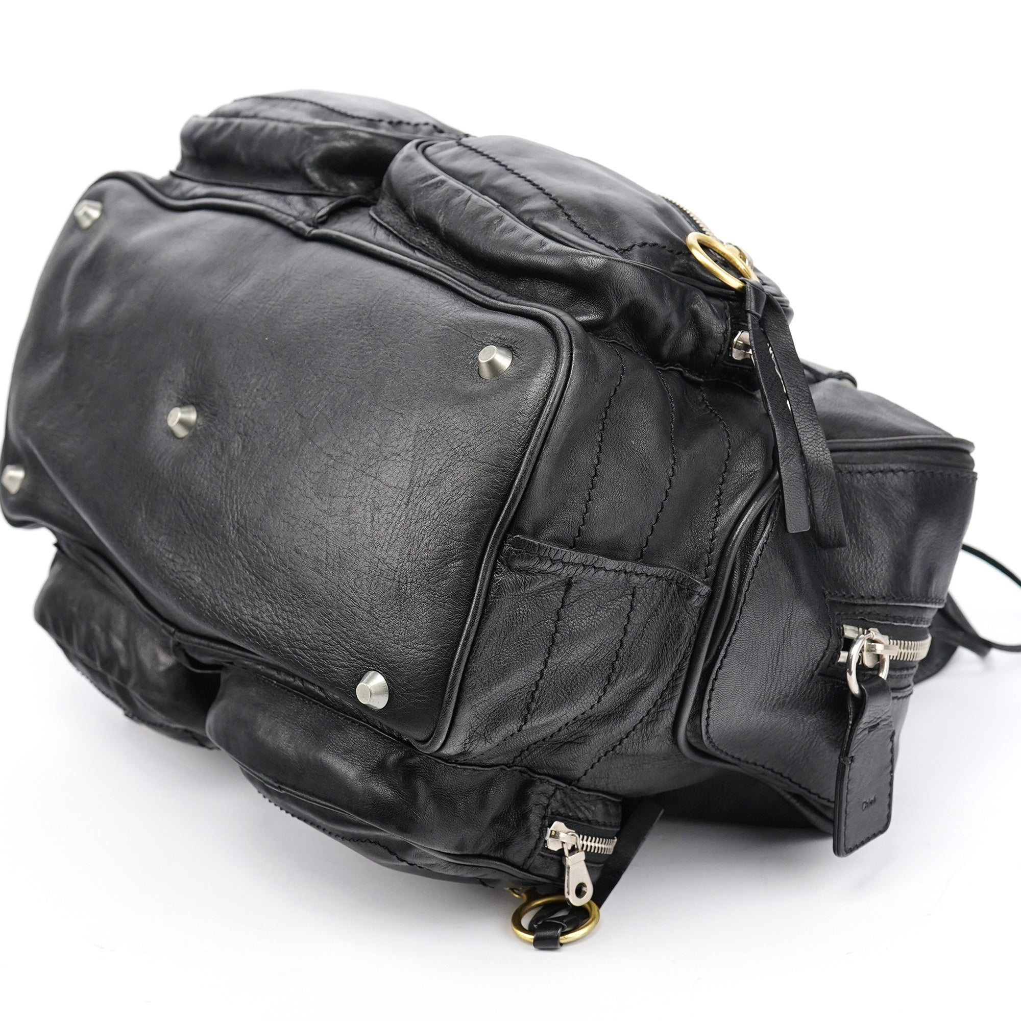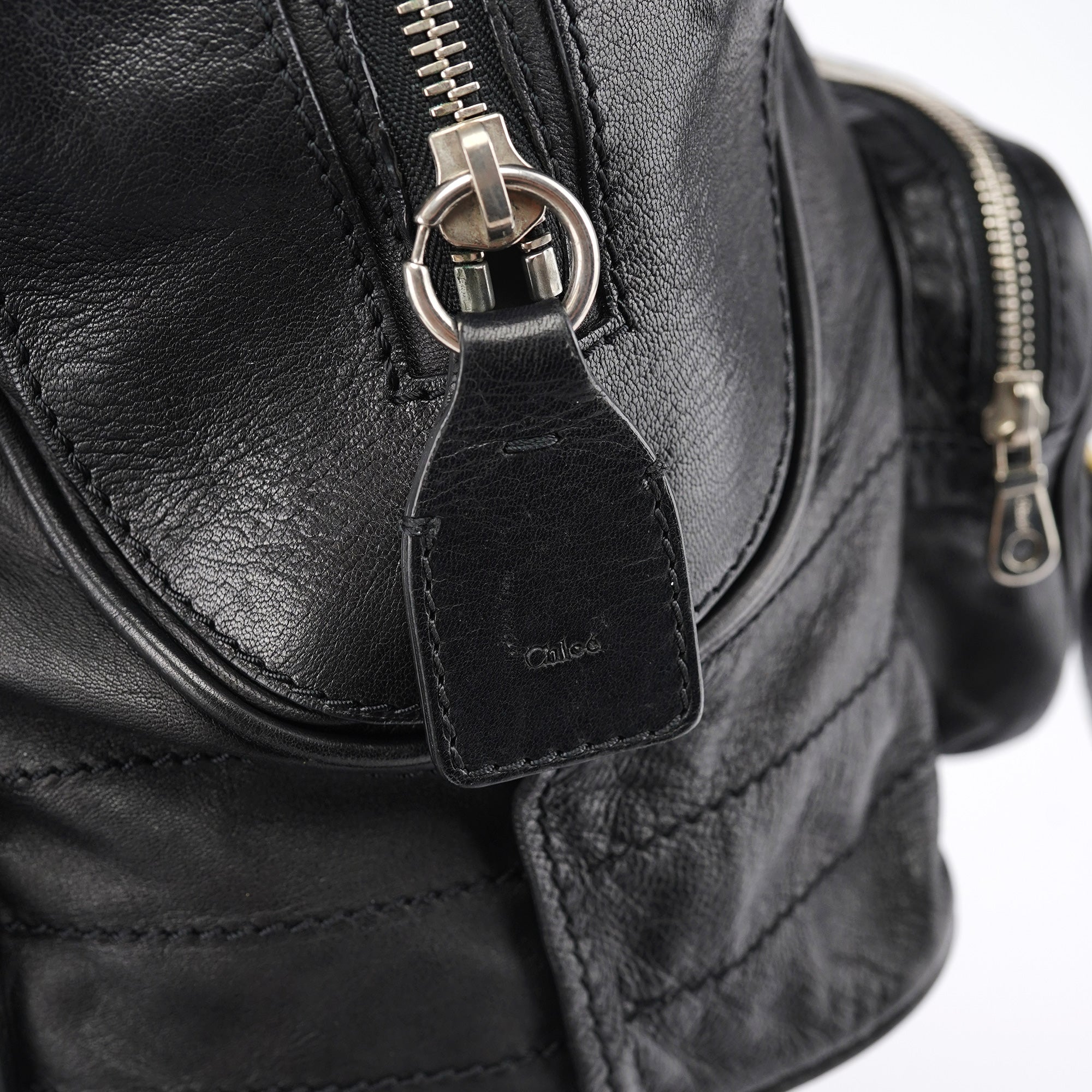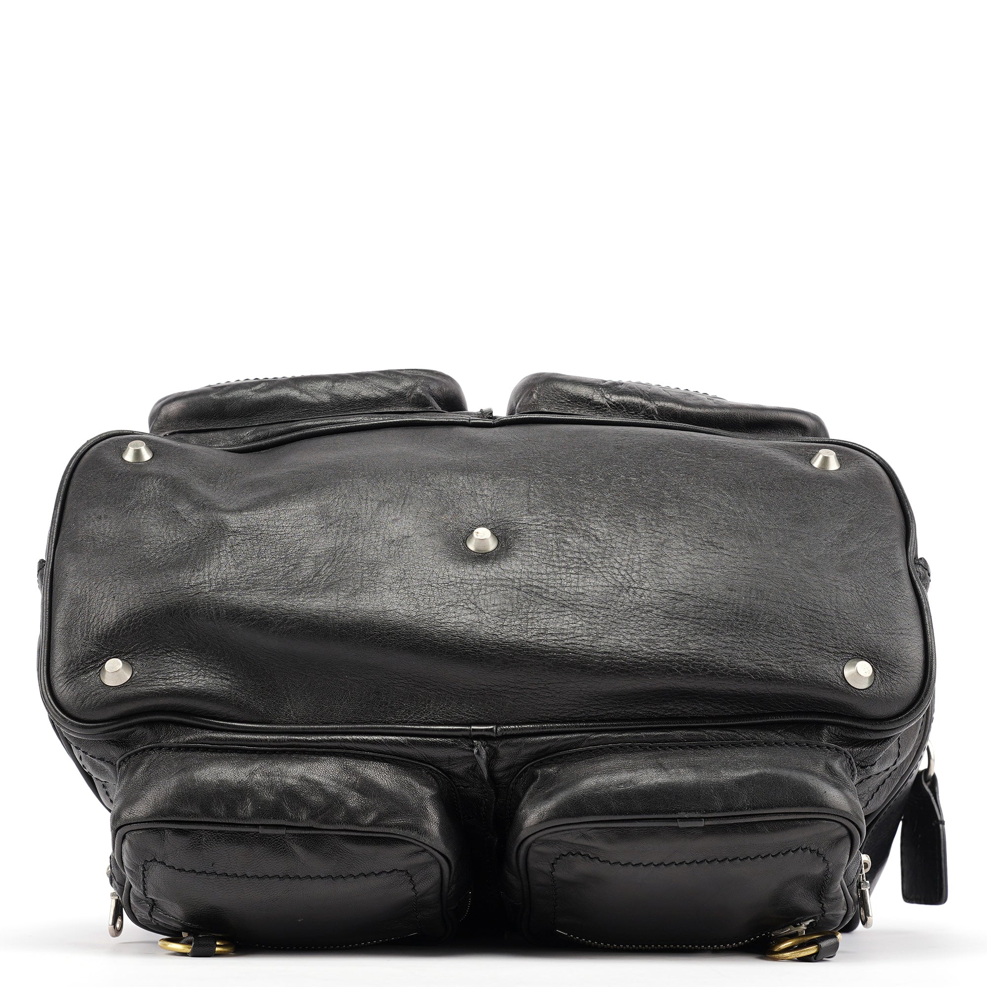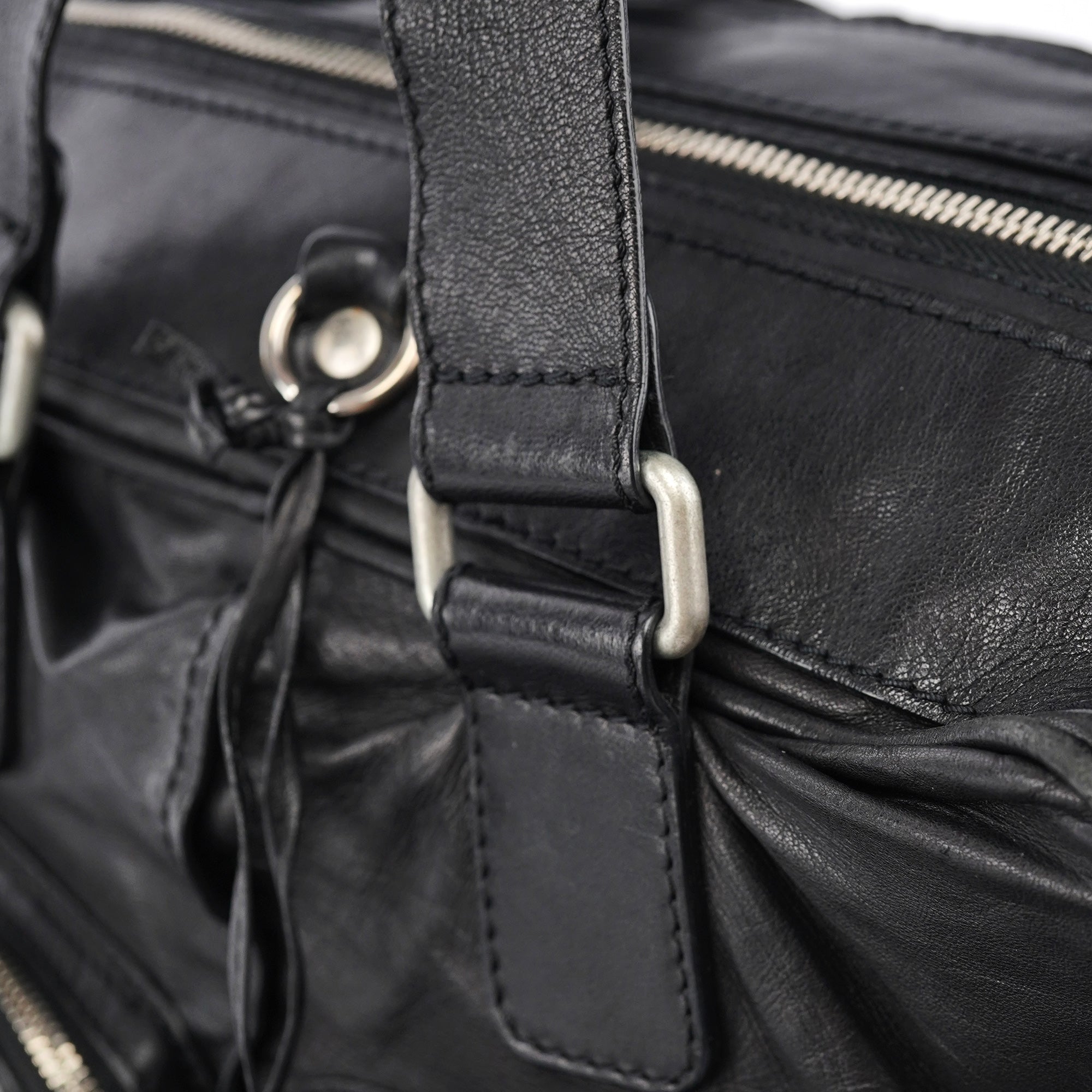 Designed in the early 2000s by Phoebe Philo, this vintage Chloé Betty handbag exemplifies Philo's rock-chic aesthetic in supple black leather. The architectural silhouette features multiple front zip pockets with oversized gold-tone ring pulls, dual top handles, and a spacious main compartment with zip closure. The edgy design combines functional utility with downtown sophistication.