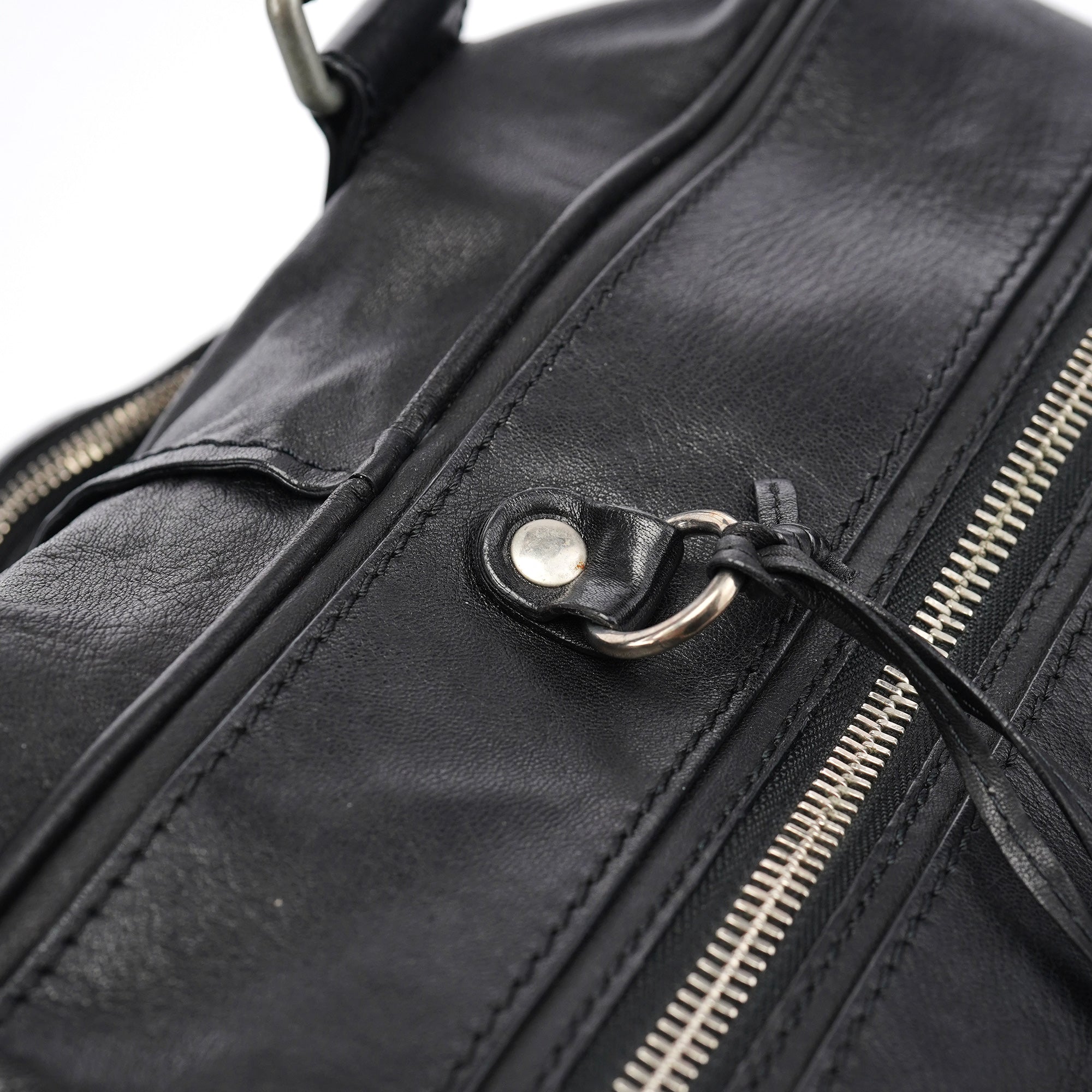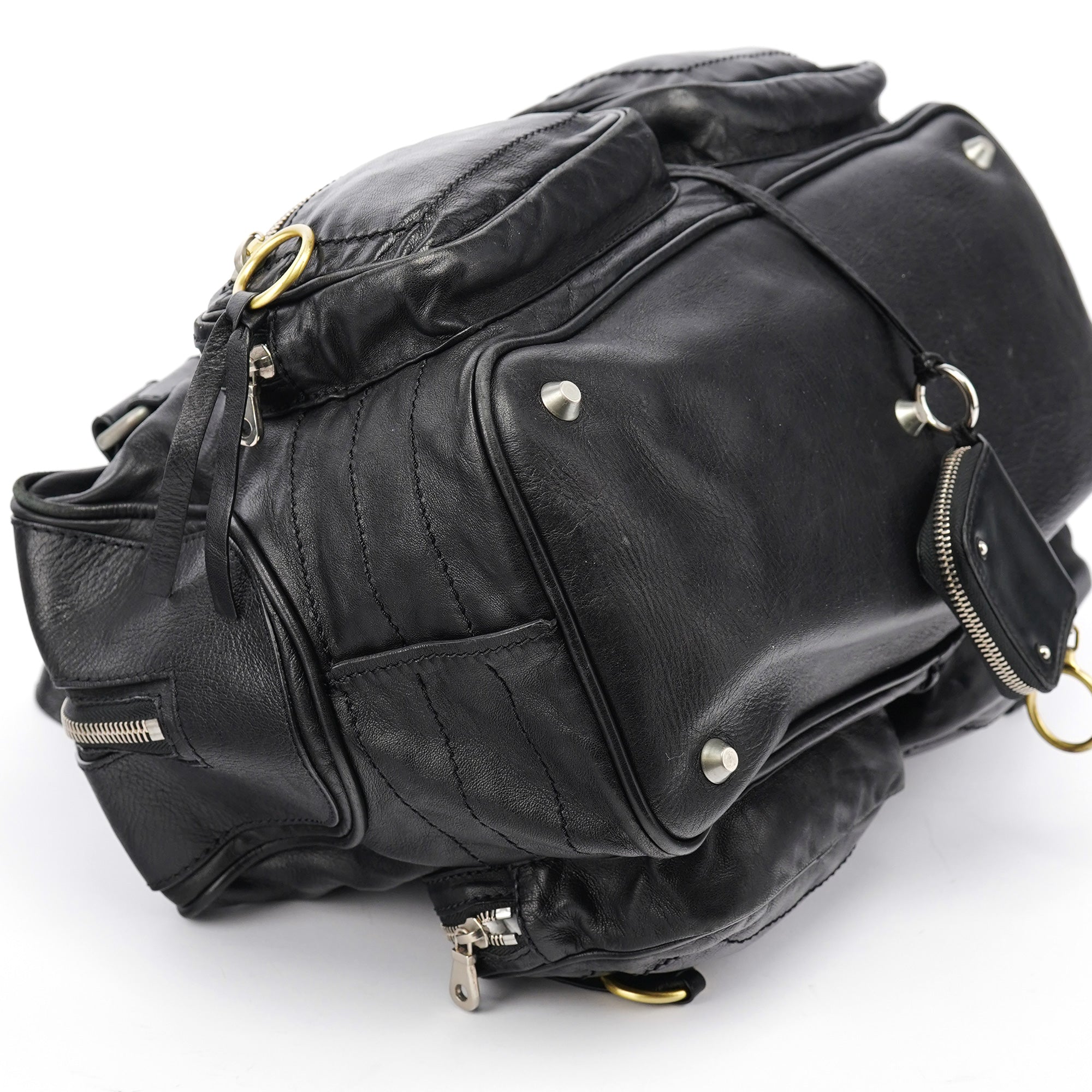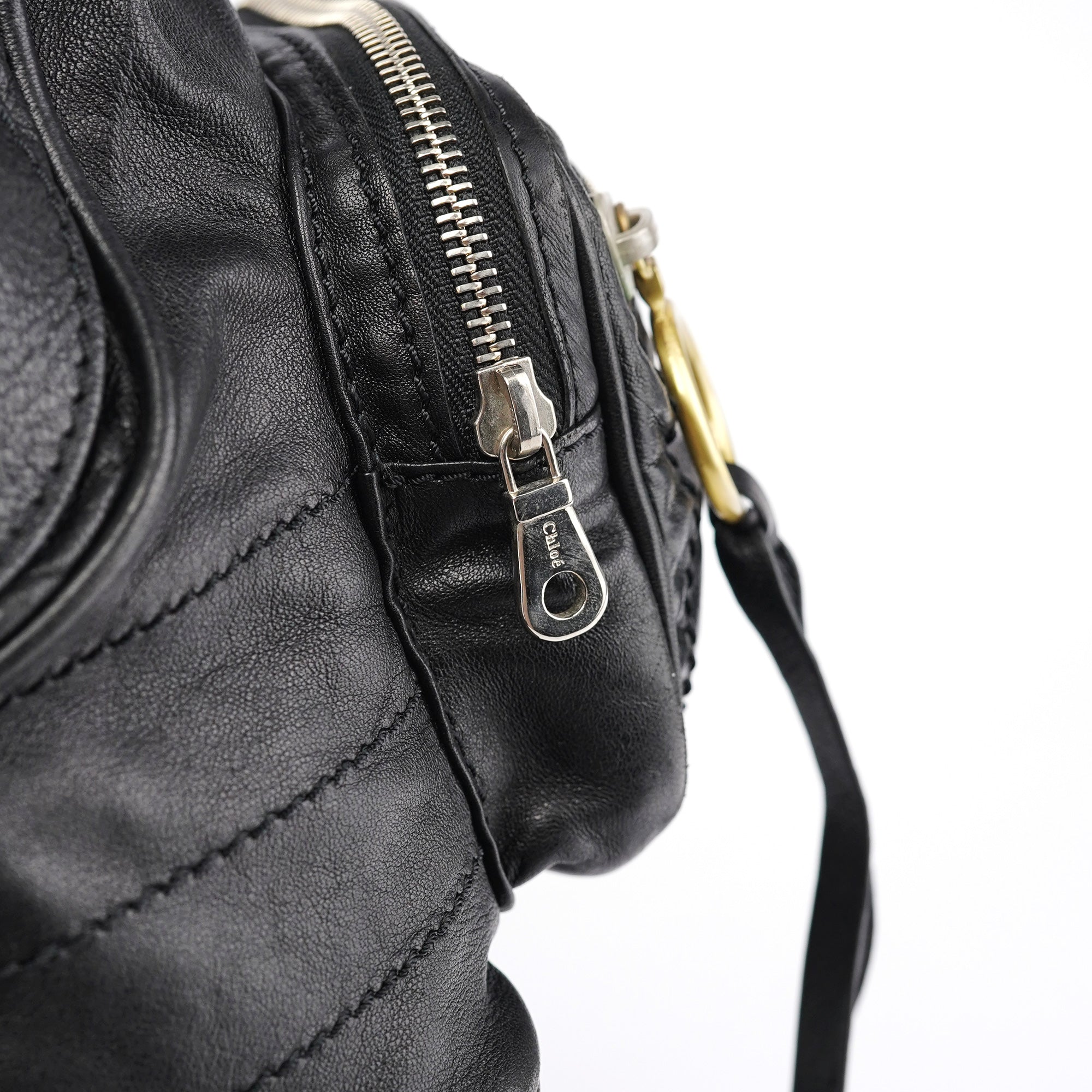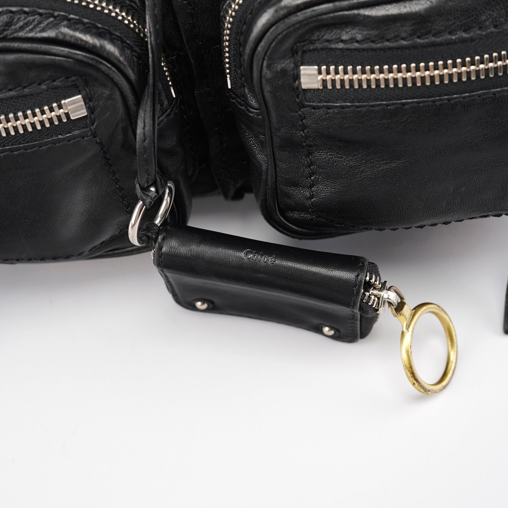 Designed in the early 2000s by Phoebe Philo, this vintage Chloé Betty handbag exemplifies Philo's rock-chic aesthetic in supple black leather. The architectural silhouette features multiple front zip pockets with oversized gold-tone ring pulls, dual top handles, and a spacious main compartment with zip closure. The edgy design combines functional utility with downtown sophistication.