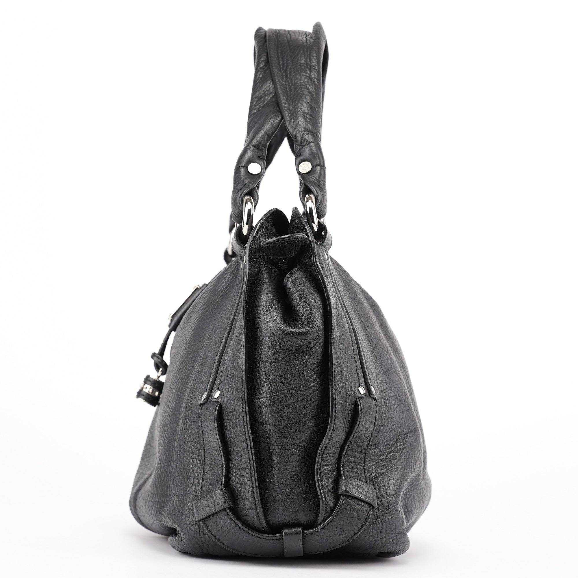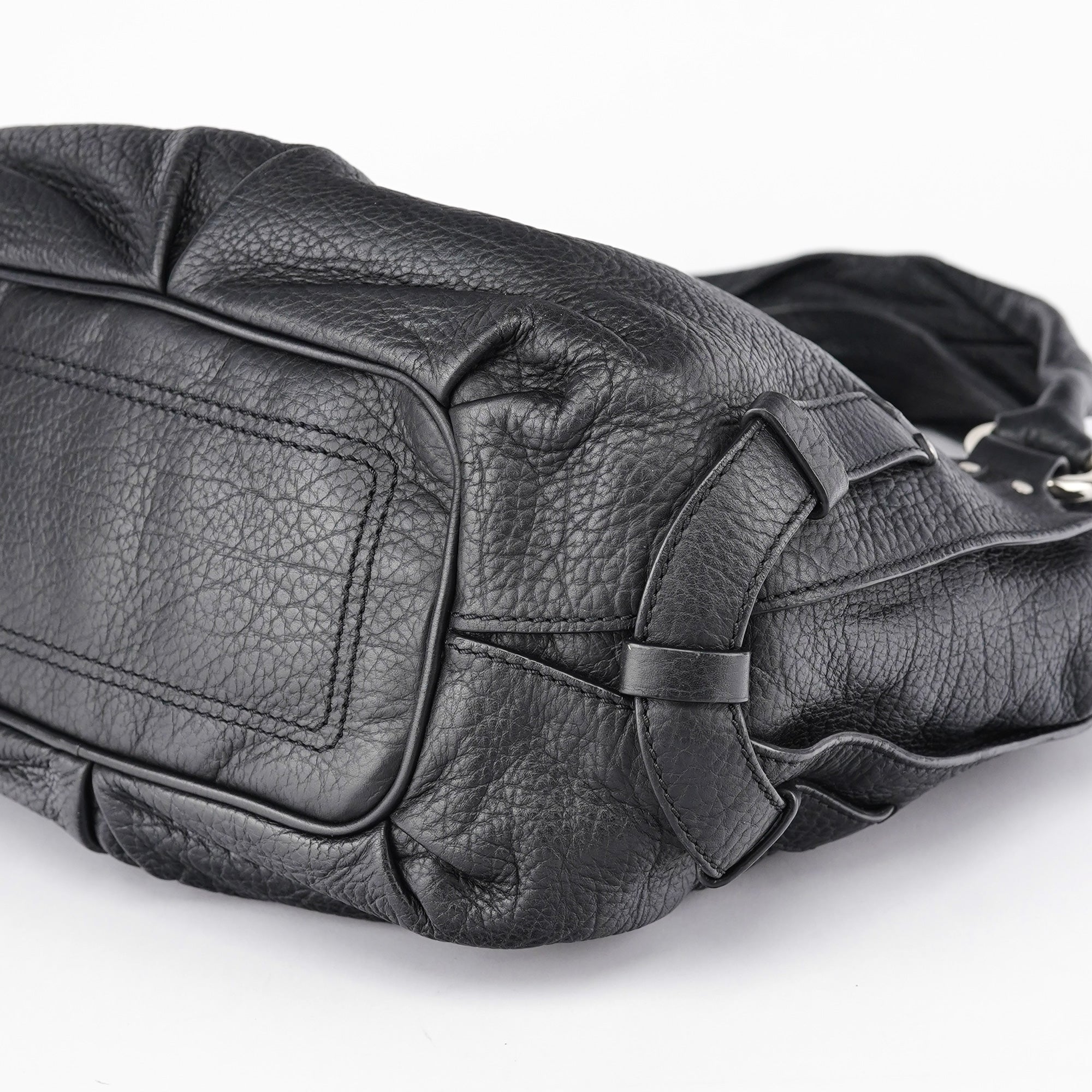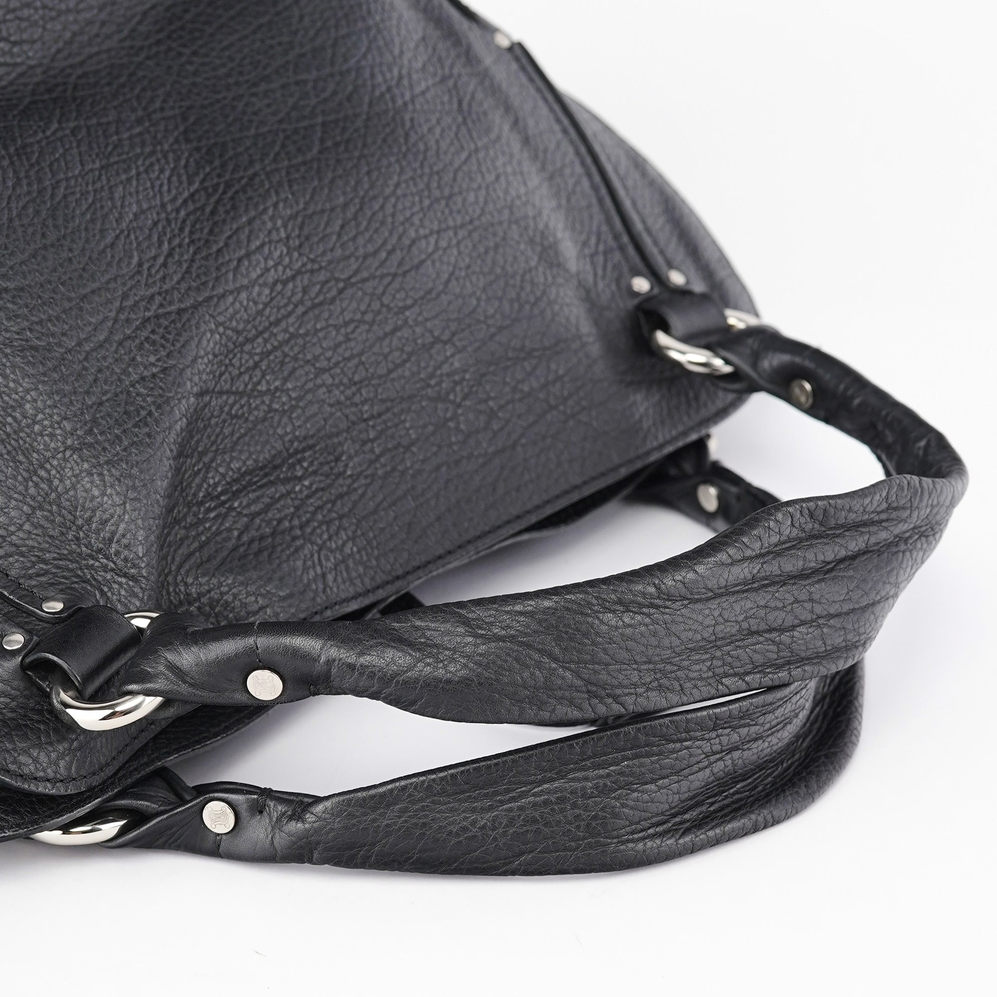 Designed in the early 2000s, the Celine Bittersweet bag is crafted in supple black grained leather with a distinctive knotted leather drawstring and silver-tone hardware. The curved silhouette is framed by soft pleating and dual rolled handles, while the spacious interior is lined in logo jacquard with multiple compartments and zippered pockets.
