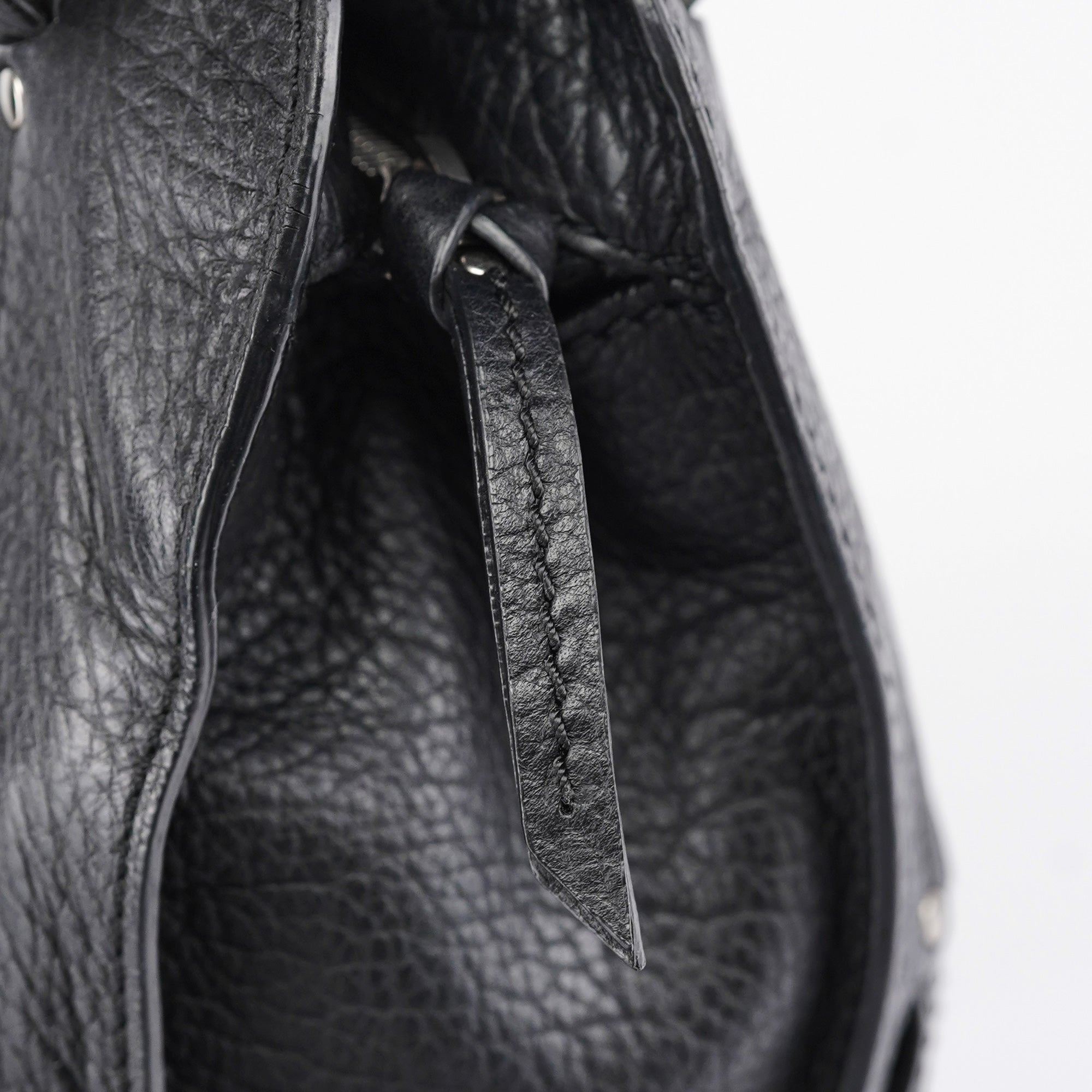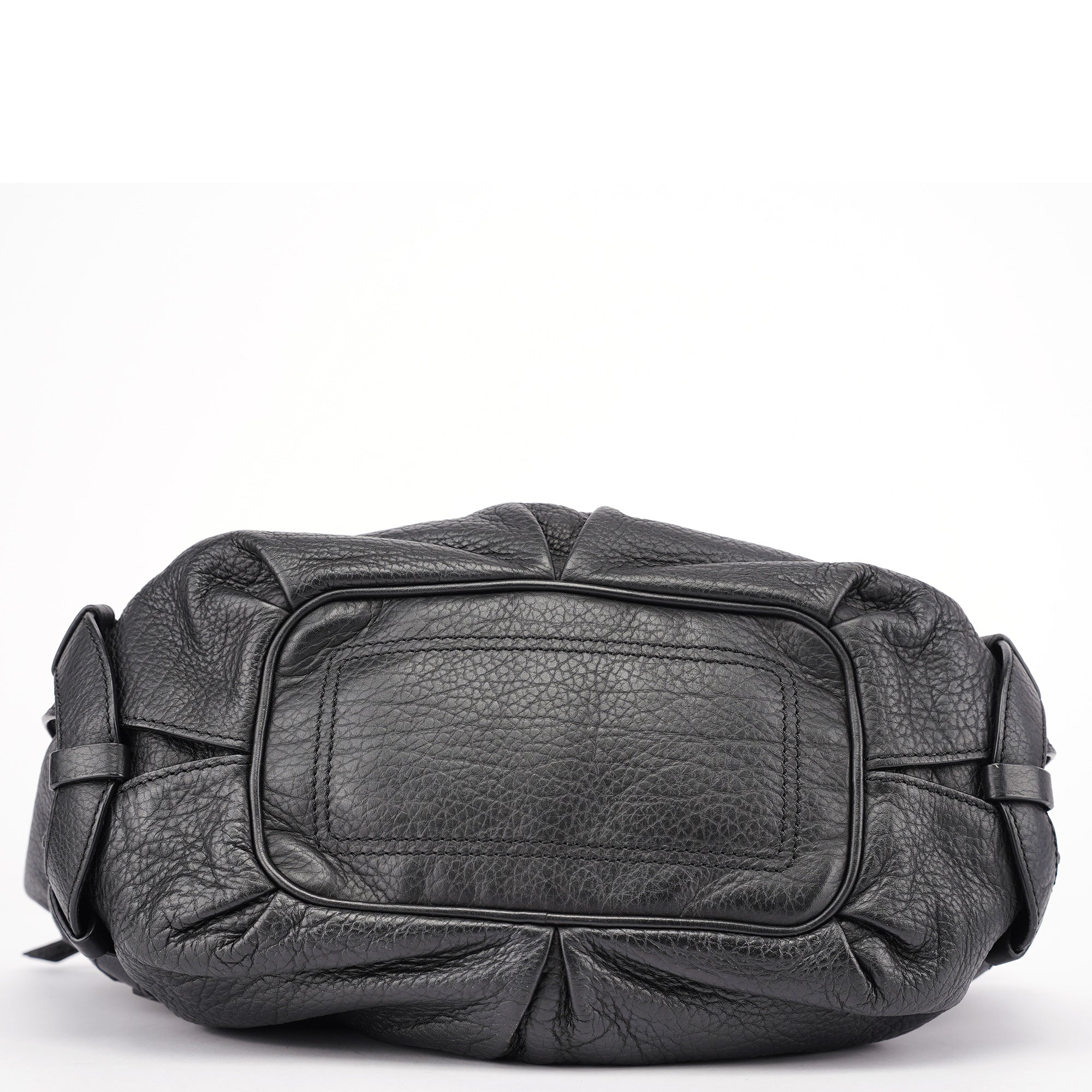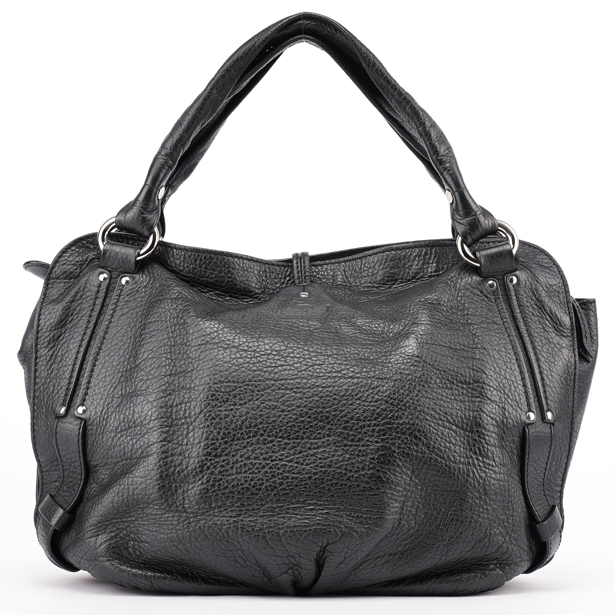 Designed in the early 2000s, the Celine Bittersweet bag is crafted in supple black grained leather with a distinctive knotted leather drawstring and silver-tone hardware. The curved silhouette is framed by soft pleating and dual rolled handles, while the spacious interior is lined in logo jacquard with multiple compartments and zippered pockets.
