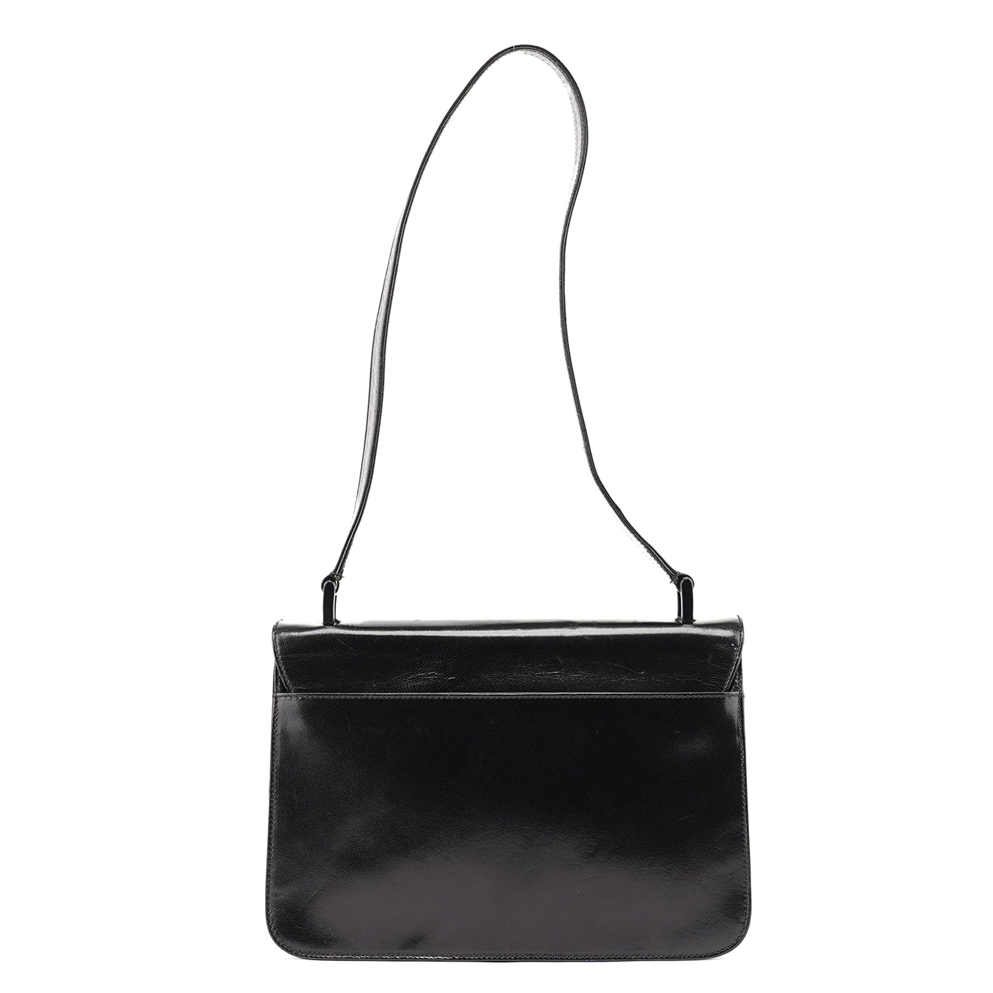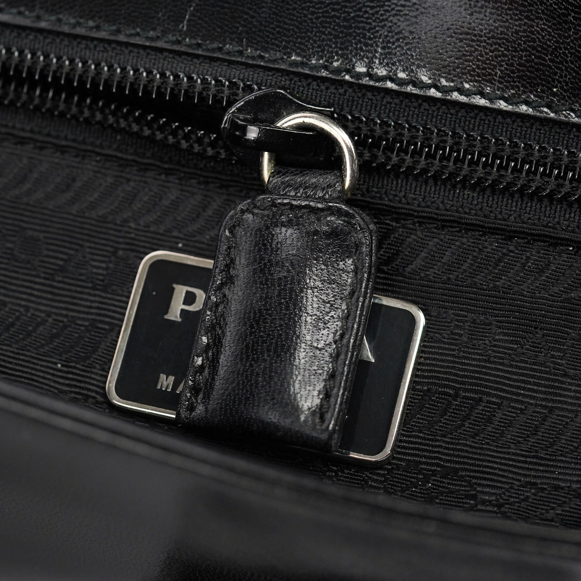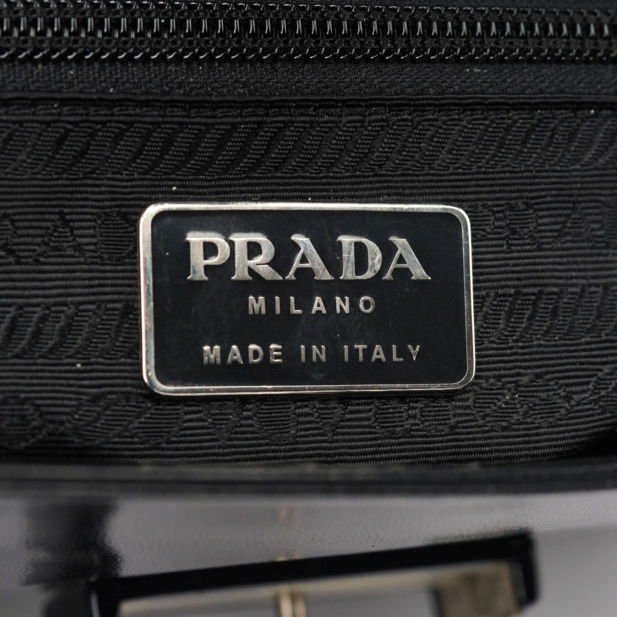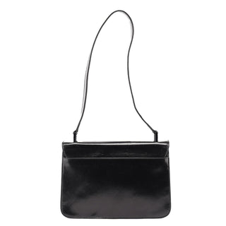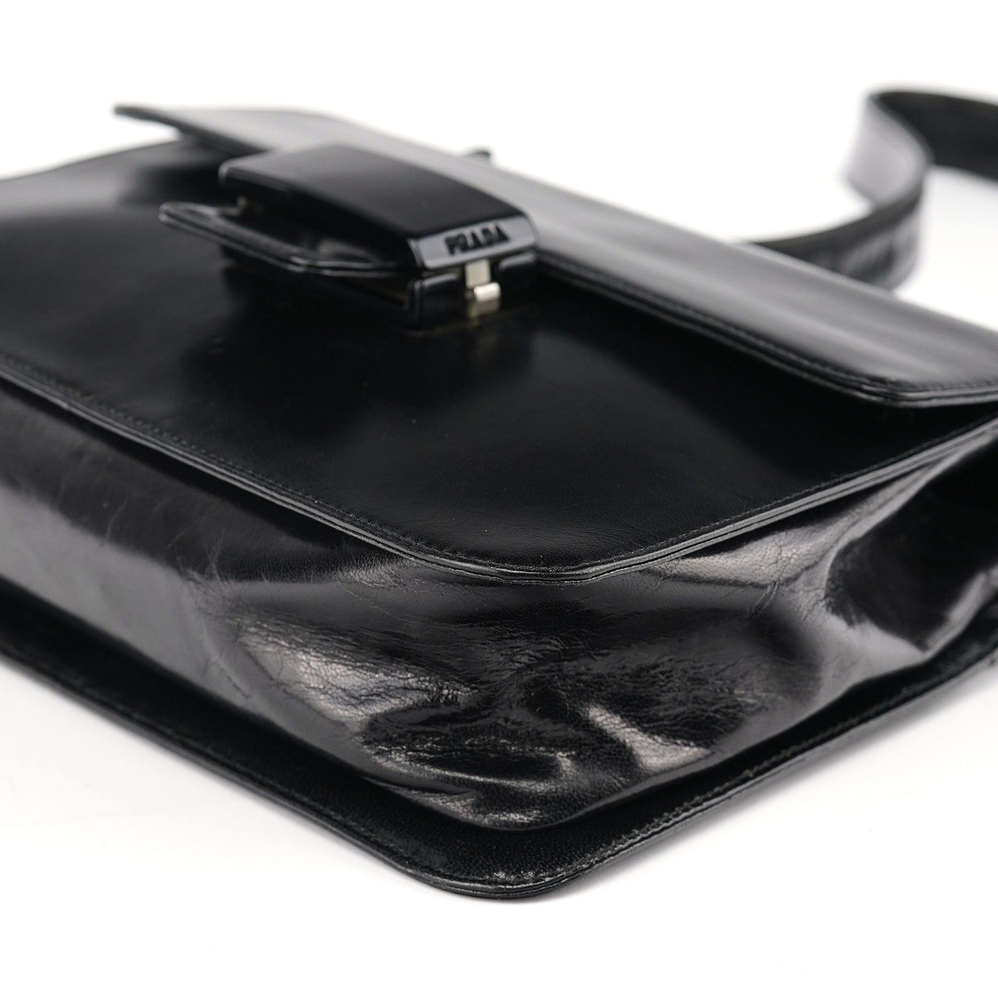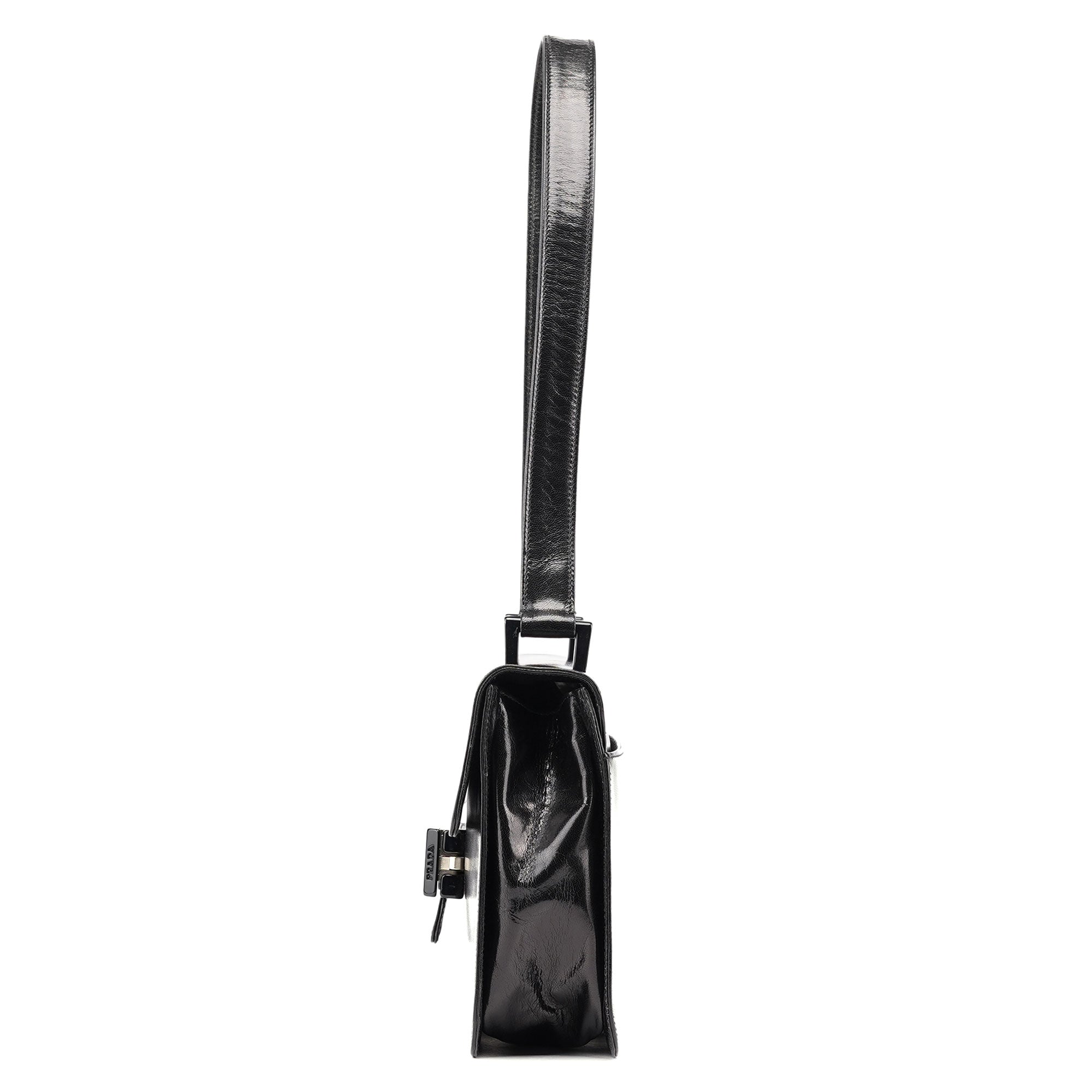 Designed by Miuccia Prada in the late 1990s, the Prada Madras Bachel shoulder bag is handcrafted from gloss black calfskin leather. It features a gloss black buckle closure with Prada logo engraving, a satin-lined interior with a zipper pocket, and a subtly embossed logo at the front, blending luxury with practicality.