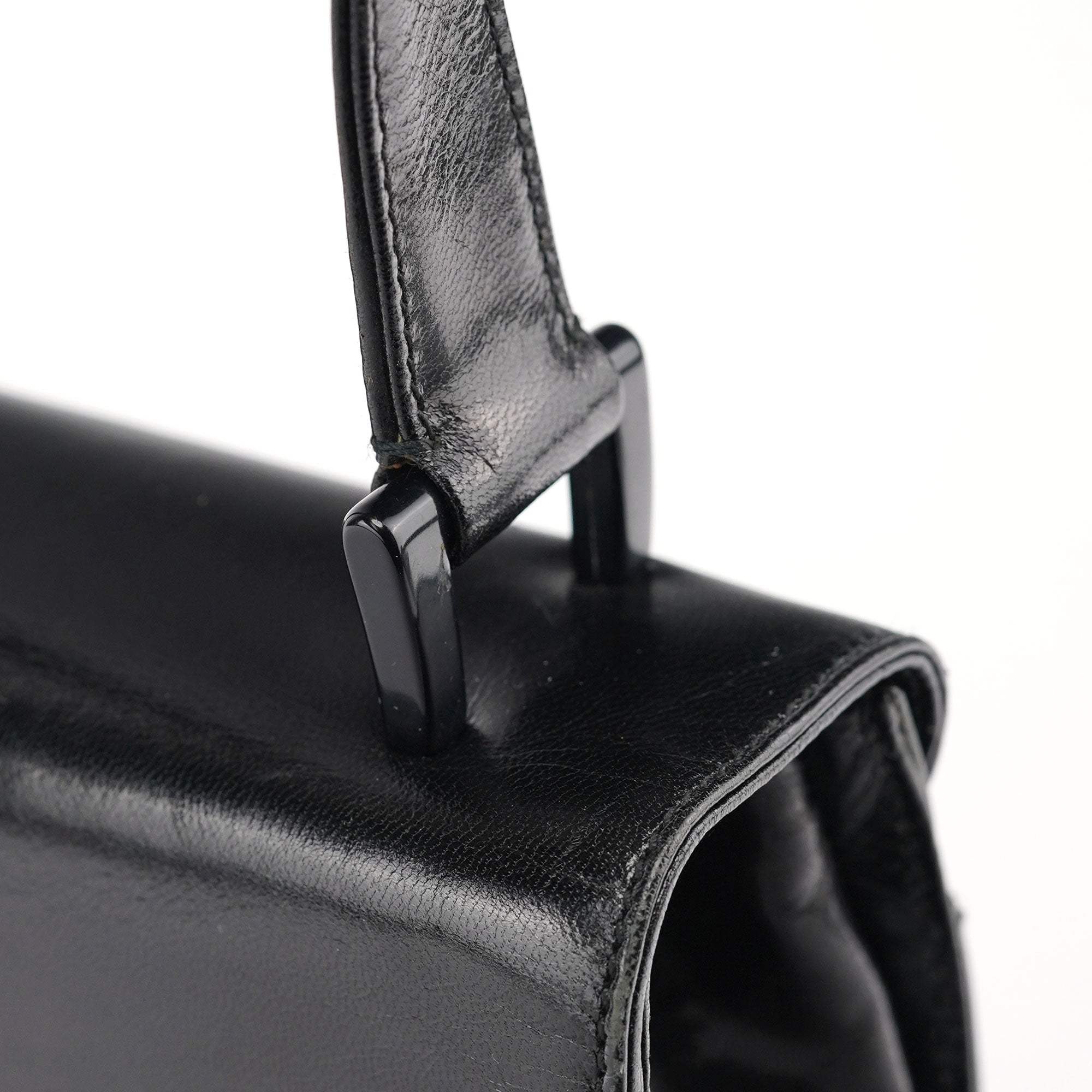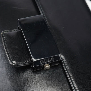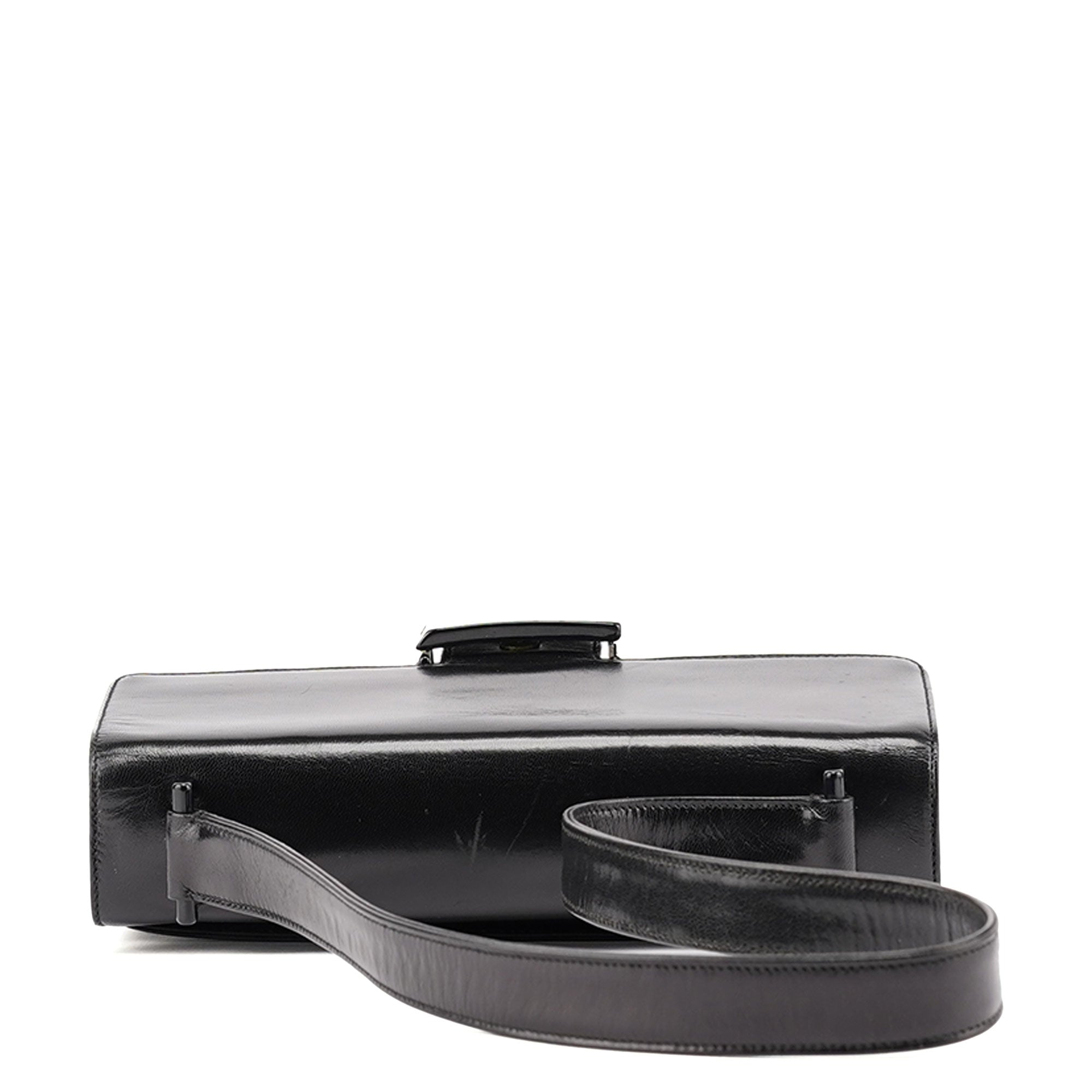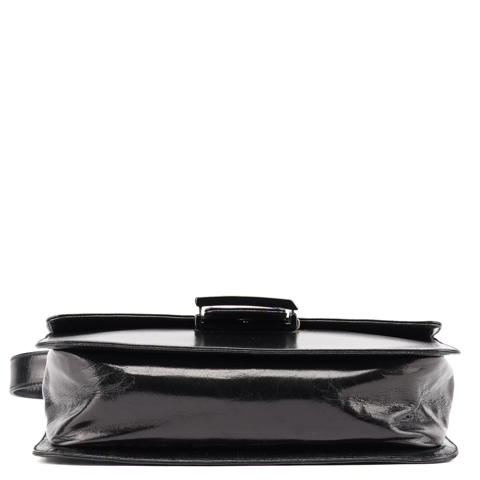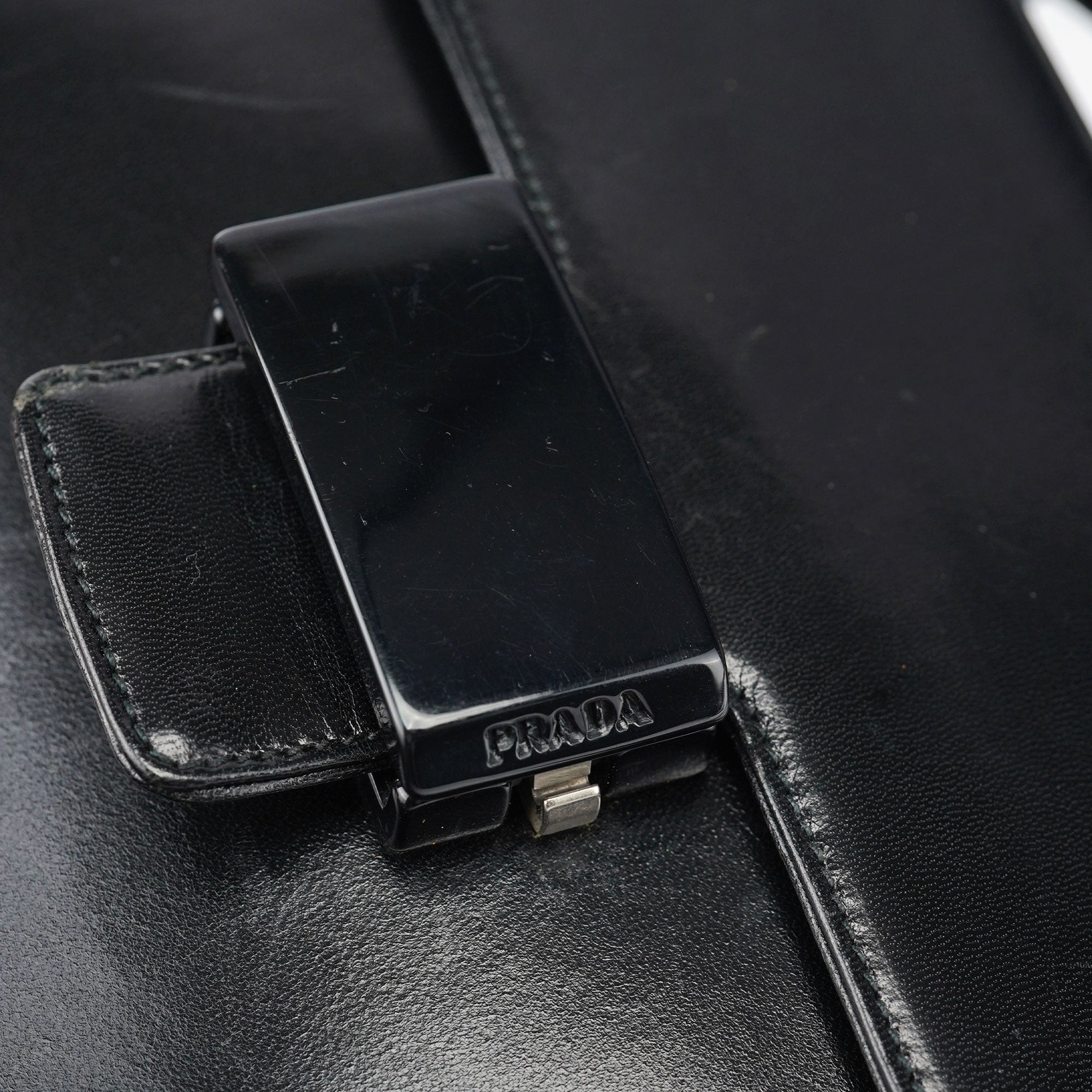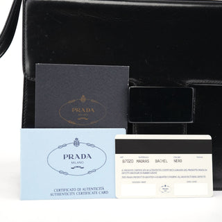 Designed by Miuccia Prada in the late 1990s, the Prada Madras Bachel shoulder bag is handcrafted from gloss black calfskin leather. It features a gloss black buckle closure with Prada logo engraving, a satin-lined interior with a zipper pocket, and a subtly embossed logo at the front, blending luxury with practicality.