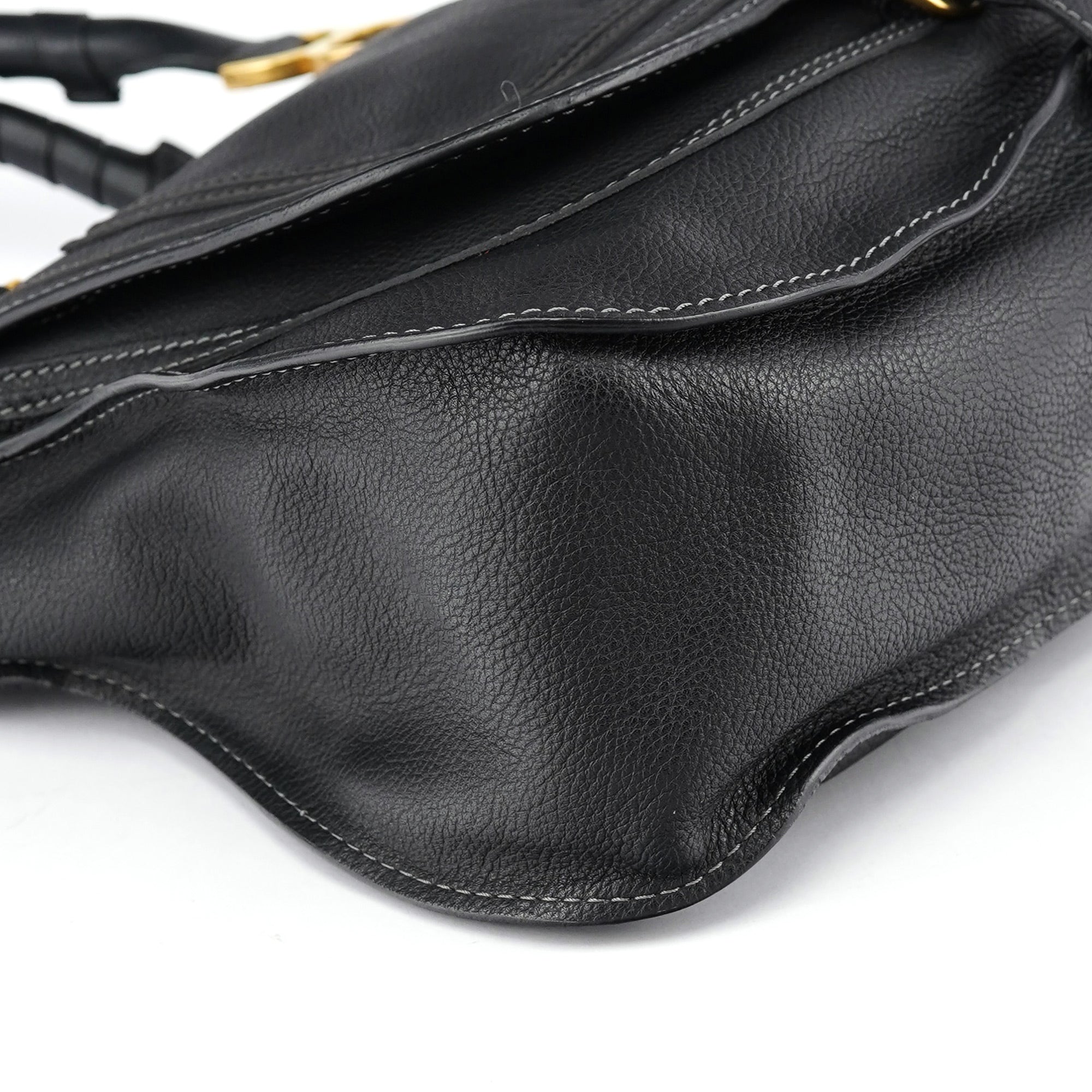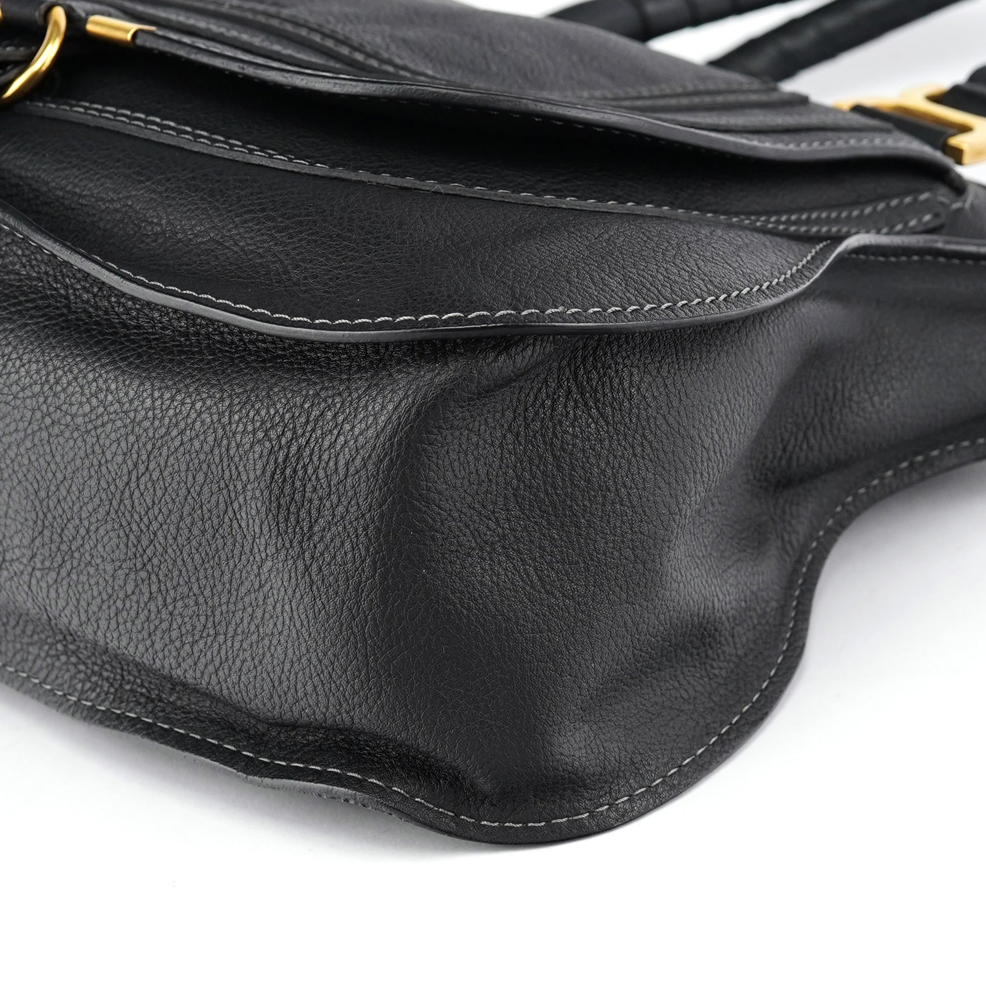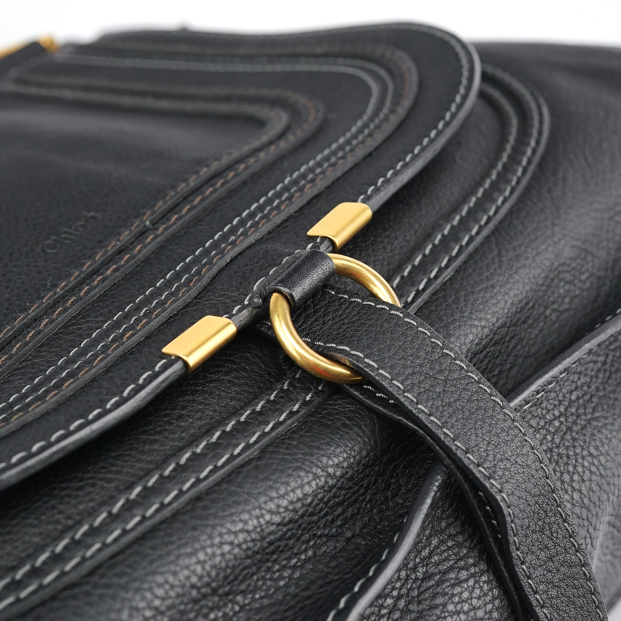 Designed by Hannah MacGibbon, the Chloé Marcie handbag blends small-grain calfskin leather with gold-tone hardware in a refined bohemian-luxe silhouette. Featuring the signature flap pocket with saddle stitching and leather-wrapped handles. It offers a spacious main compartment, balancing French elegance with everyday practicality.