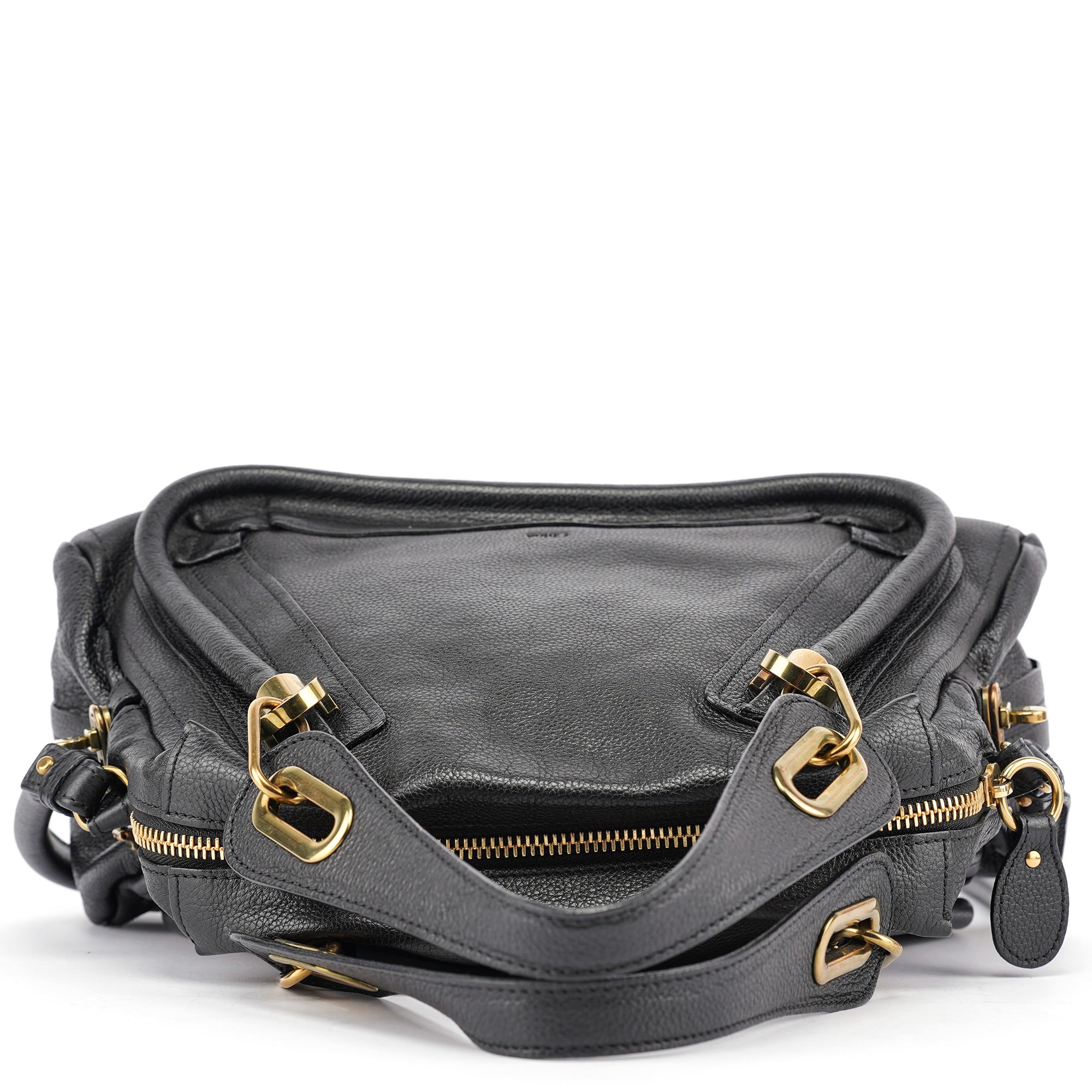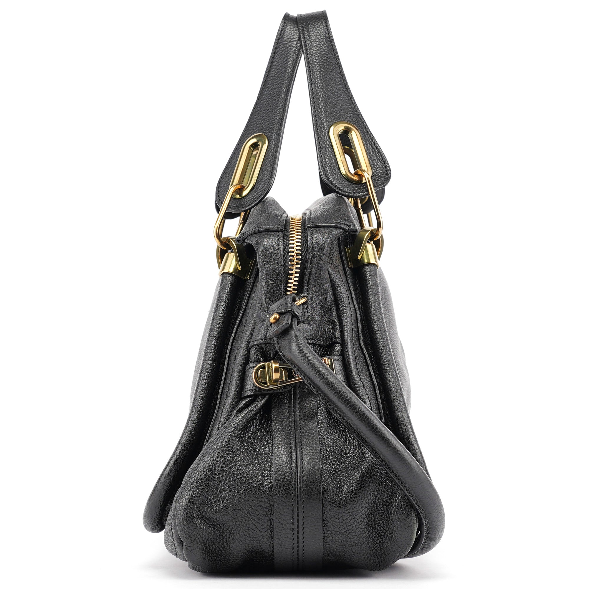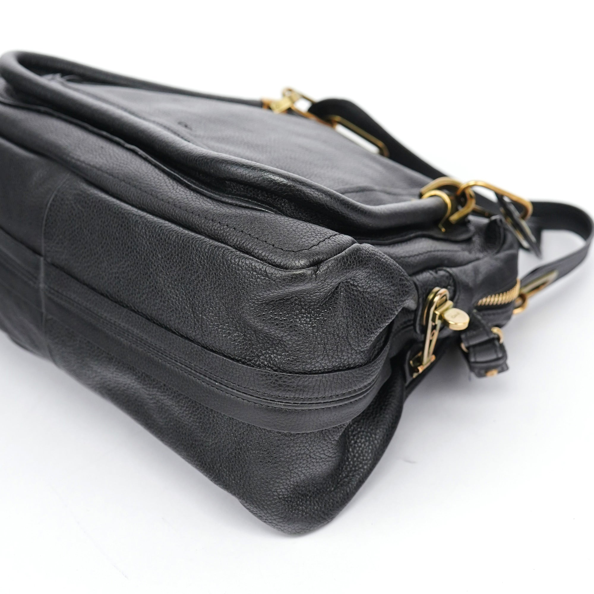Designed in the late 2000's by Hannah McGibbon, this Chloé Paraty bag is crafted in supple black leather with signature gold-tone hardware and a trapezoidal silhouette framed by piped detailing and articulated top handles. The structured design includes a zip closure, optional shoulder strap, and a canvas-lined interior with a single zip pocket.