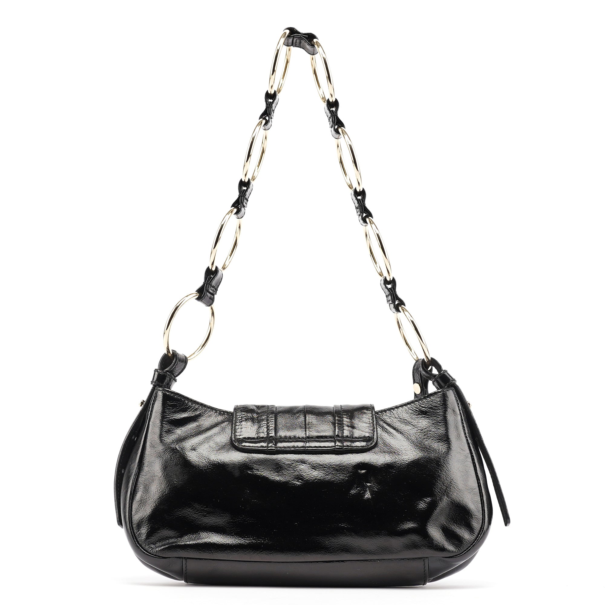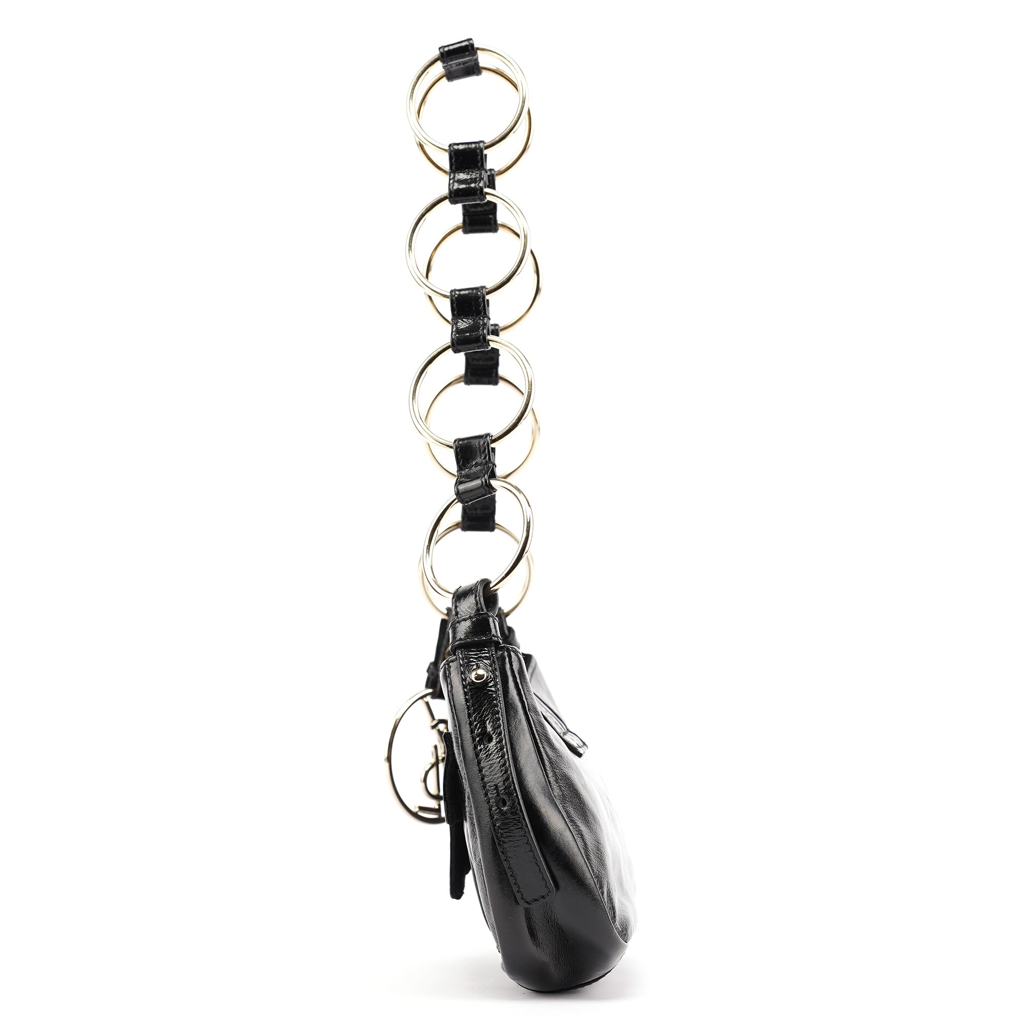 Designed by Tom Ford in the early 2000s, this YSL Rive Gauche shoulder bag features black patent leather with a lace-up eyelet front panel and gold-tone hardware. The distinctive strap is constructed from interlinked gold rings and leather loops, echoing Ford’s bold, sensual design language. Finished with a metal YSL medallion charm and a satin-lined interior, this compact silhouette blends edgy detailing with evening-ready glamour.
